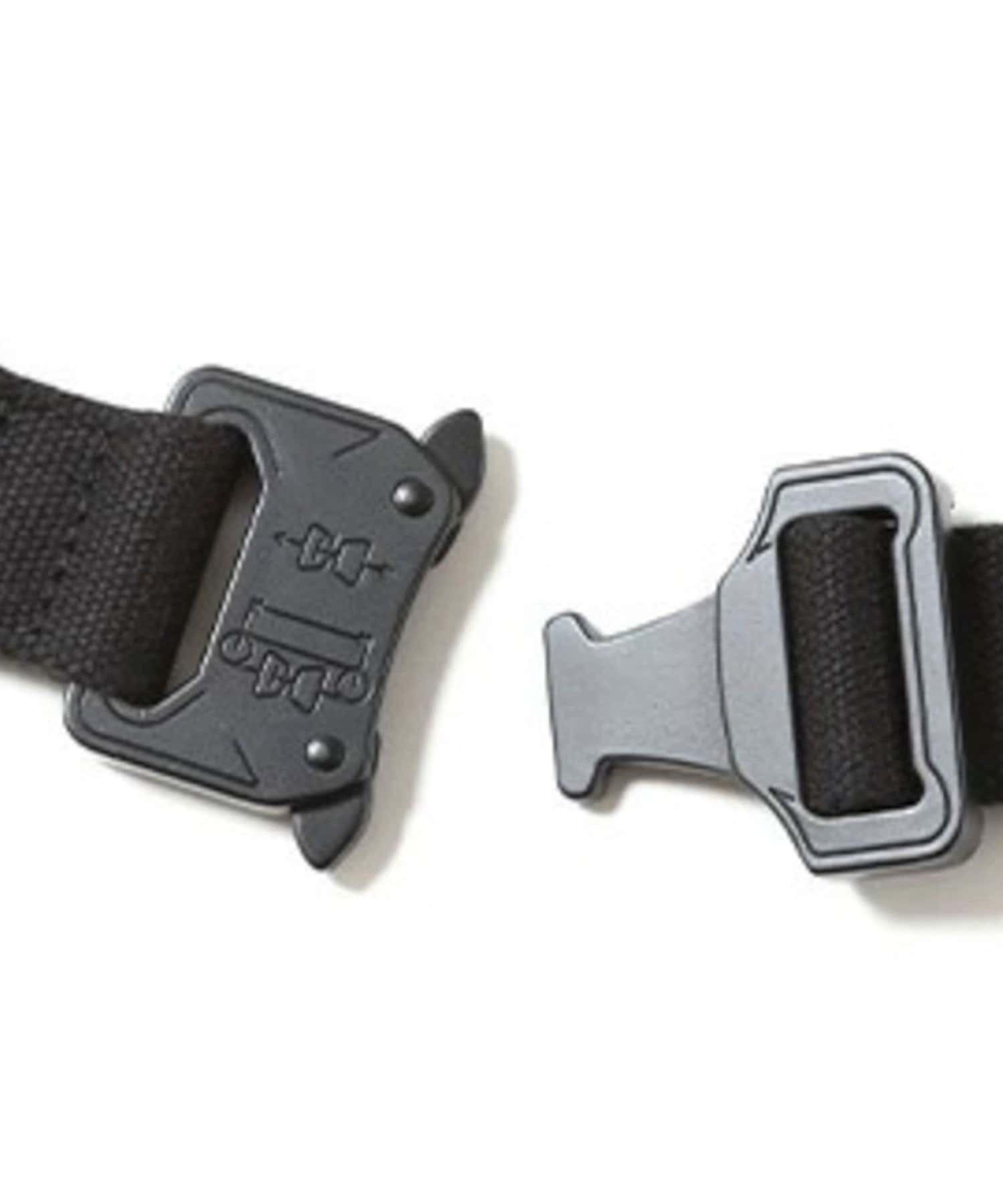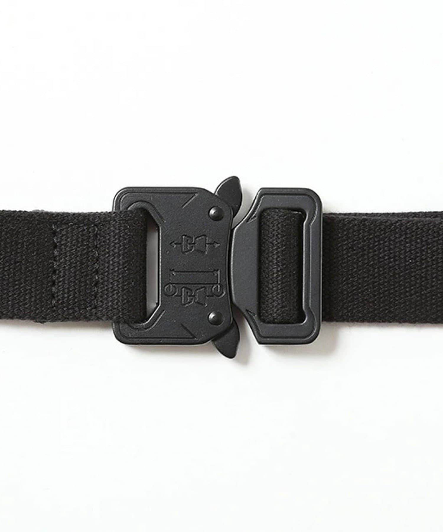 ワンタッチ式の重厚な金属製バックルを採用した、ミリタリーテイストのベルト