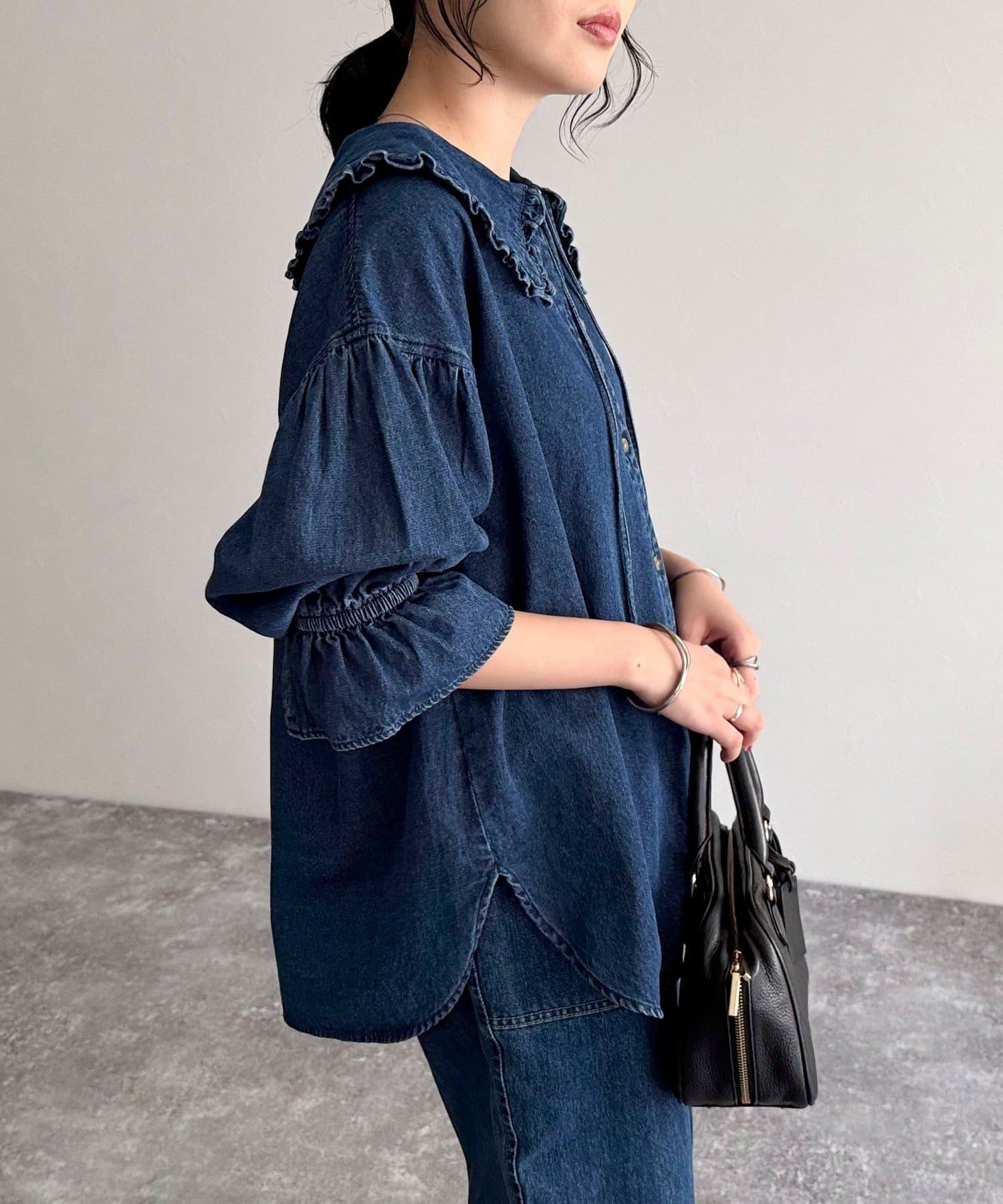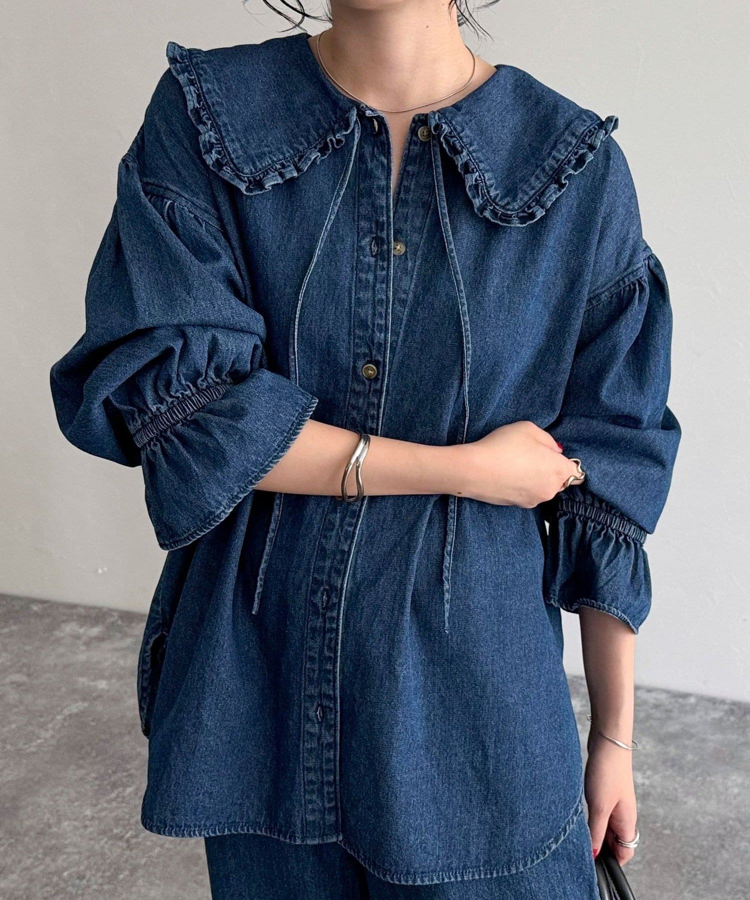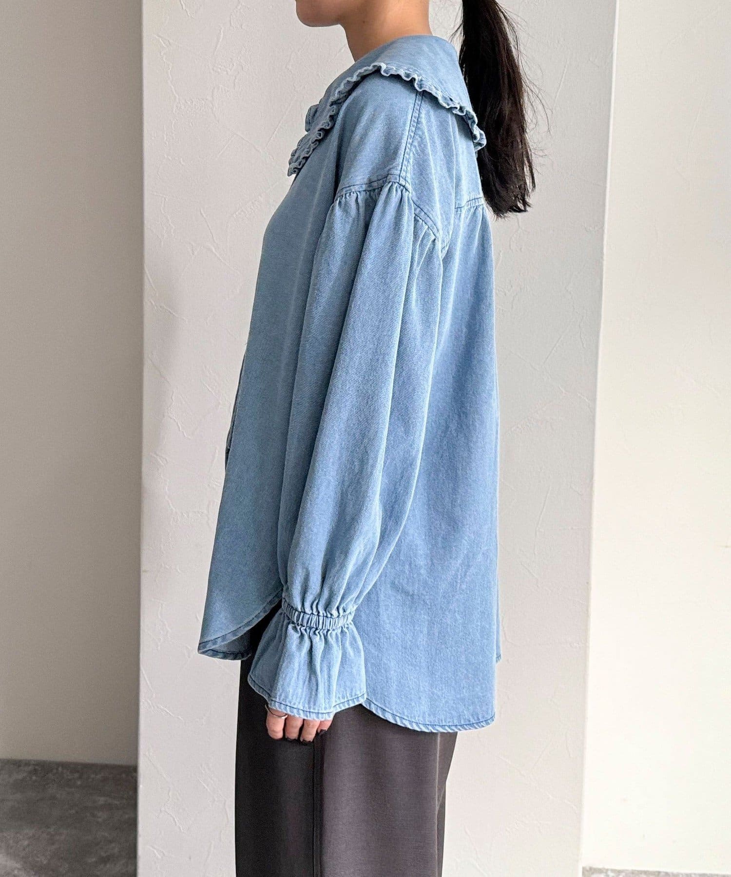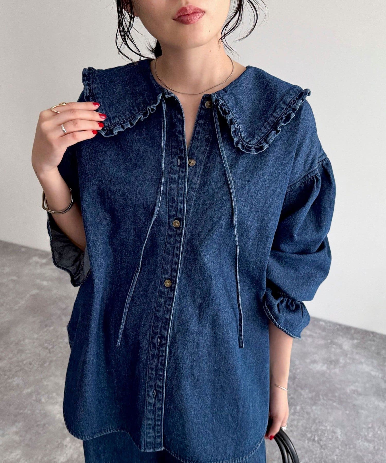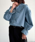 ・大き目のステンカラーがポイントのデニム素材のブラウスです
