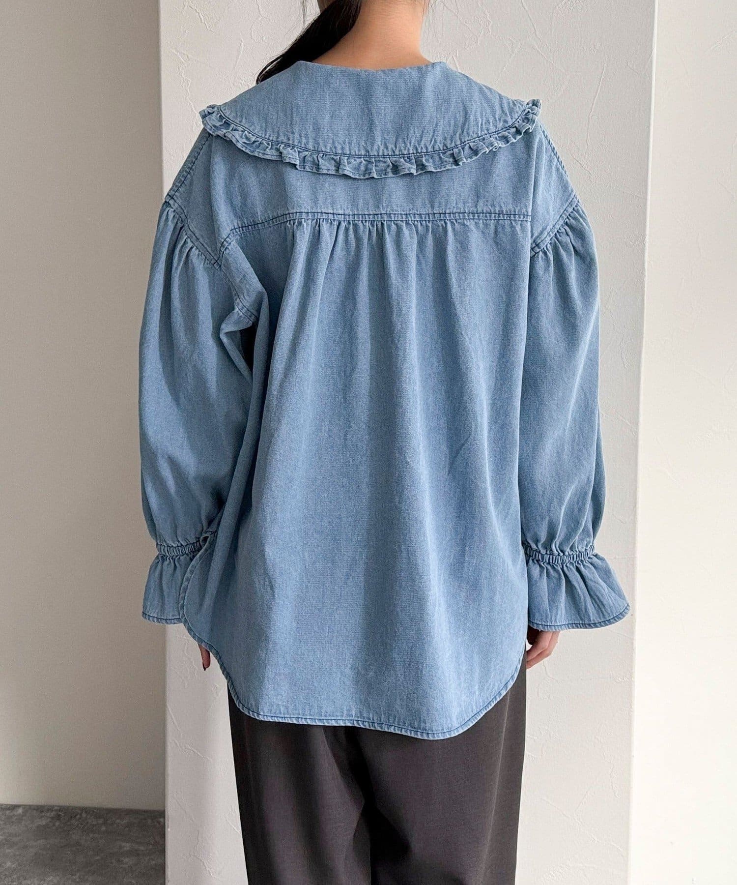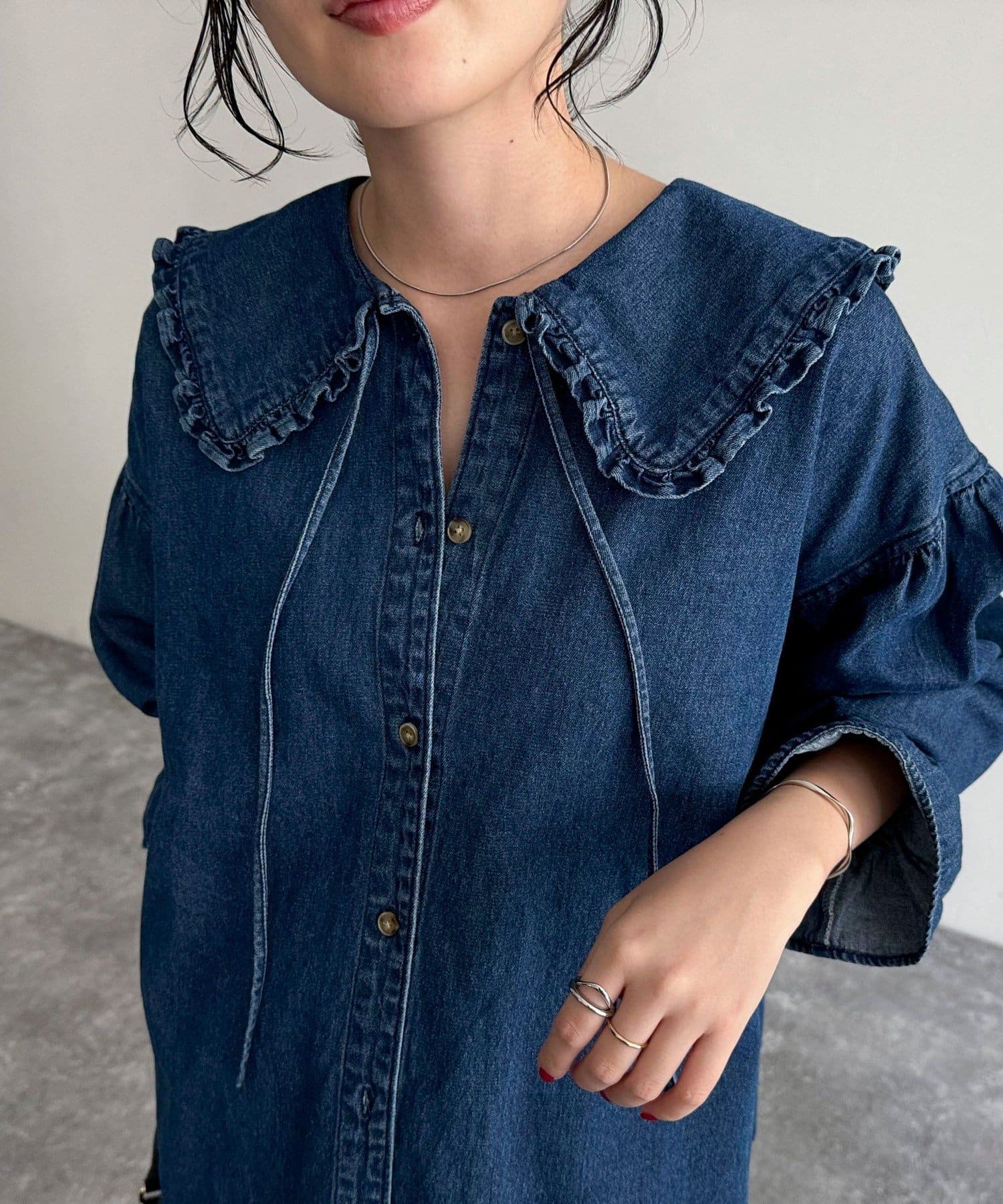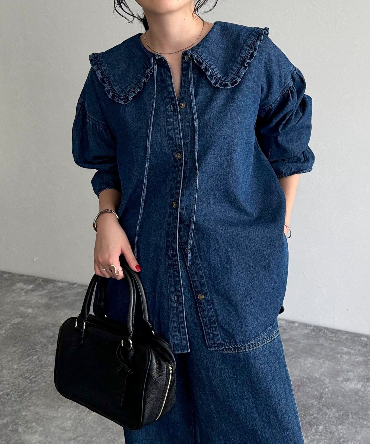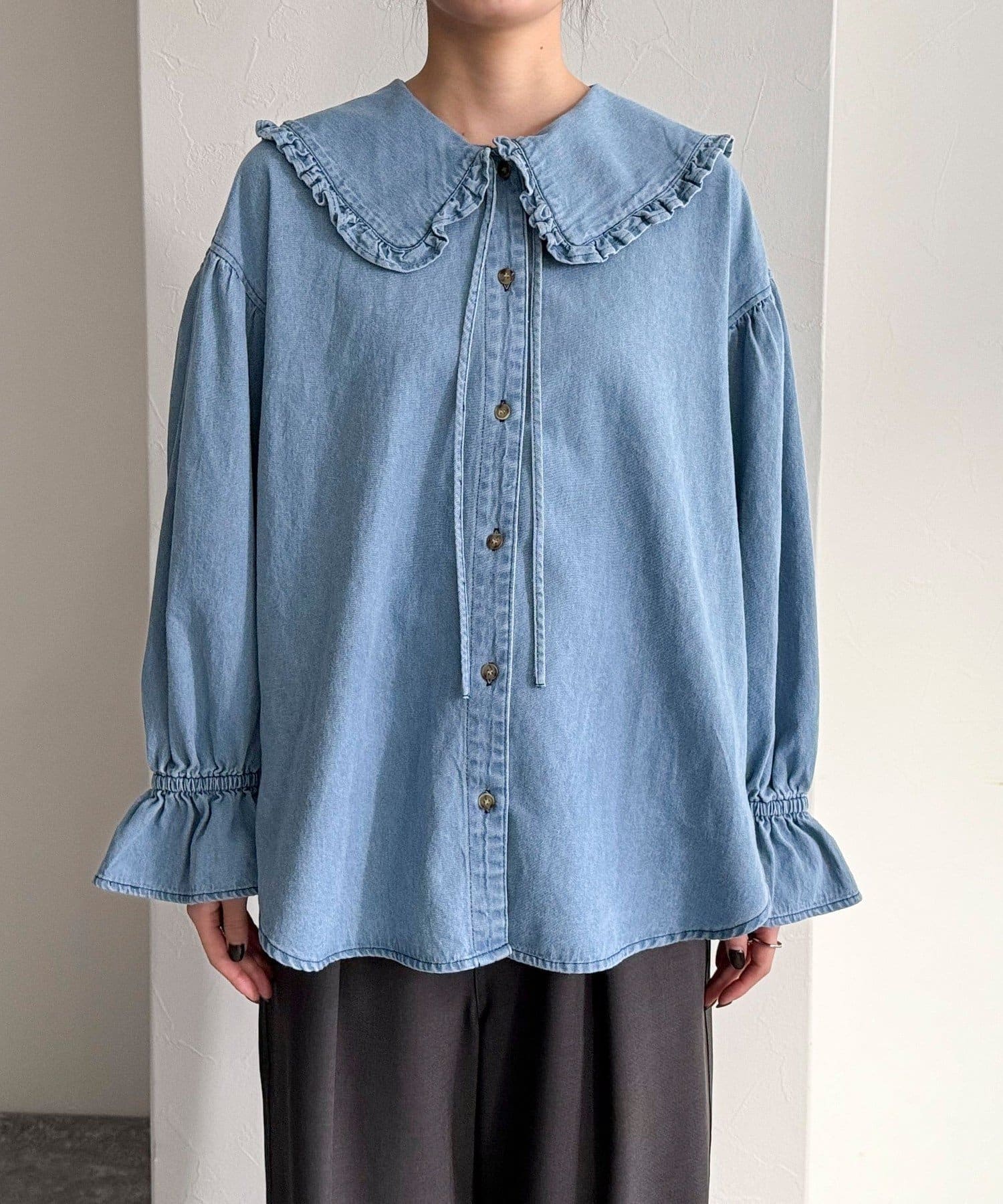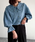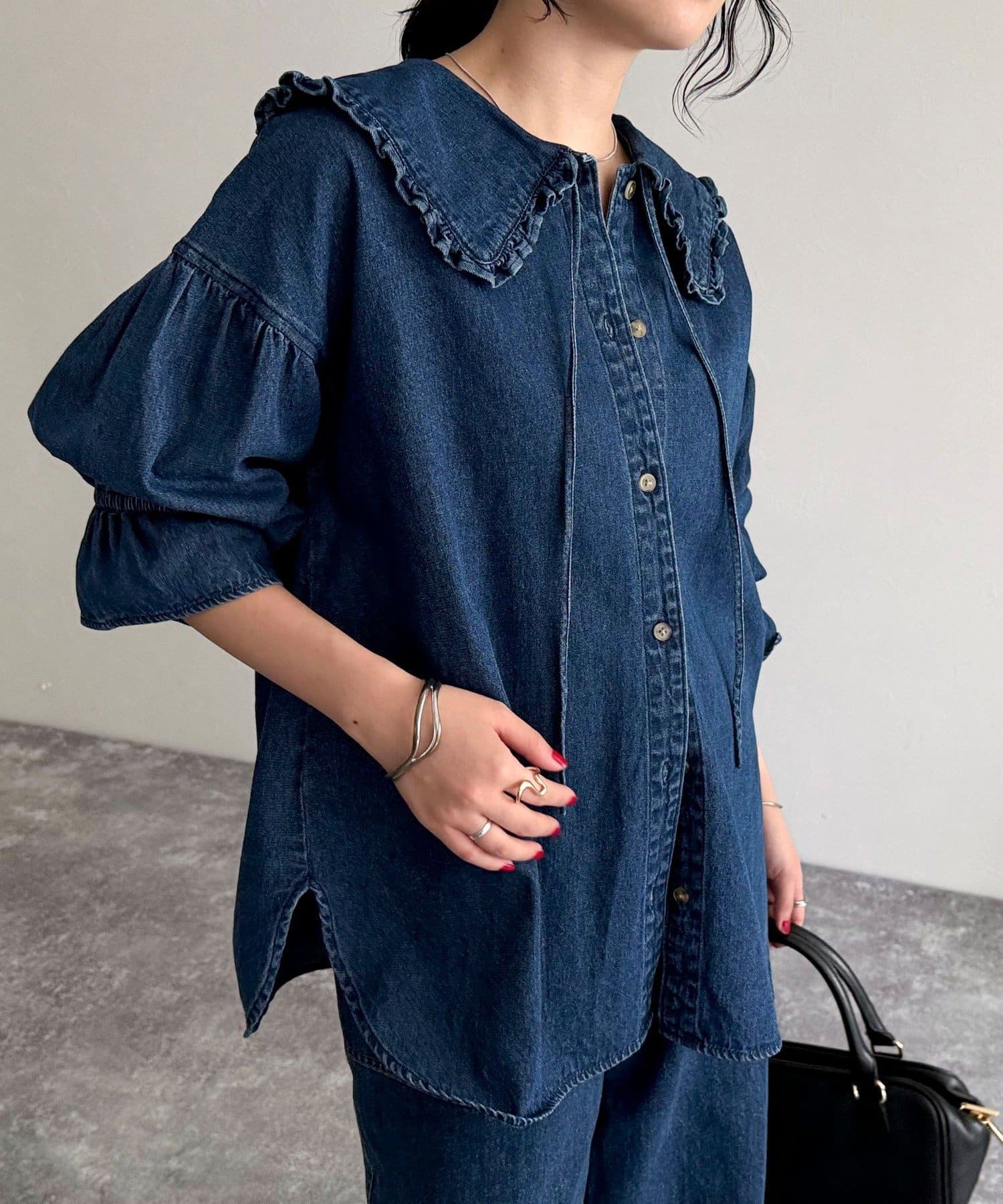 ・大き目のステンカラーがポイントのデニム素材のブラウスです