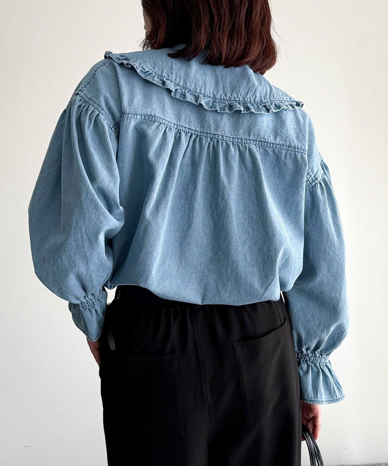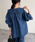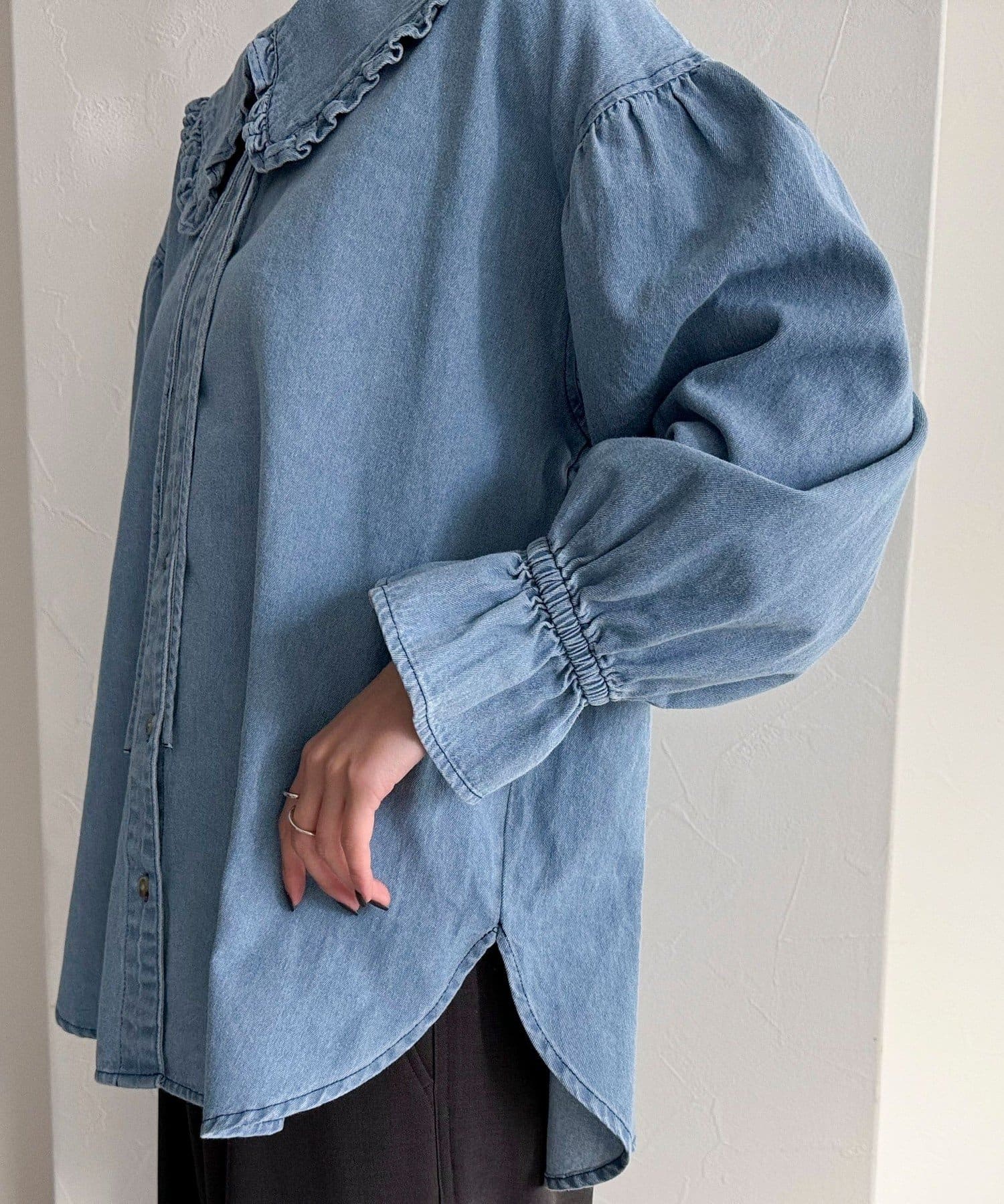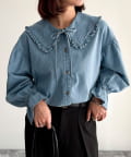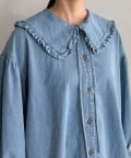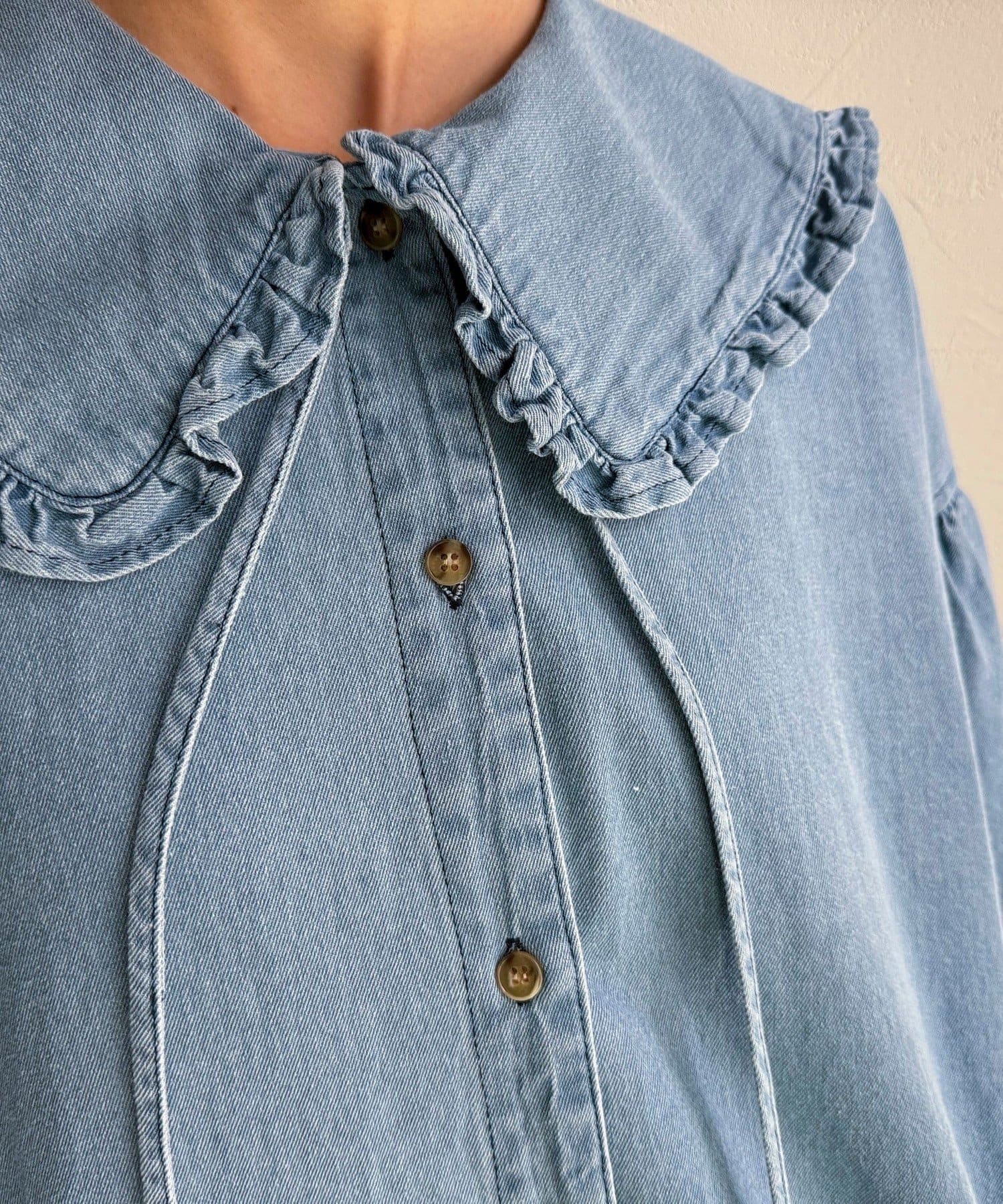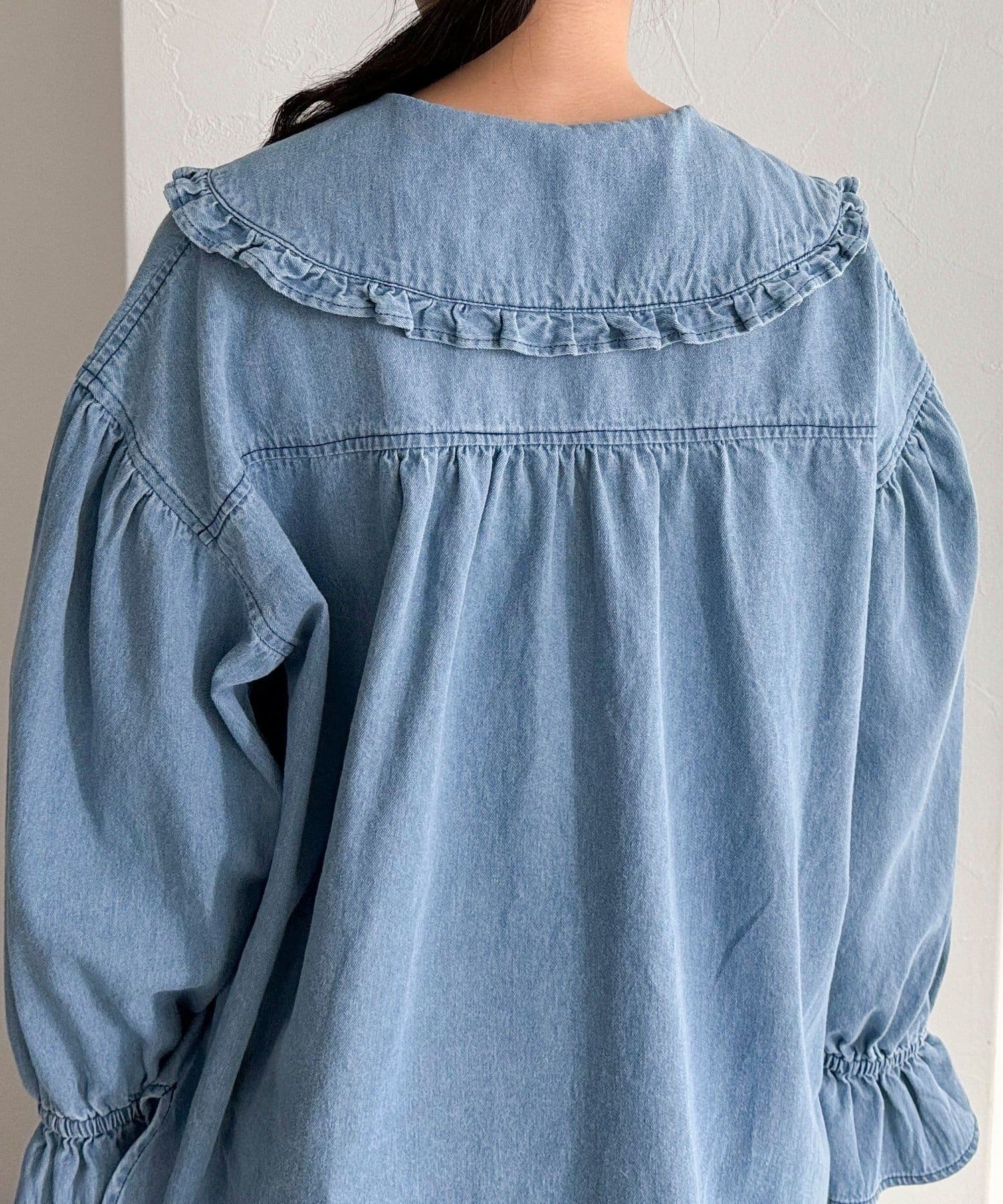 ・大き目のステンカラーがポイントのデニム素材のブラウスです