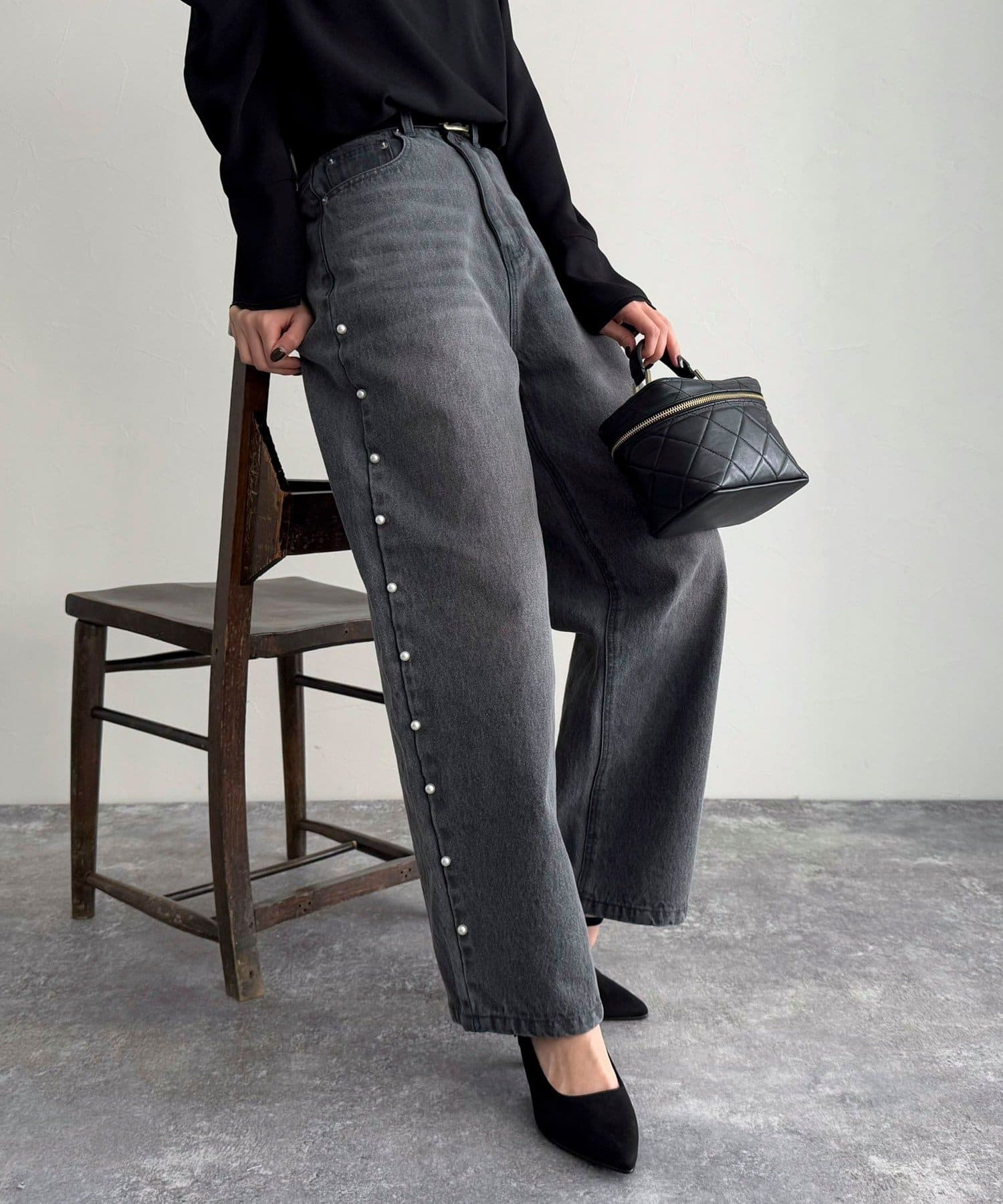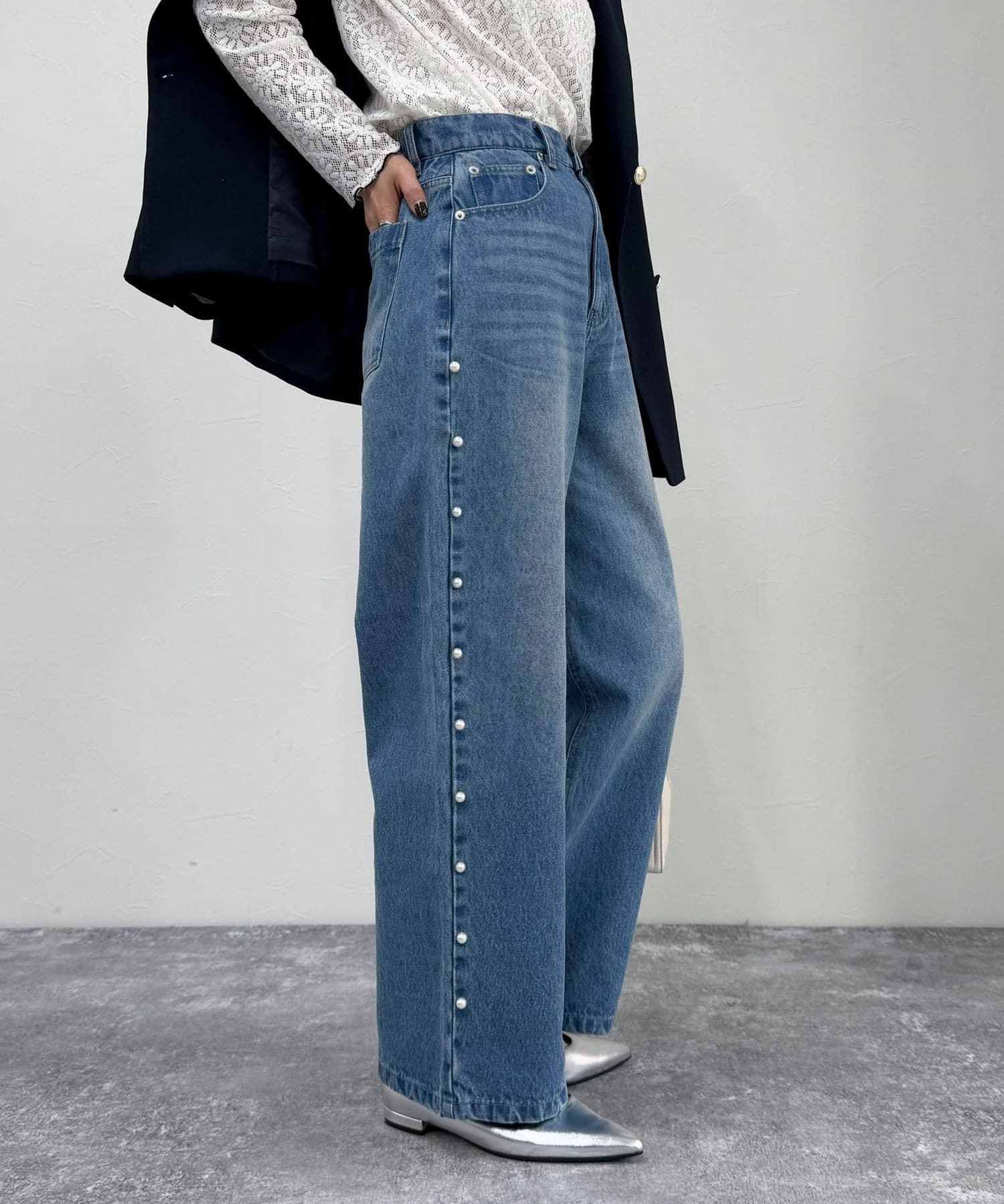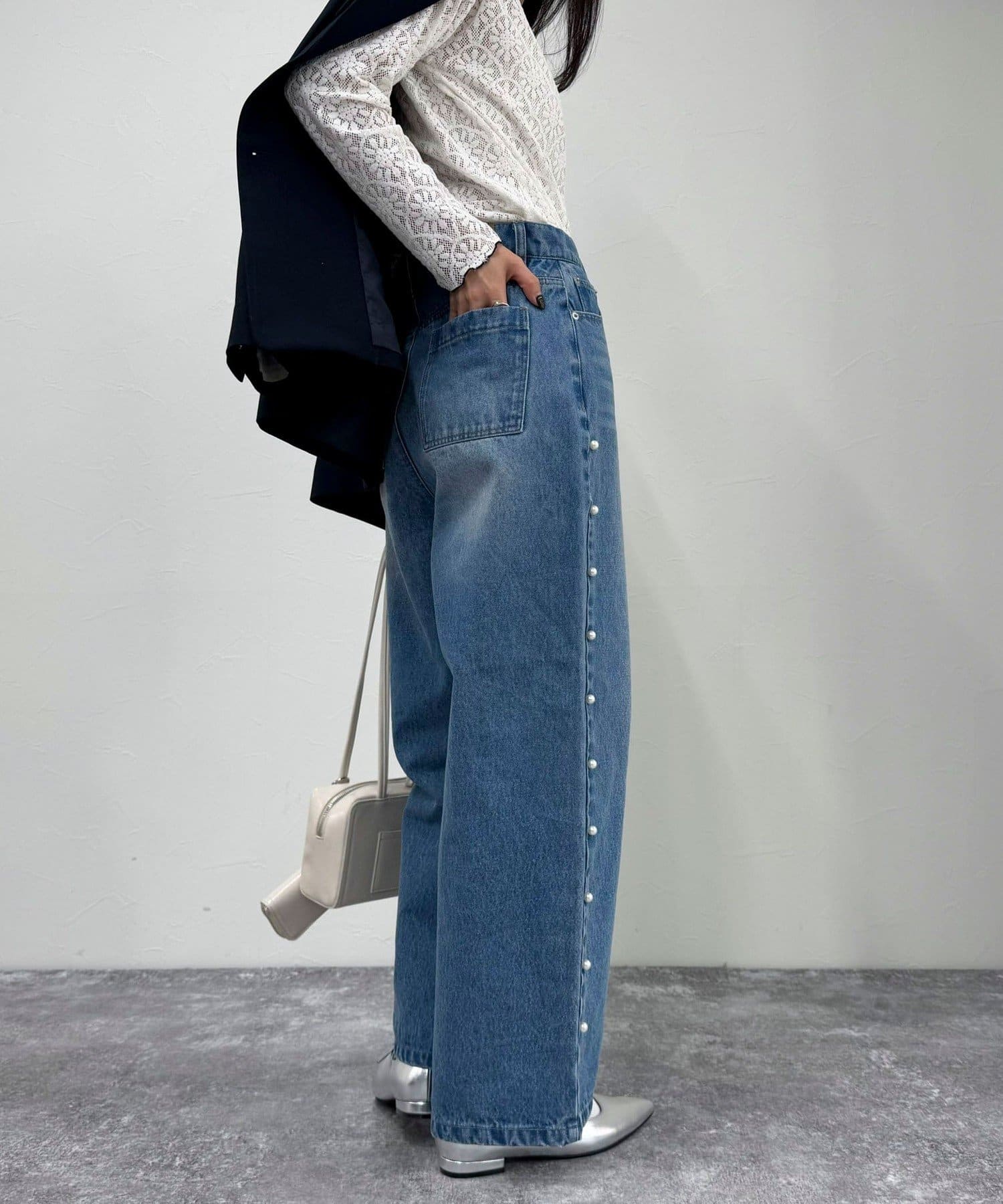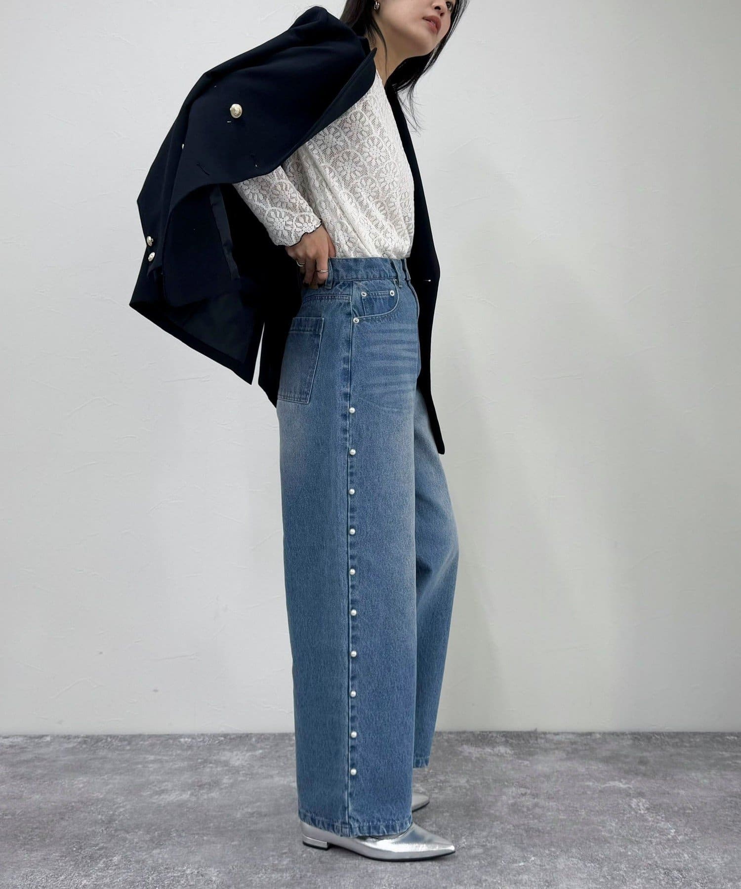 女性らしい着こなしが叶うパール付きセミワイドデニム