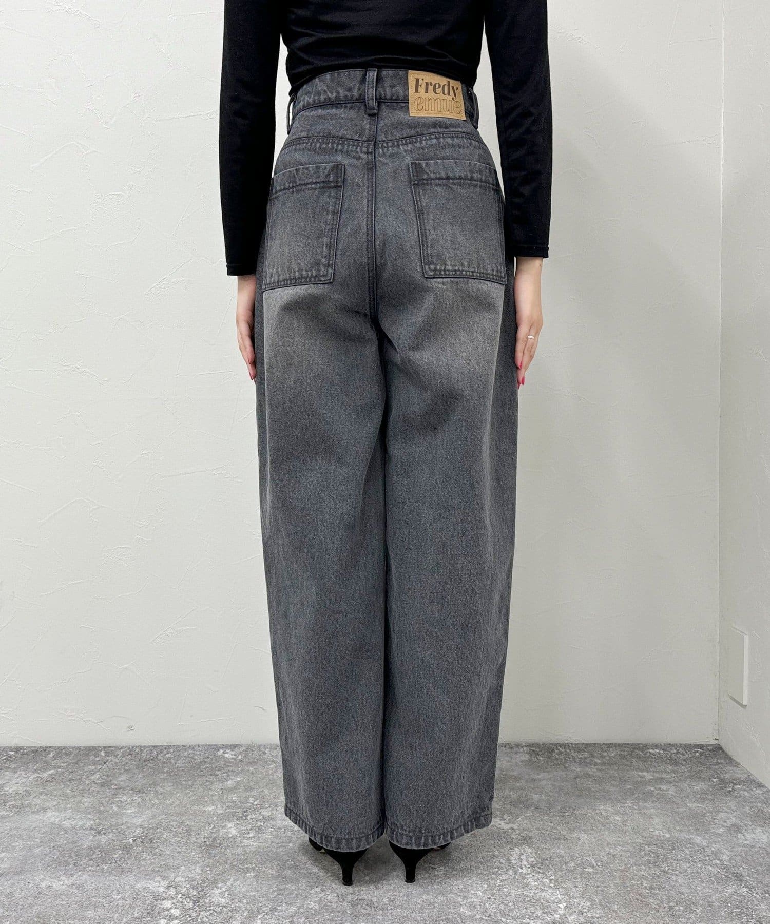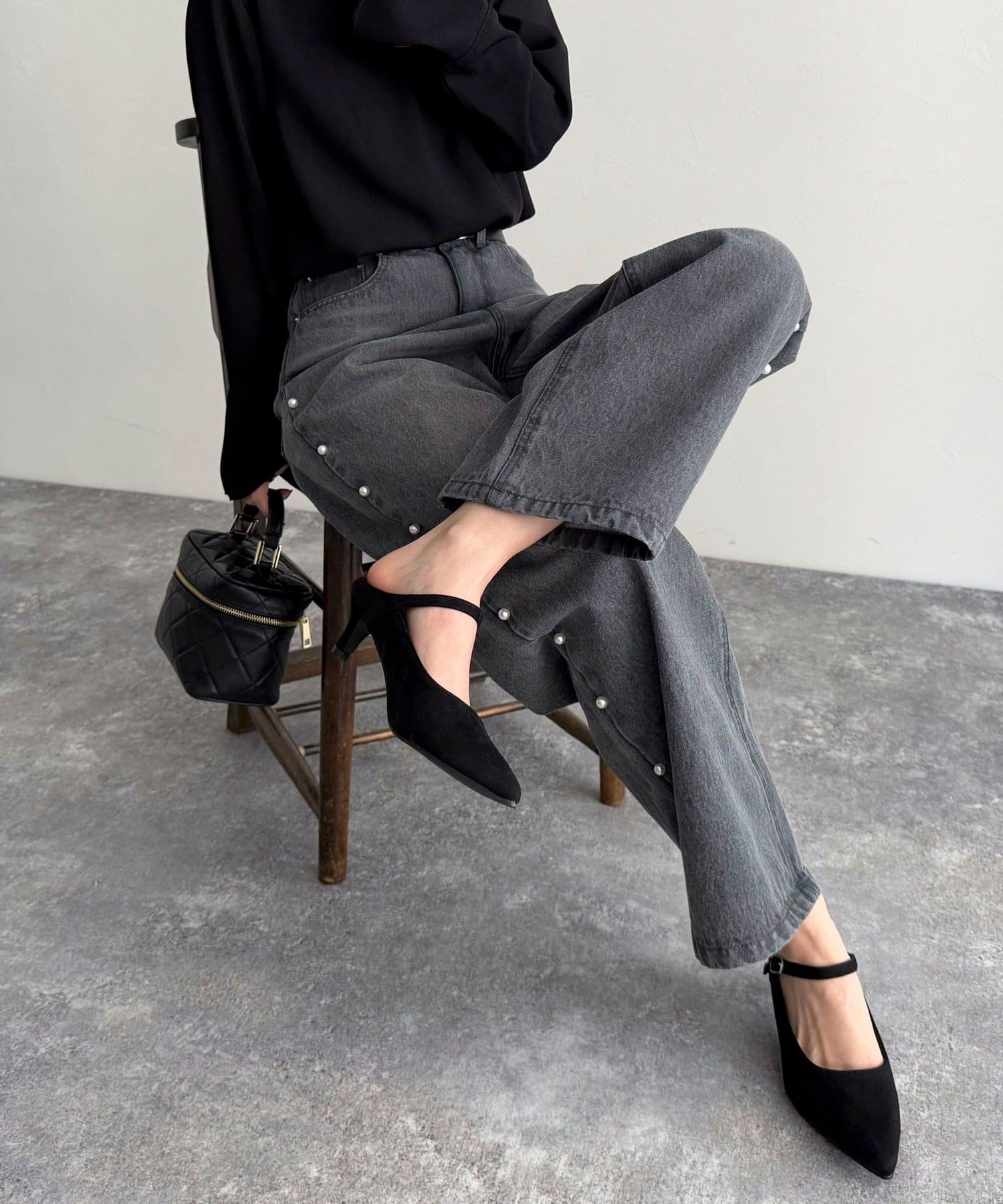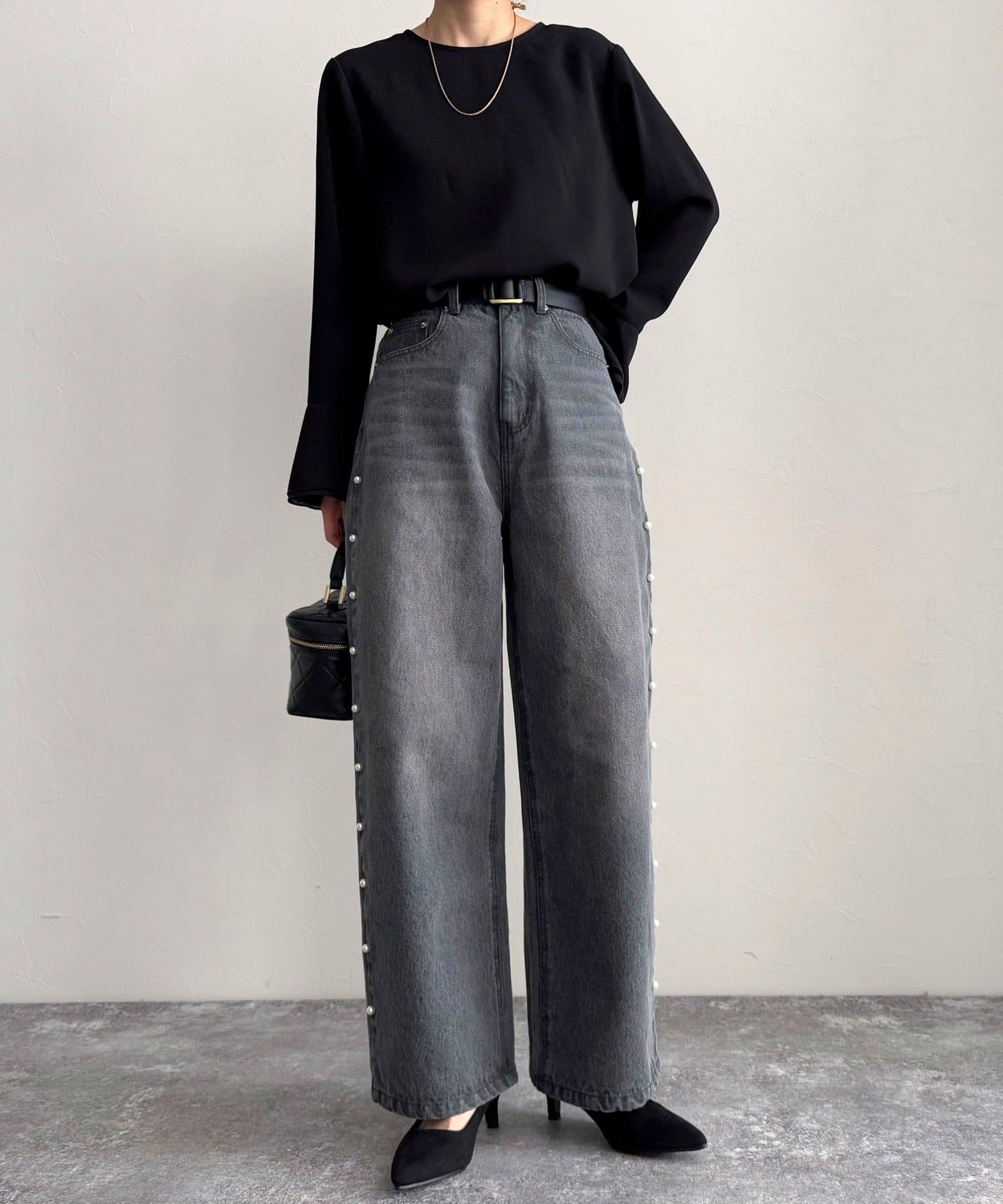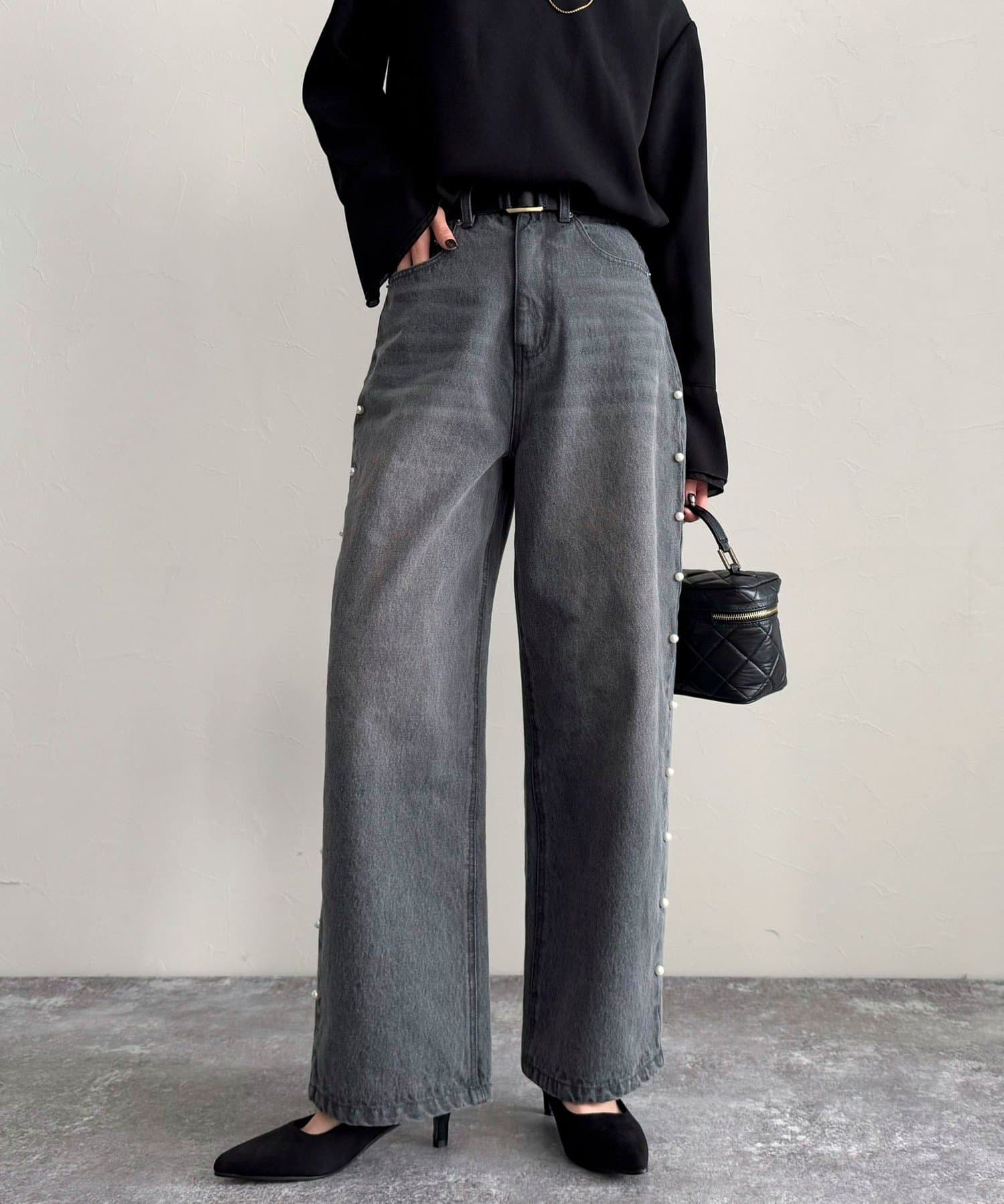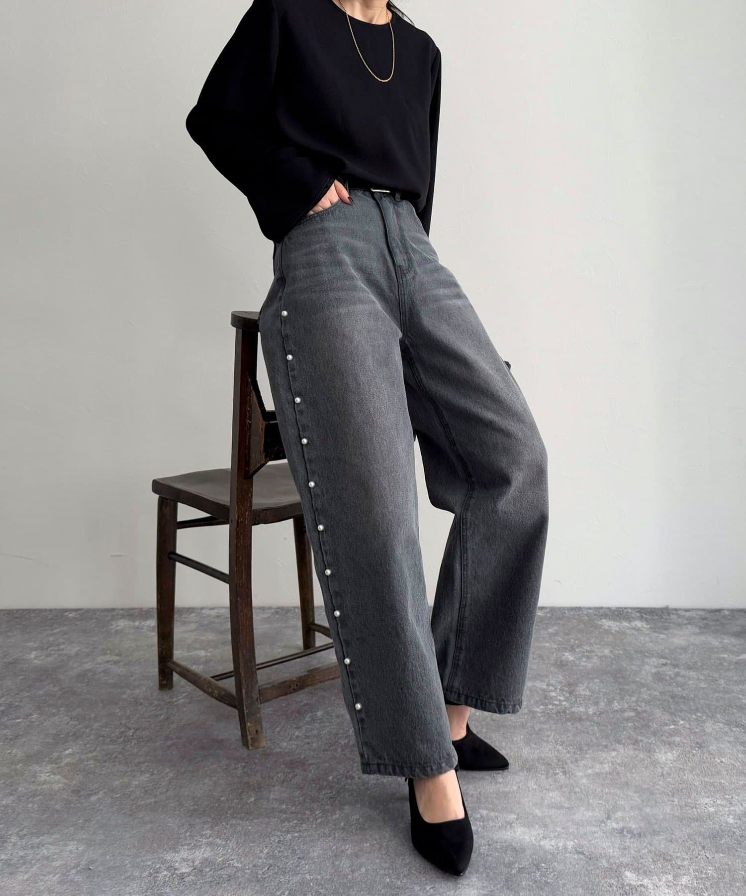 女性らしい着こなしが叶うパール付きセミワイドデニム