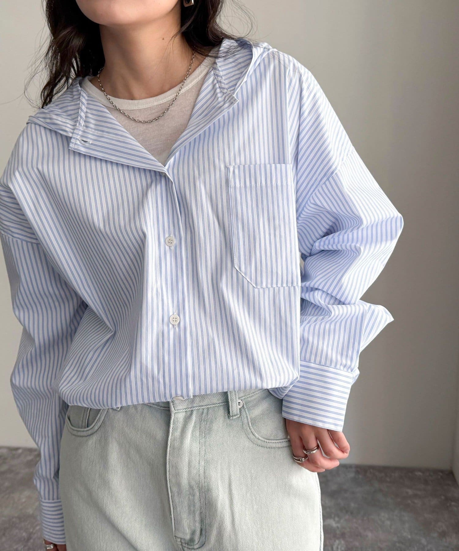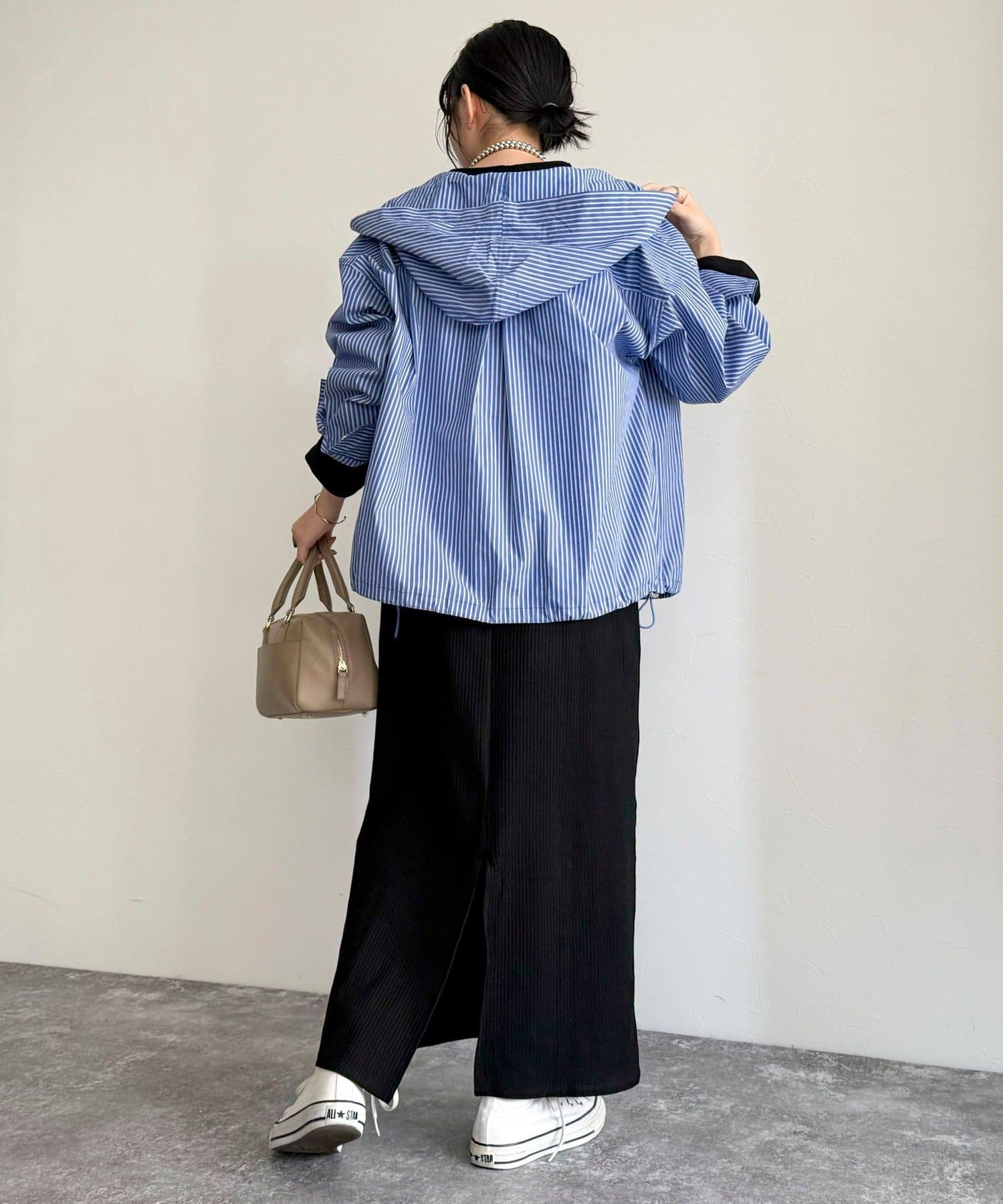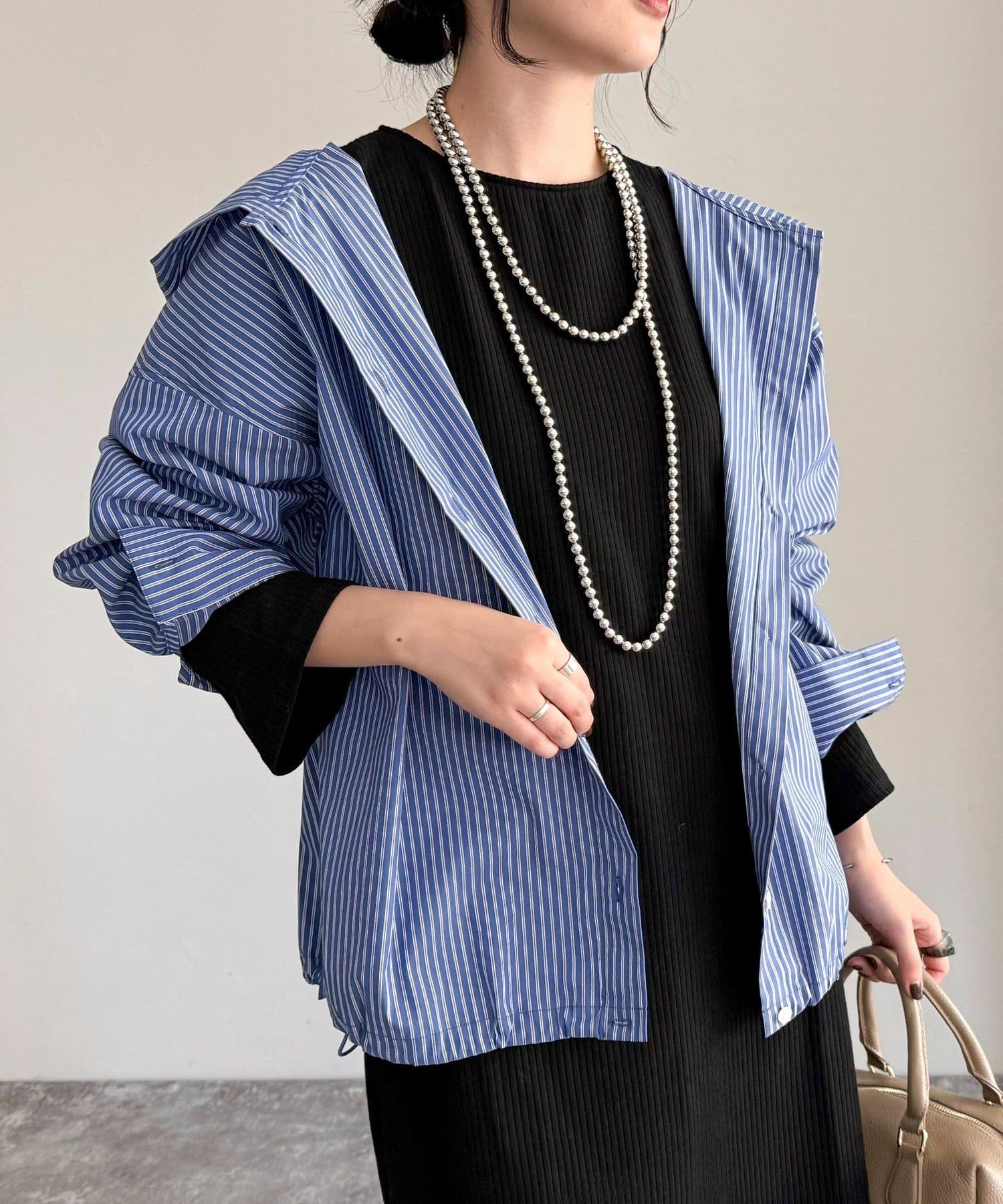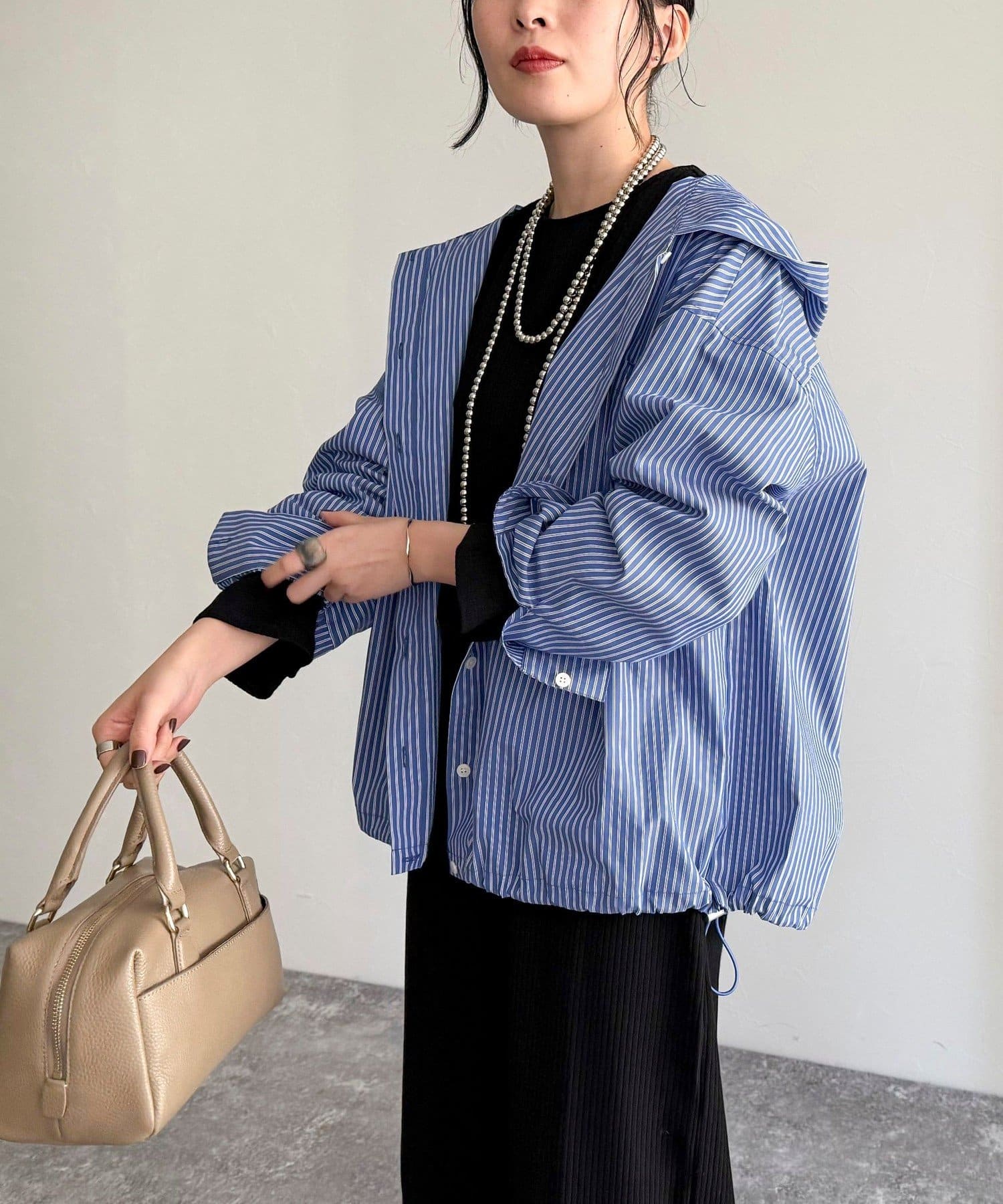春のワードローブに加えたい大人のストライプフーディーシャツ