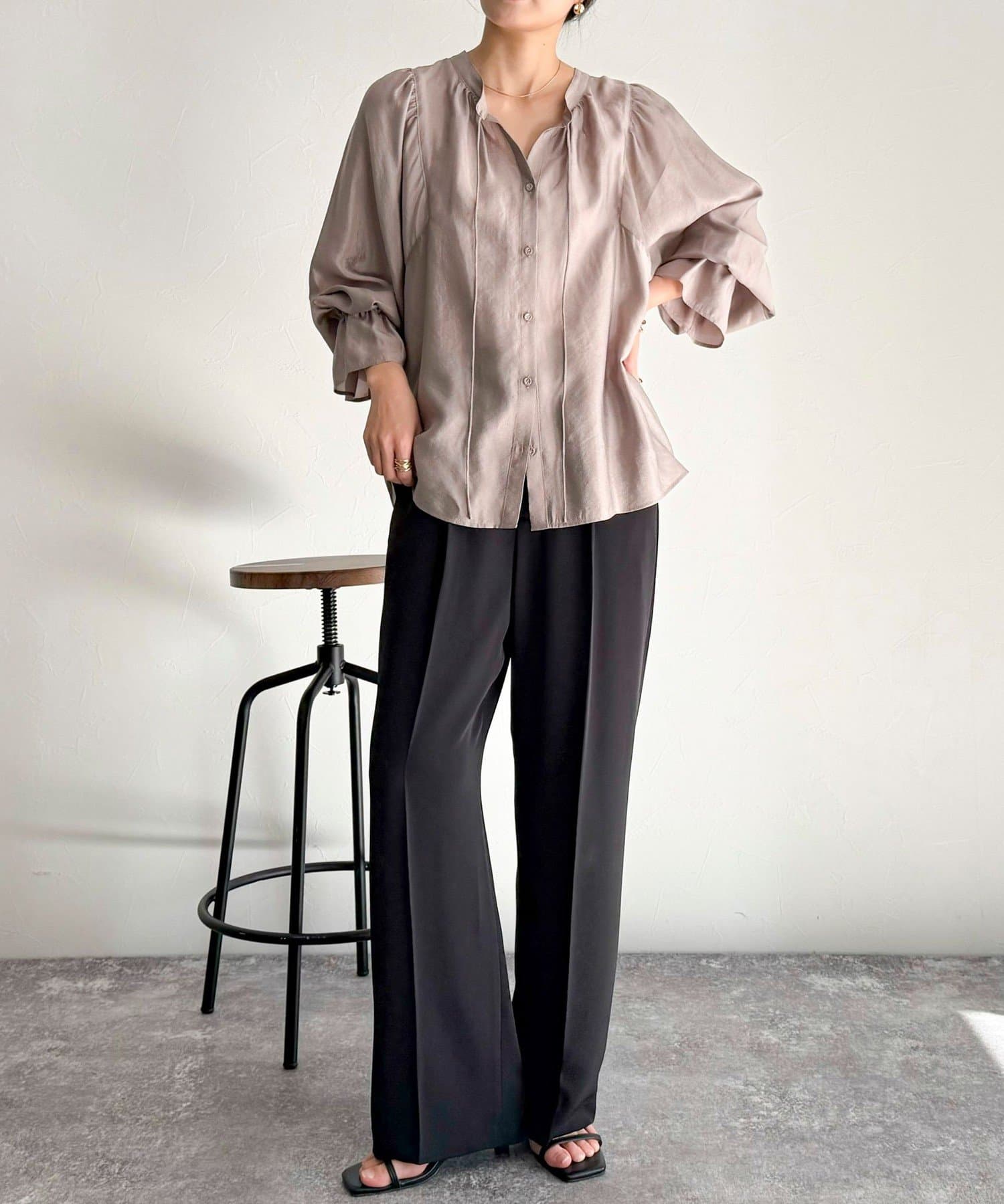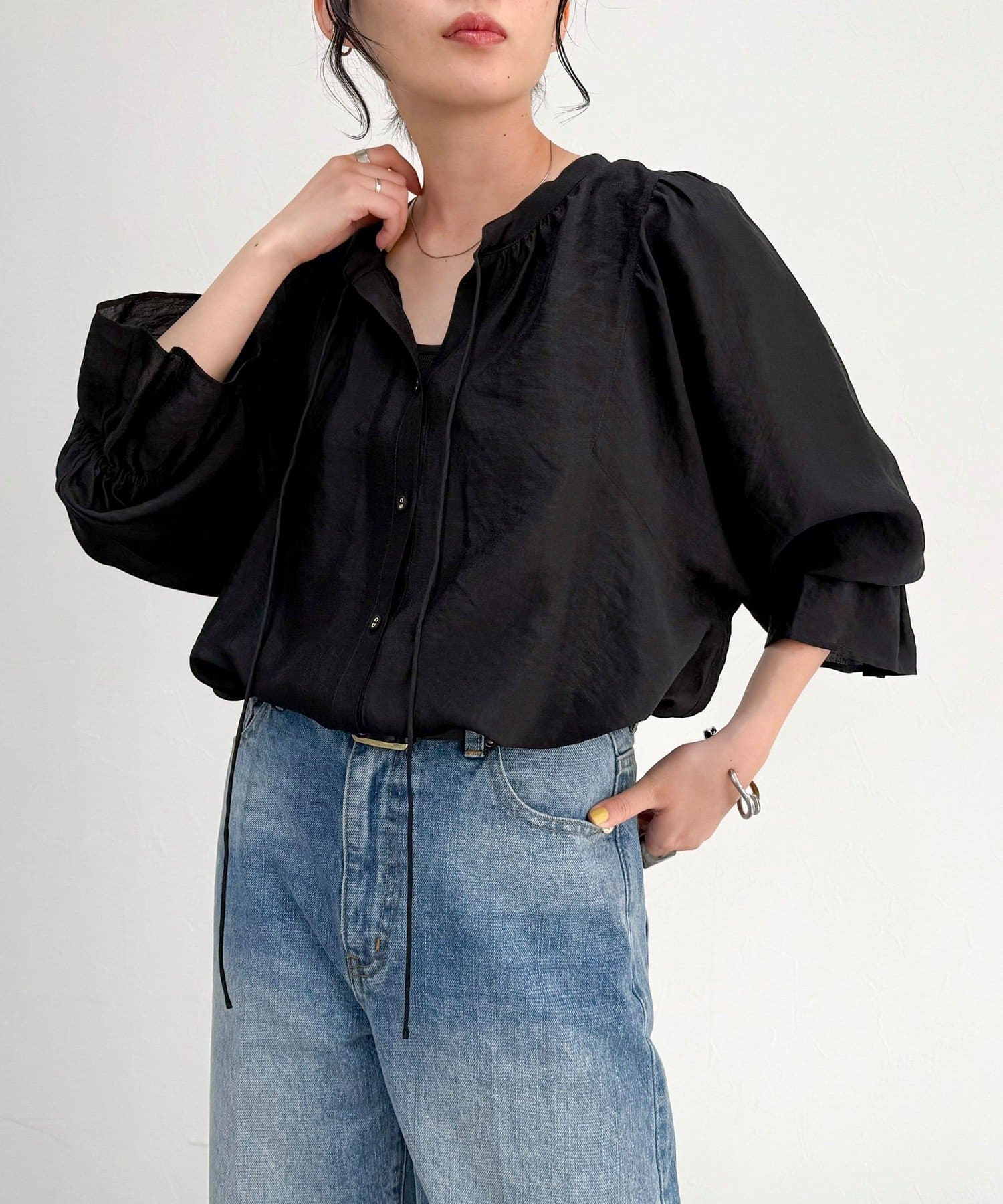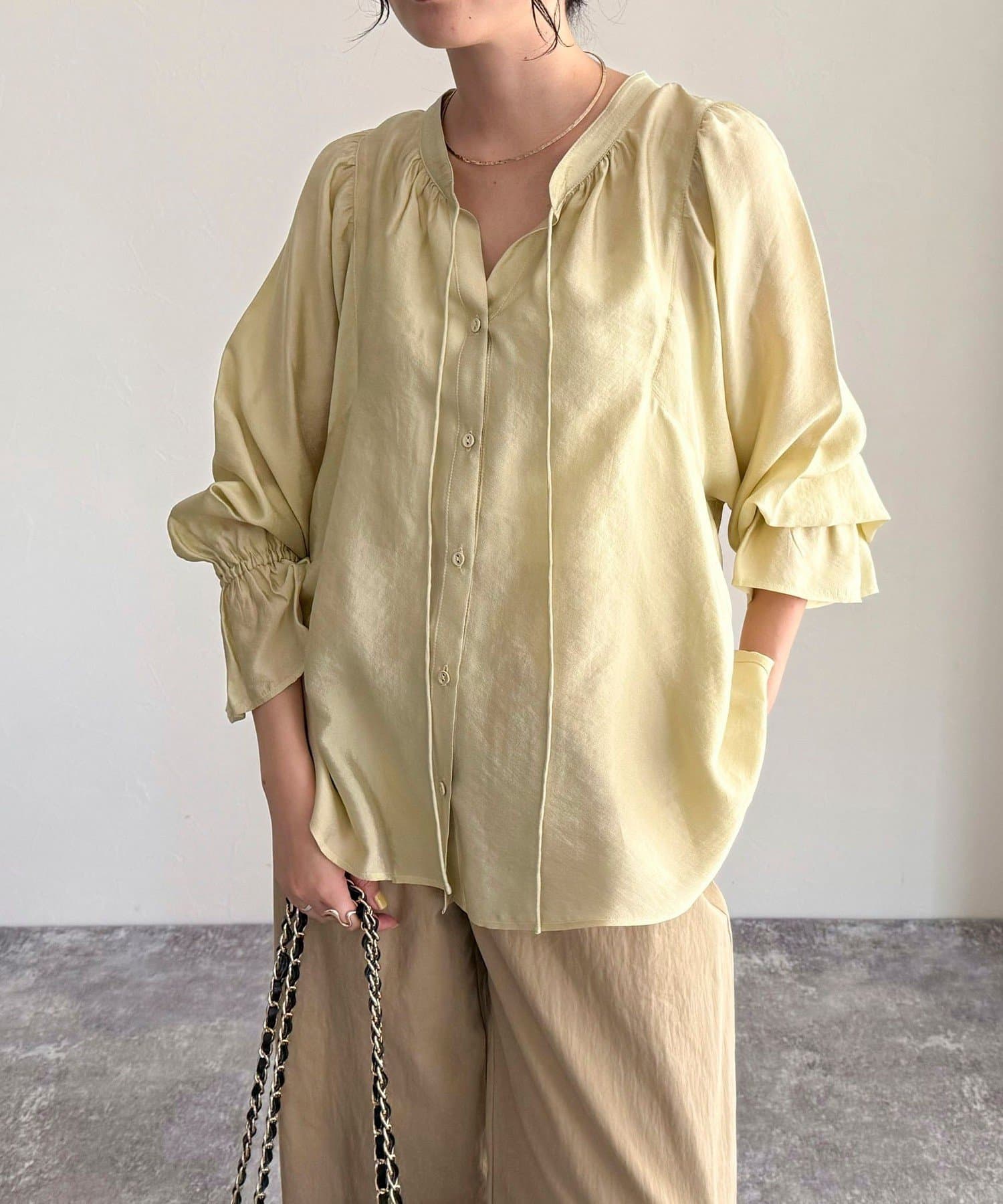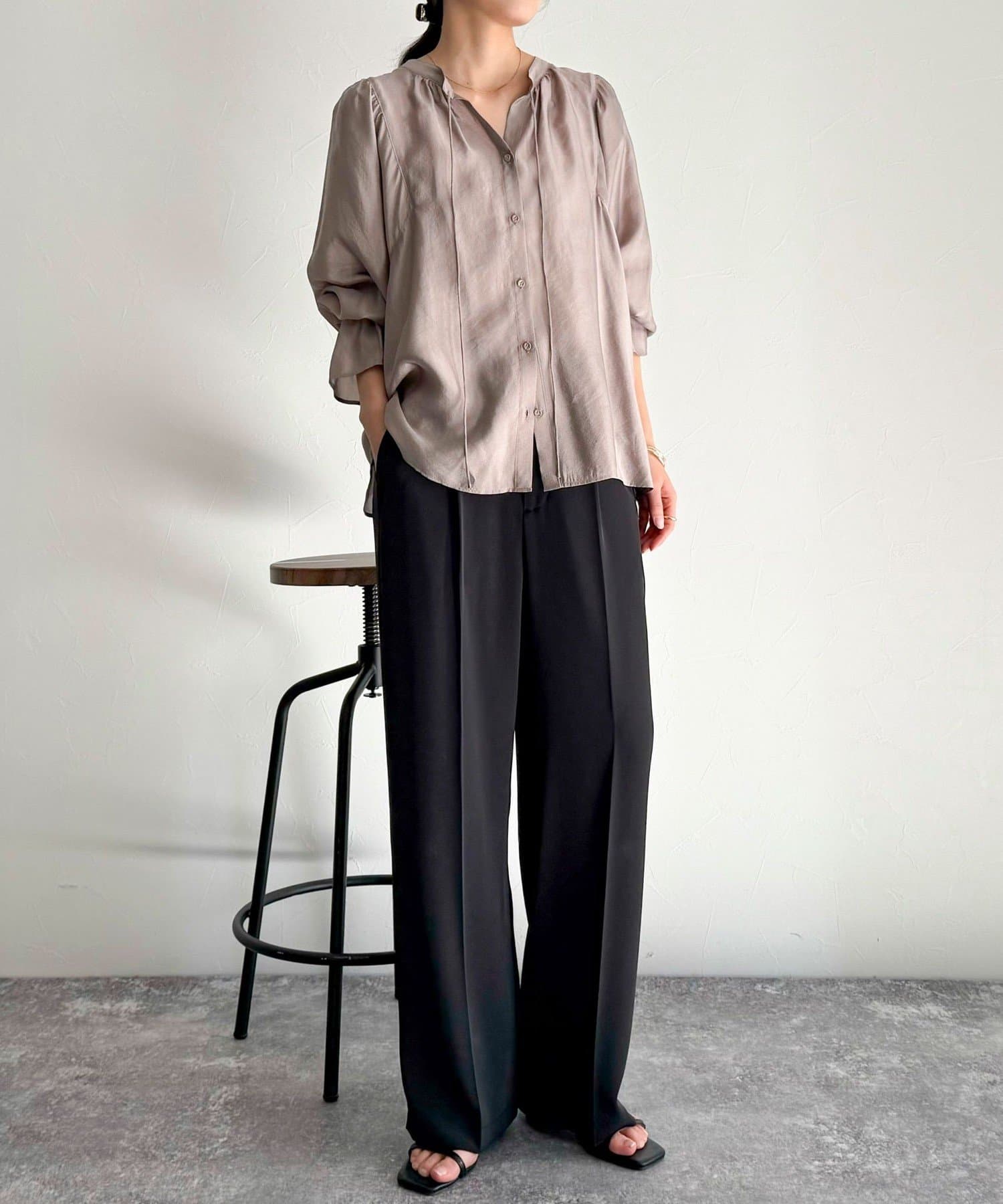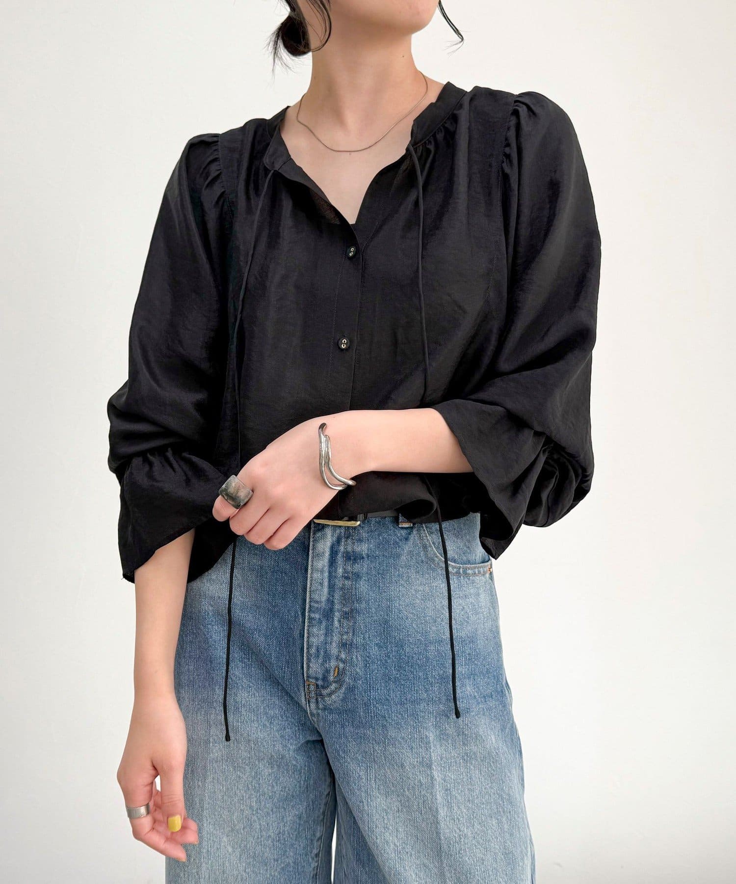 上品な着こなしが叶うシャイニーシアー2WAYギャザーブラウス