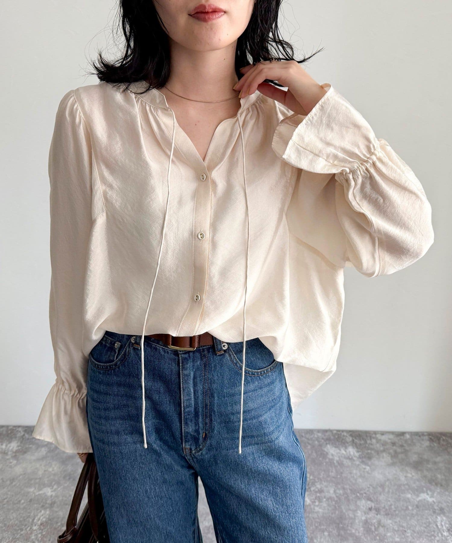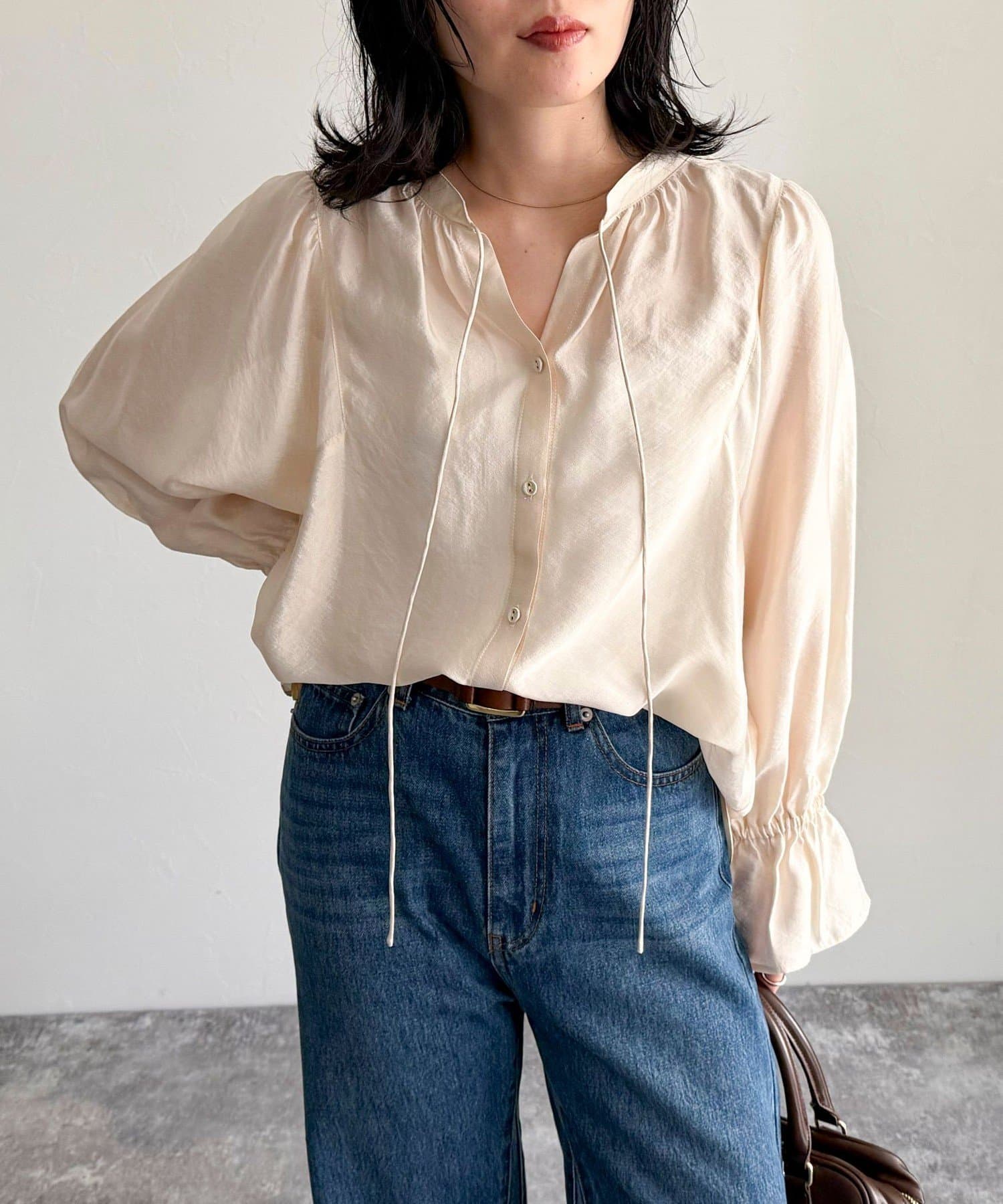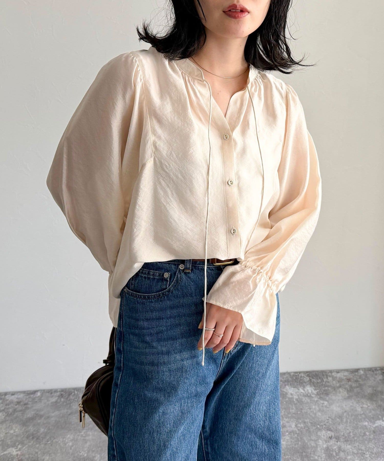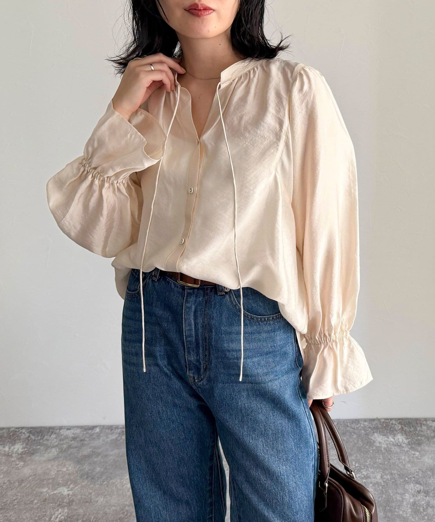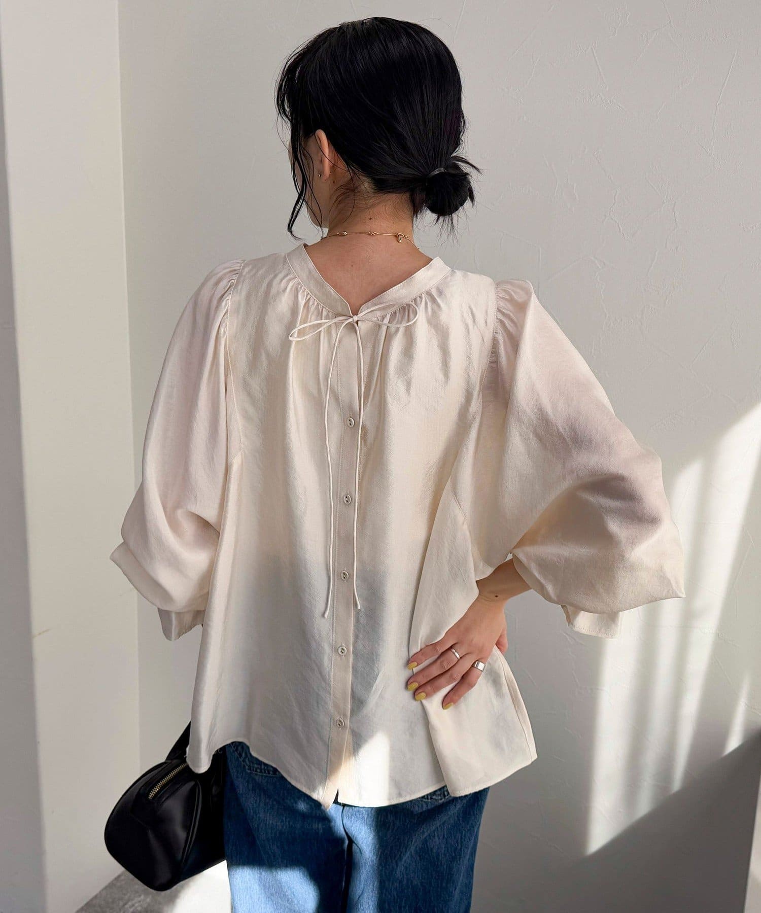 上品な着こなしが叶うシャイニーシアー2WAYギャザーブラウス