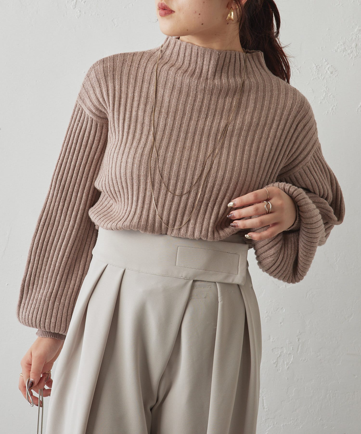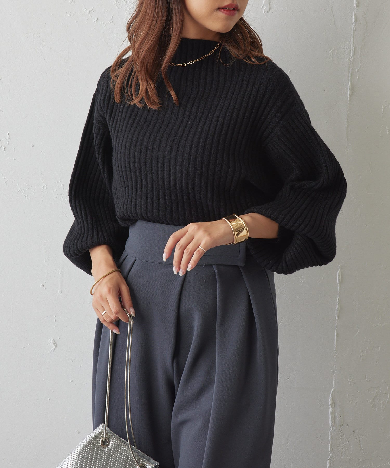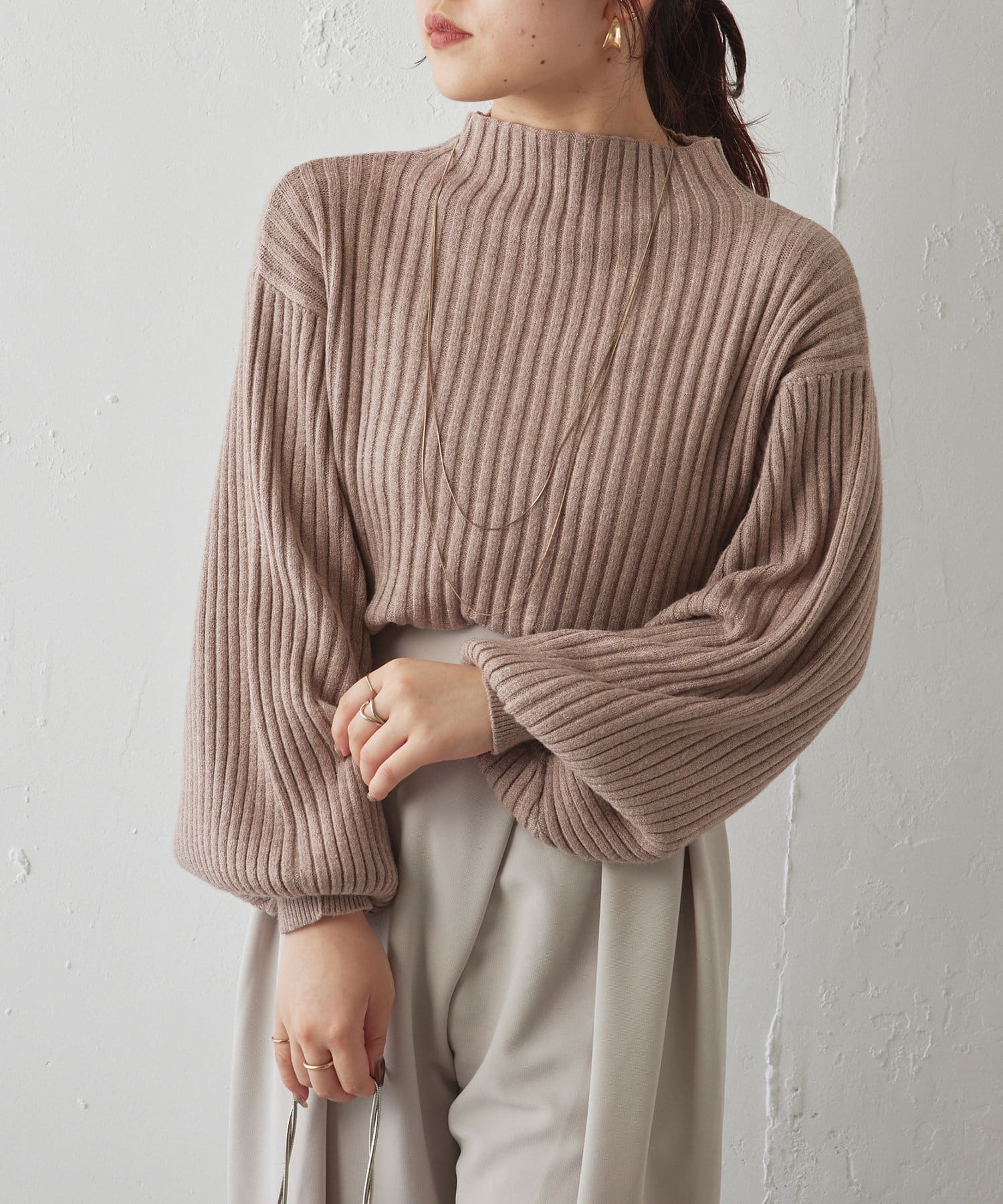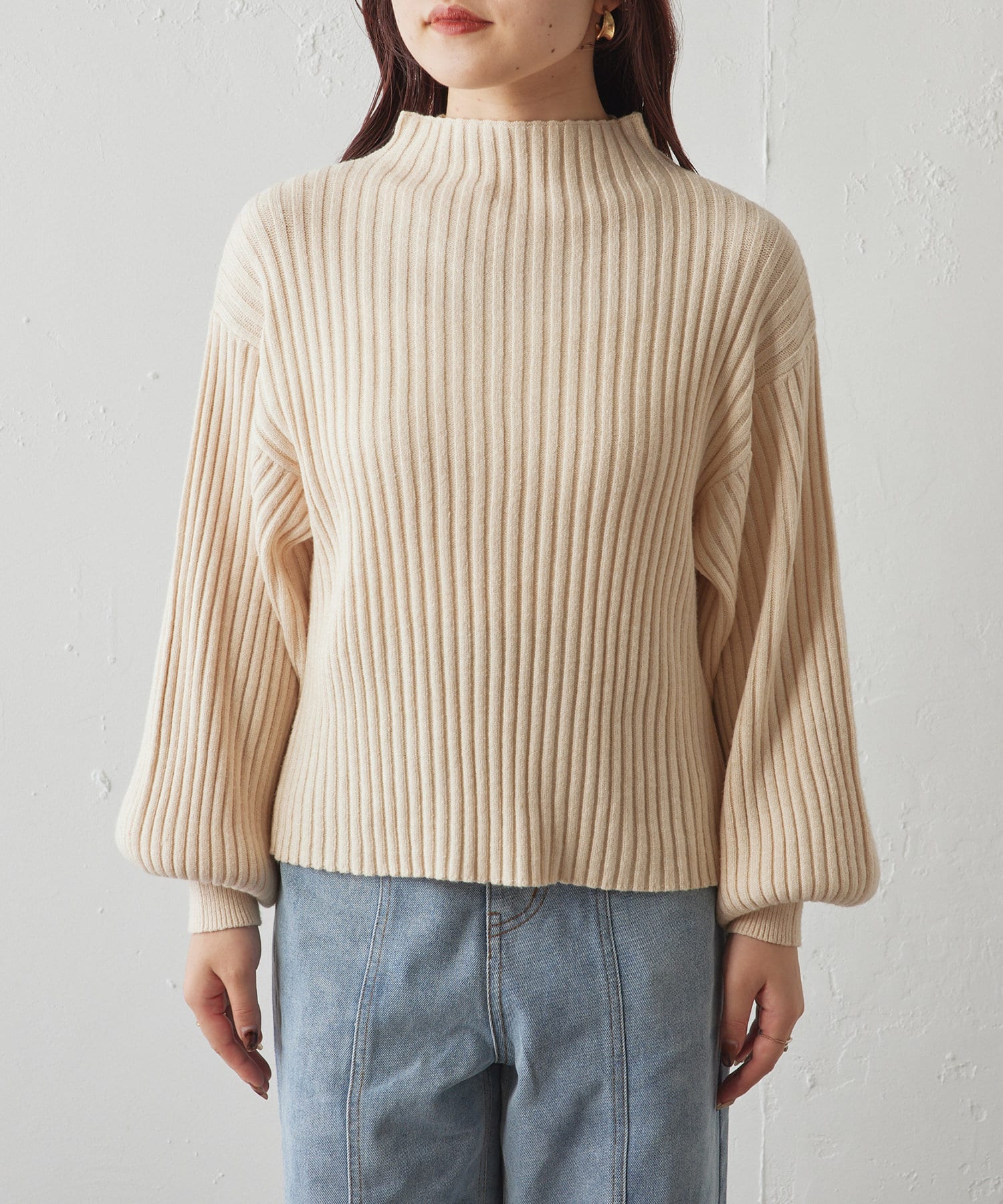 ・ボリュームスリーブとハイネックが程よいルーズさを演出。着るだけで旬顔に。