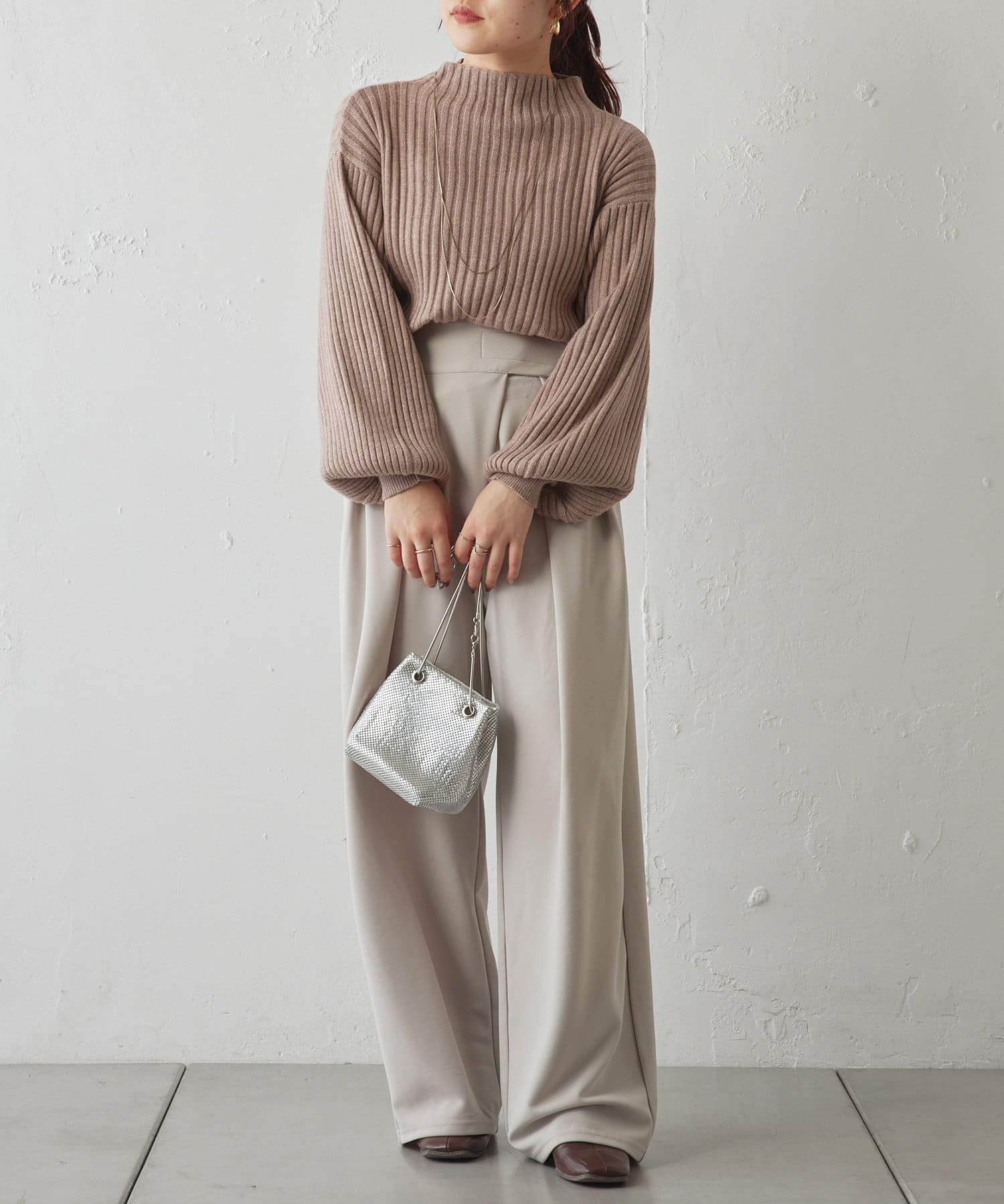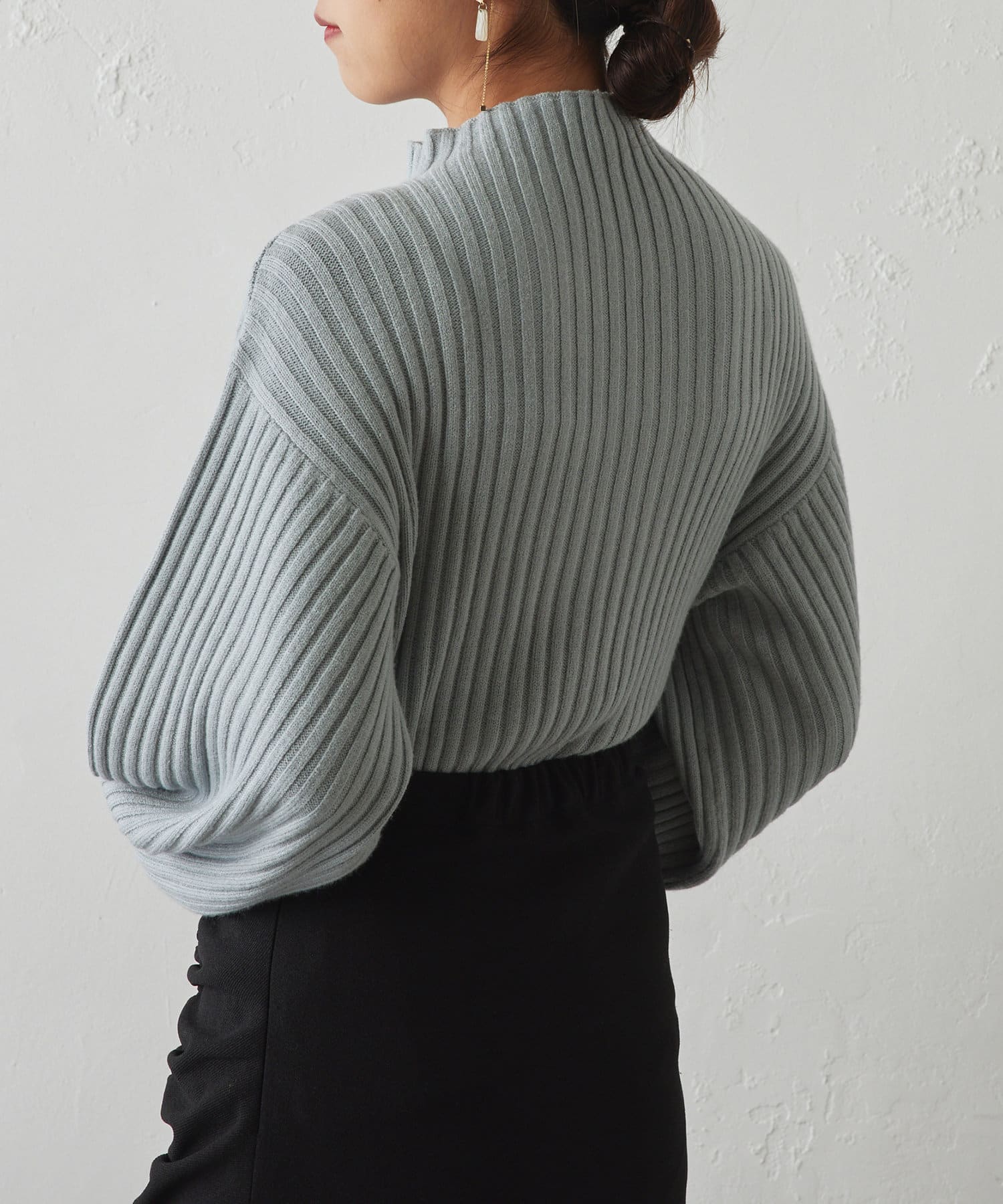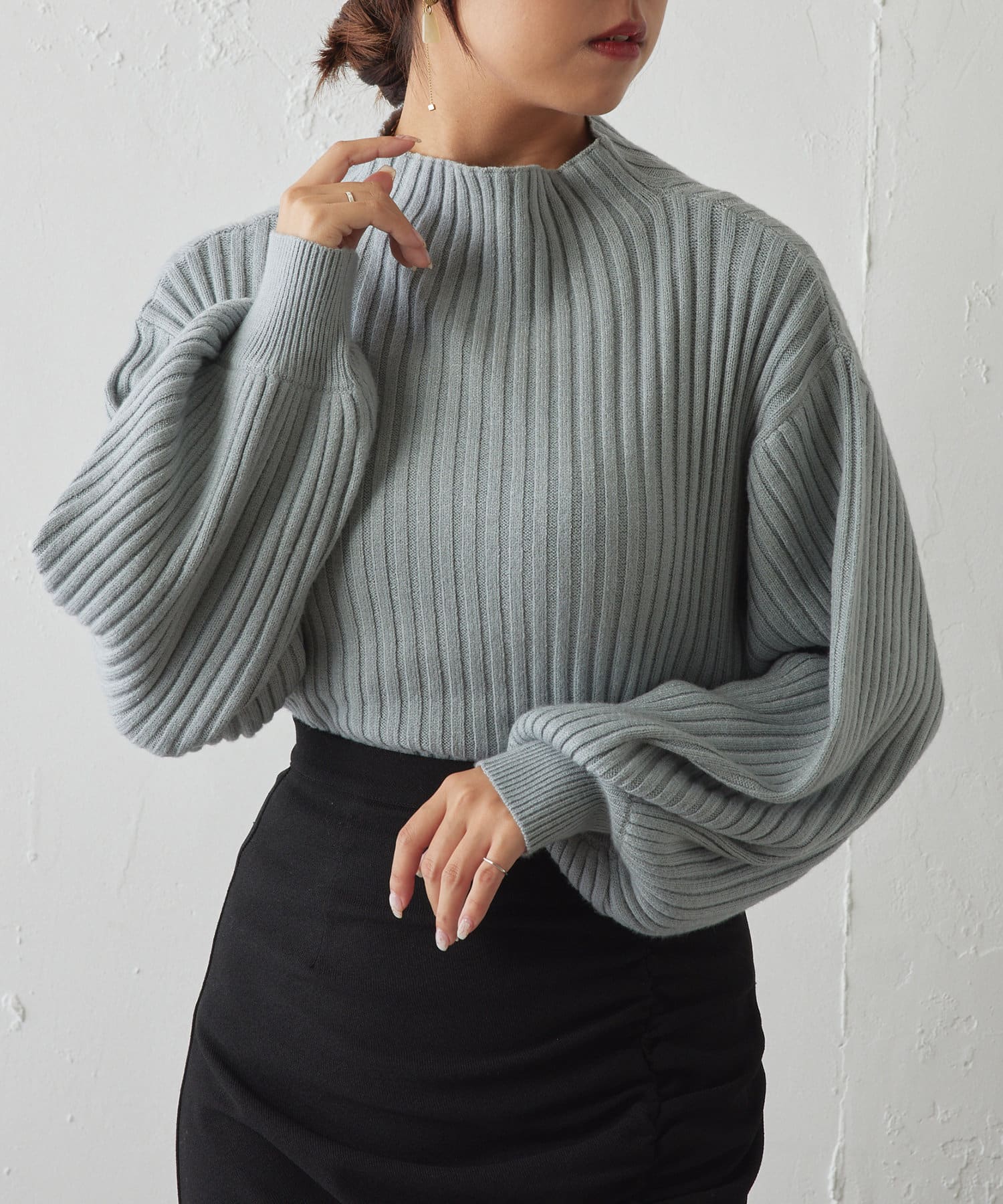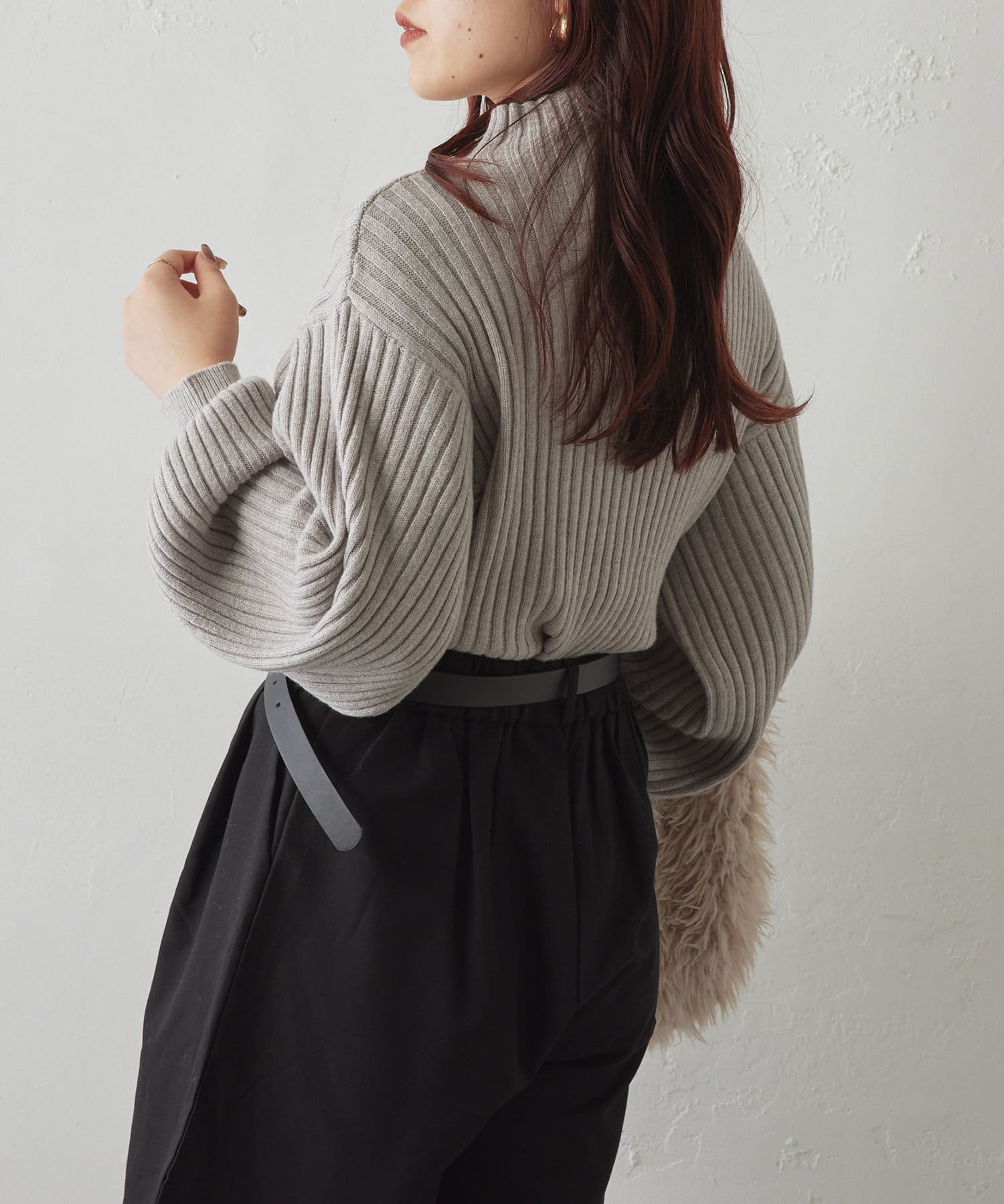 ・ボリュームスリーブとハイネックが程よいルーズさを演出。着るだけで旬顔に。