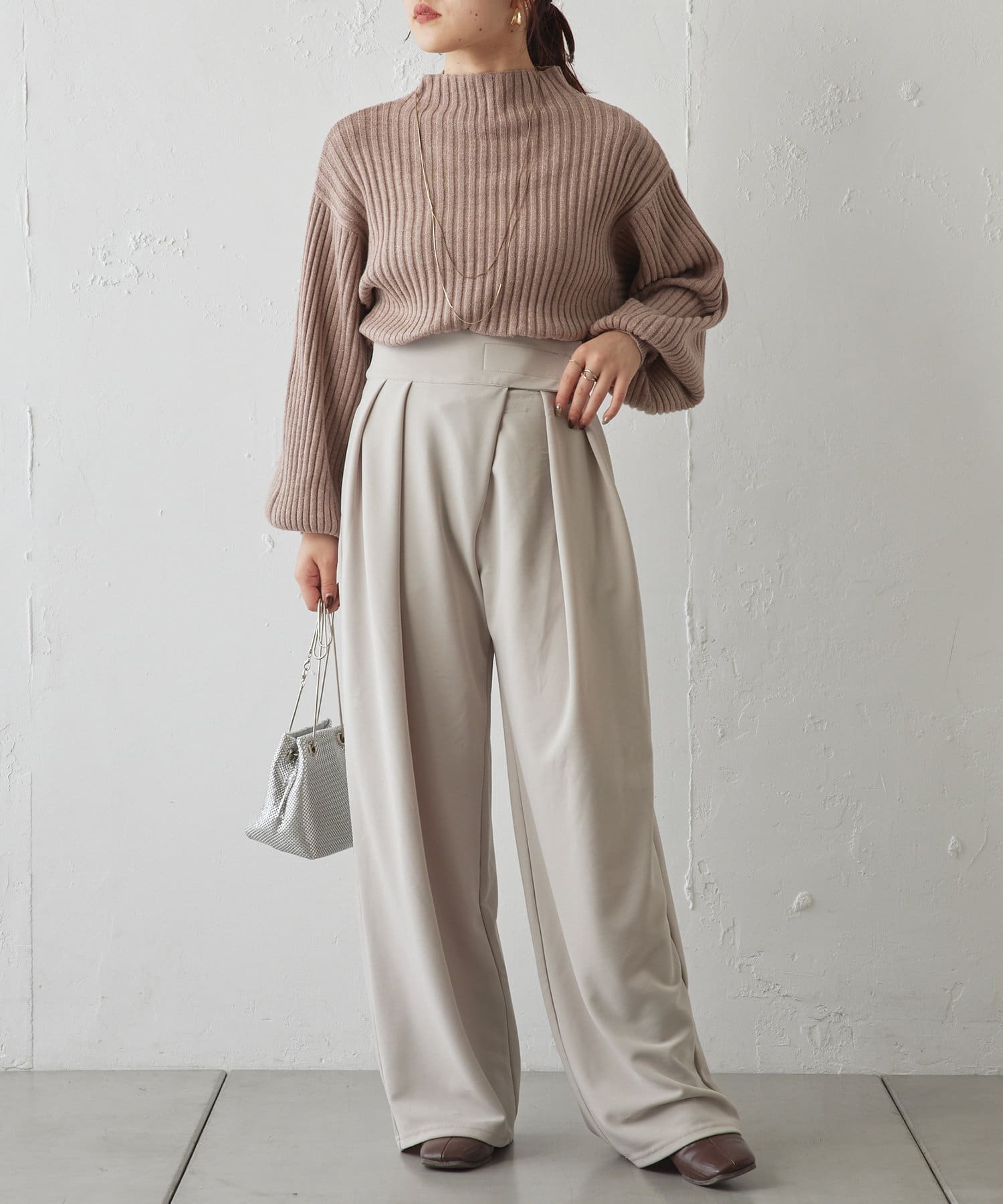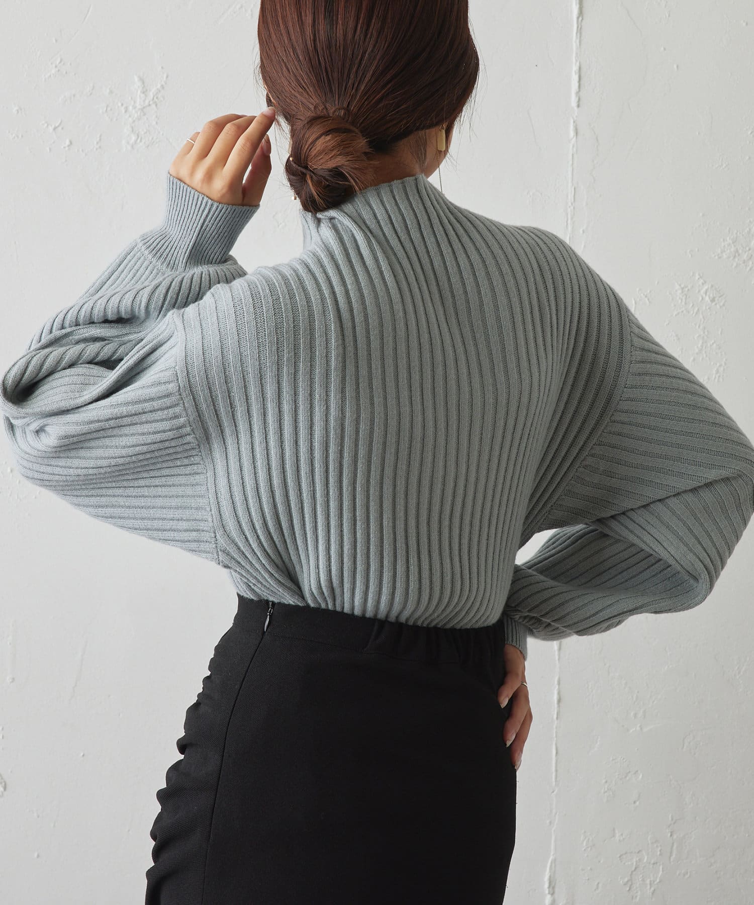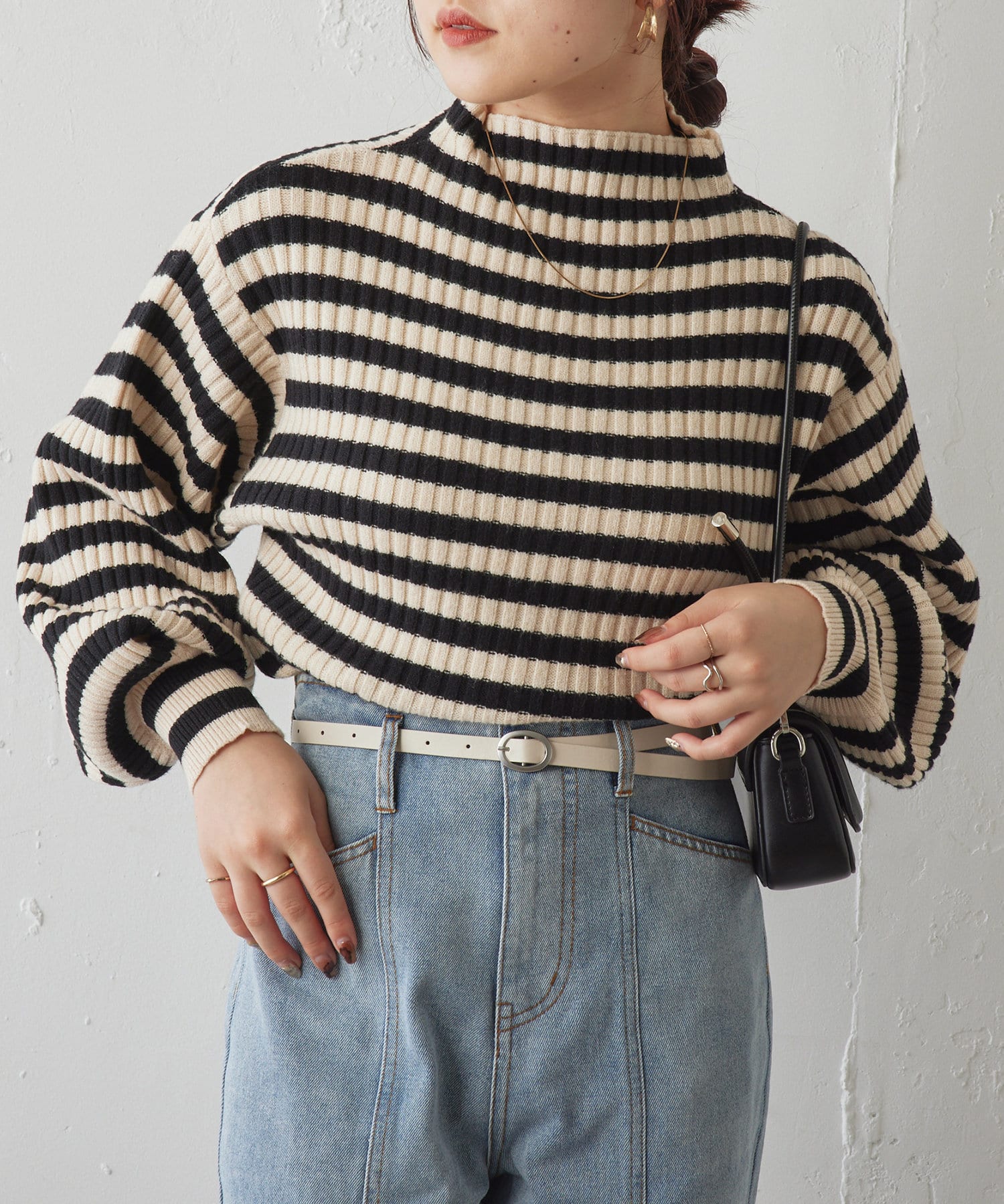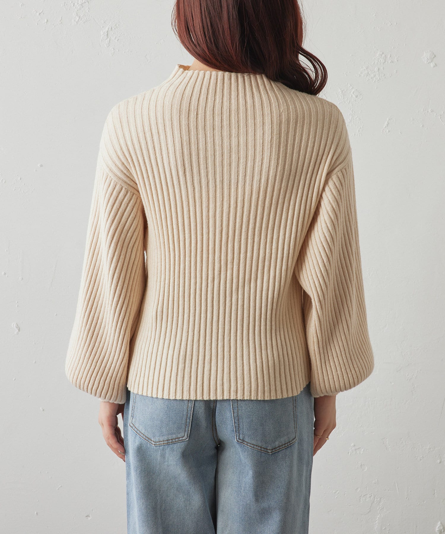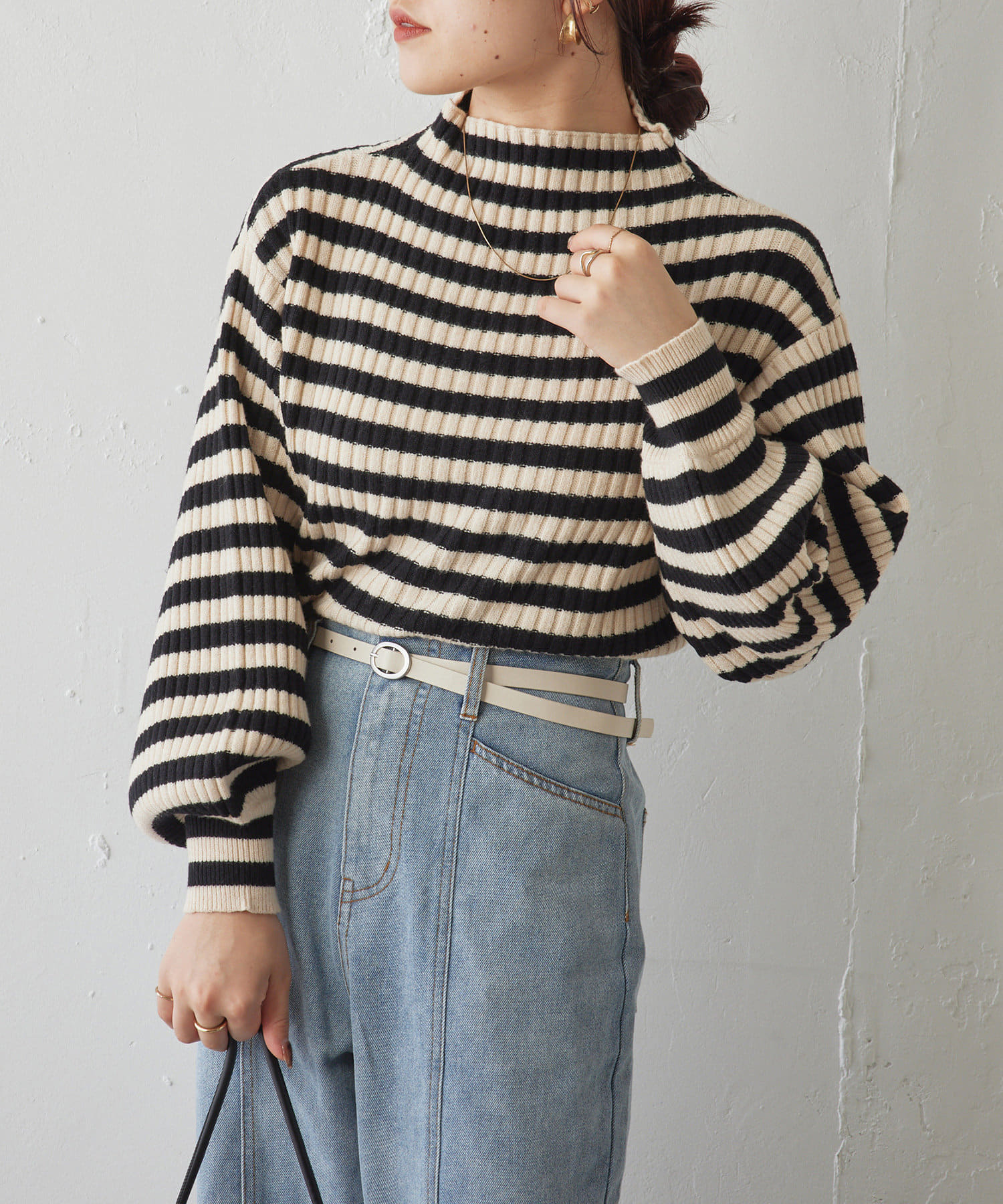 ・ボリュームスリーブとハイネックが程よいルーズさを演出。着るだけで旬顔に。