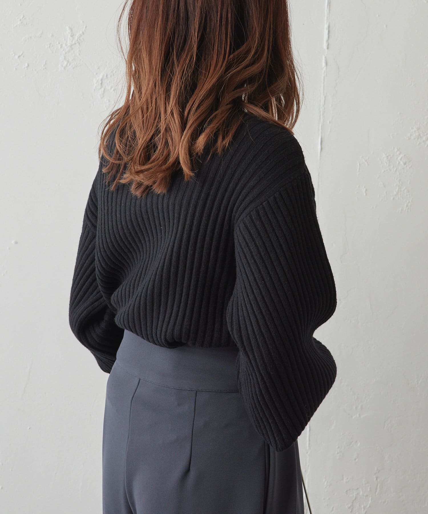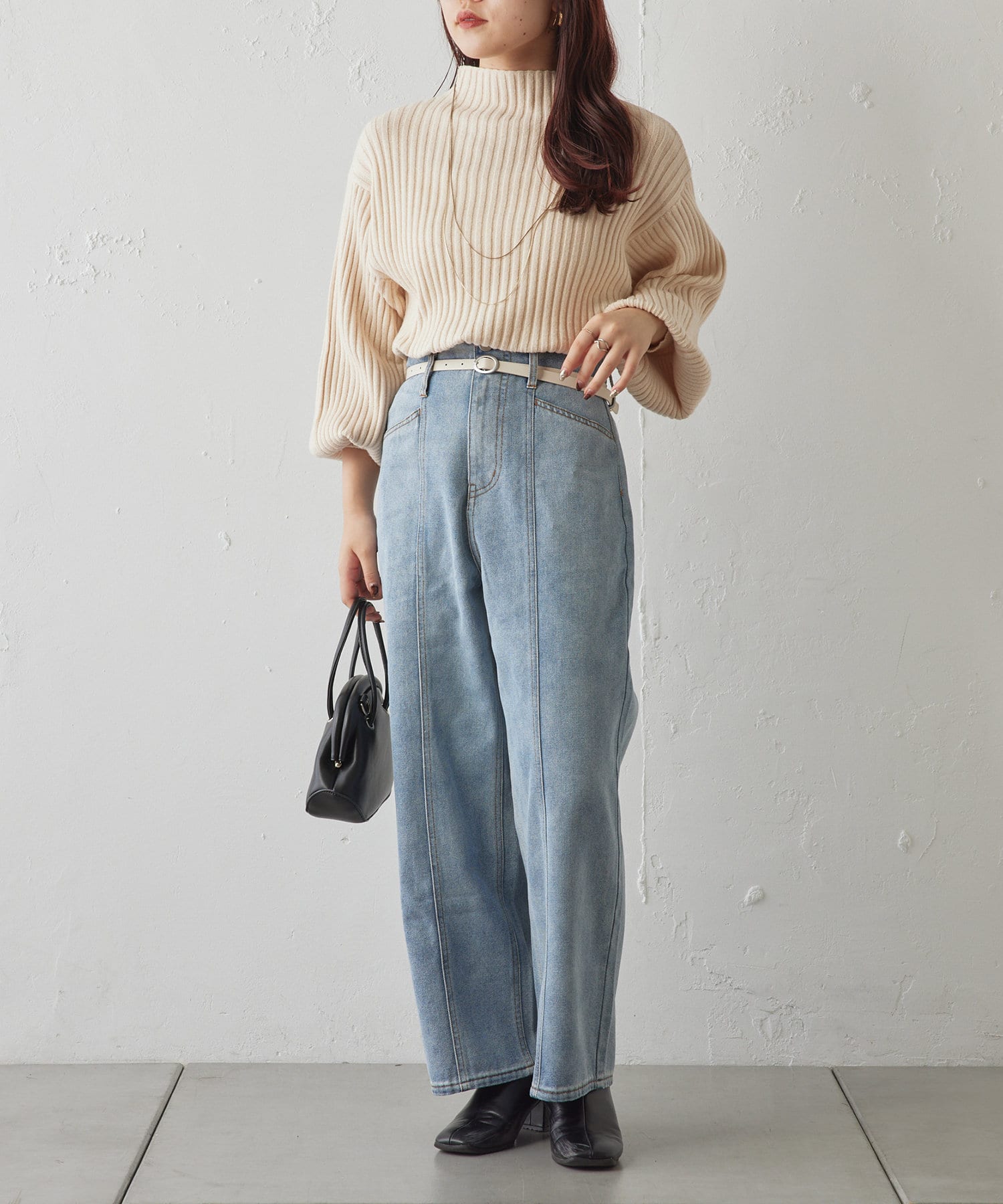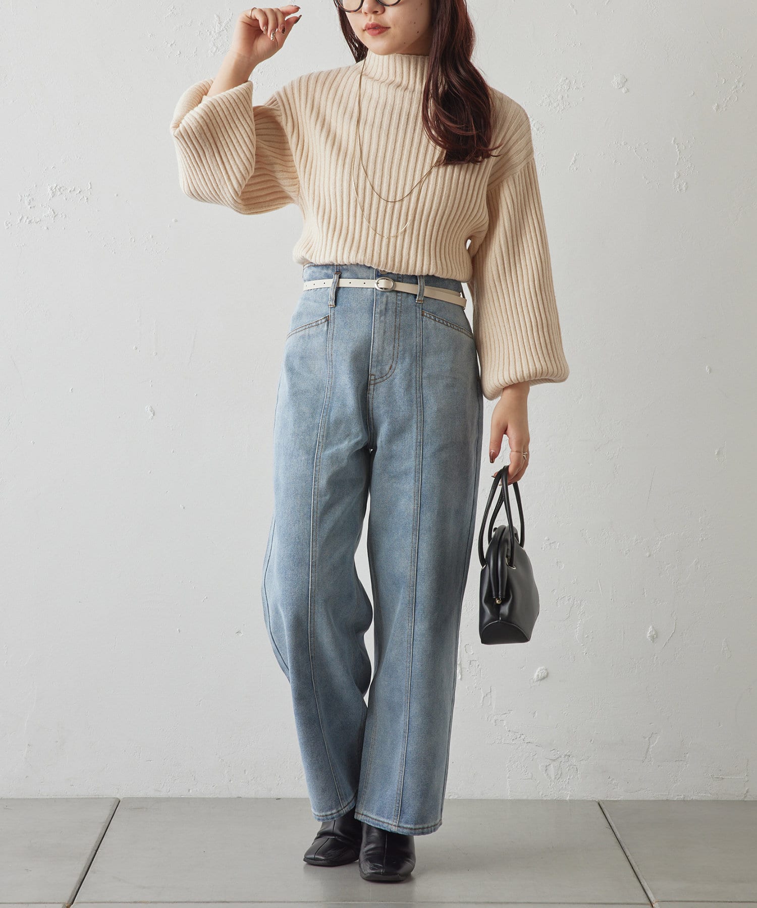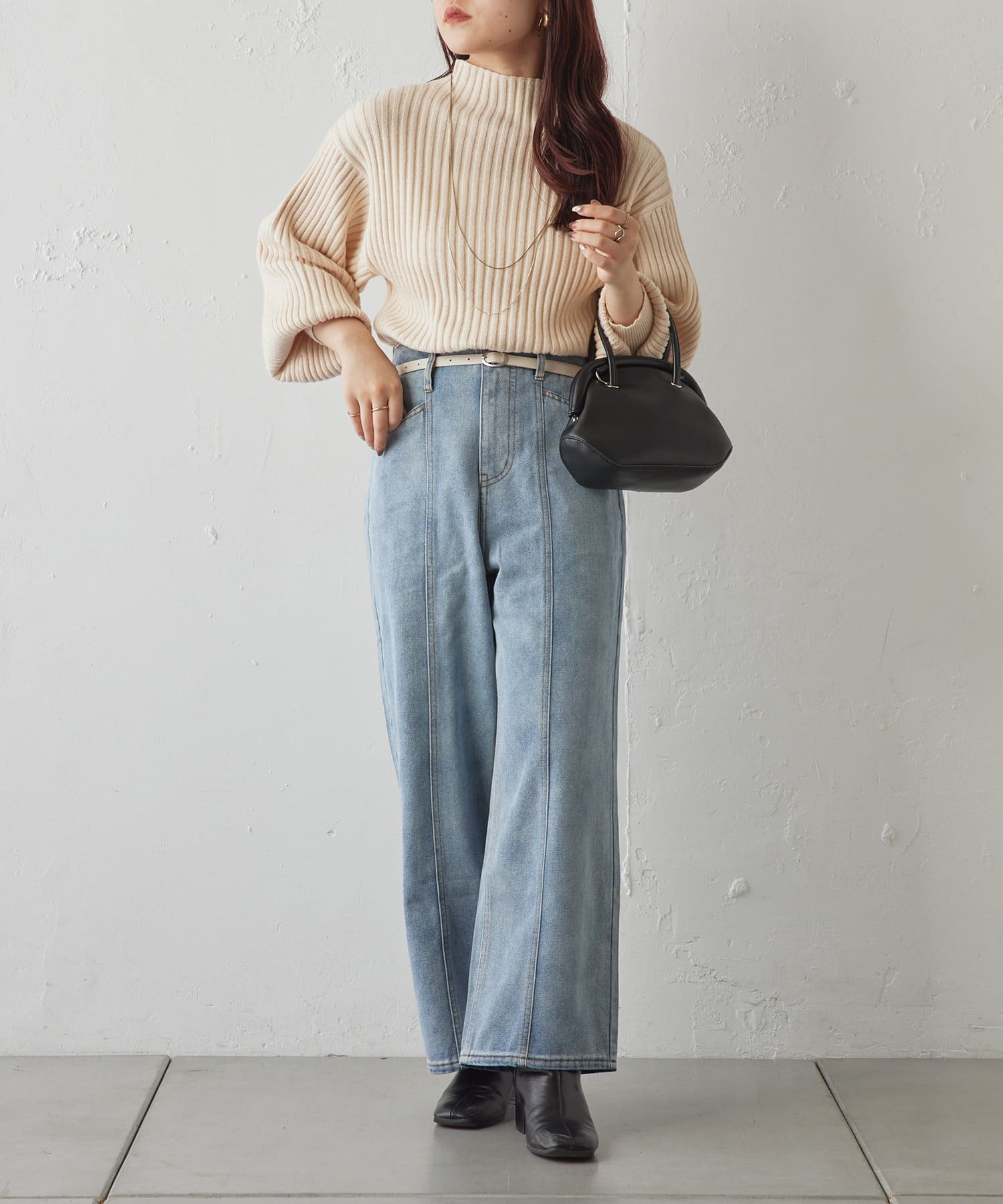 ・ボリュームスリーブとハイネックが程よいルーズさを演出。着るだけで旬顔に。