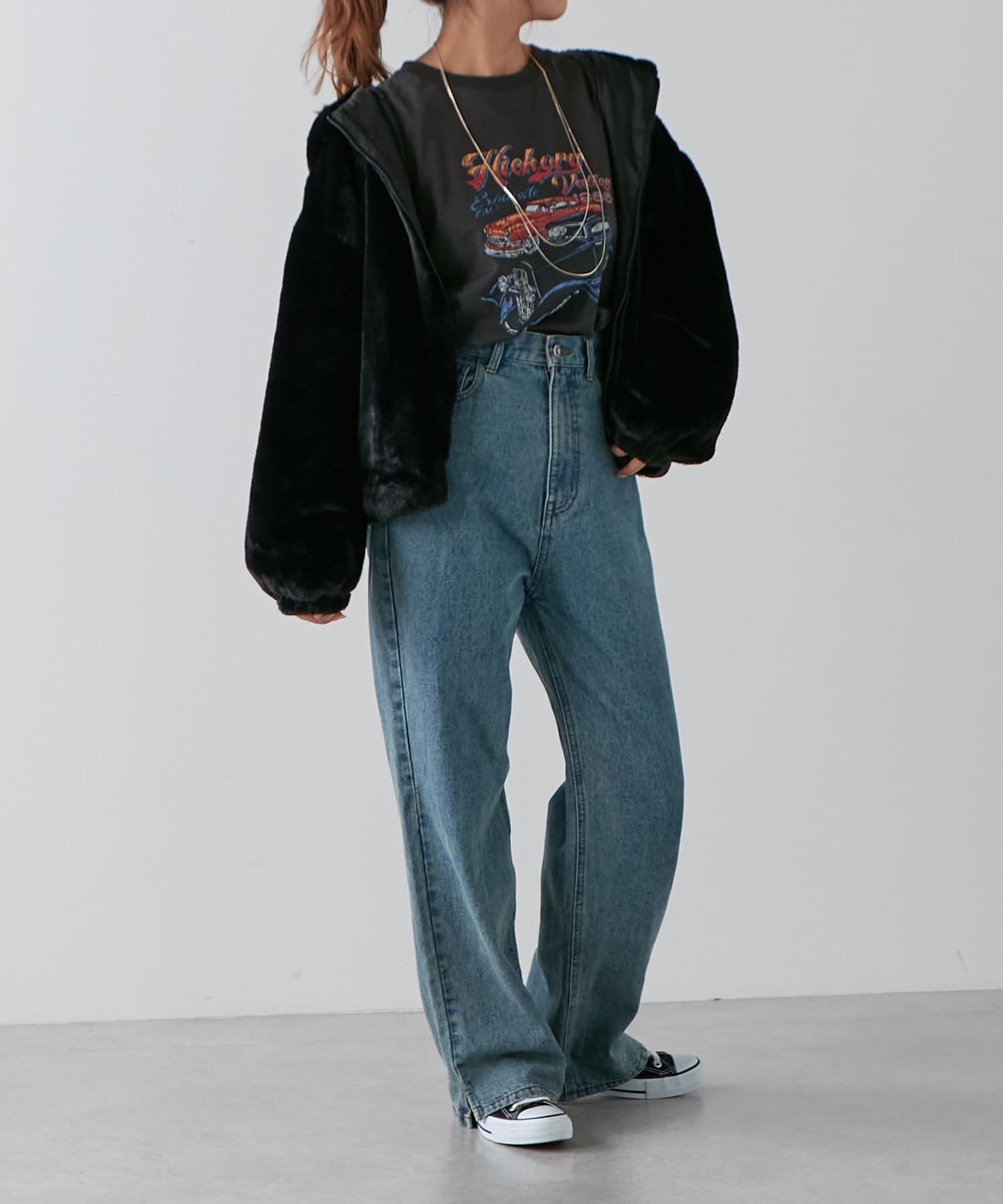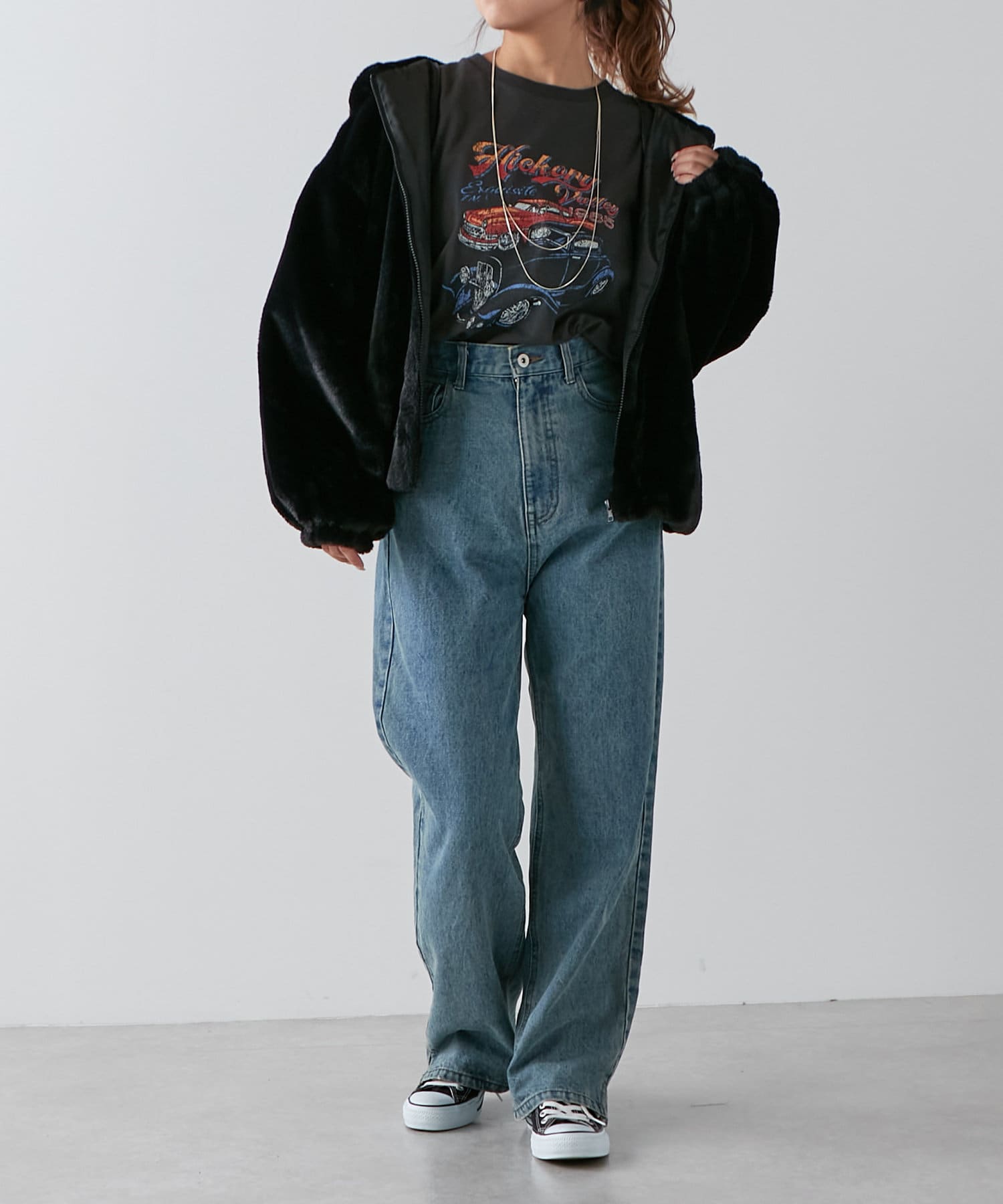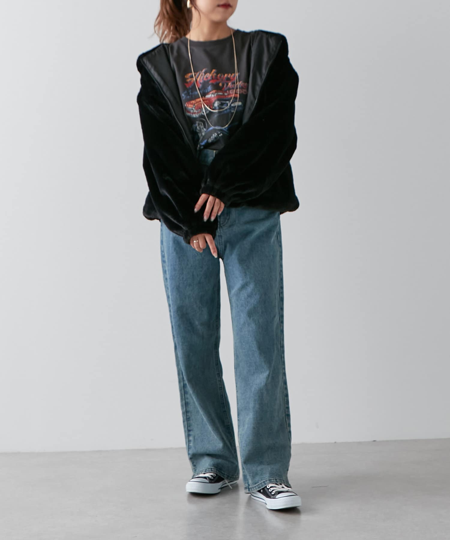 ・ゆったりとしたボリュームのあるアウターなのでボトムスはすっきりしたシルエットが鉄板ですが、だぼっとしたゆるパンツを組み合わせて、かっこいいメンズライクなコーデを楽しむのも◎