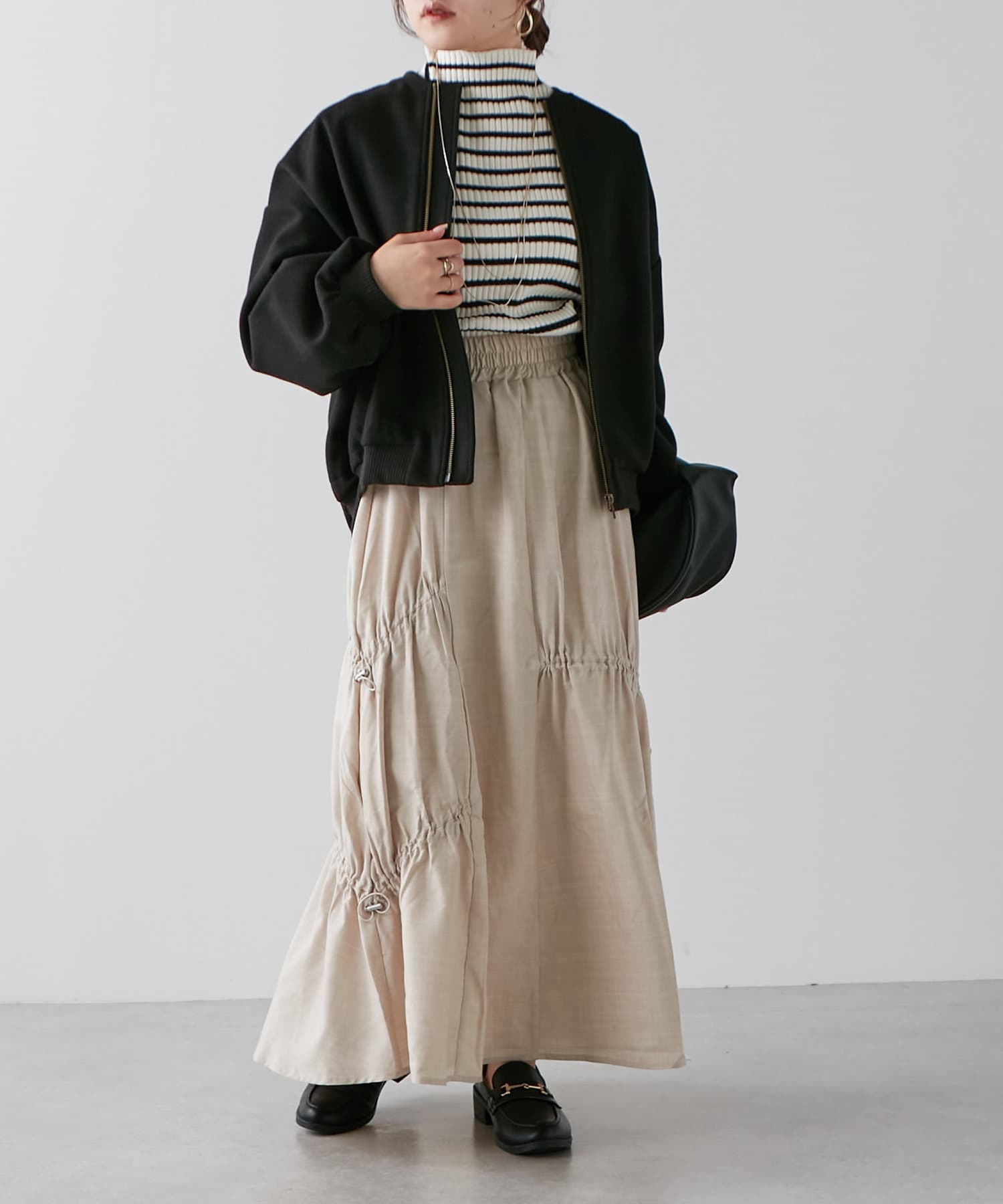 ・オーバー過ぎないシルエットなのでボリューム感あるスカートとのコーデもすっきり見えします。