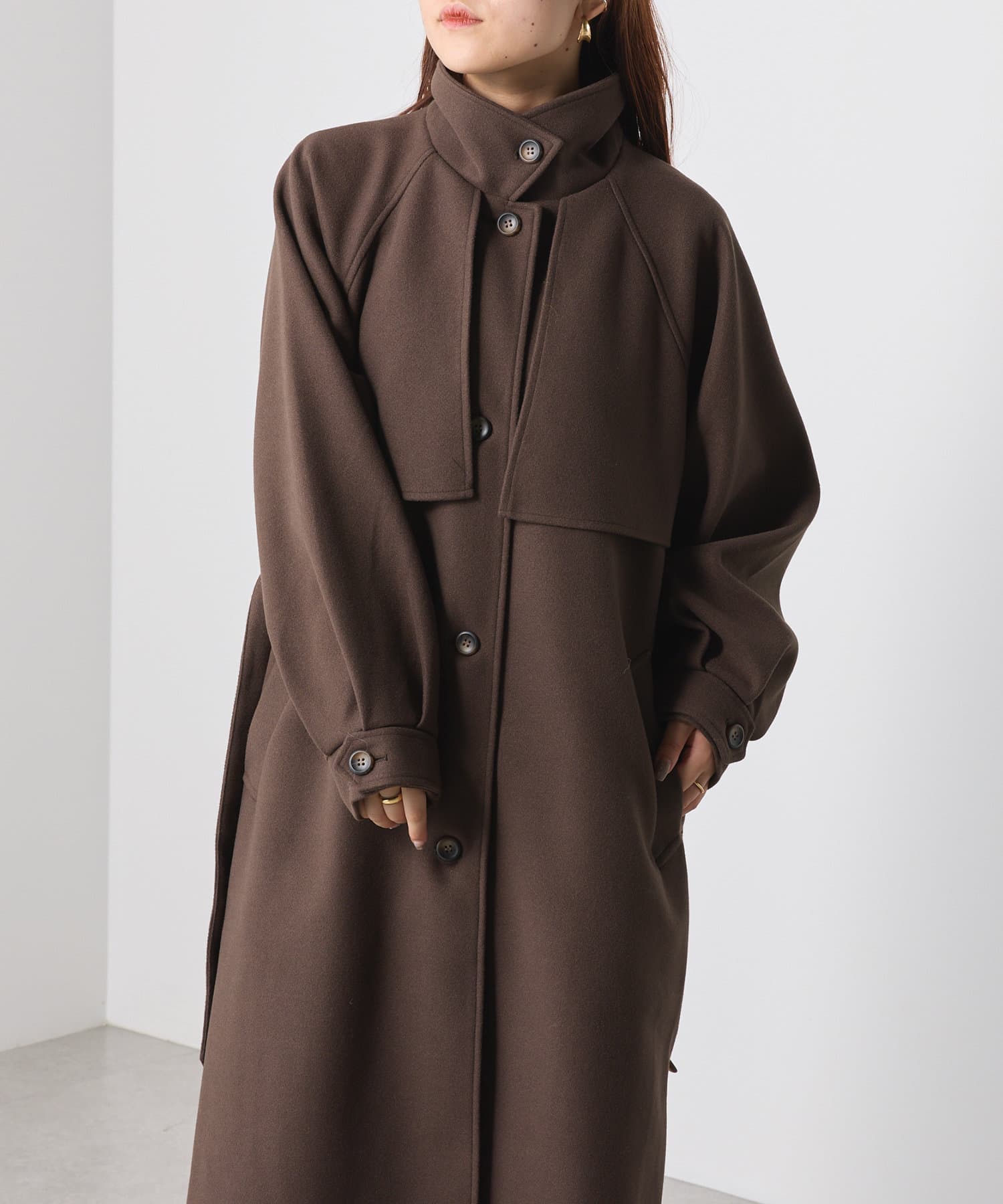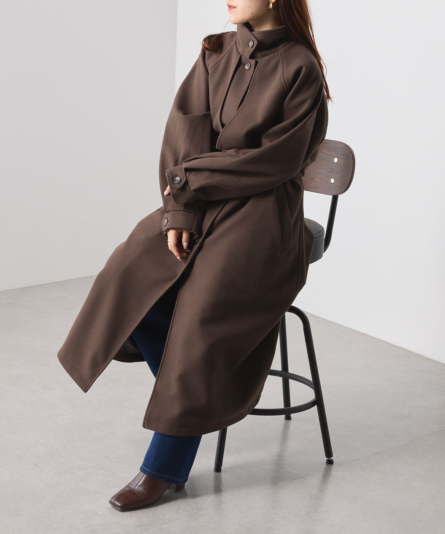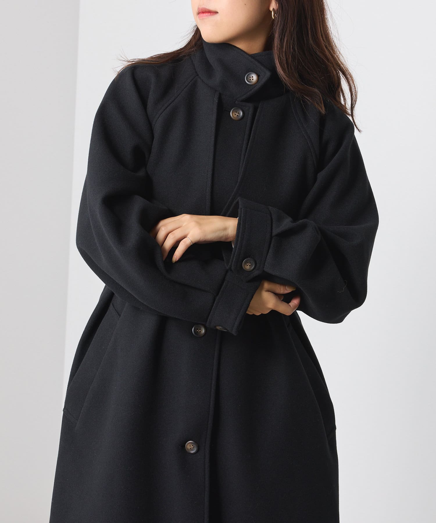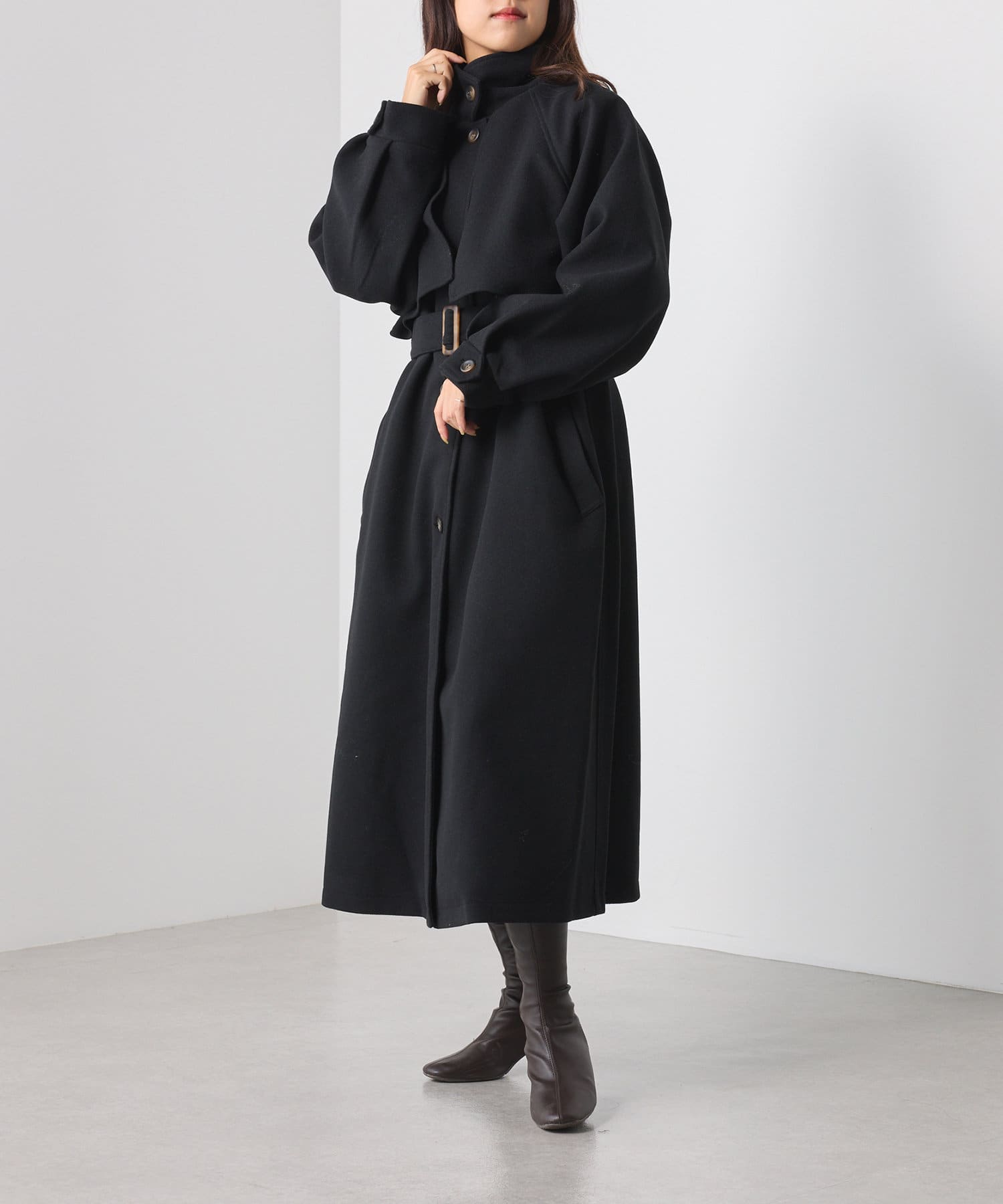 ・シックでモードな雰囲気のスタンドカラーコート。