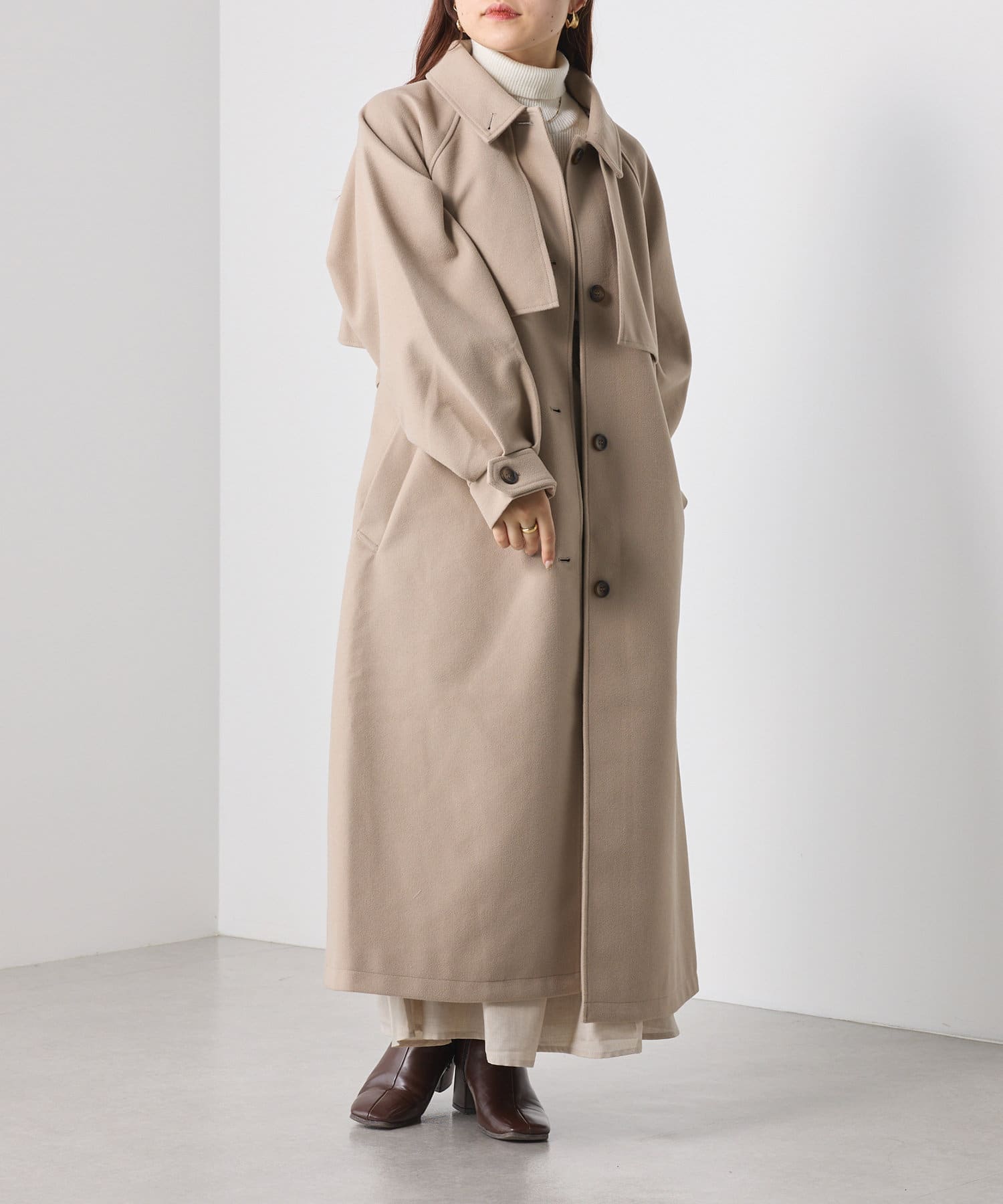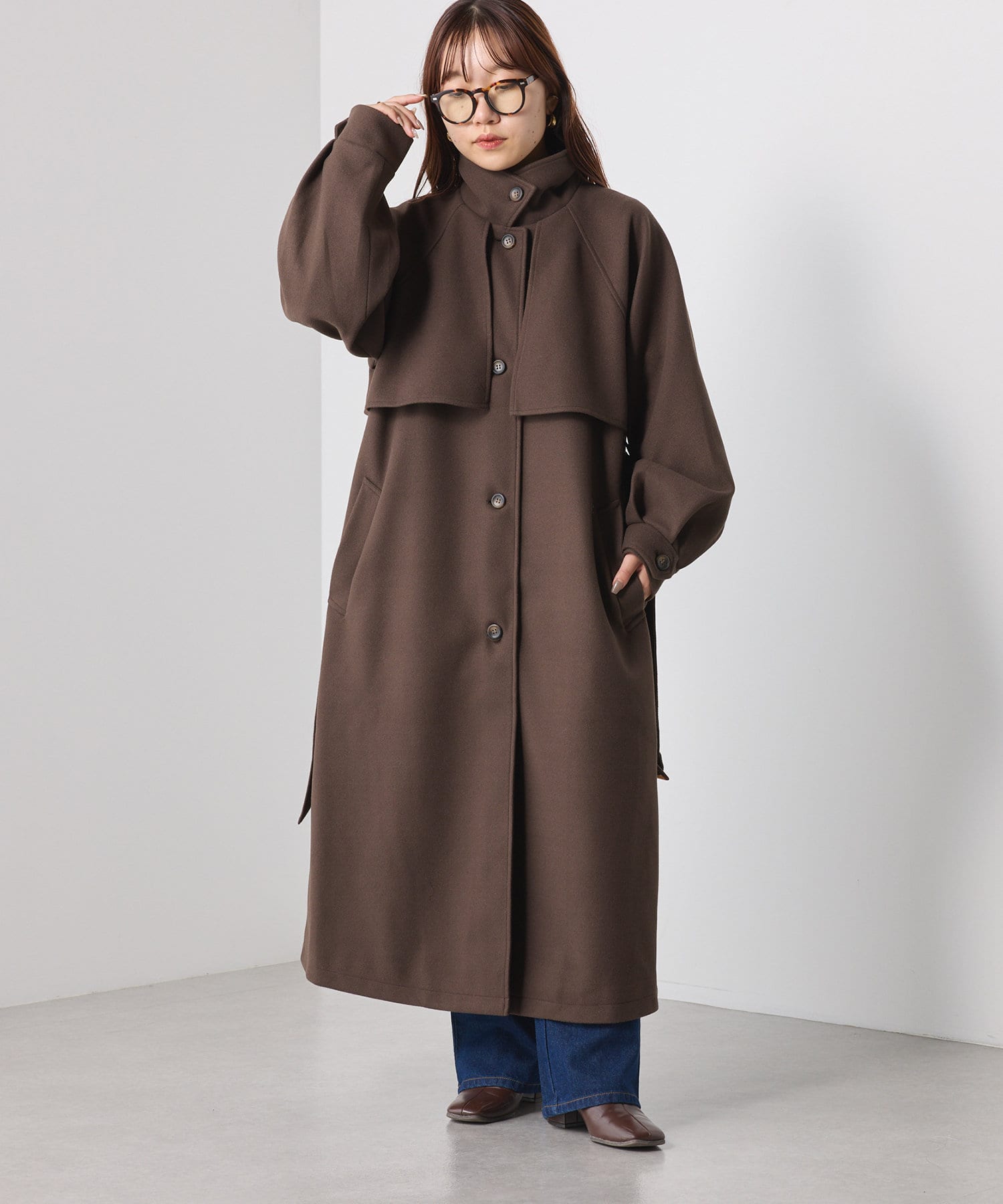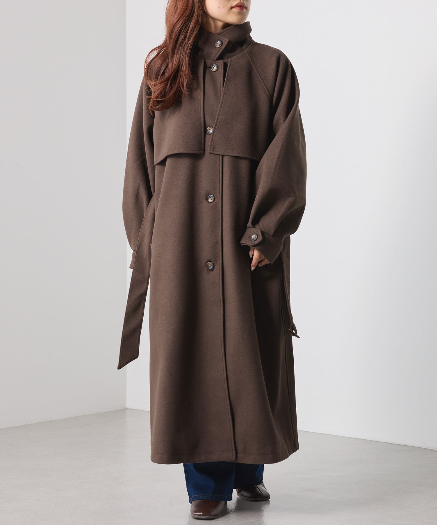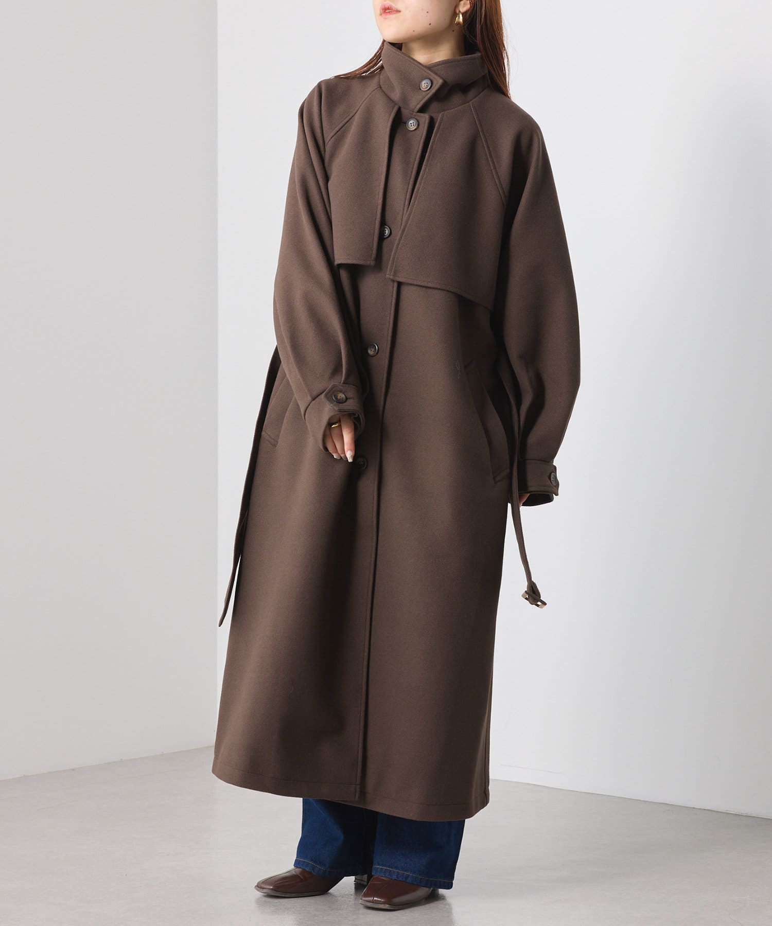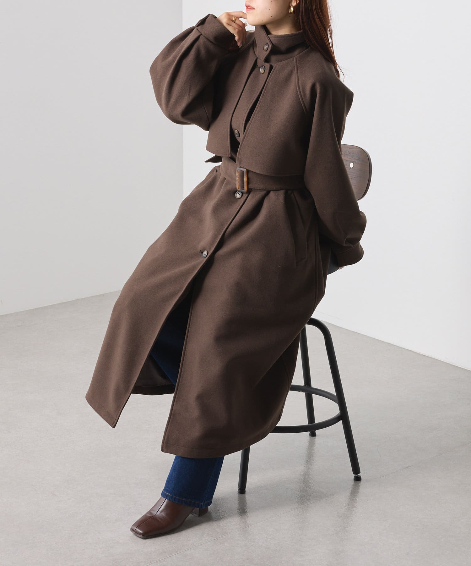 ・シックでモードな雰囲気のスタンドカラーコート。