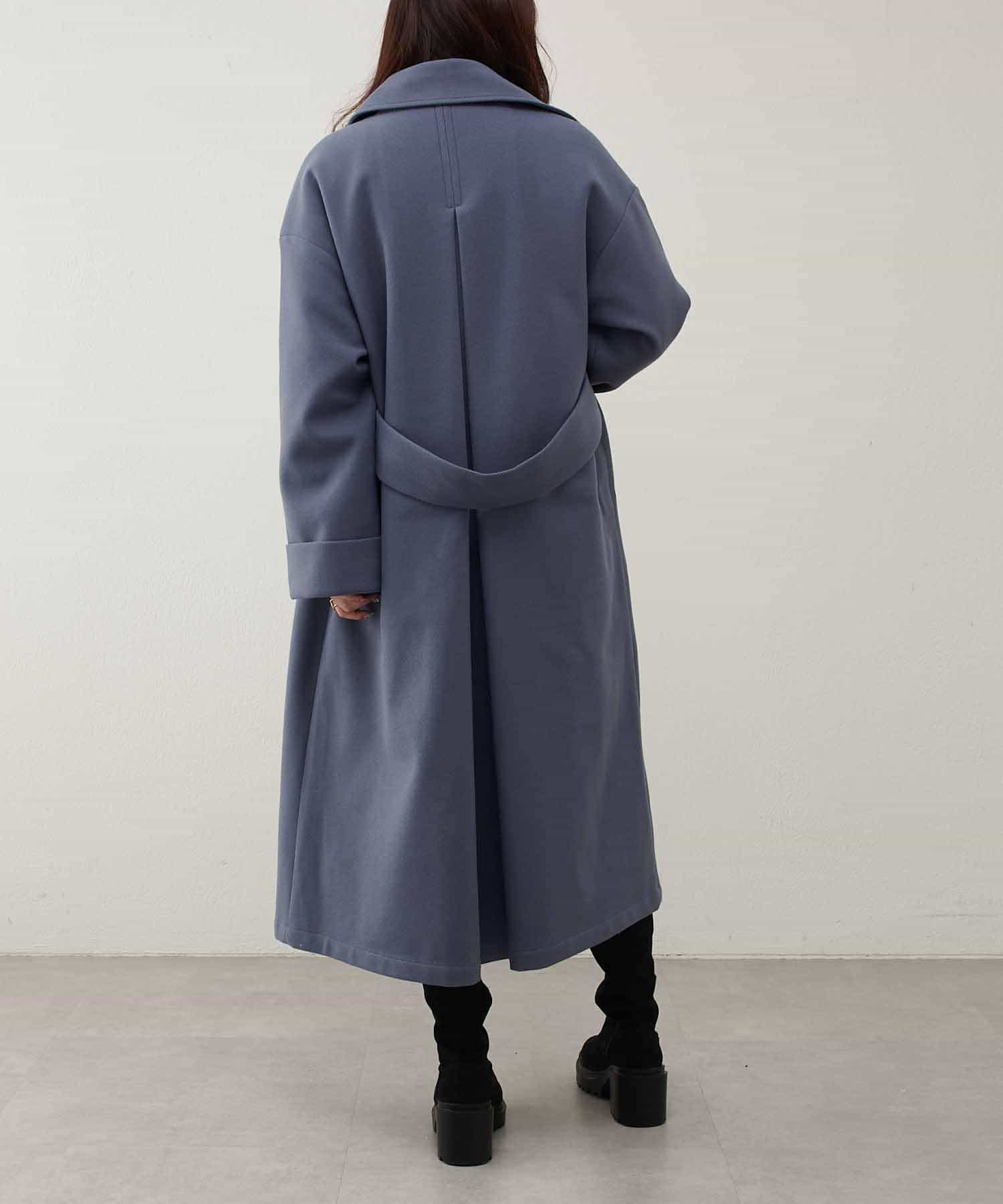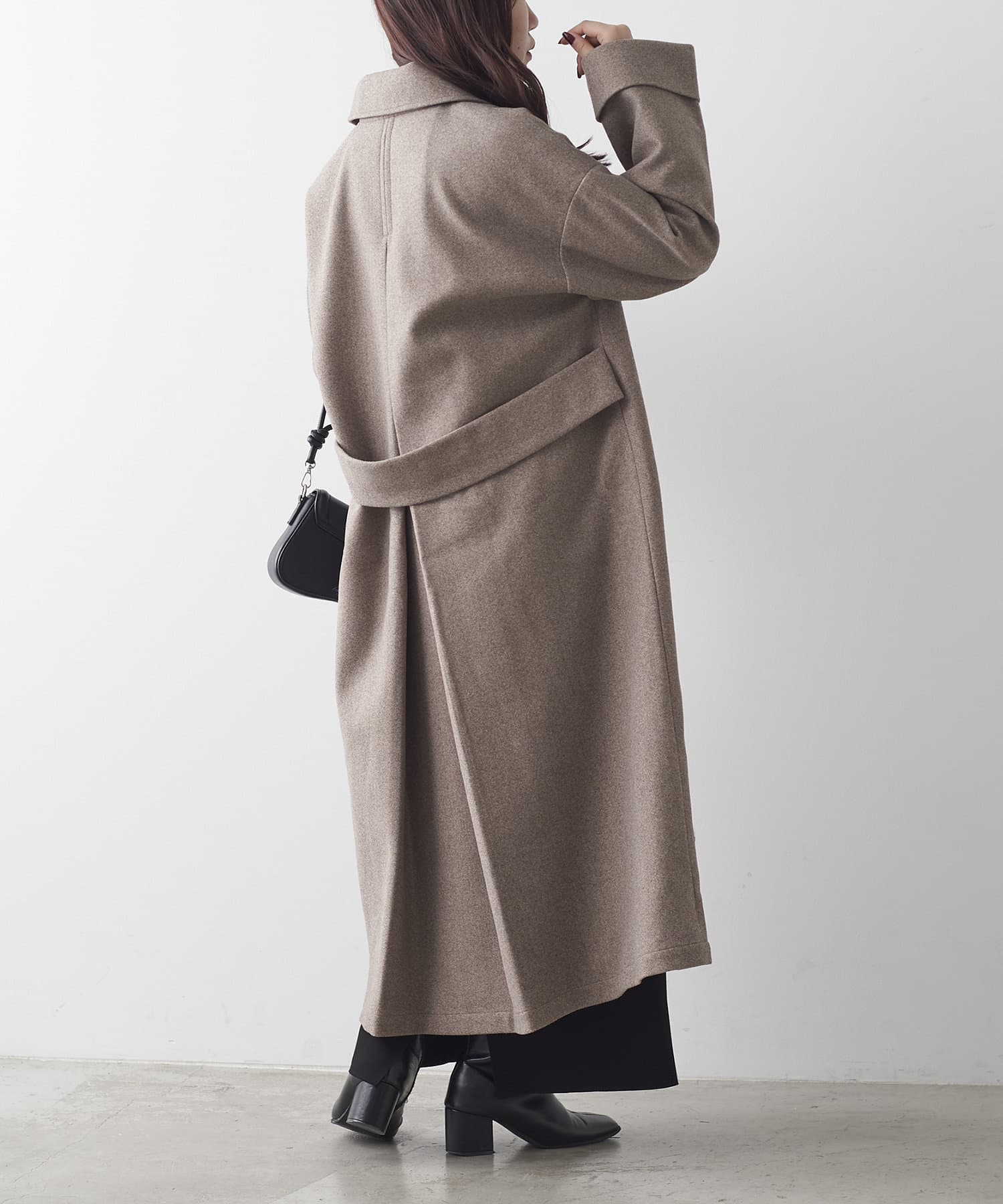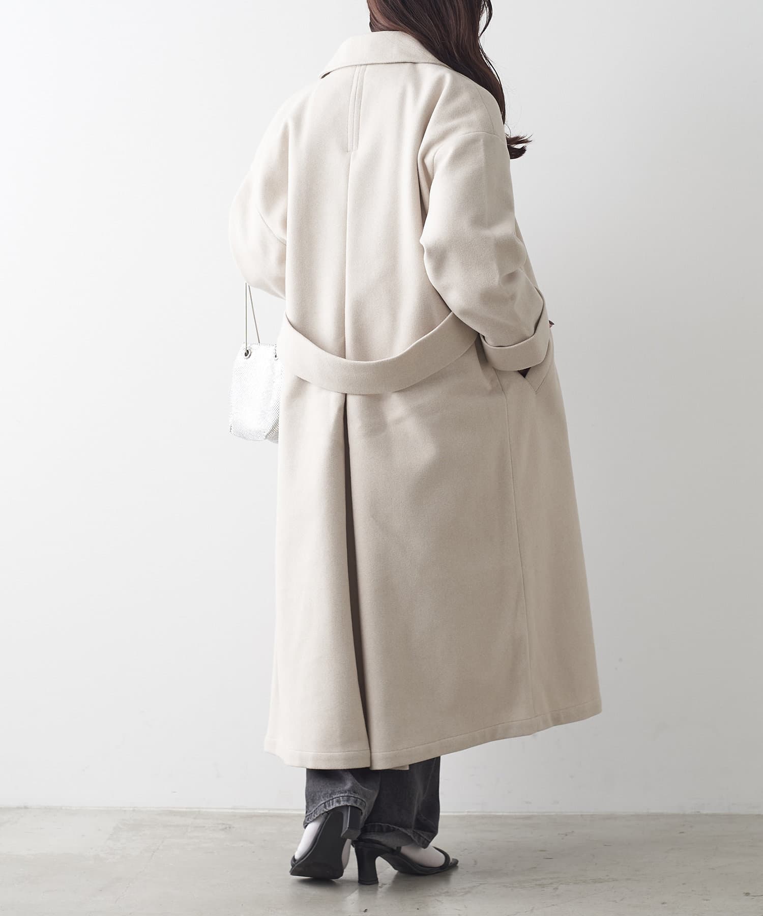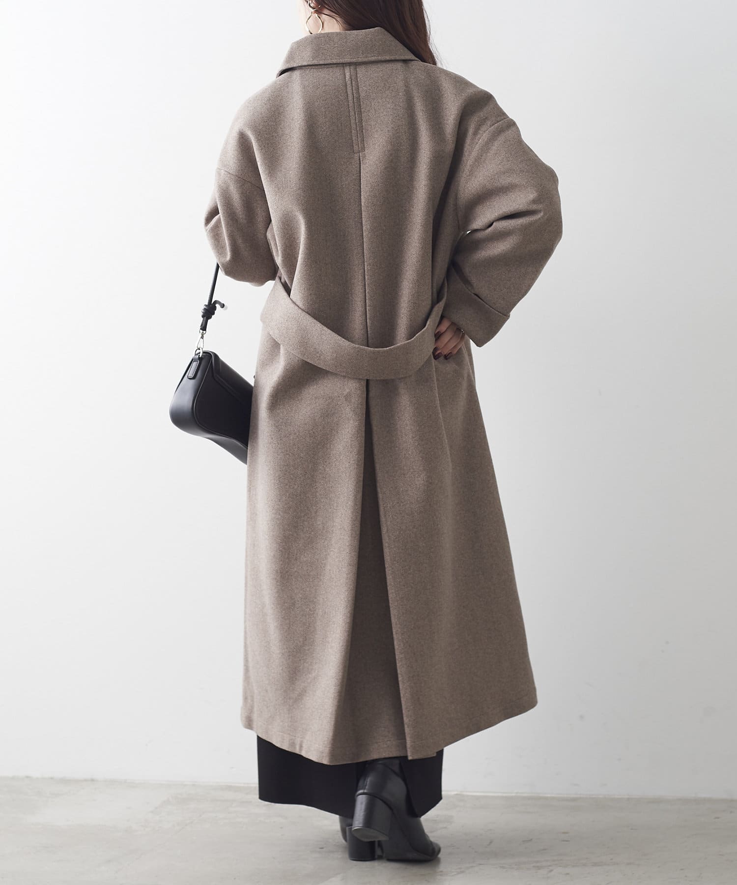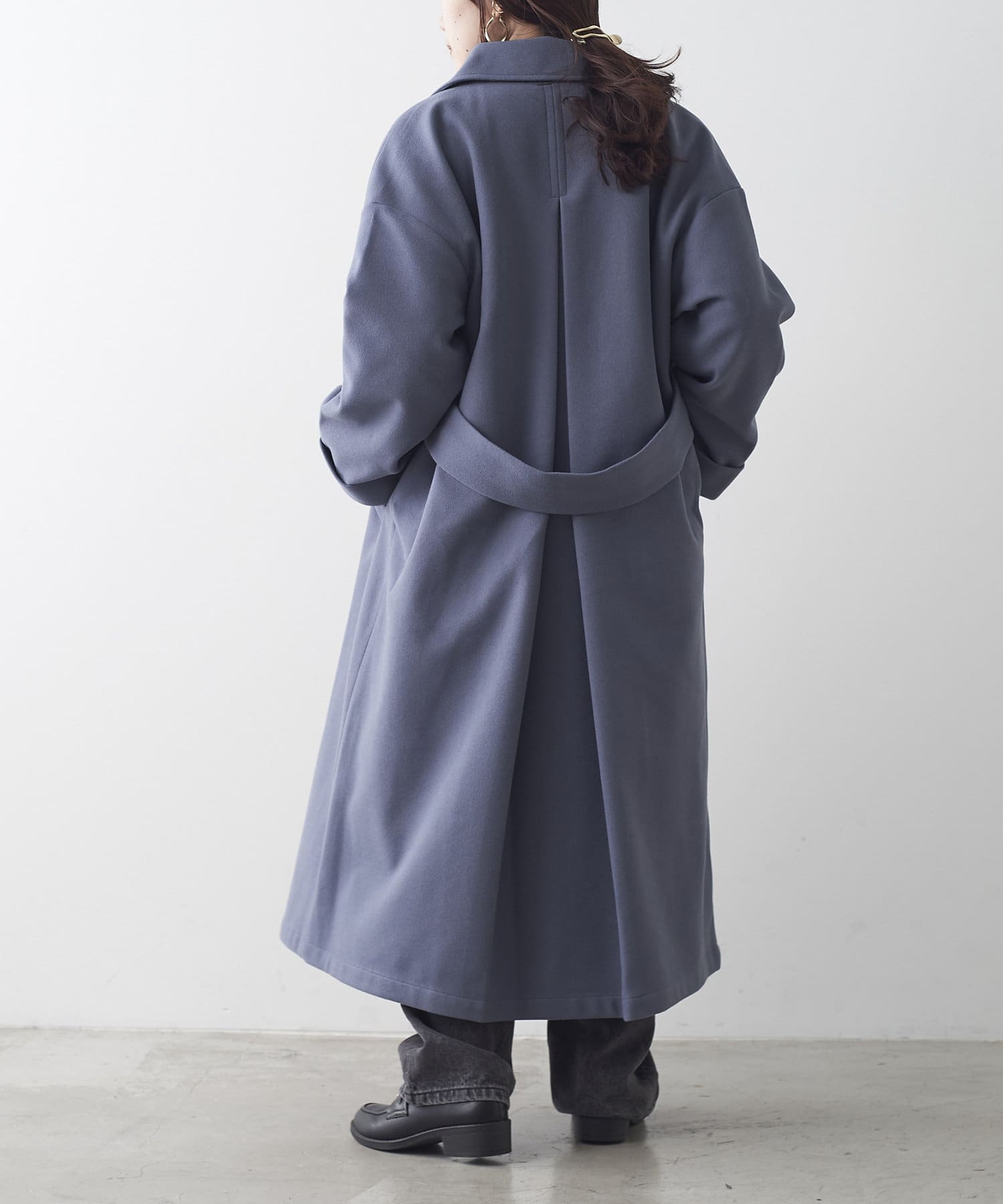 ・バックベルトがワンポイントな幅広いシーンに対応できるロングコート。