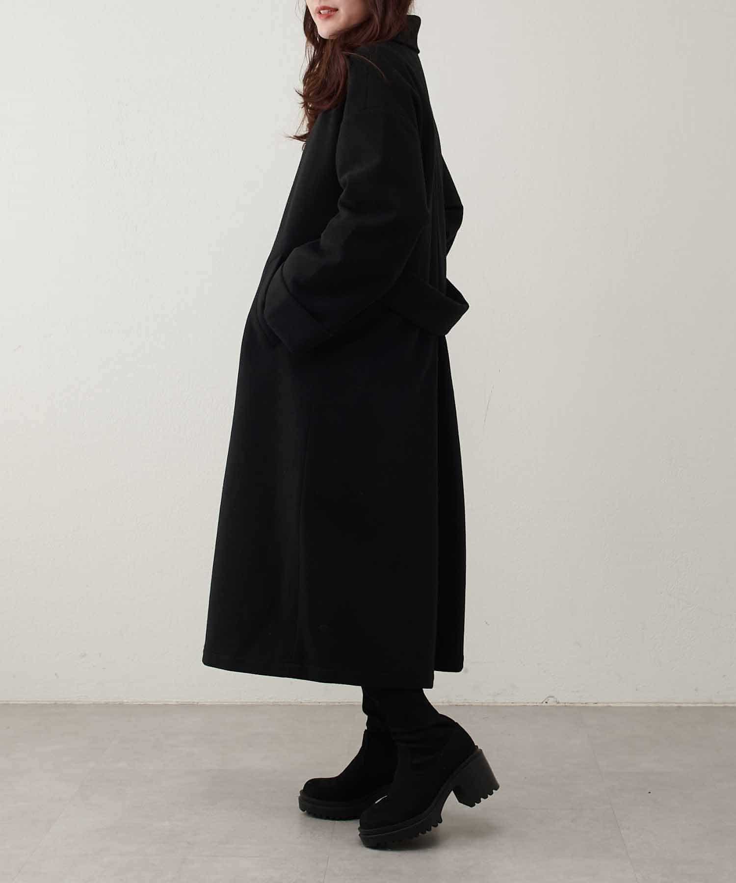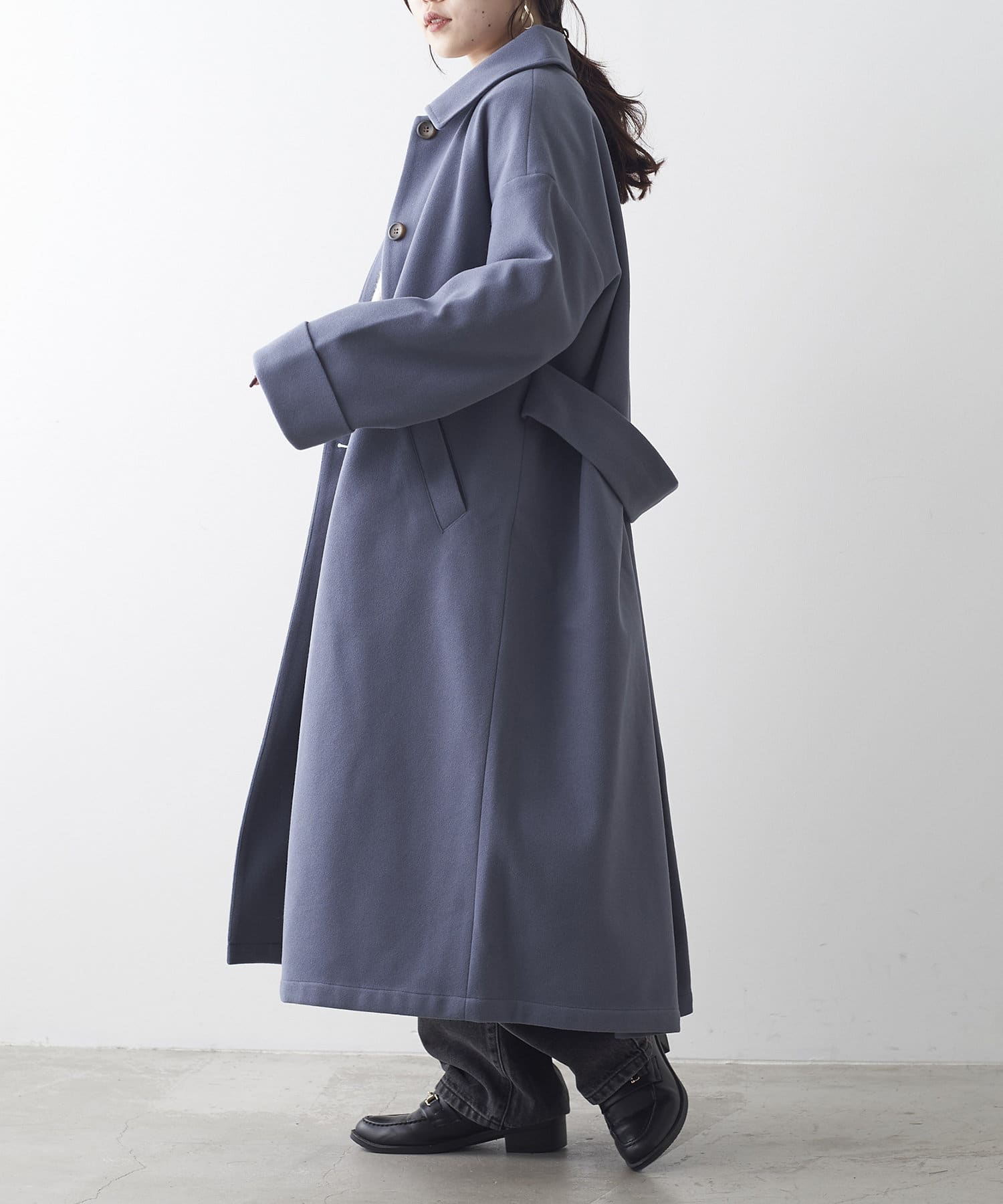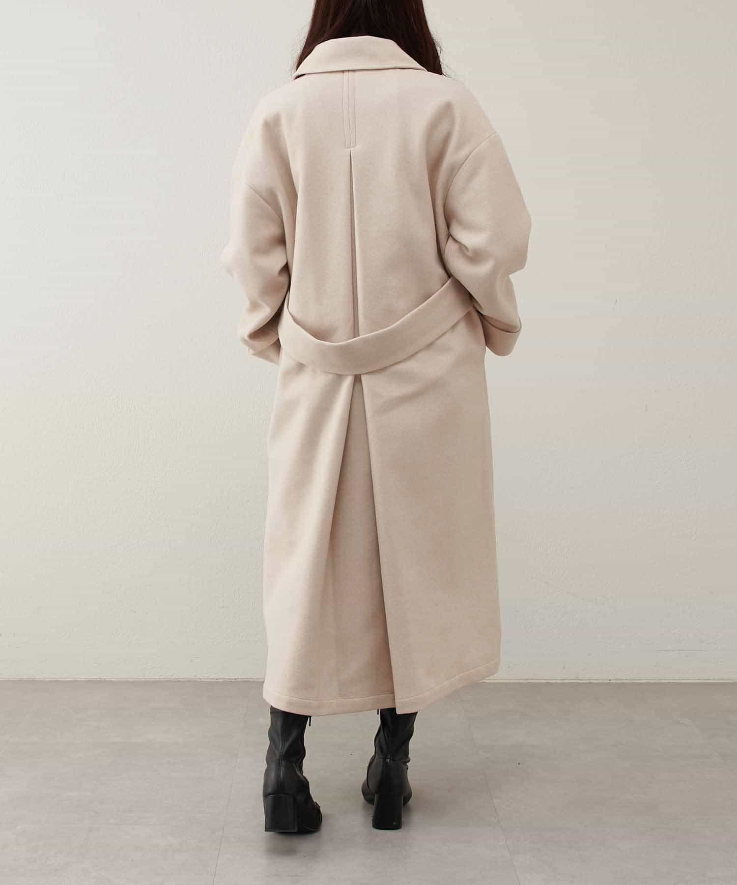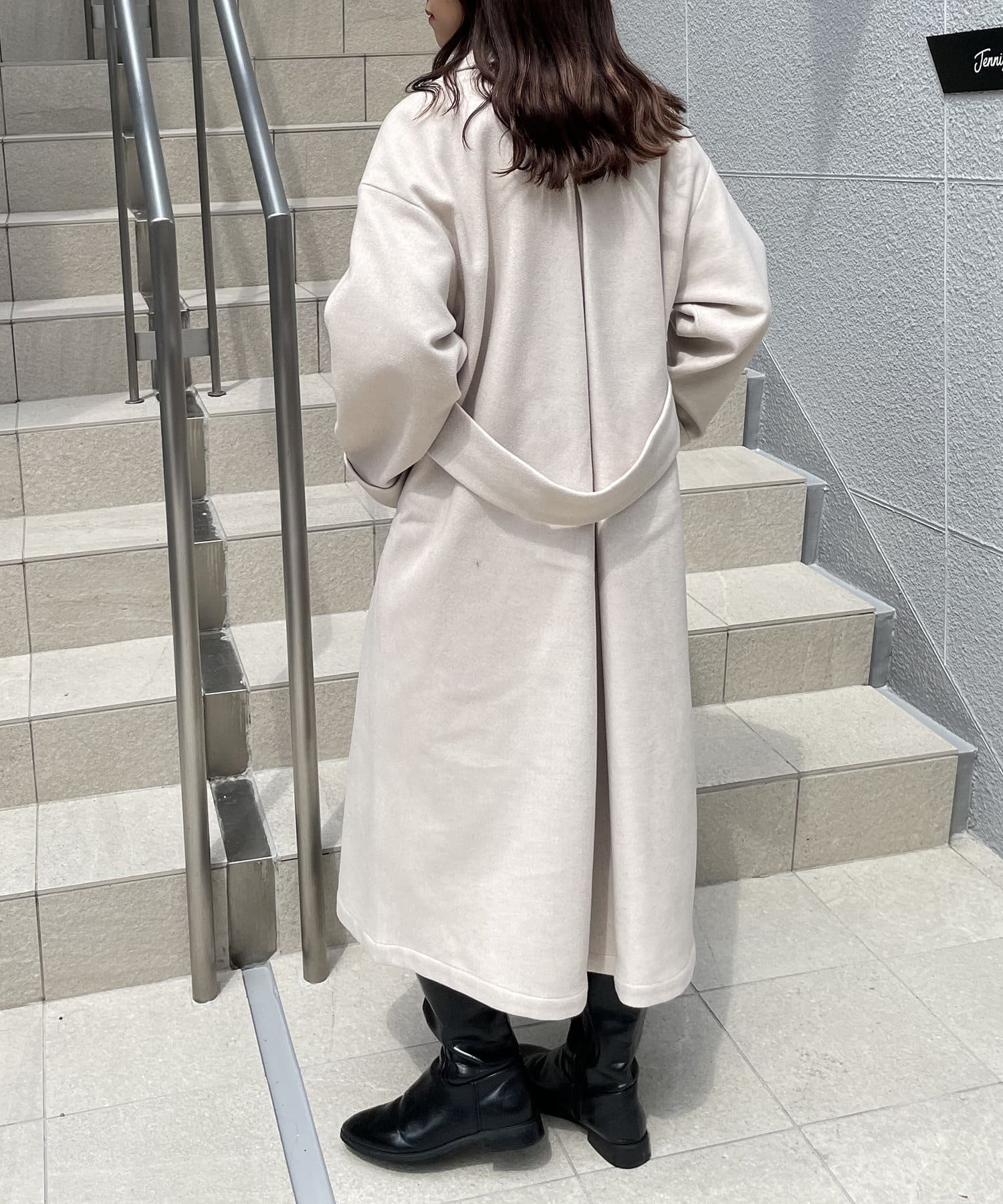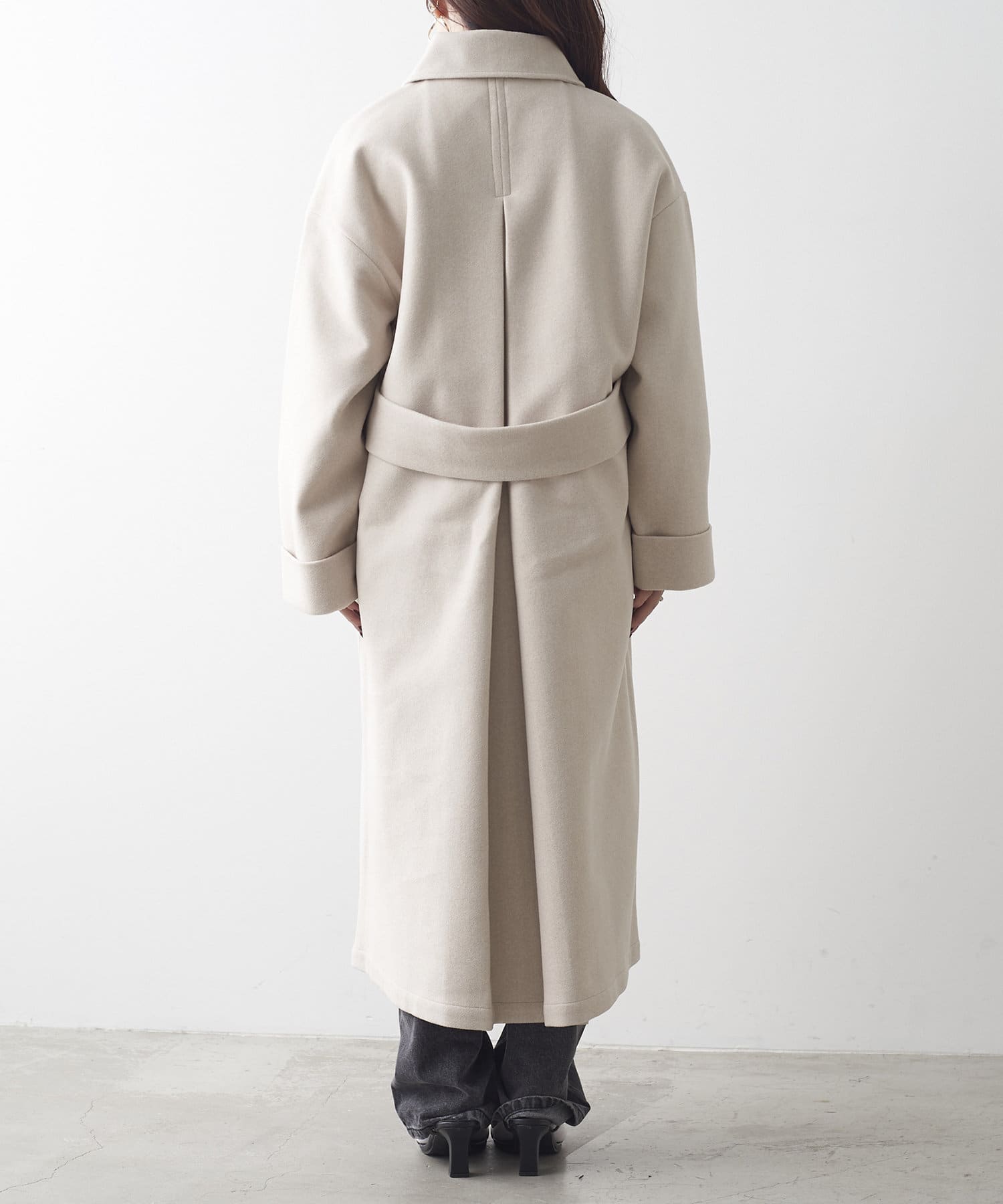 ・バックベルトがワンポイントな幅広いシーンに対応できるロングコート。