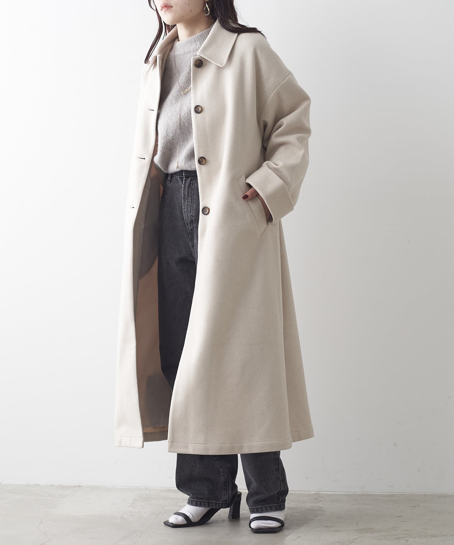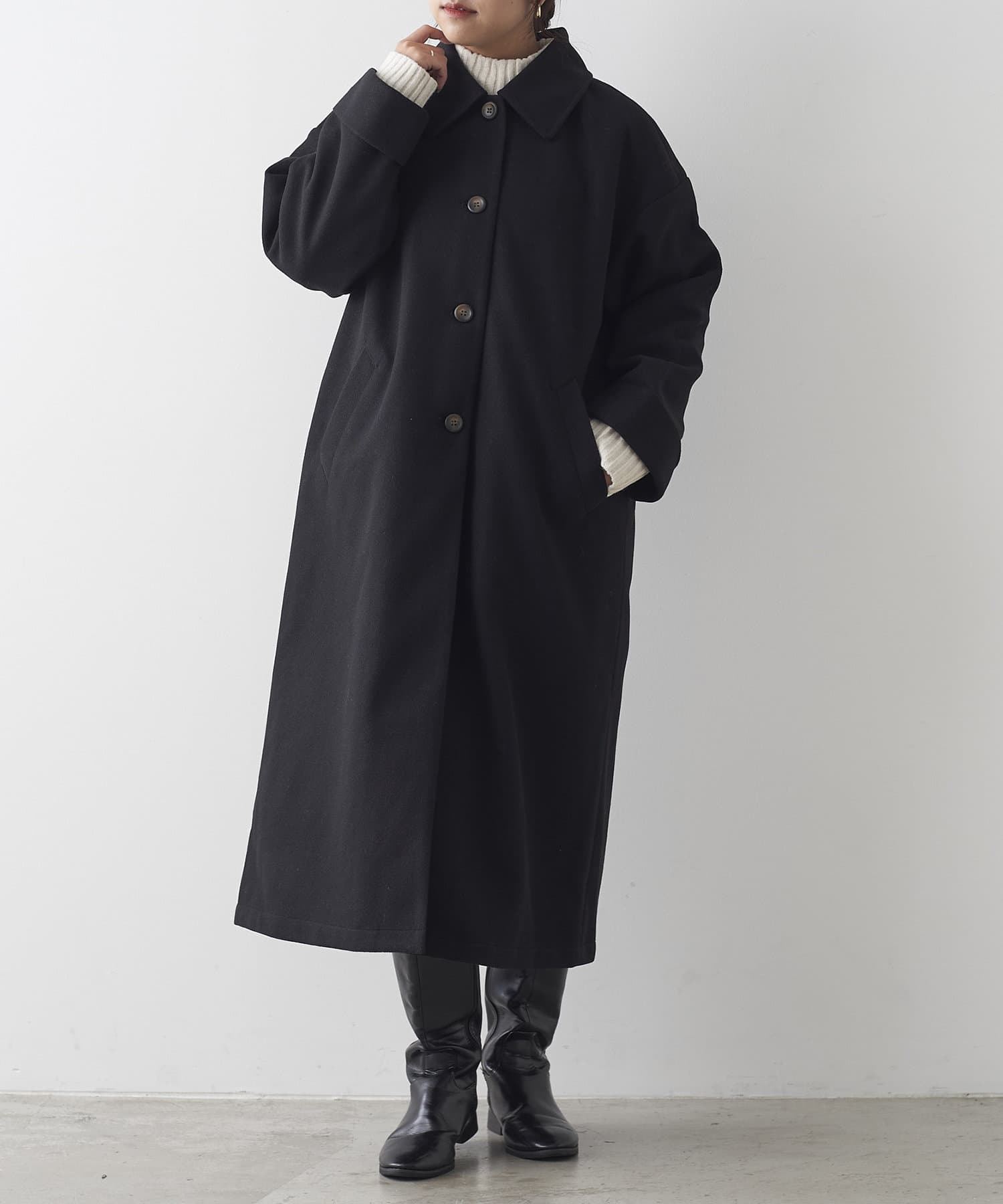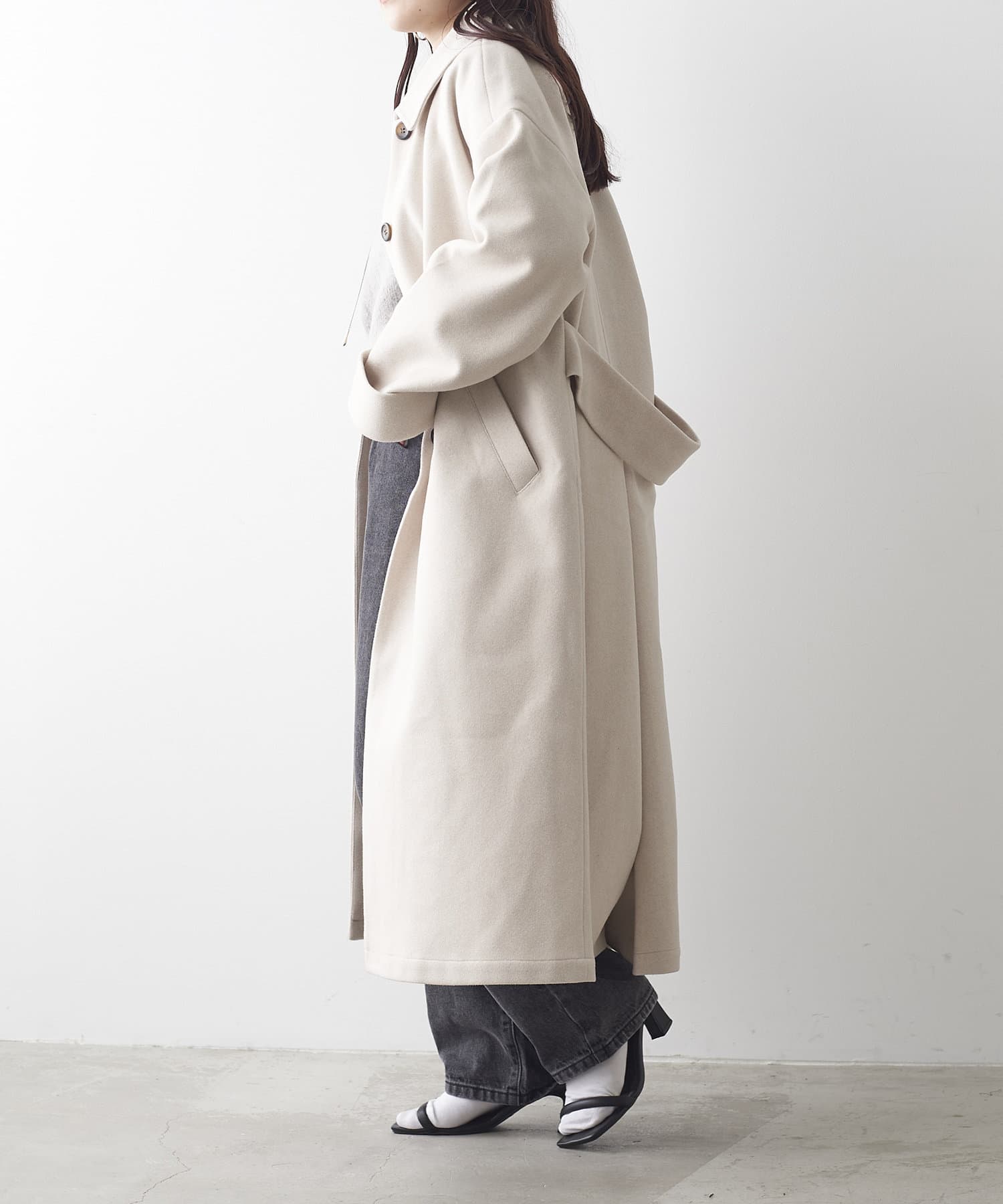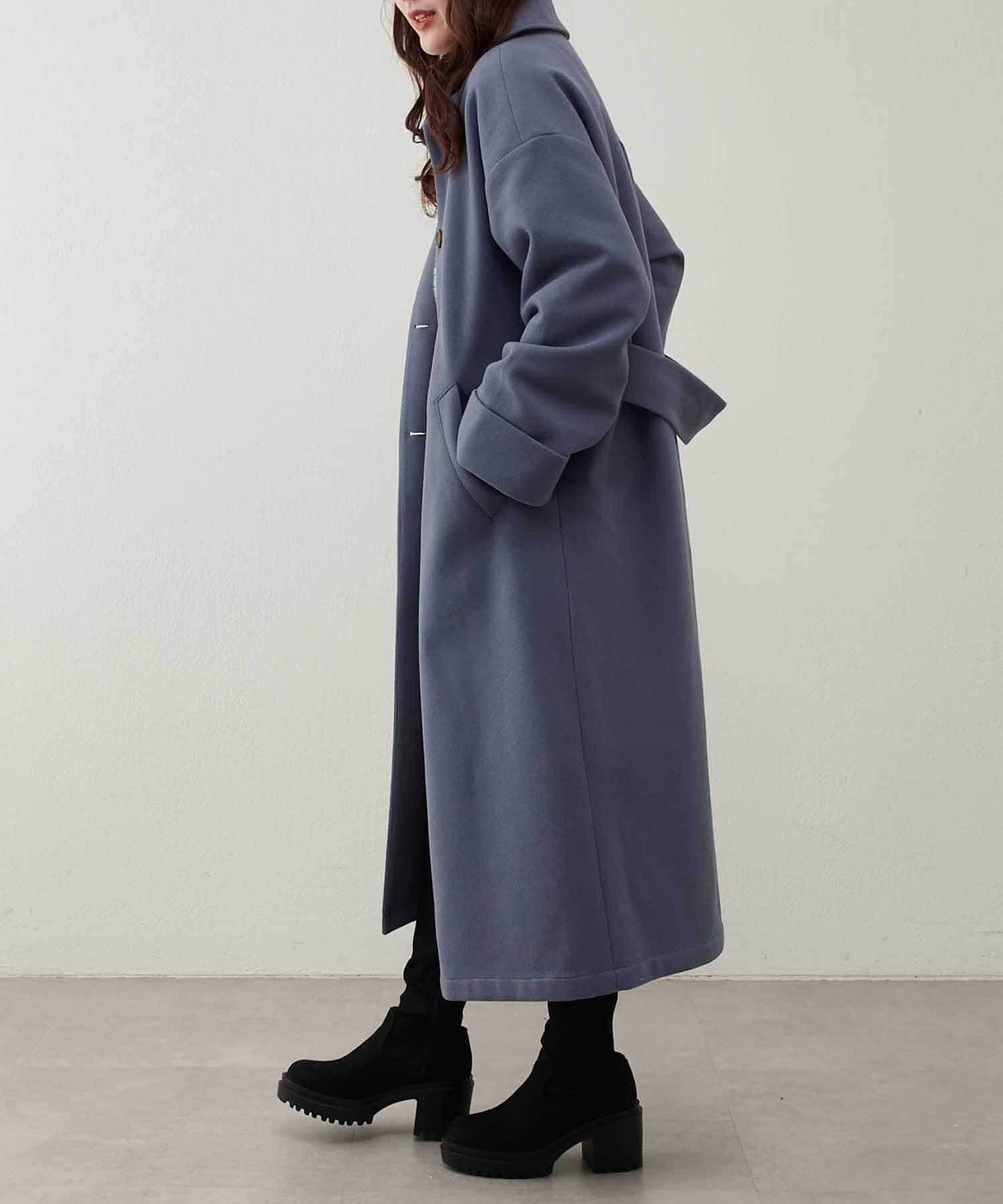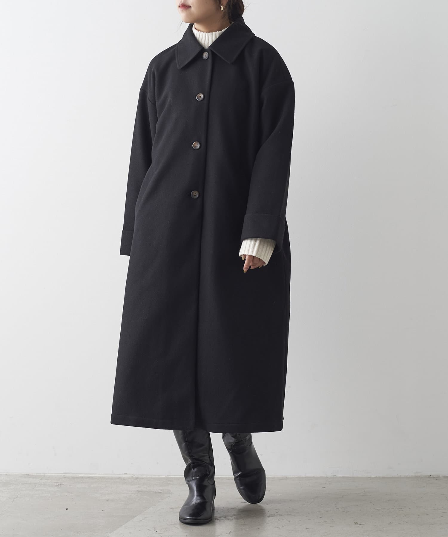 ・バックベルトがワンポイントな幅広いシーンに対応できるロングコート。