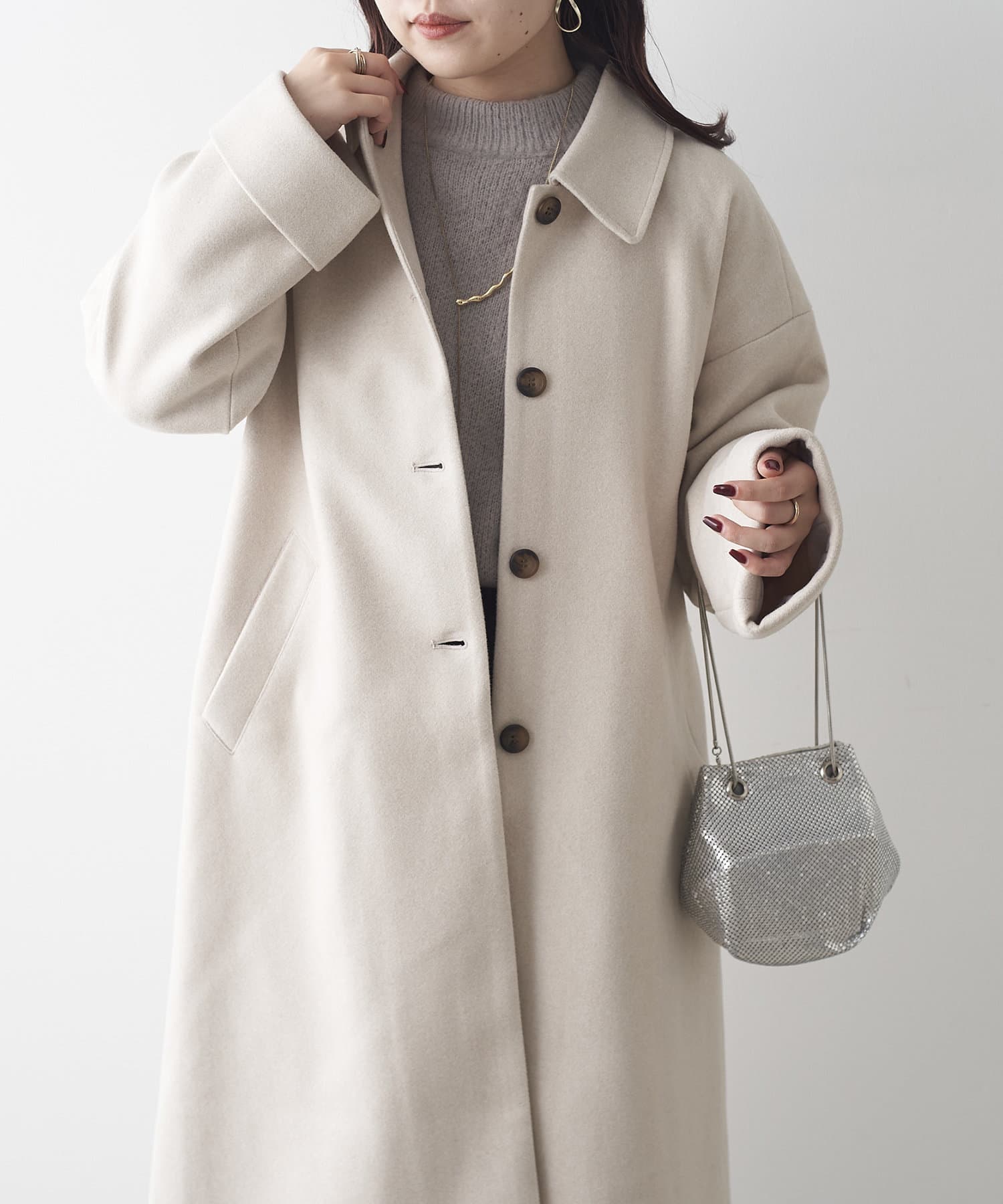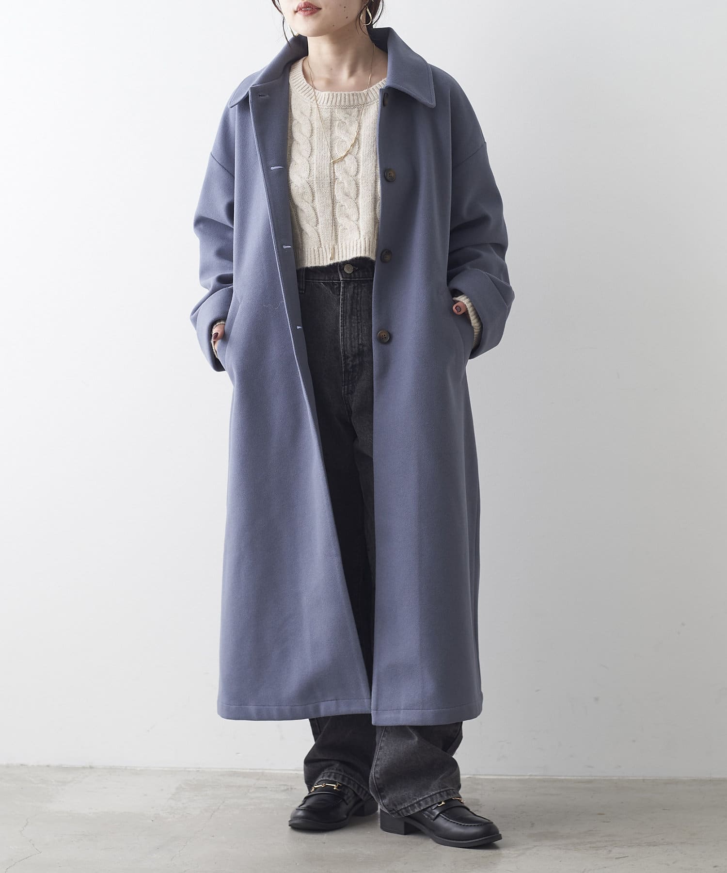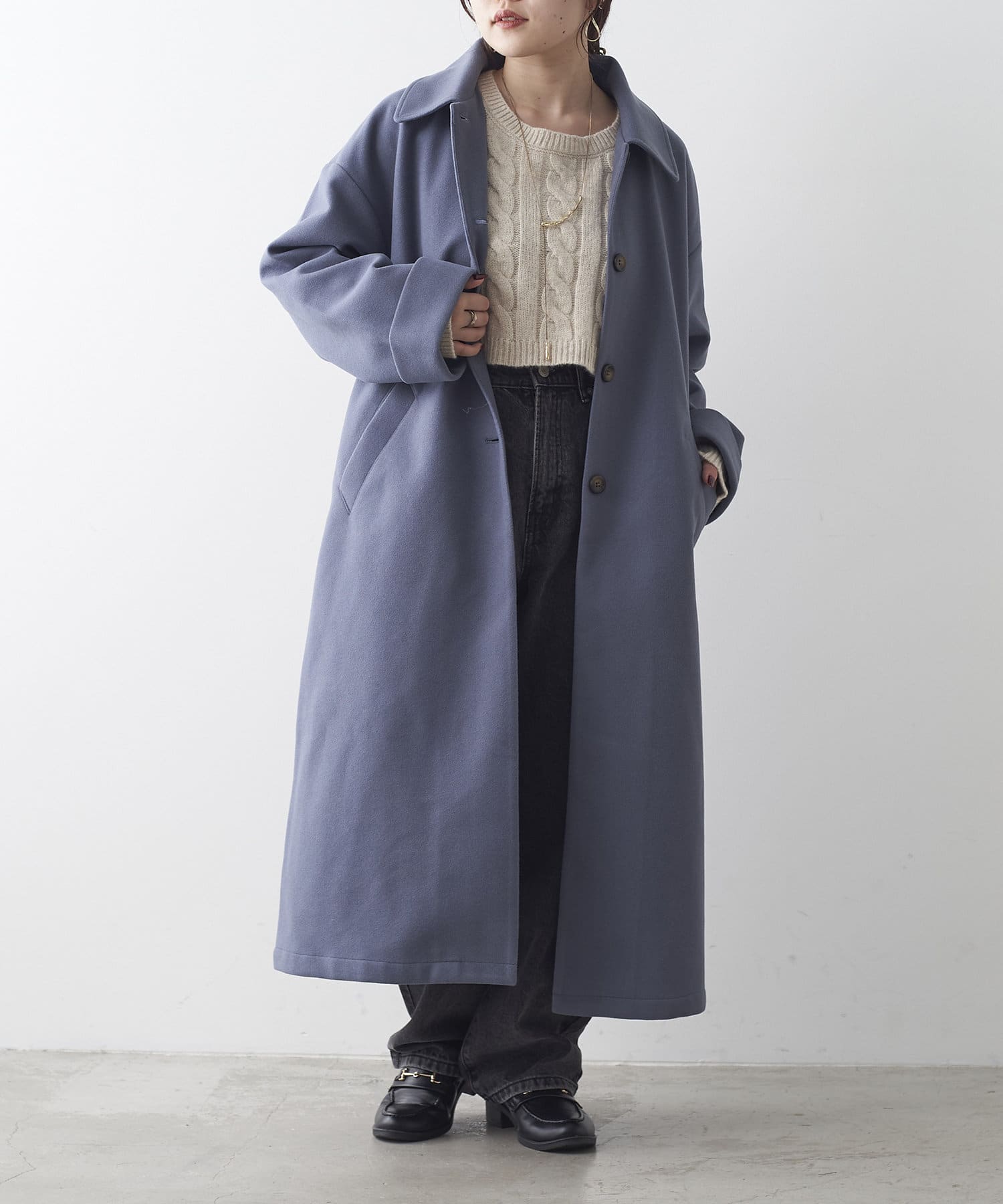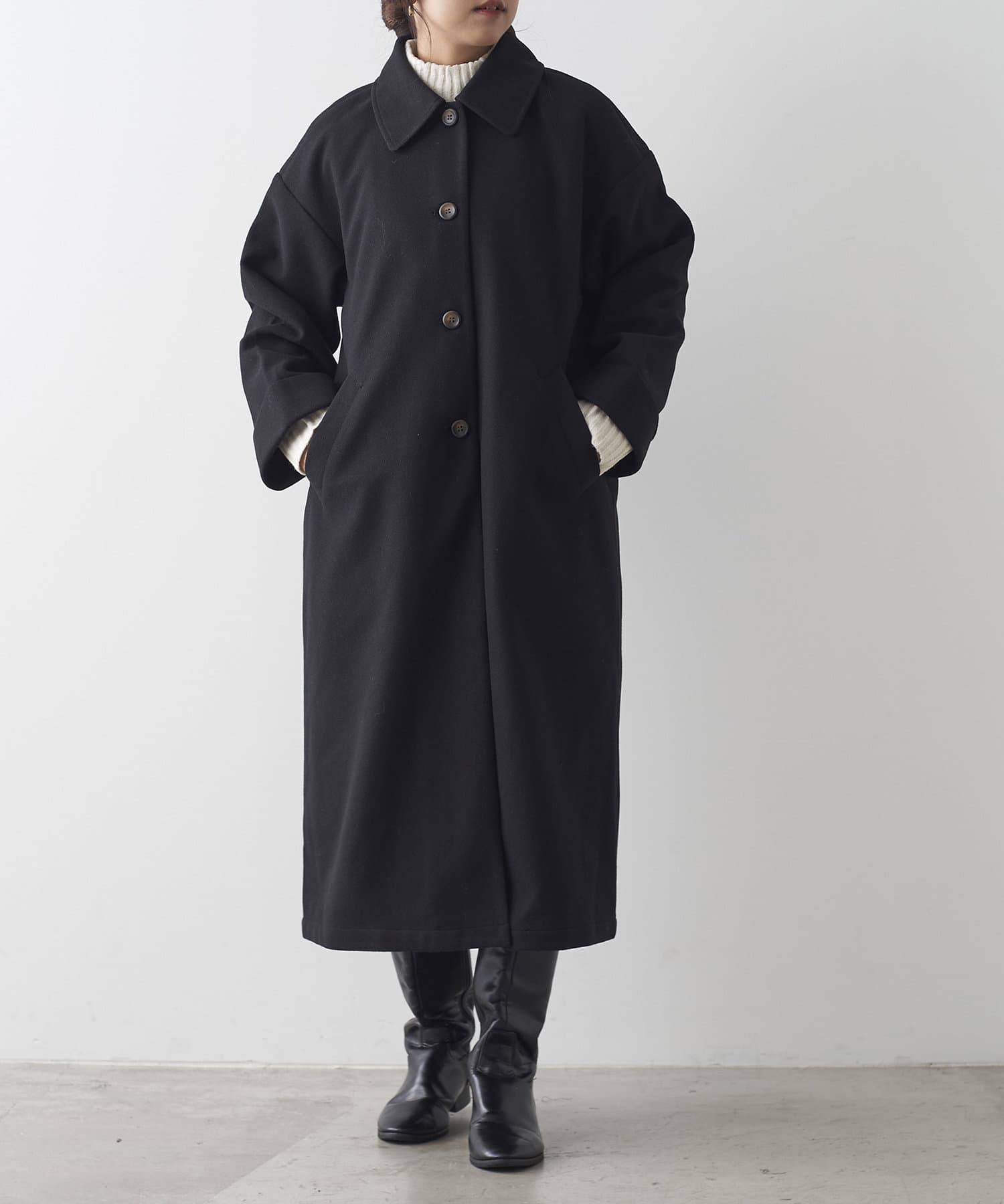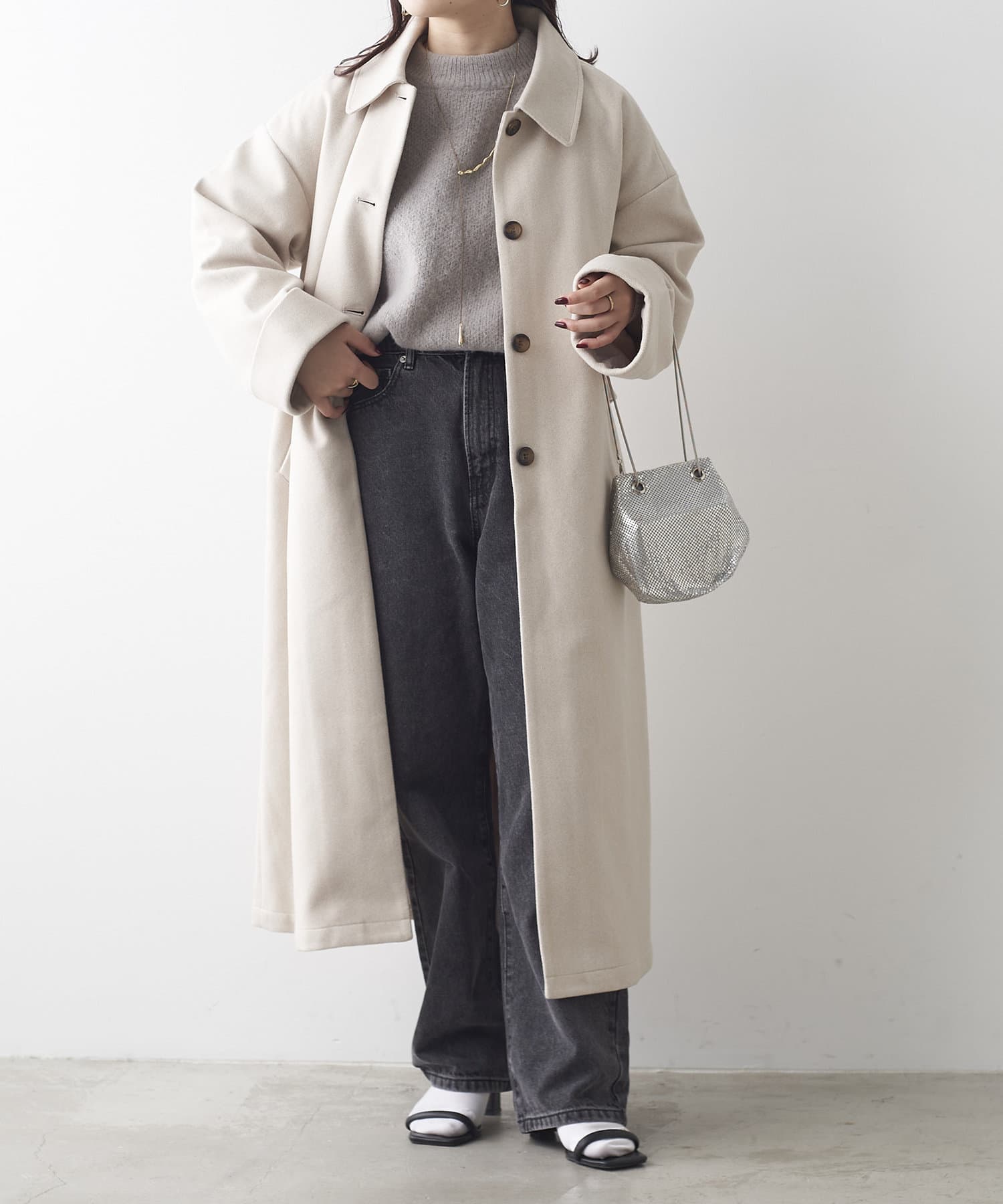 ・バックベルトがワンポイントな幅広いシーンに対応できるロングコート。