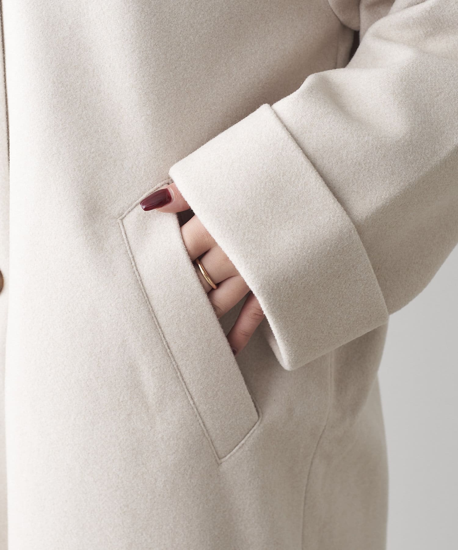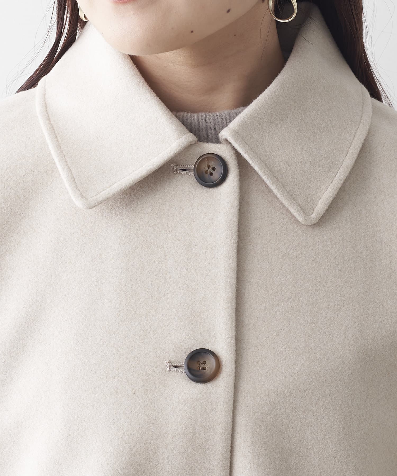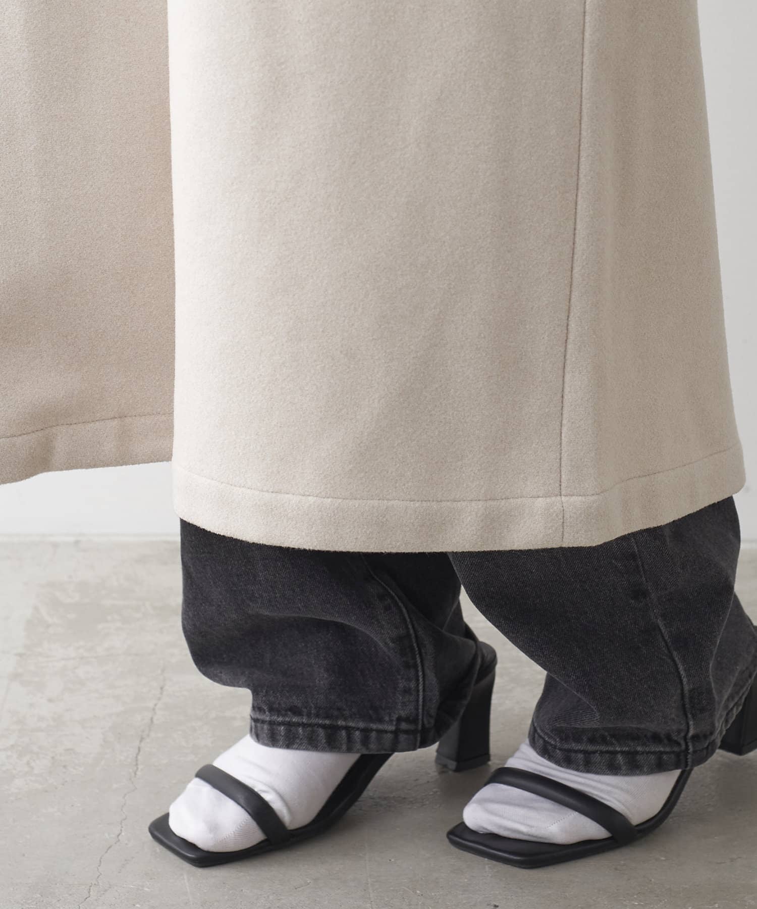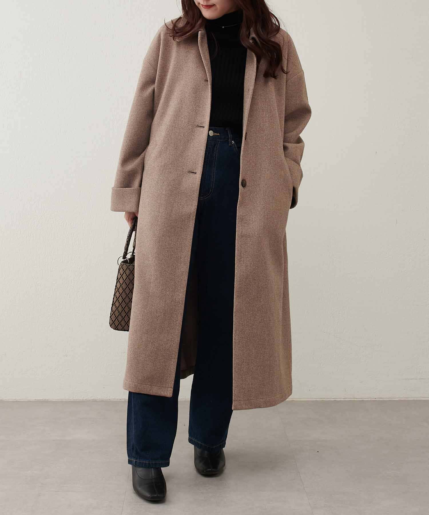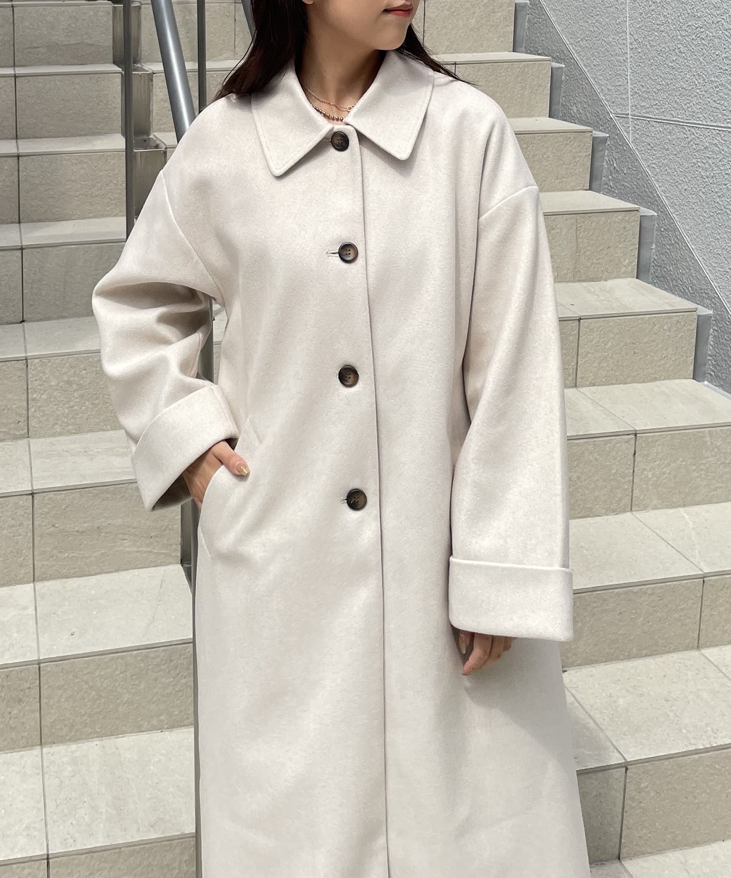 ・バックベルトがワンポイントな幅広いシーンに対応できるロングコート。