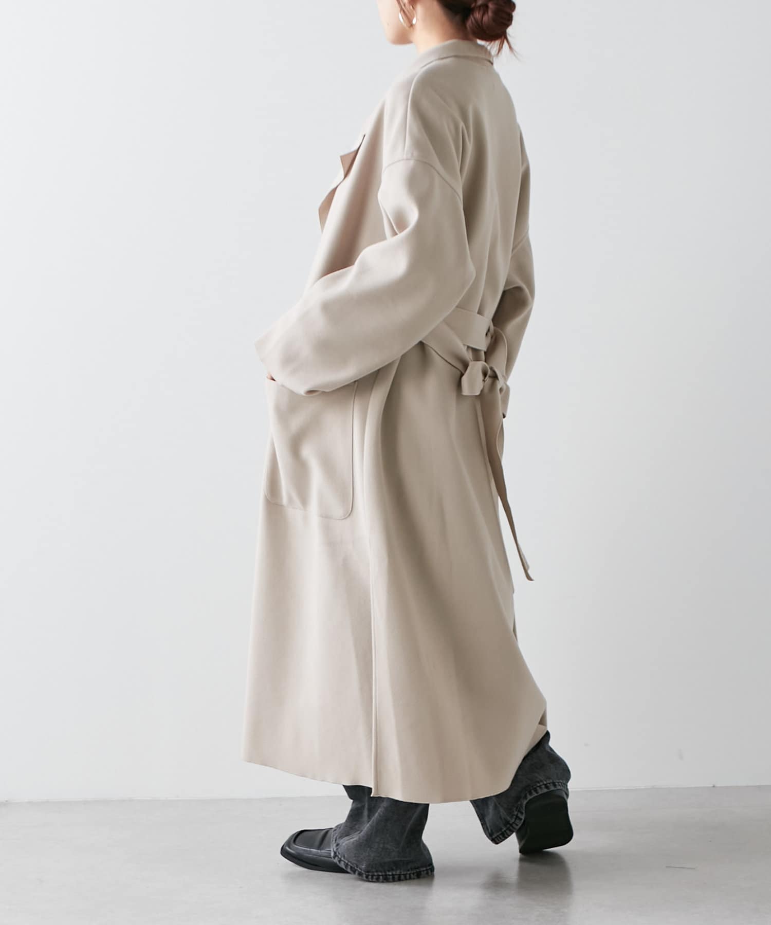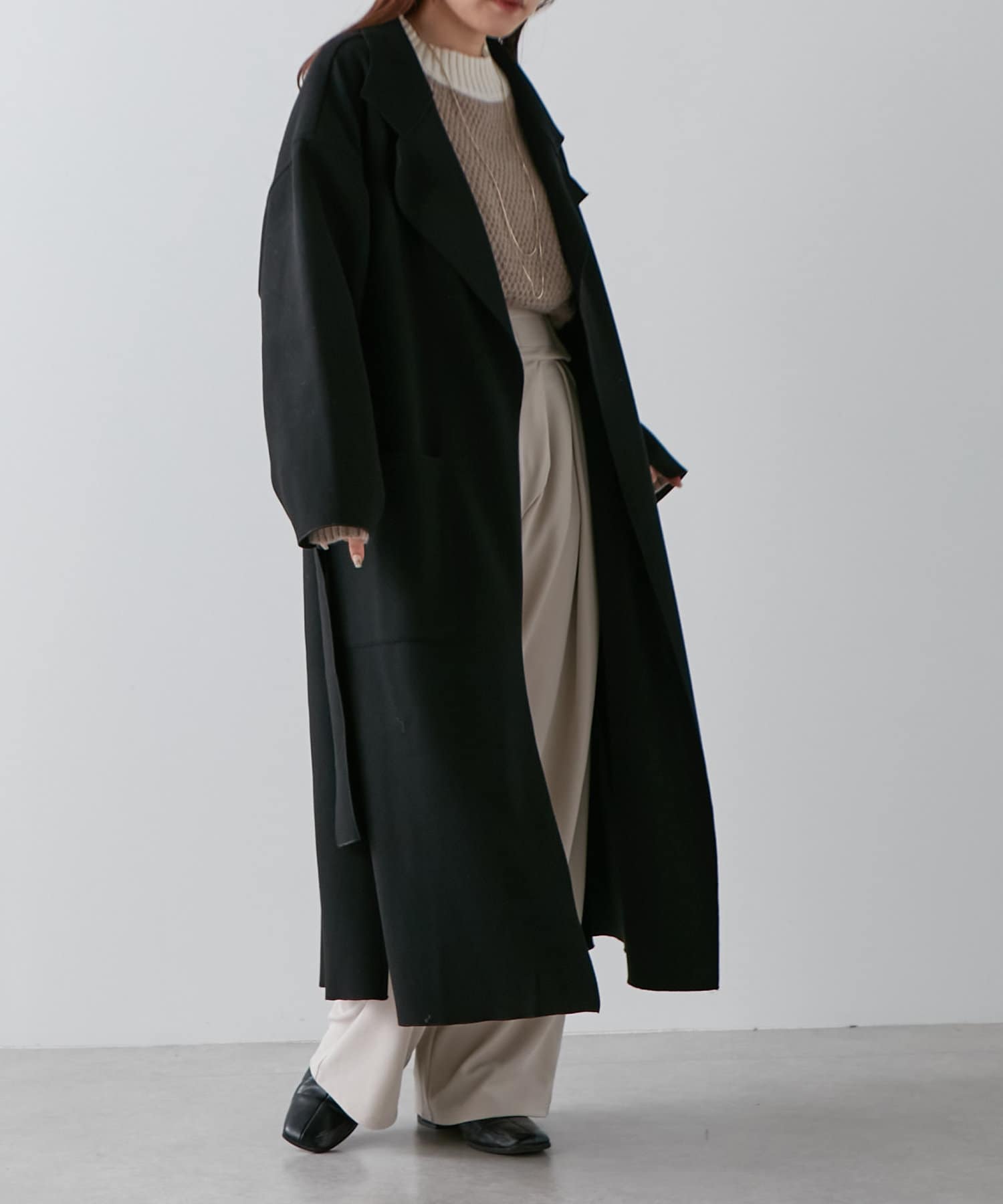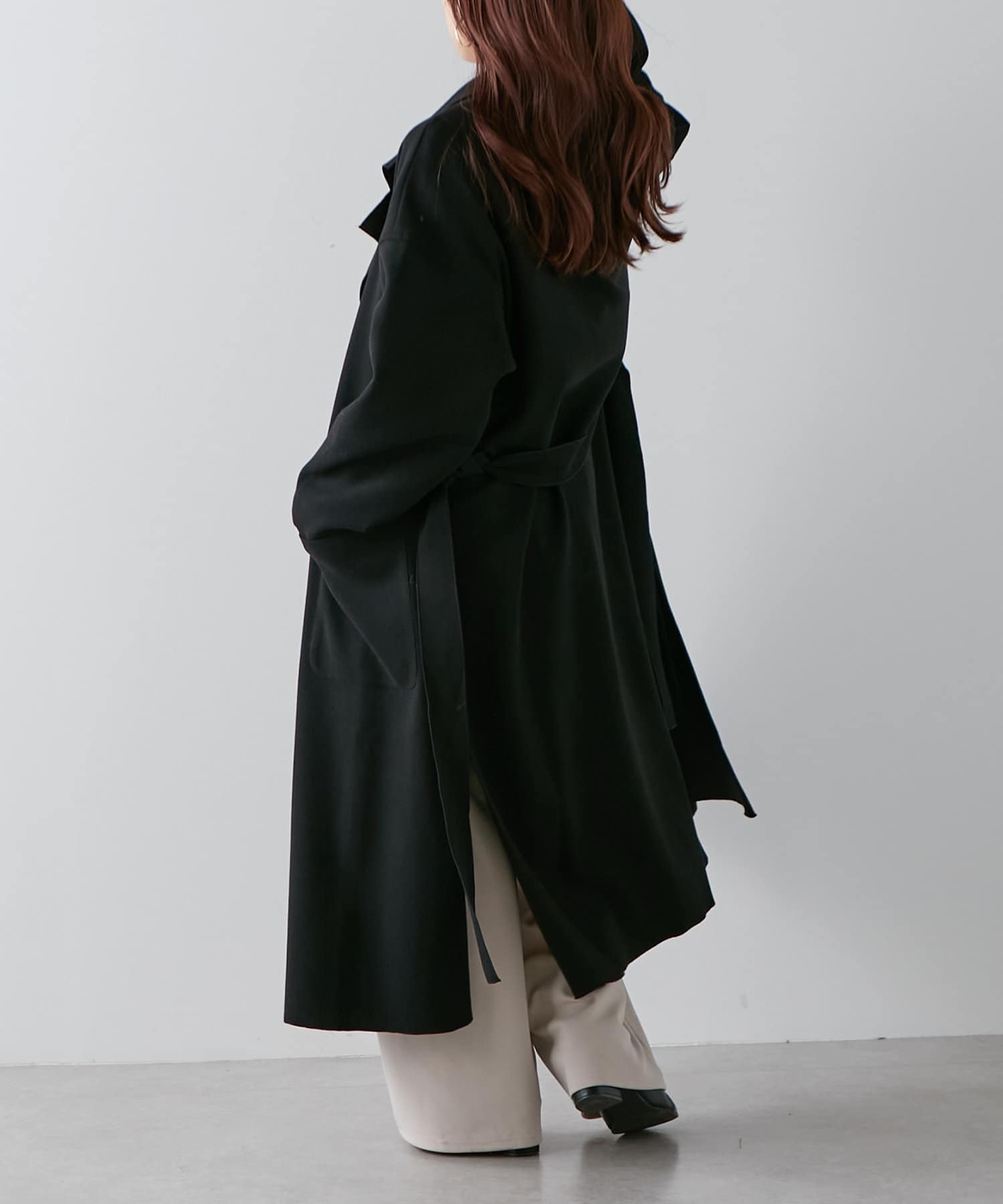 ・深めなスリットが入り、動いたときの揺れ感がきれいなロングコート。