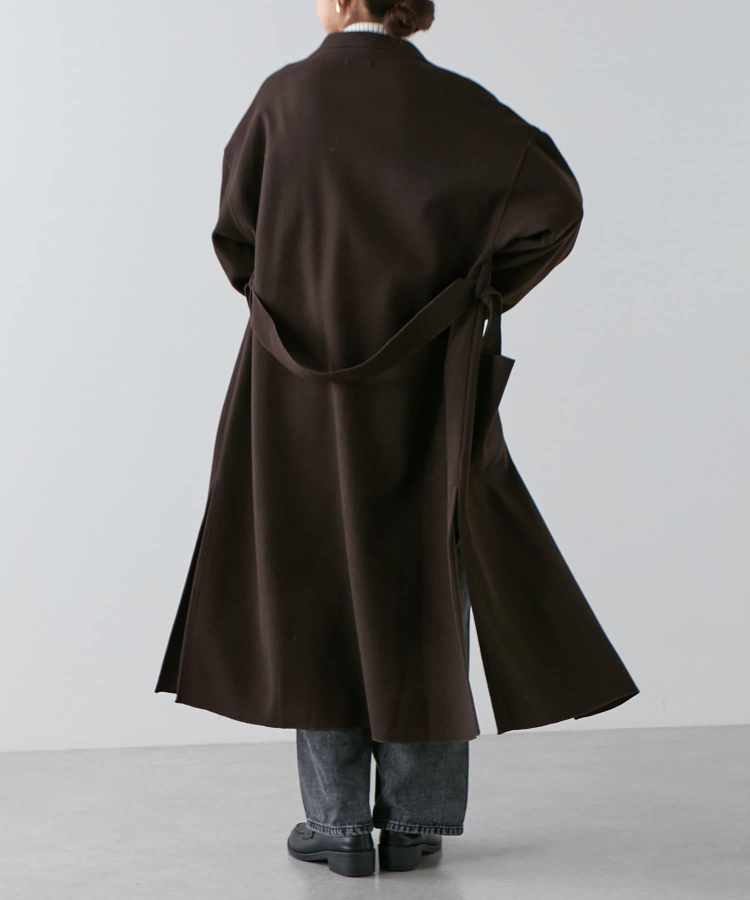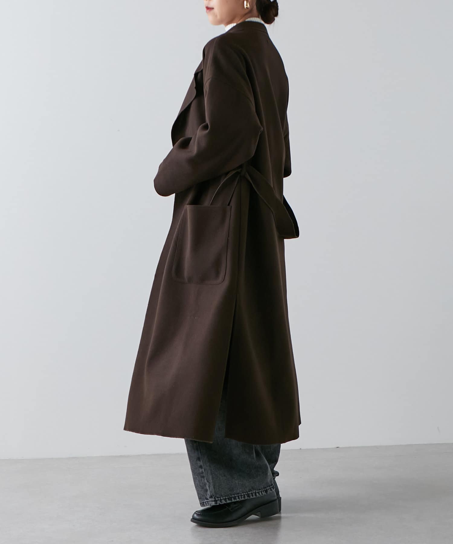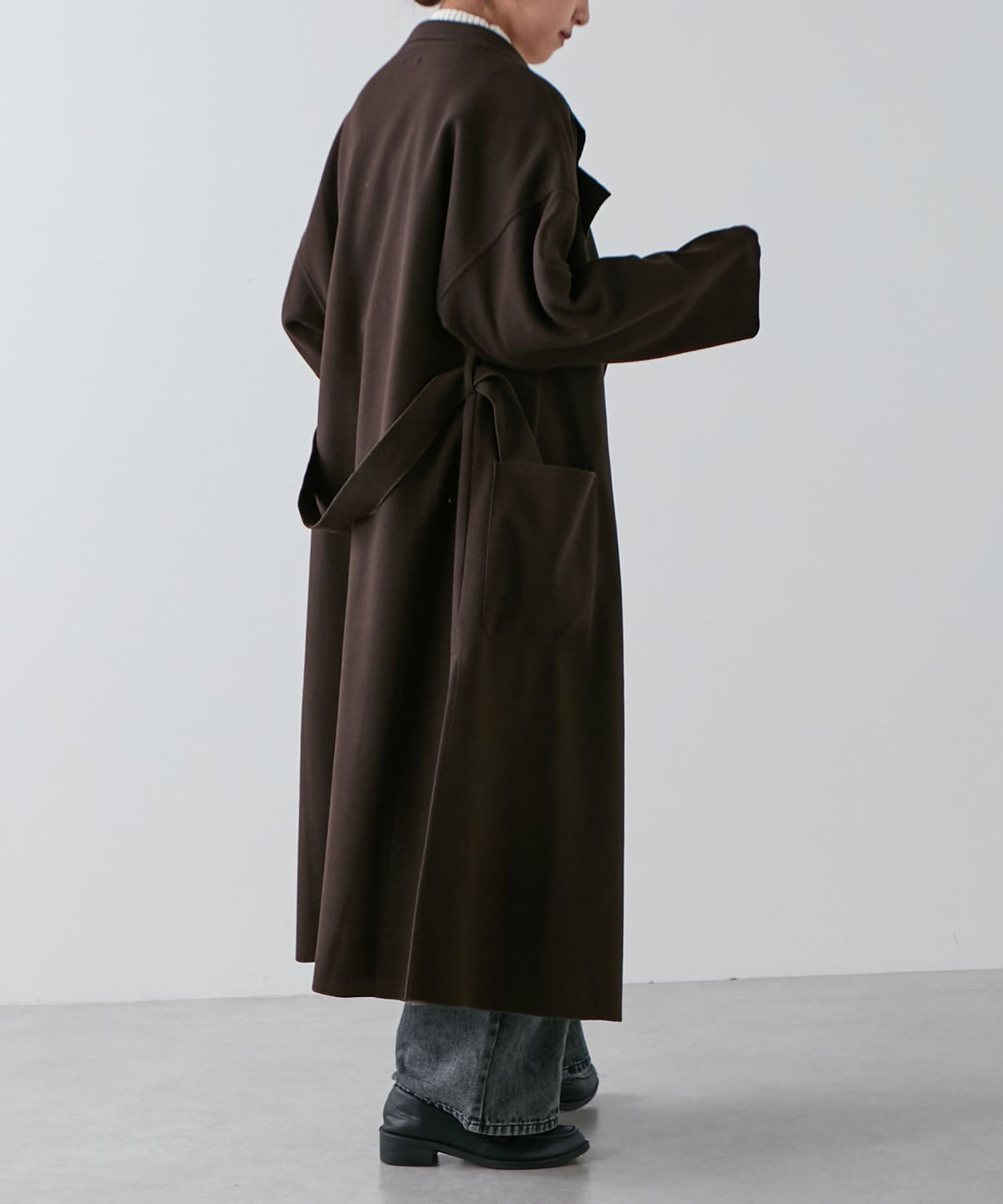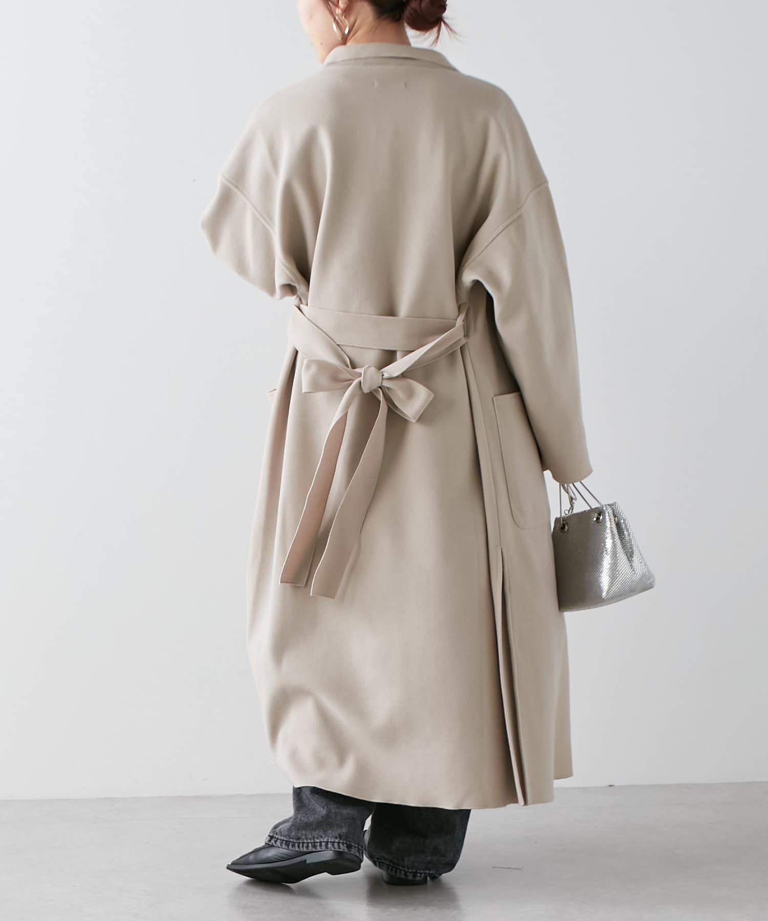 ・深めなスリットが入り、動いたときの揺れ感がきれいなロングコート。