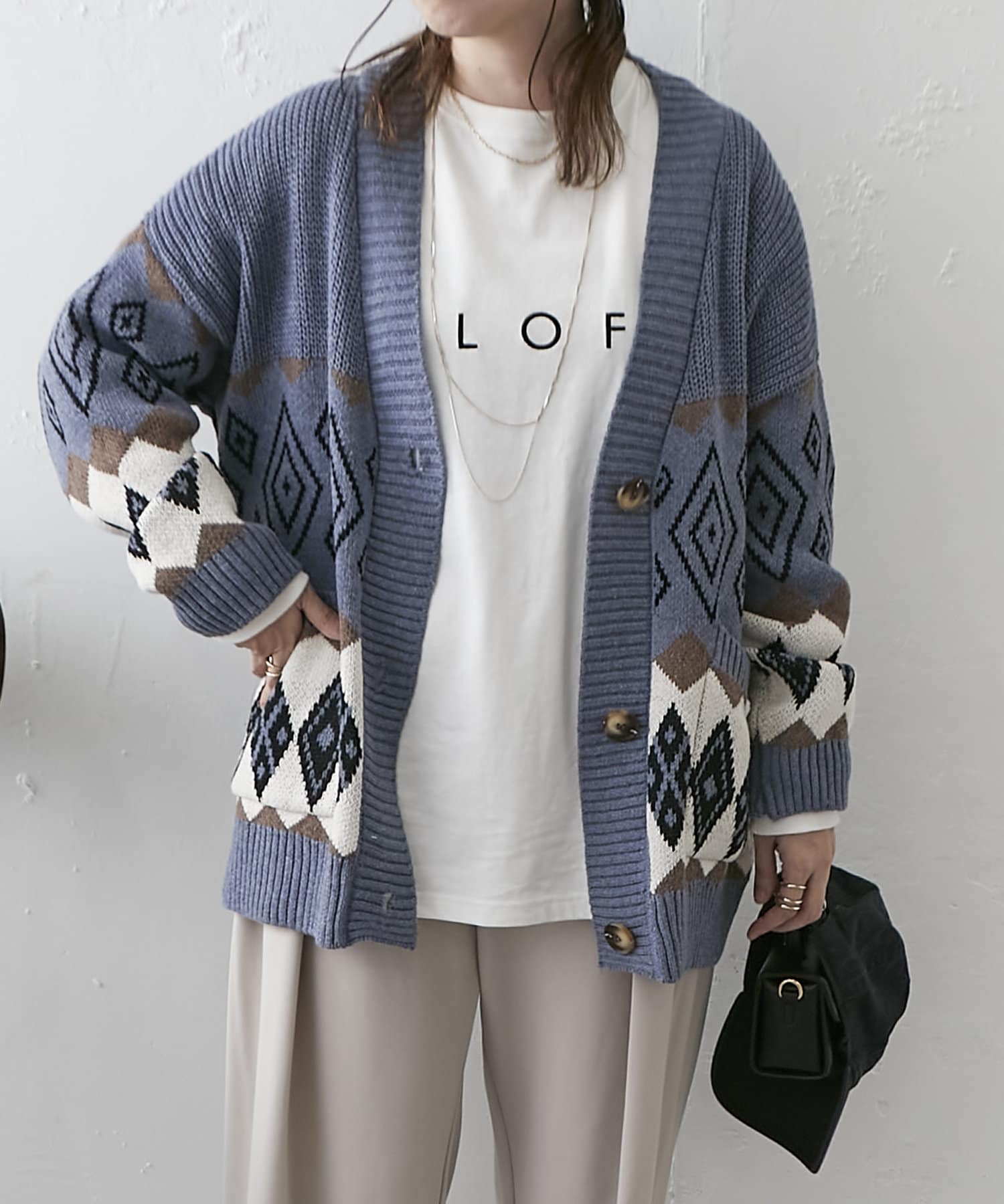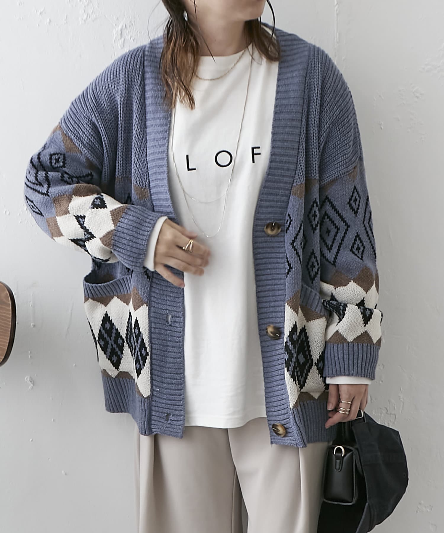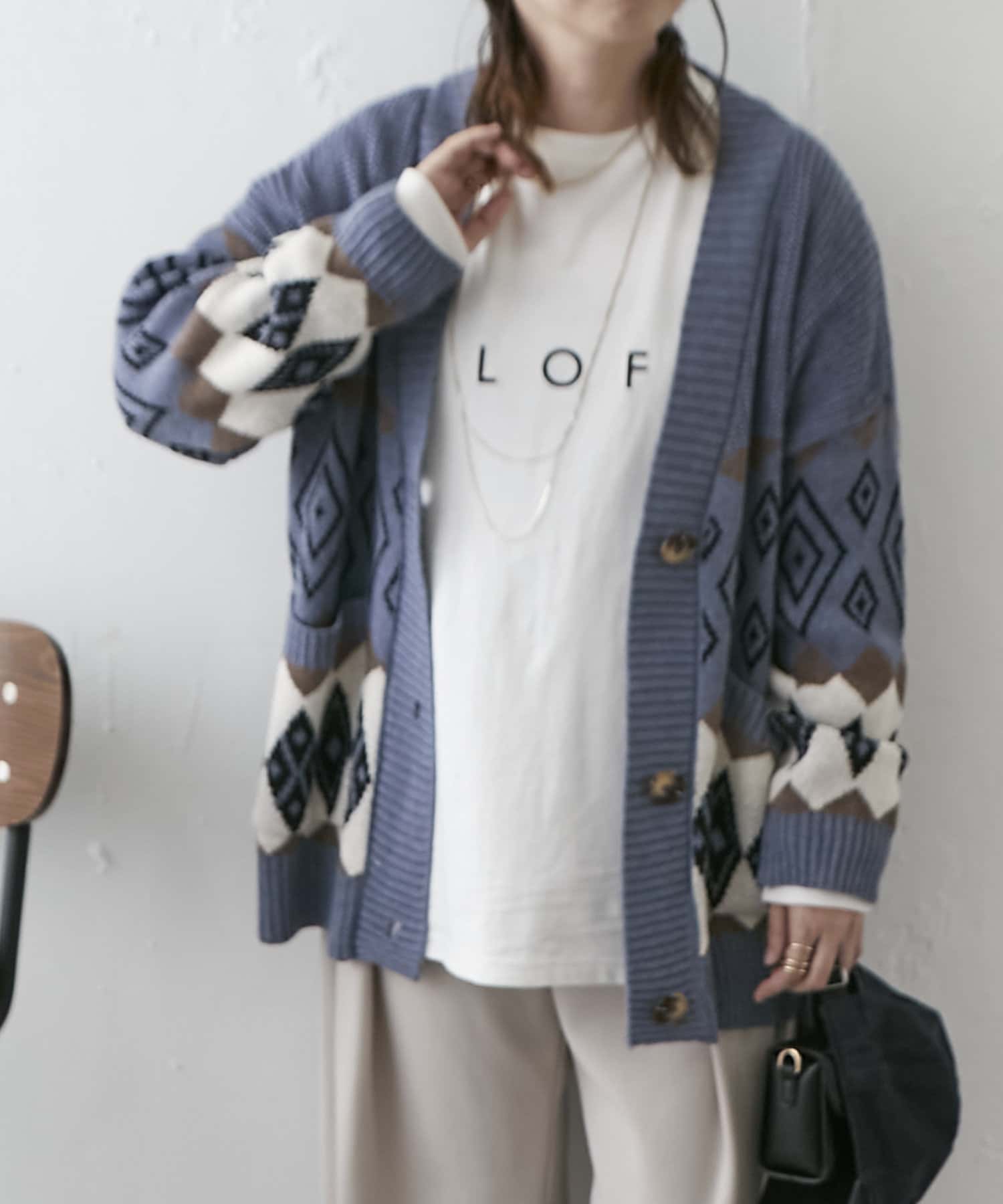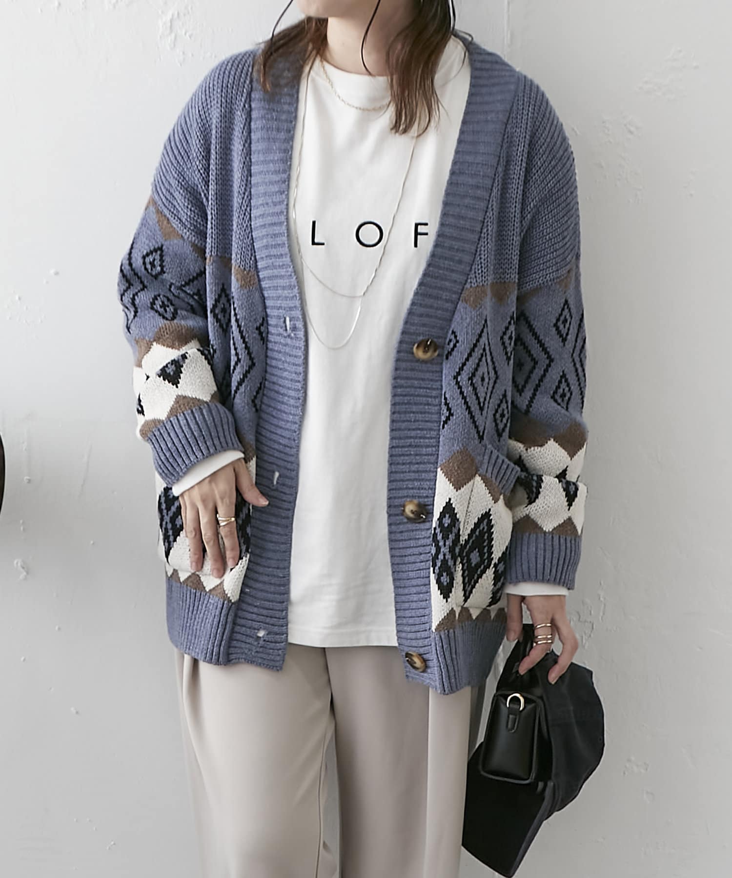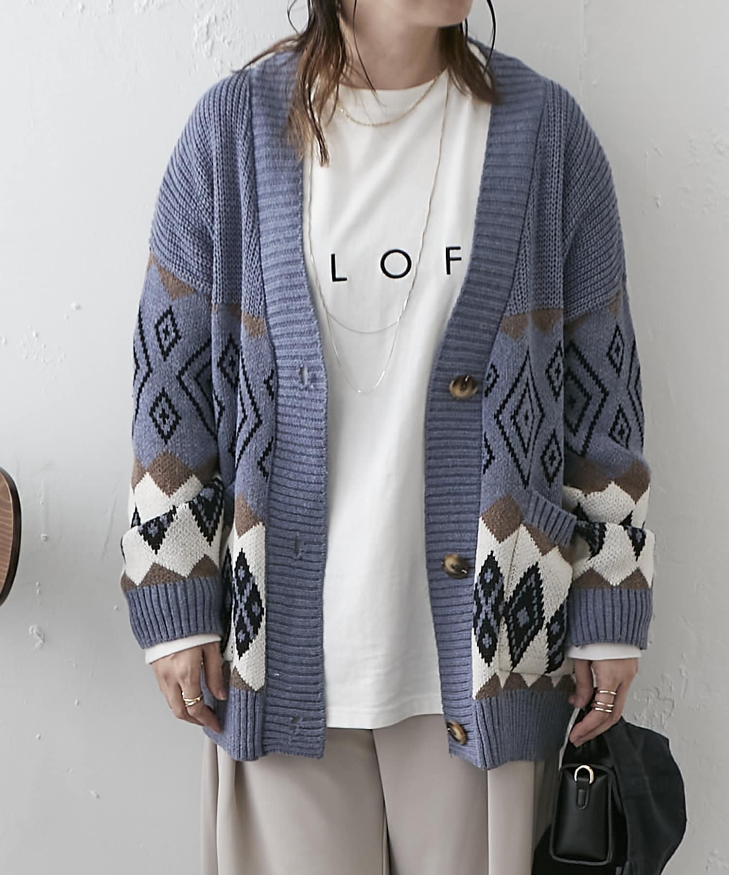 ・深めVネックとオーバーシルエットで合わせるインナー次第でロングシーズン着回せるアイテム。