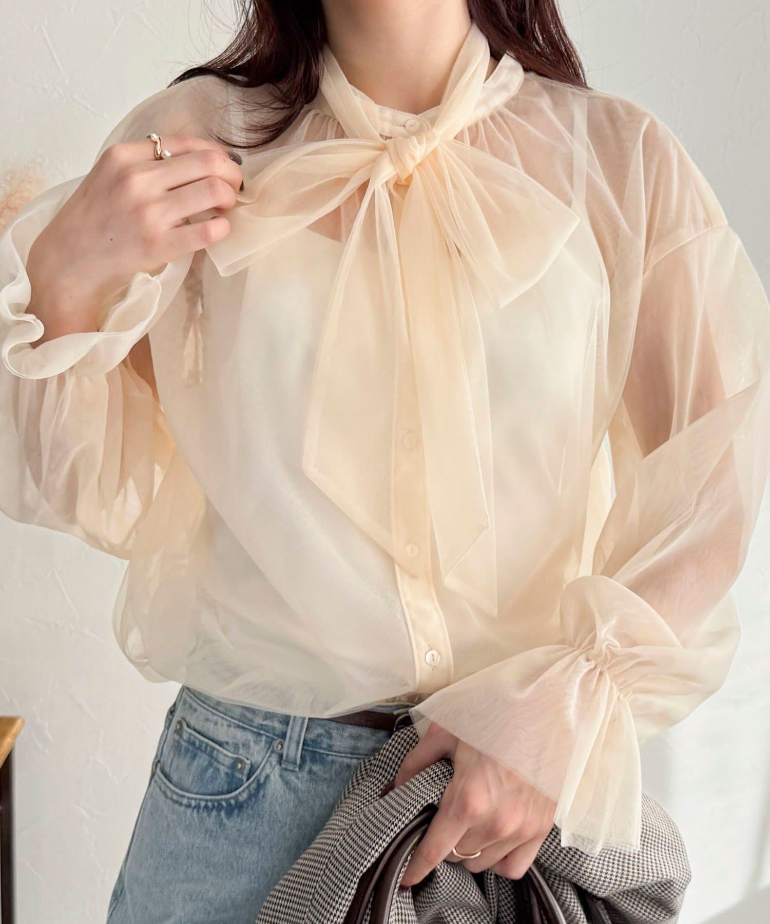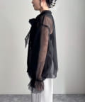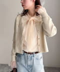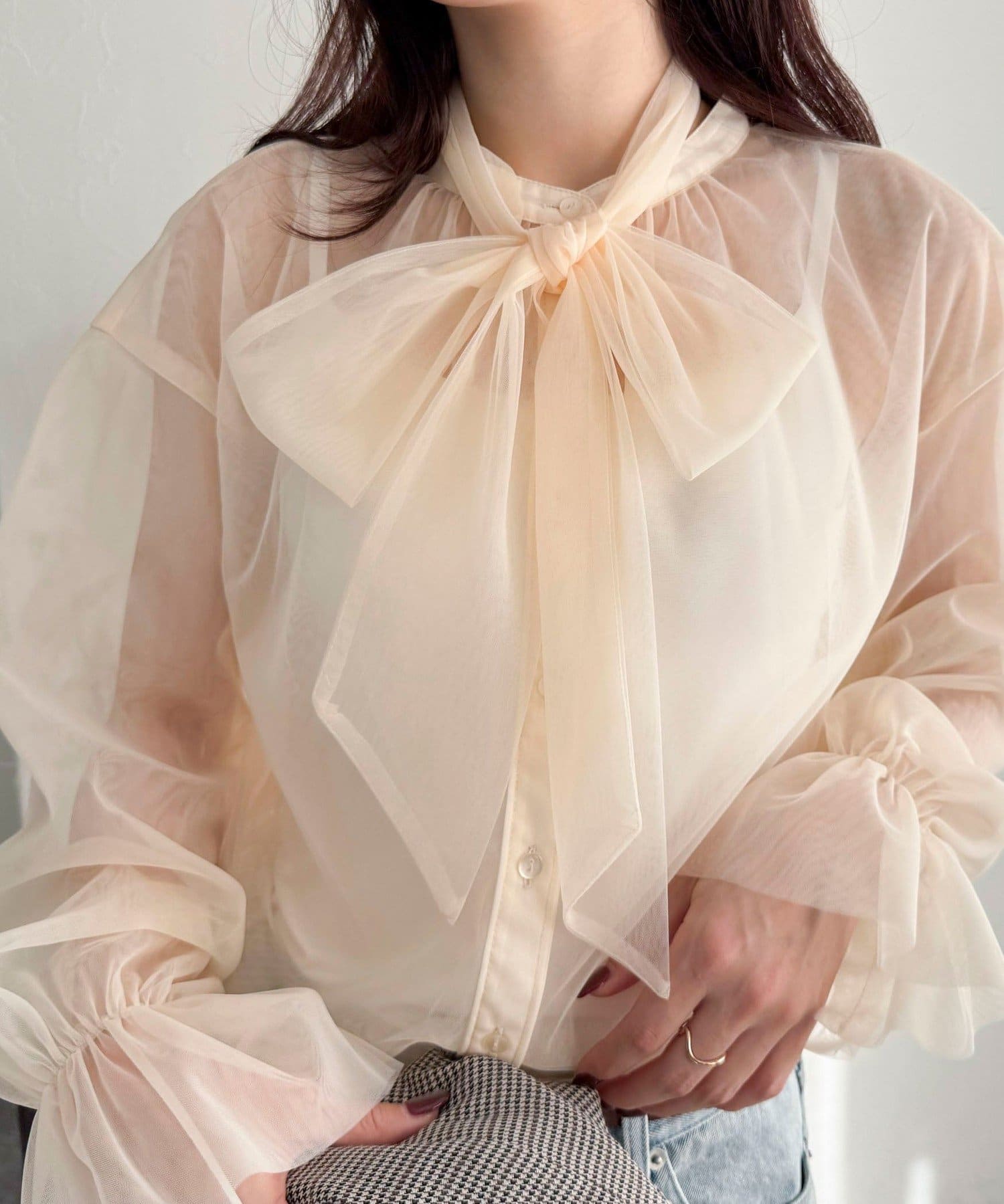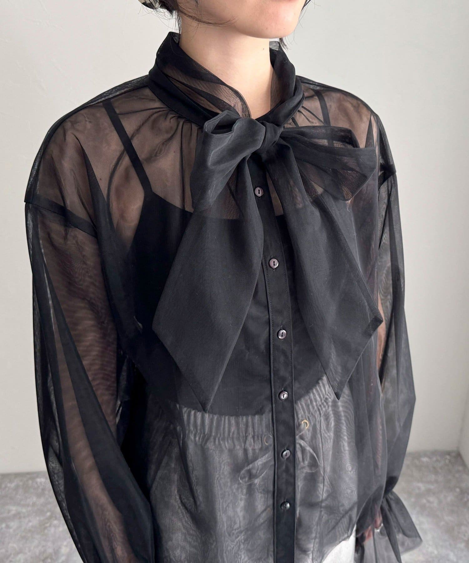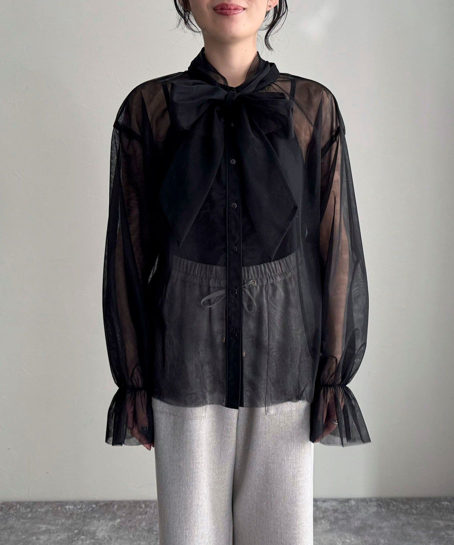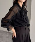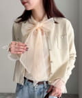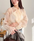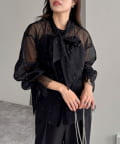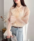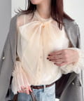・ふんわりした2重仕立てのチュール素材が目を惹くボウタイブラウスです