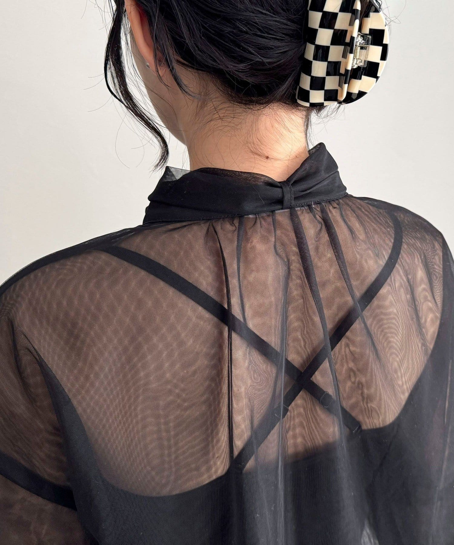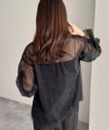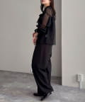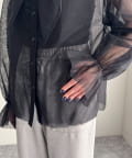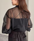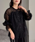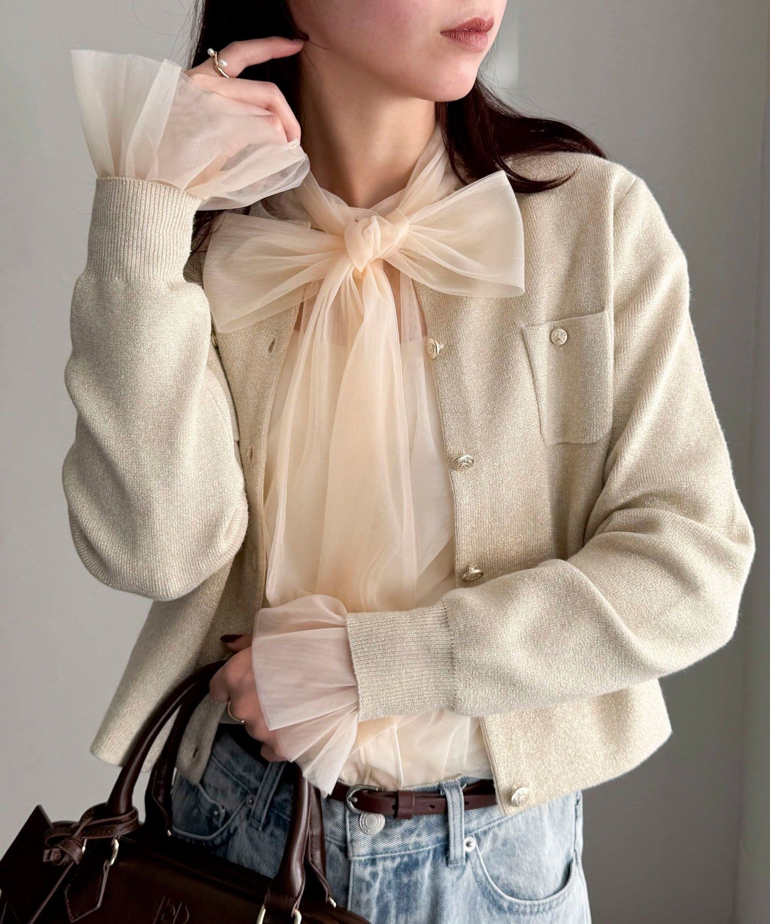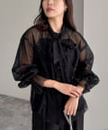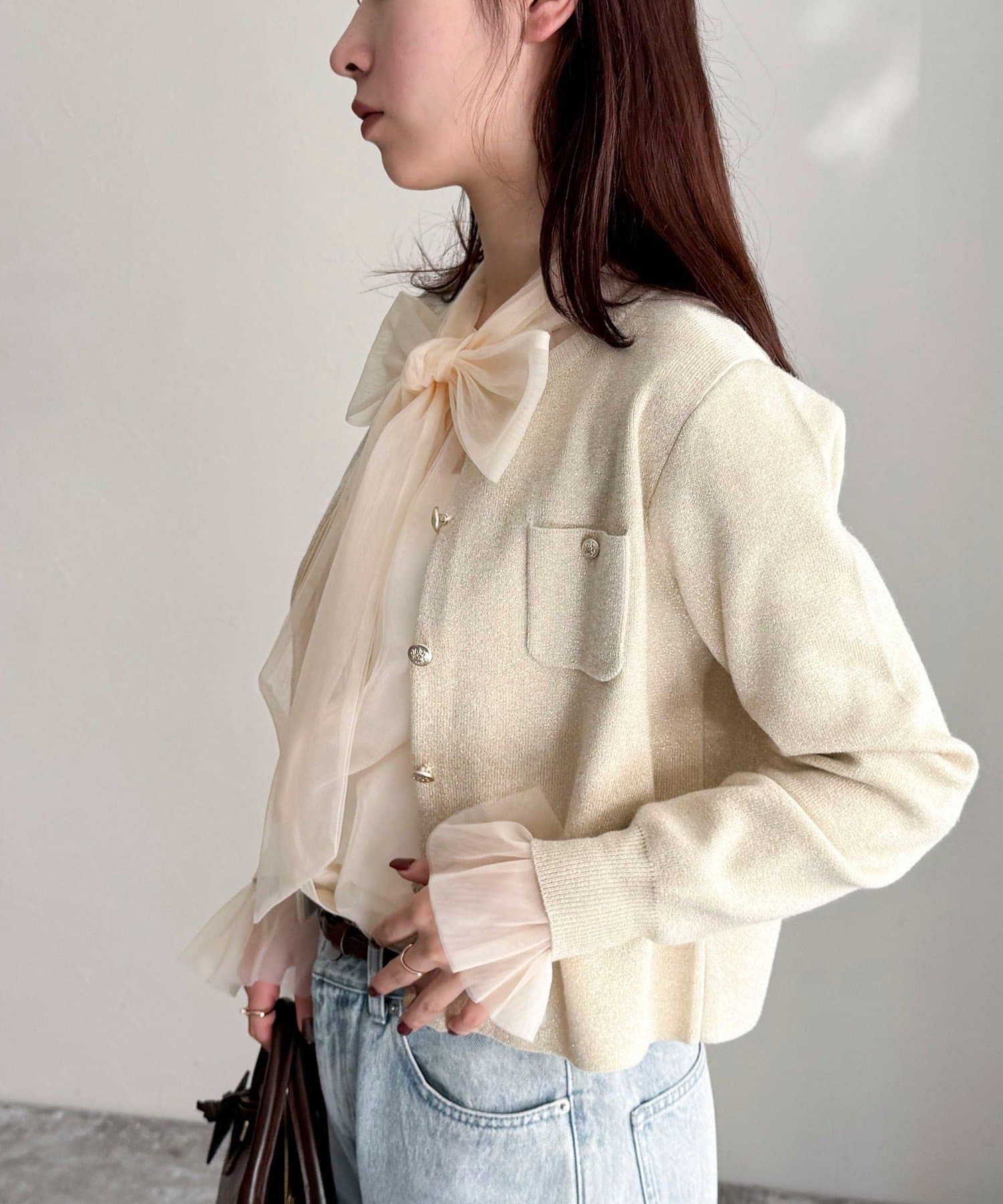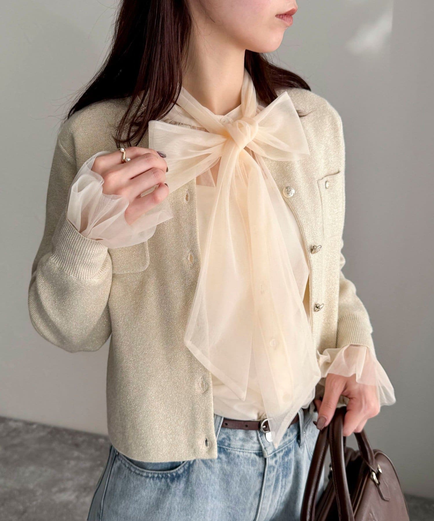 ・ふんわりした2重仕立てのチュール素材が目を惹くボウタイブラウスです