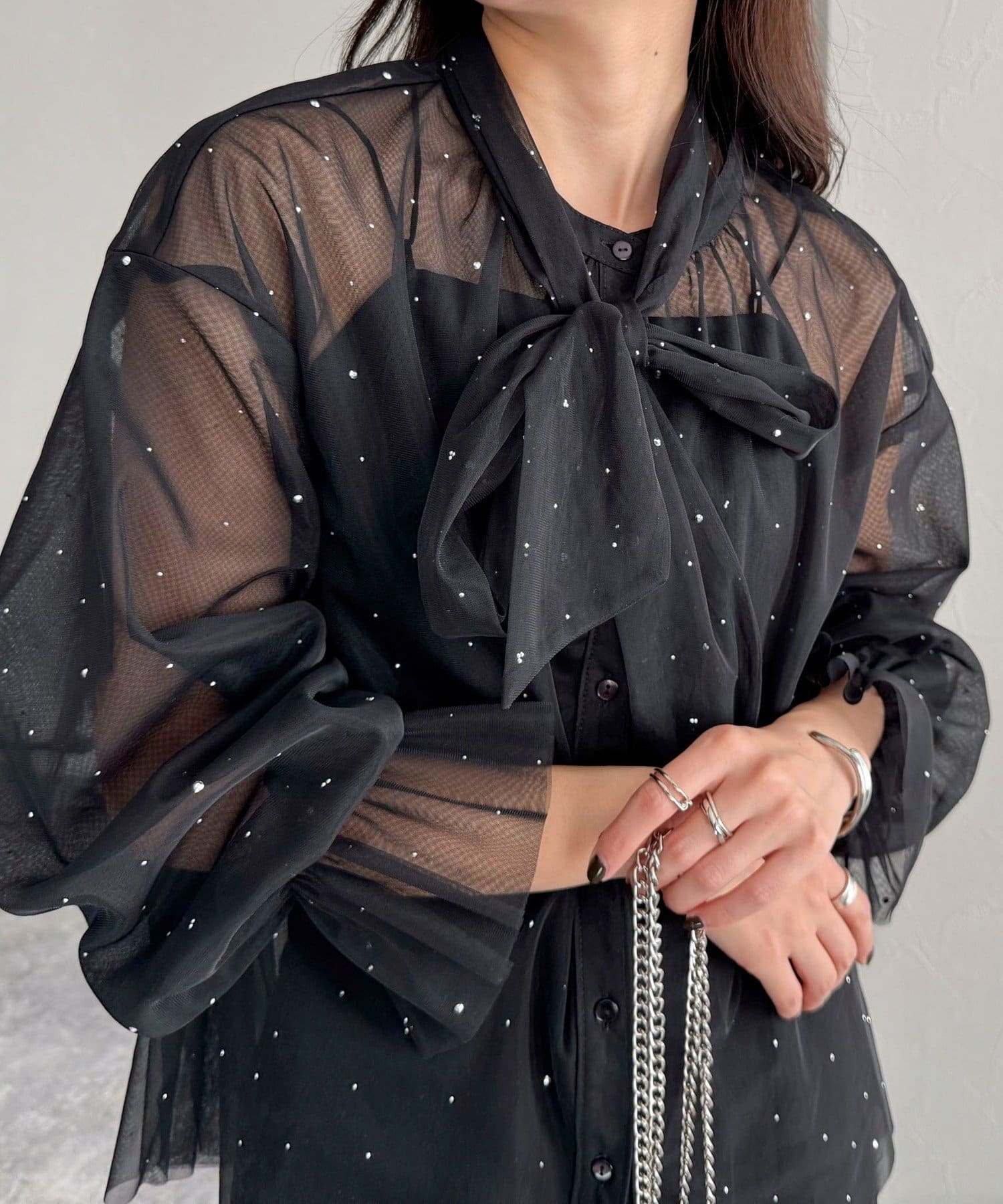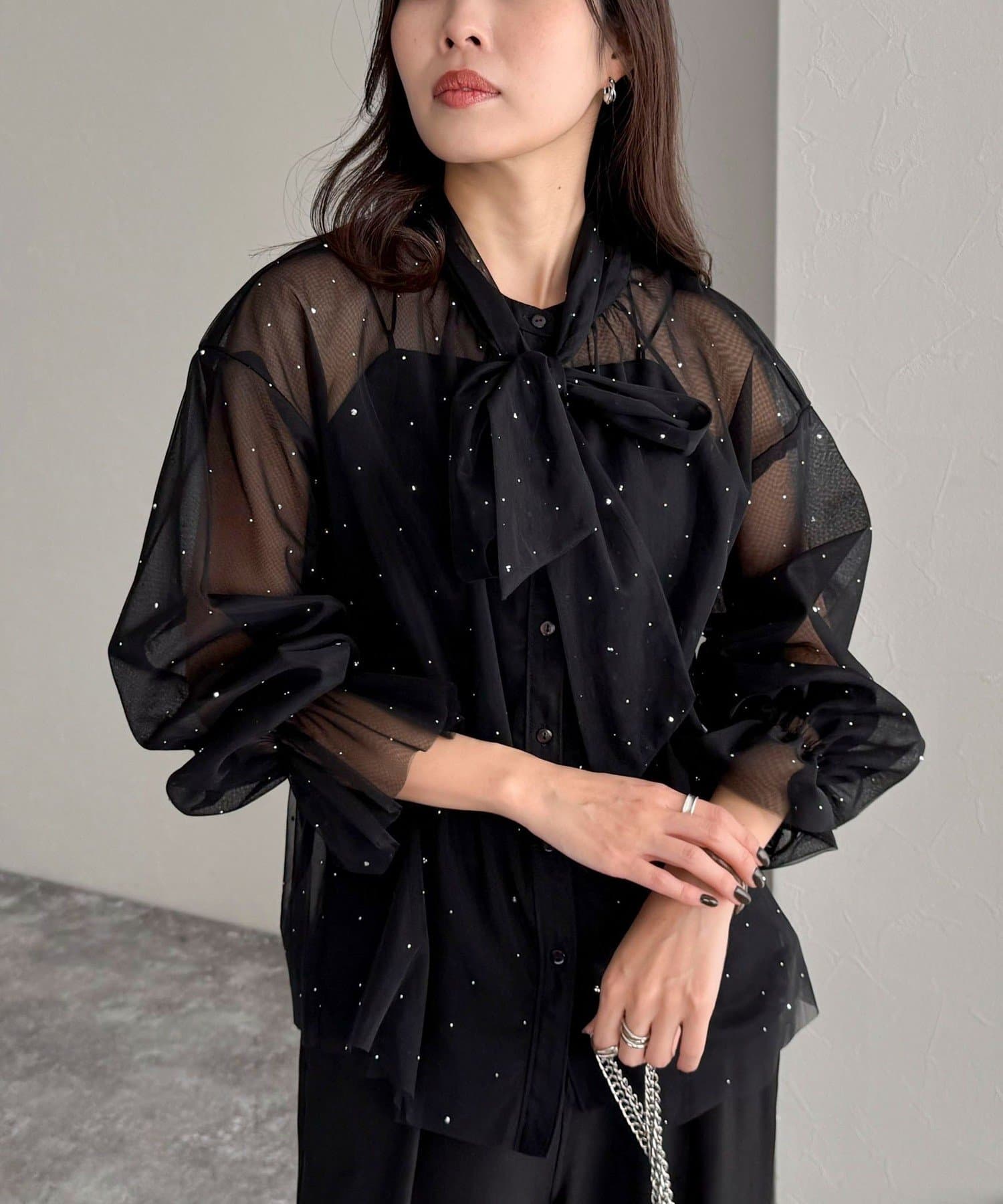 女性らしいレイヤードが楽しめるチュールボウタイブラウス
