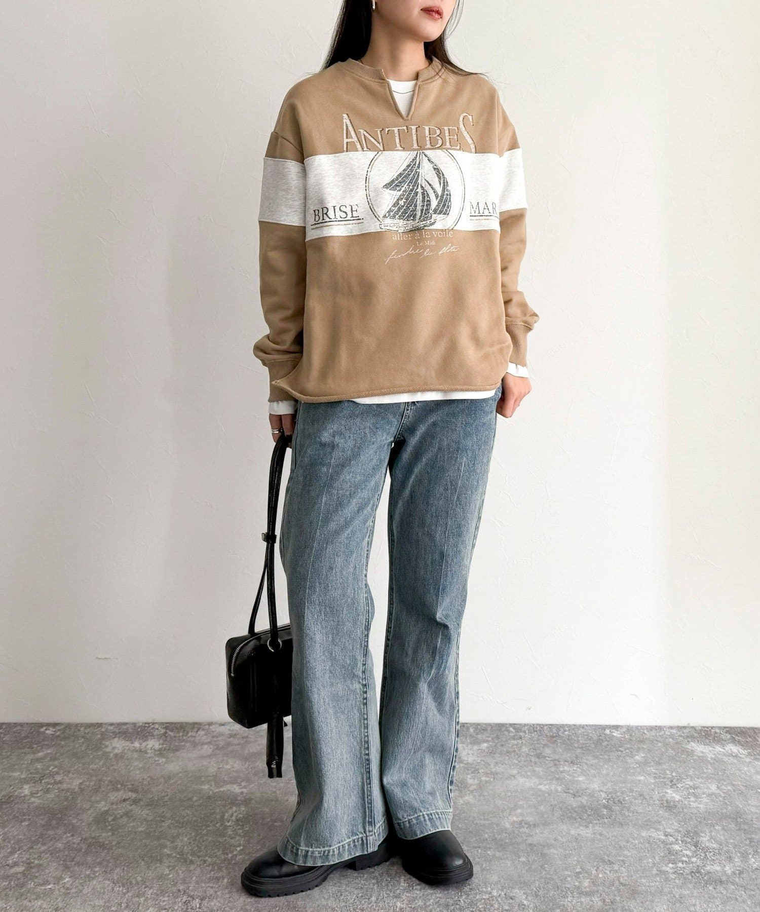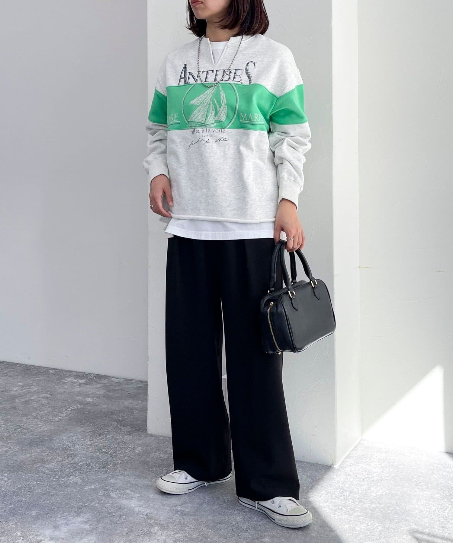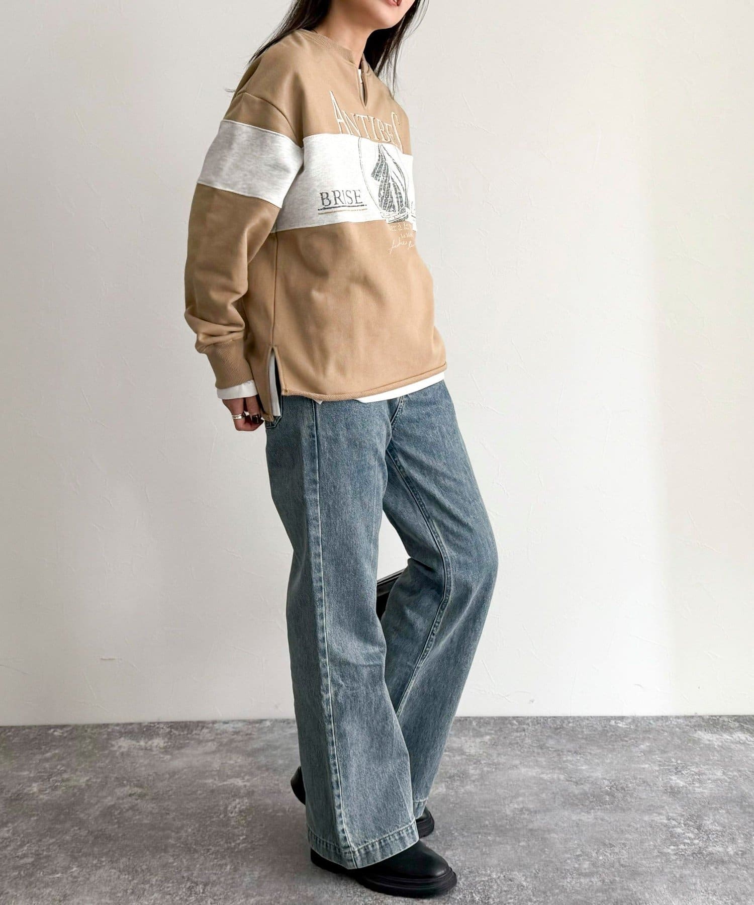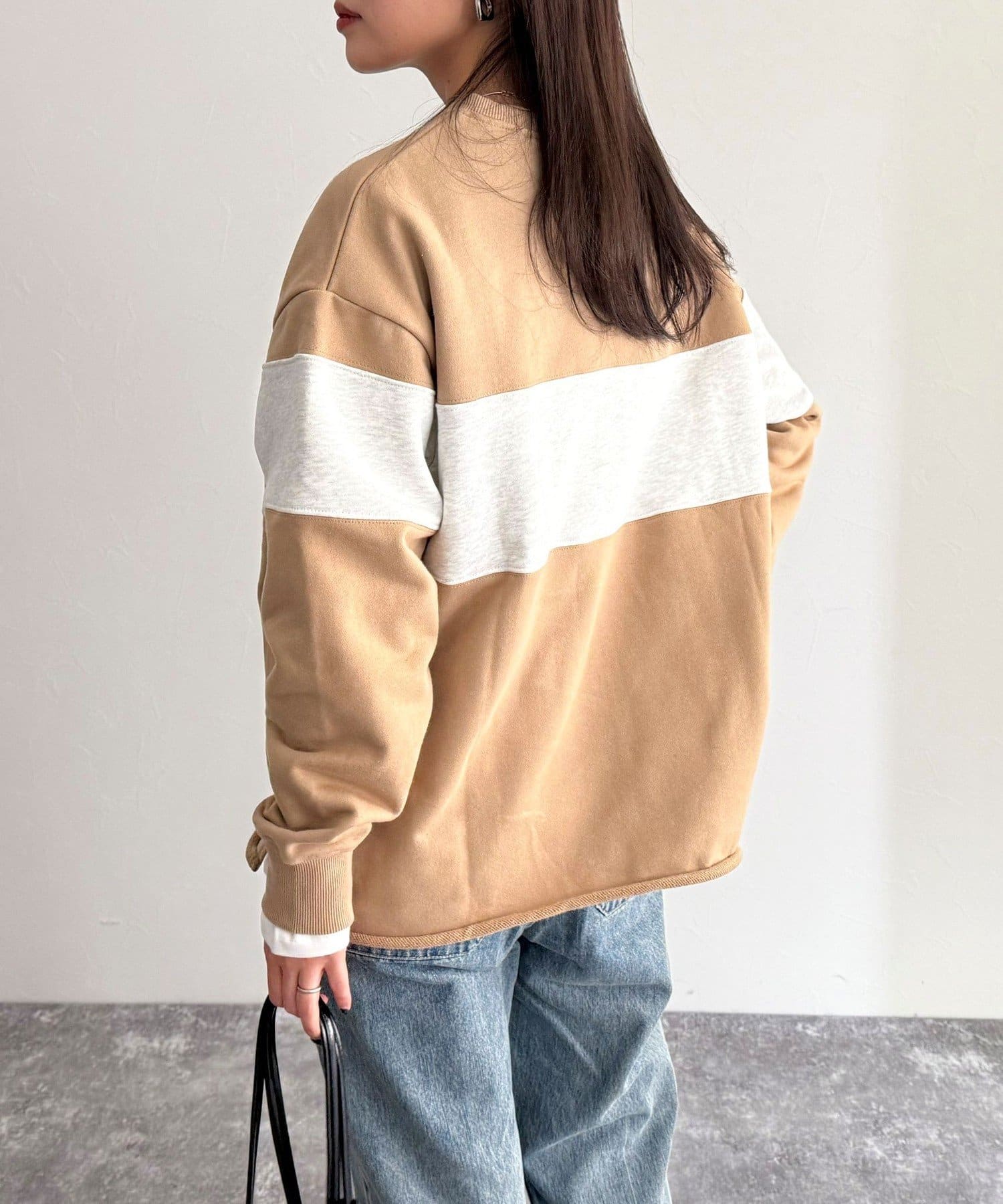 ・生地をつなぎ合わせたリメイク風のデザインがコーデの主役になるスウェットです