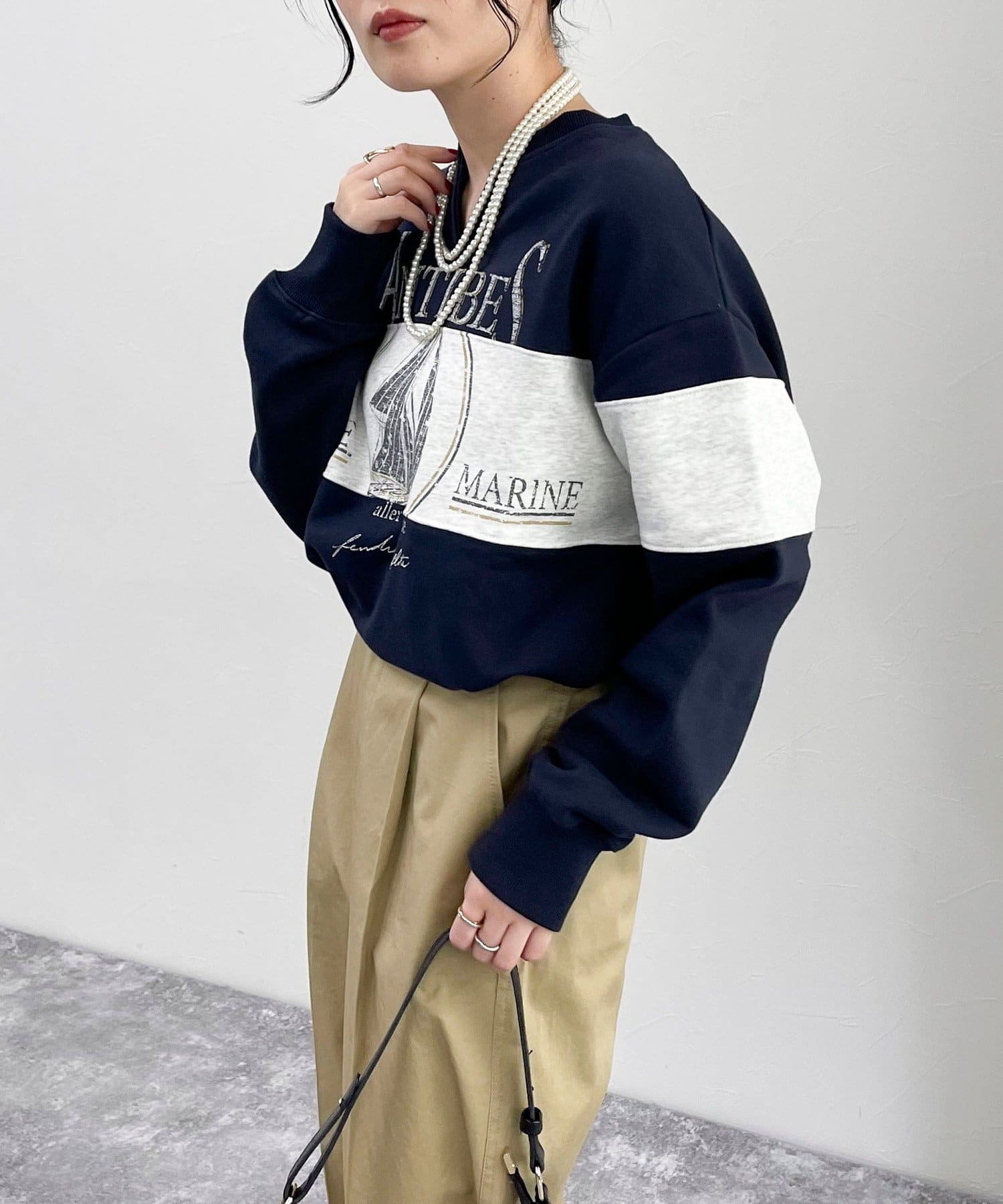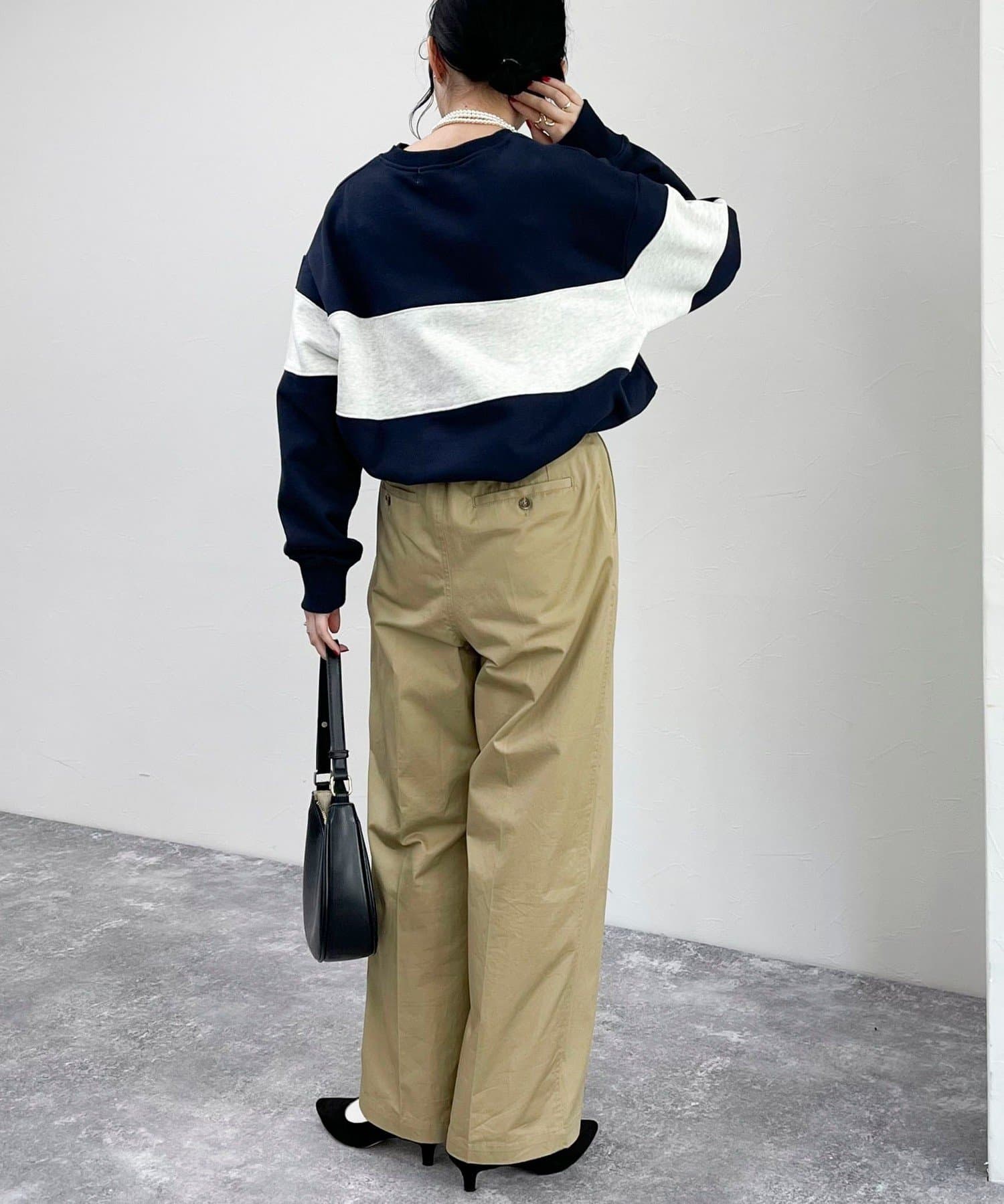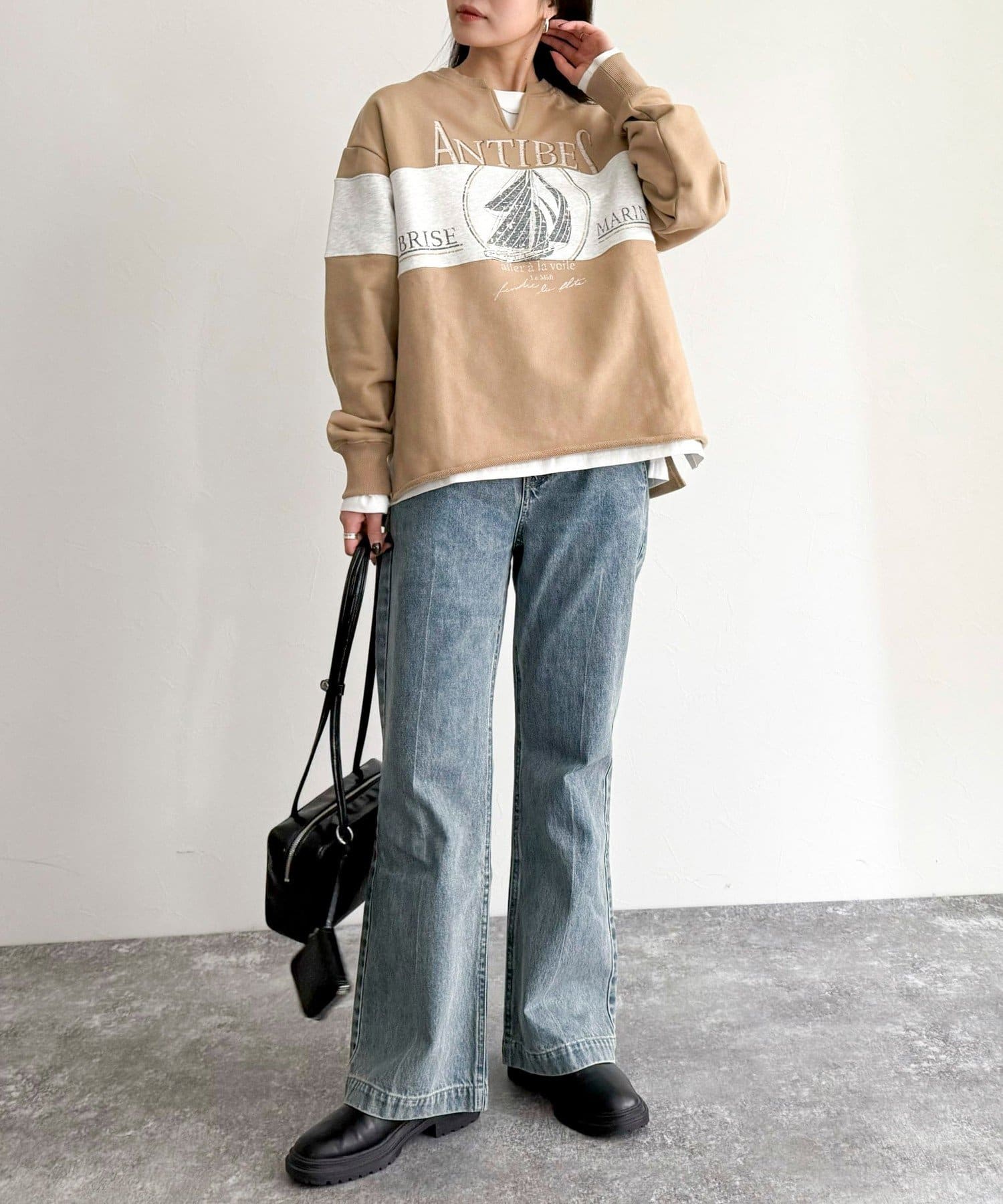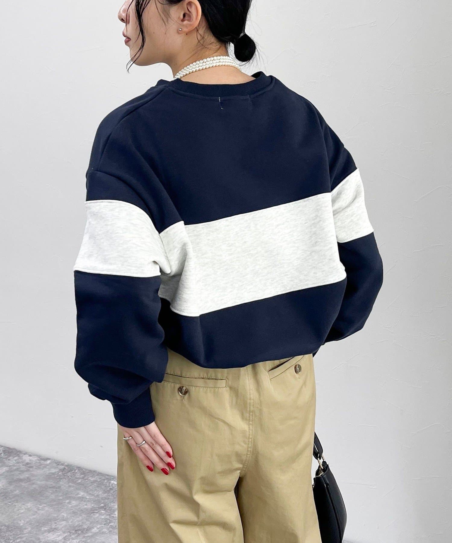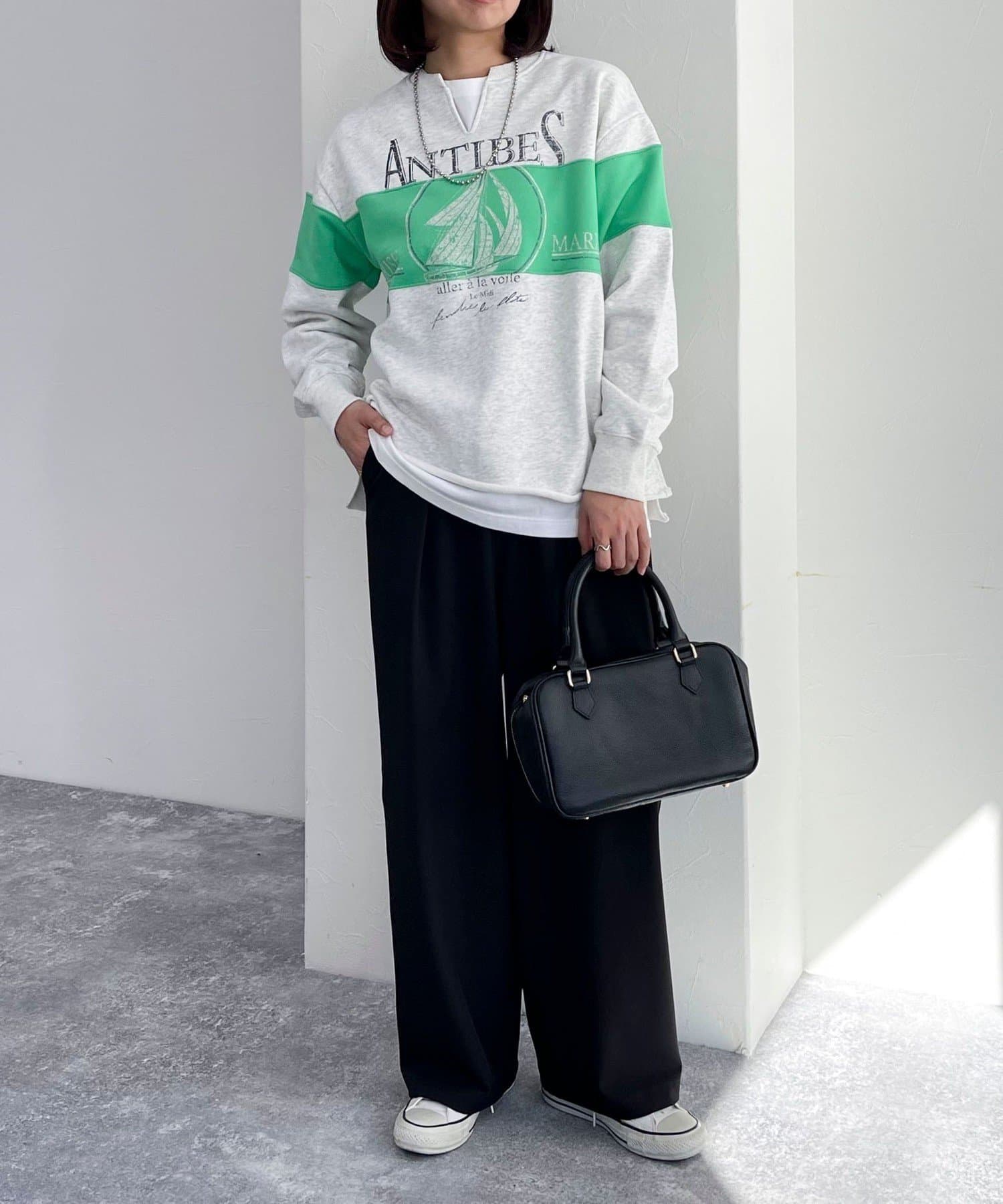 ・生地をつなぎ合わせたリメイク風のデザインがコーデの主役になるスウェットです
