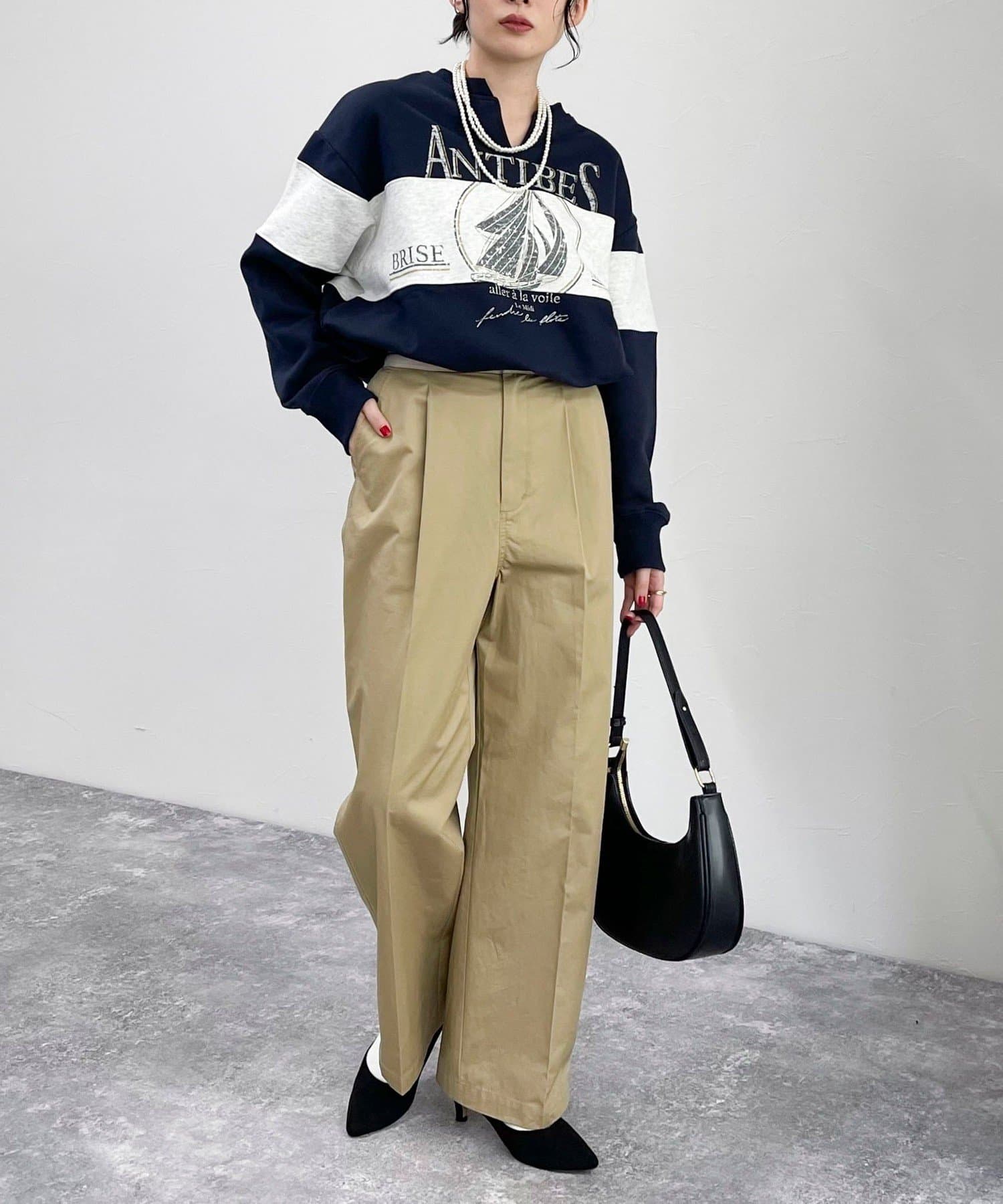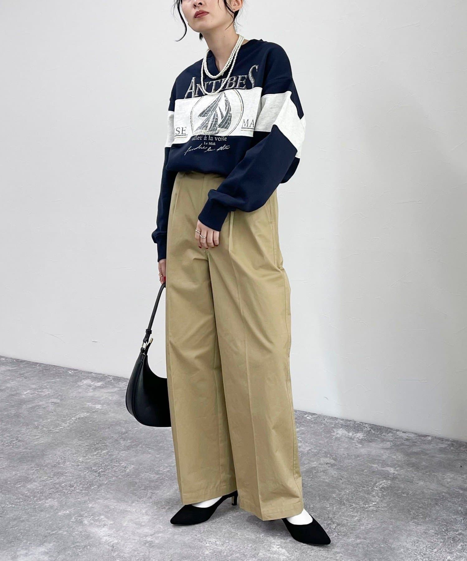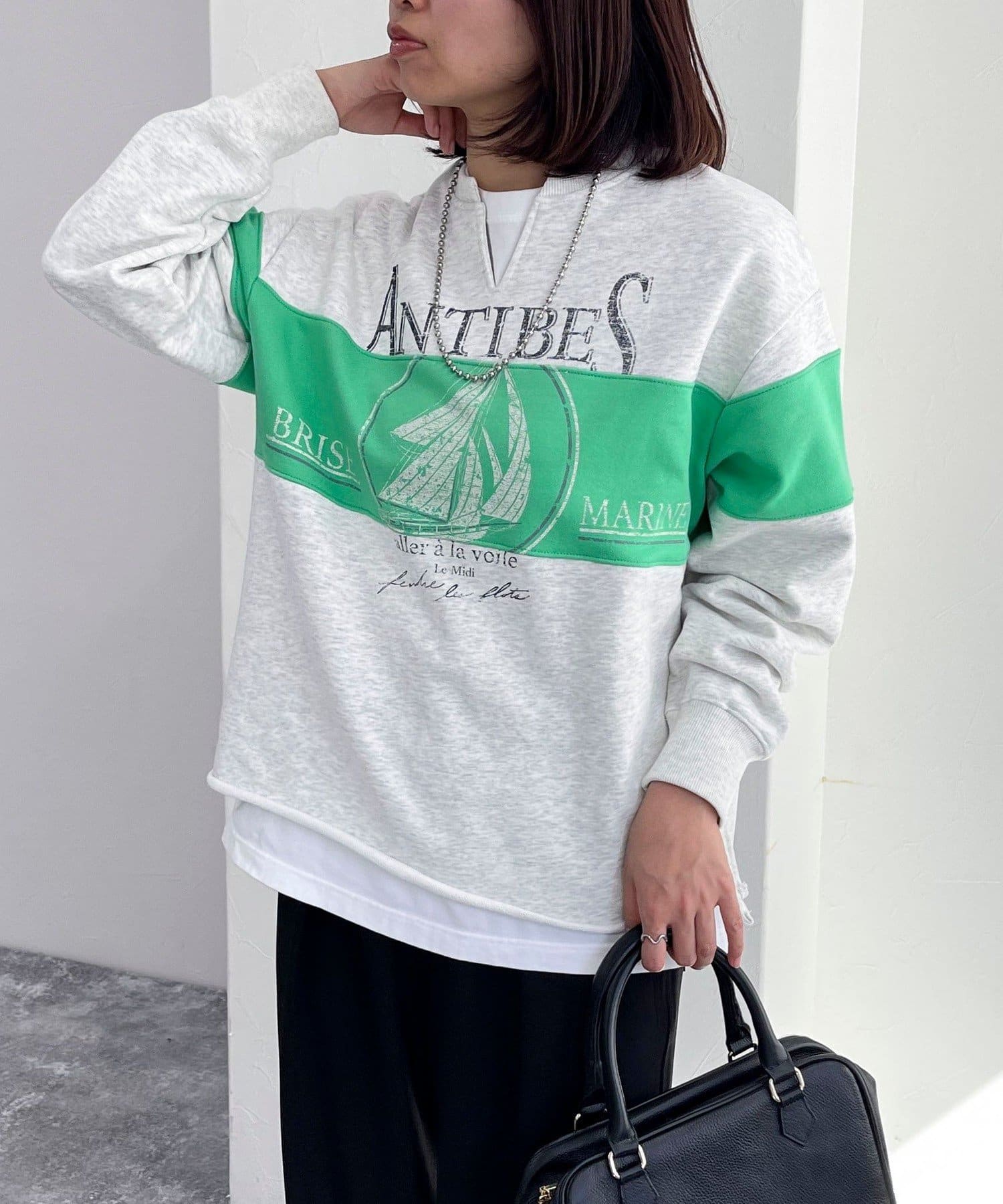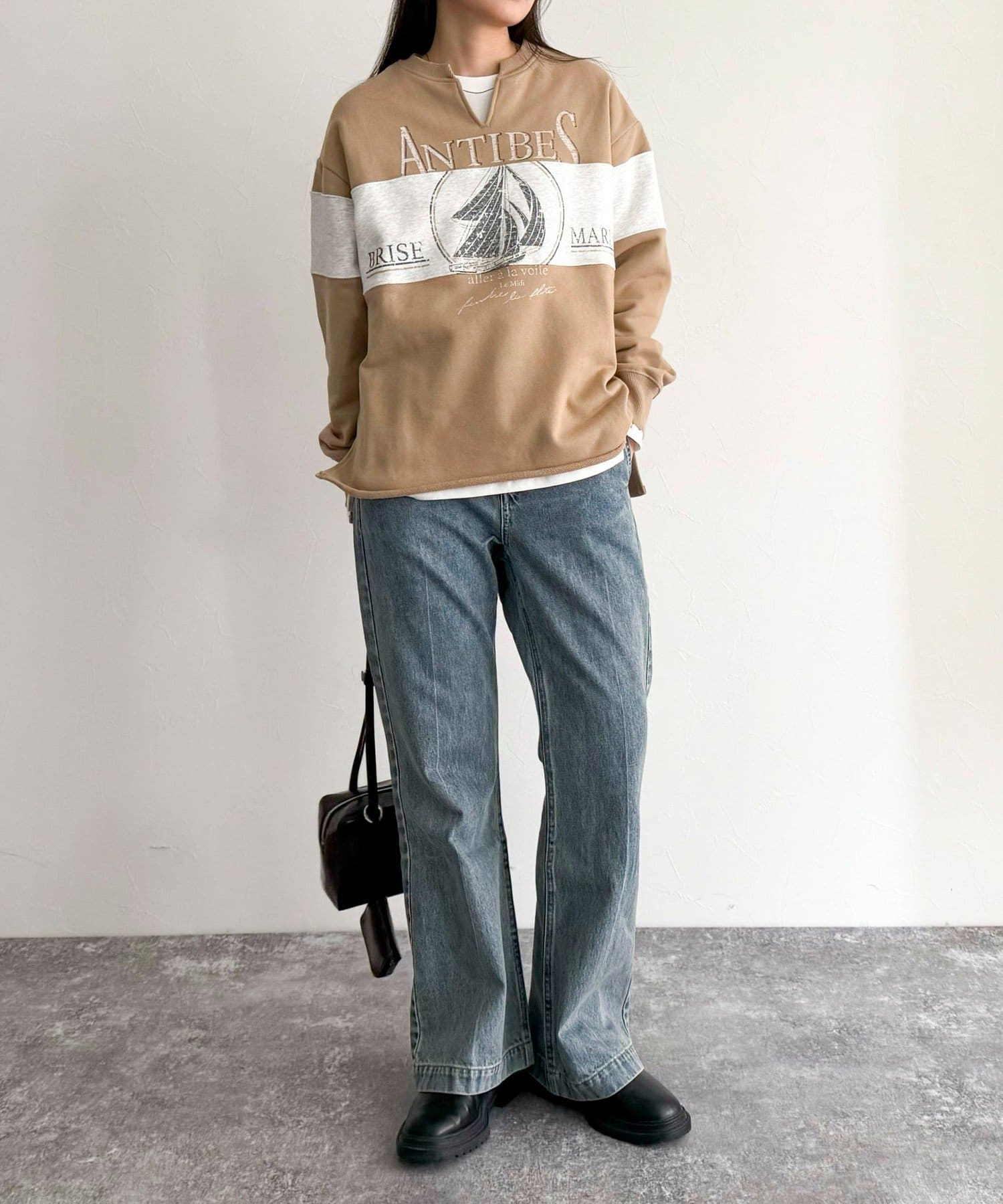 ・生地をつなぎ合わせたリメイク風のデザインがコーデの主役になるスウェットです