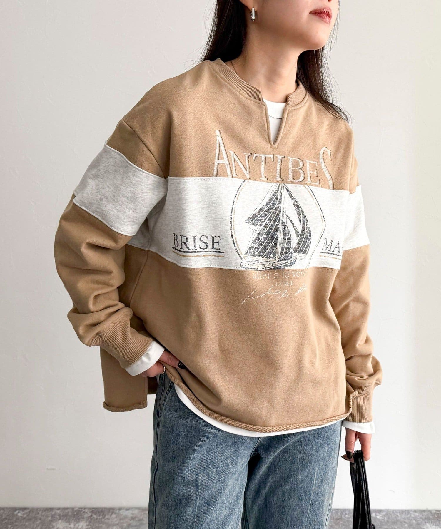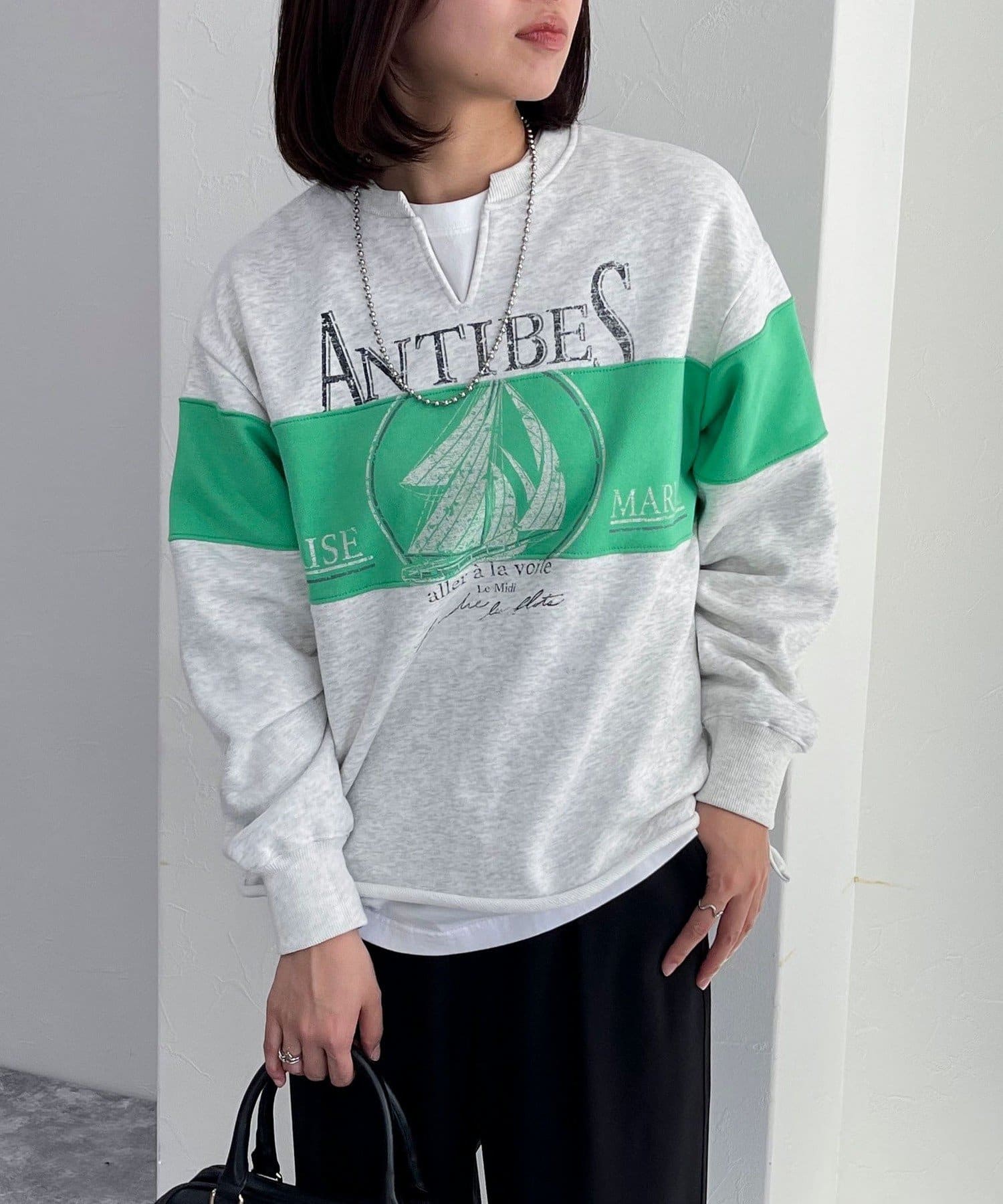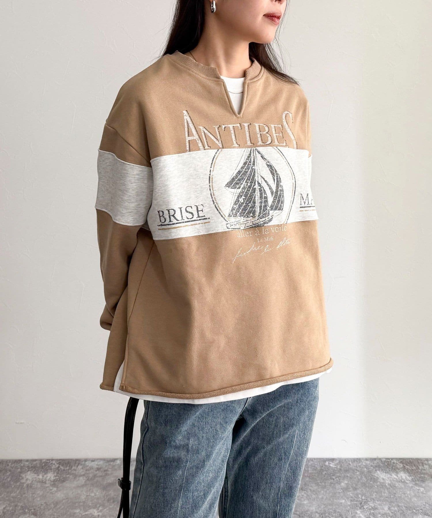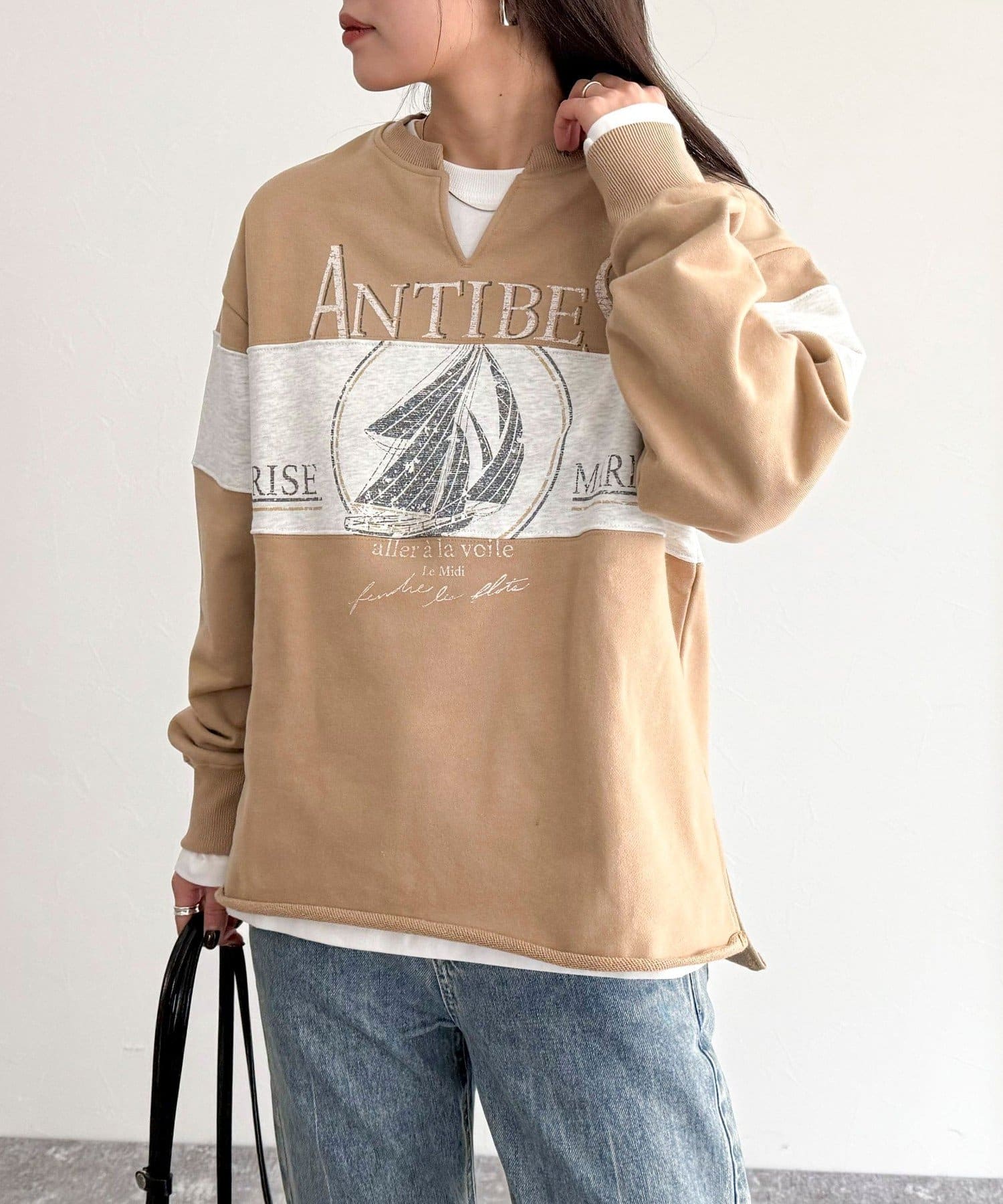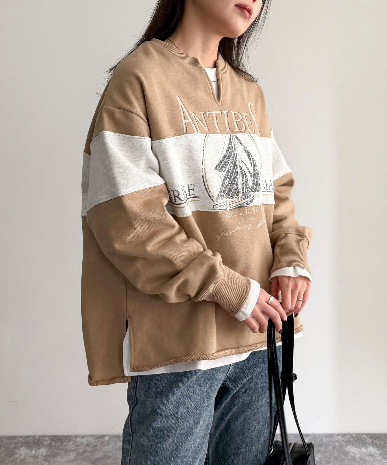 ・生地をつなぎ合わせたリメイク風のデザインがコーデの主役になるスウェットです