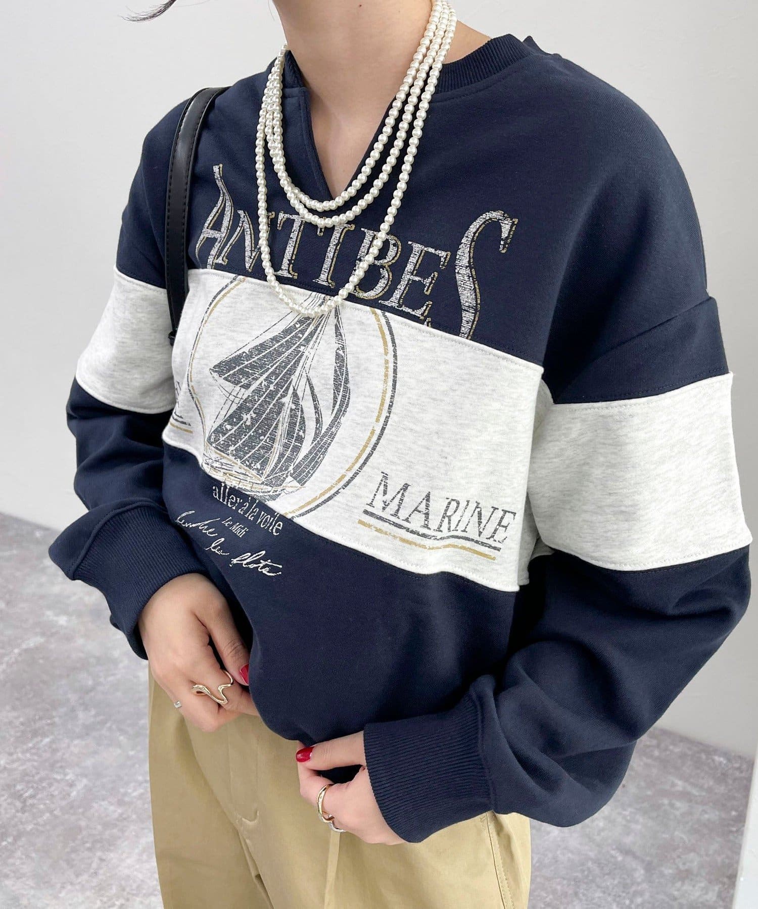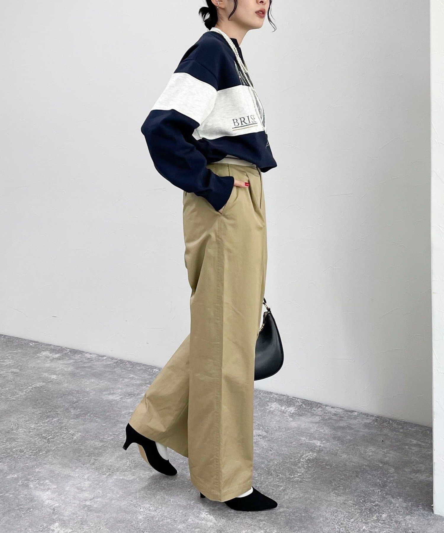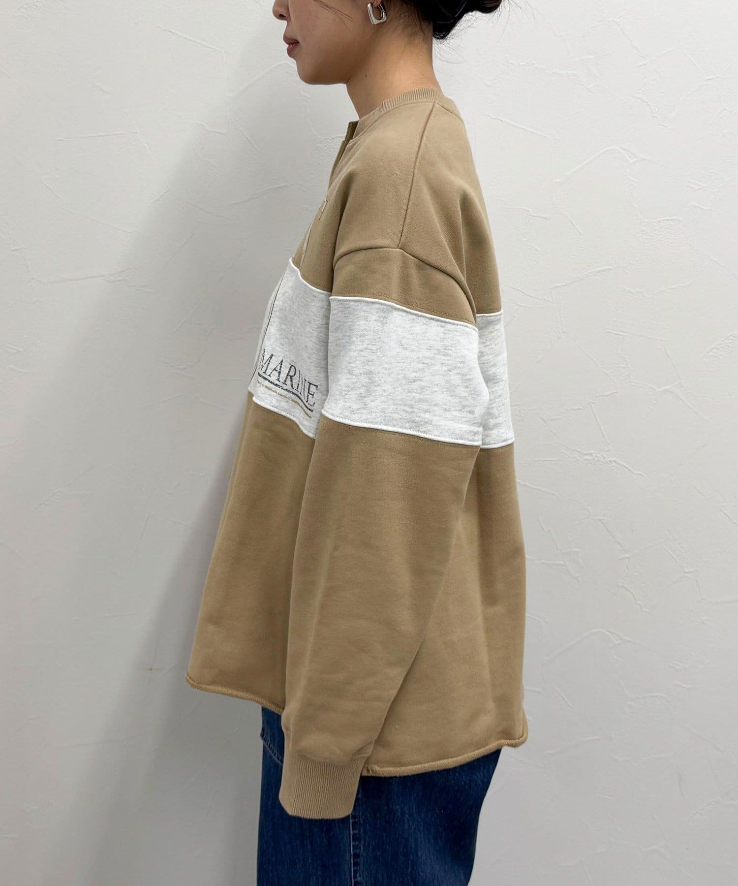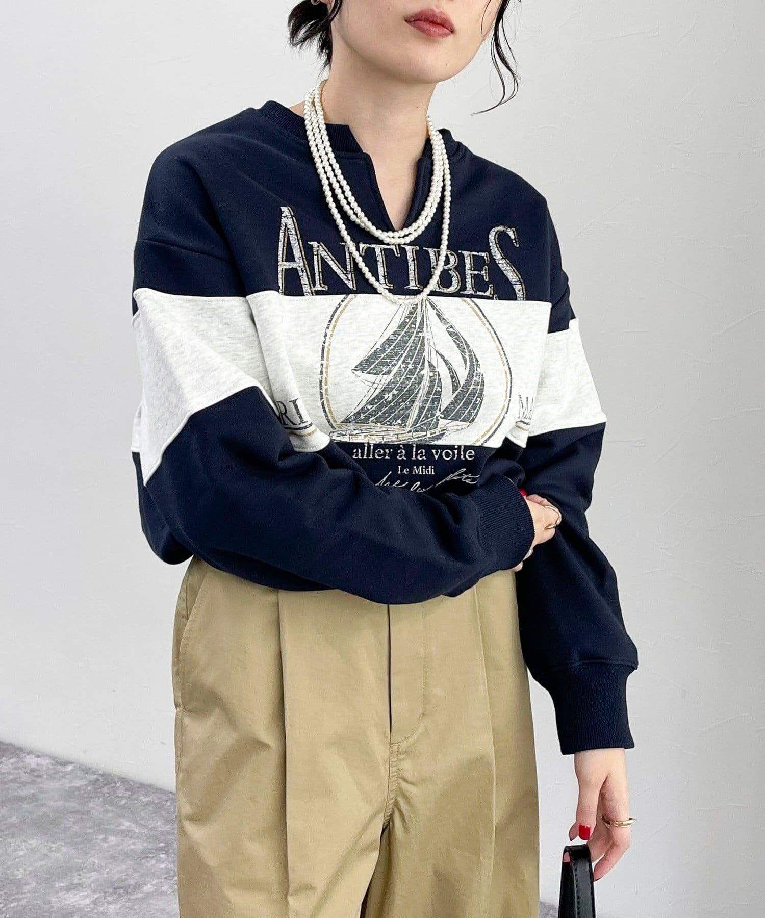 ・生地をつなぎ合わせたリメイク風のデザインがコーデの主役になるスウェットです