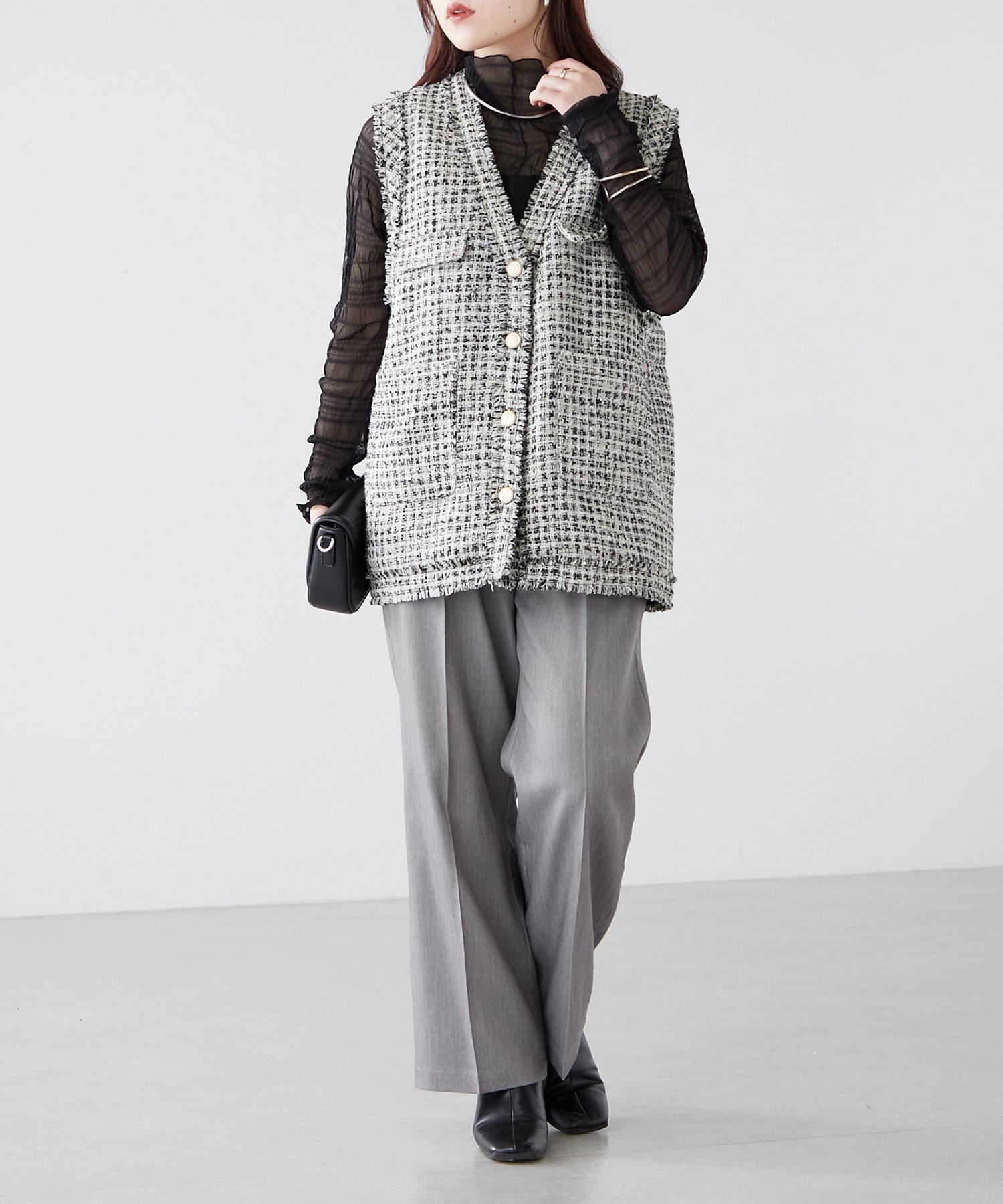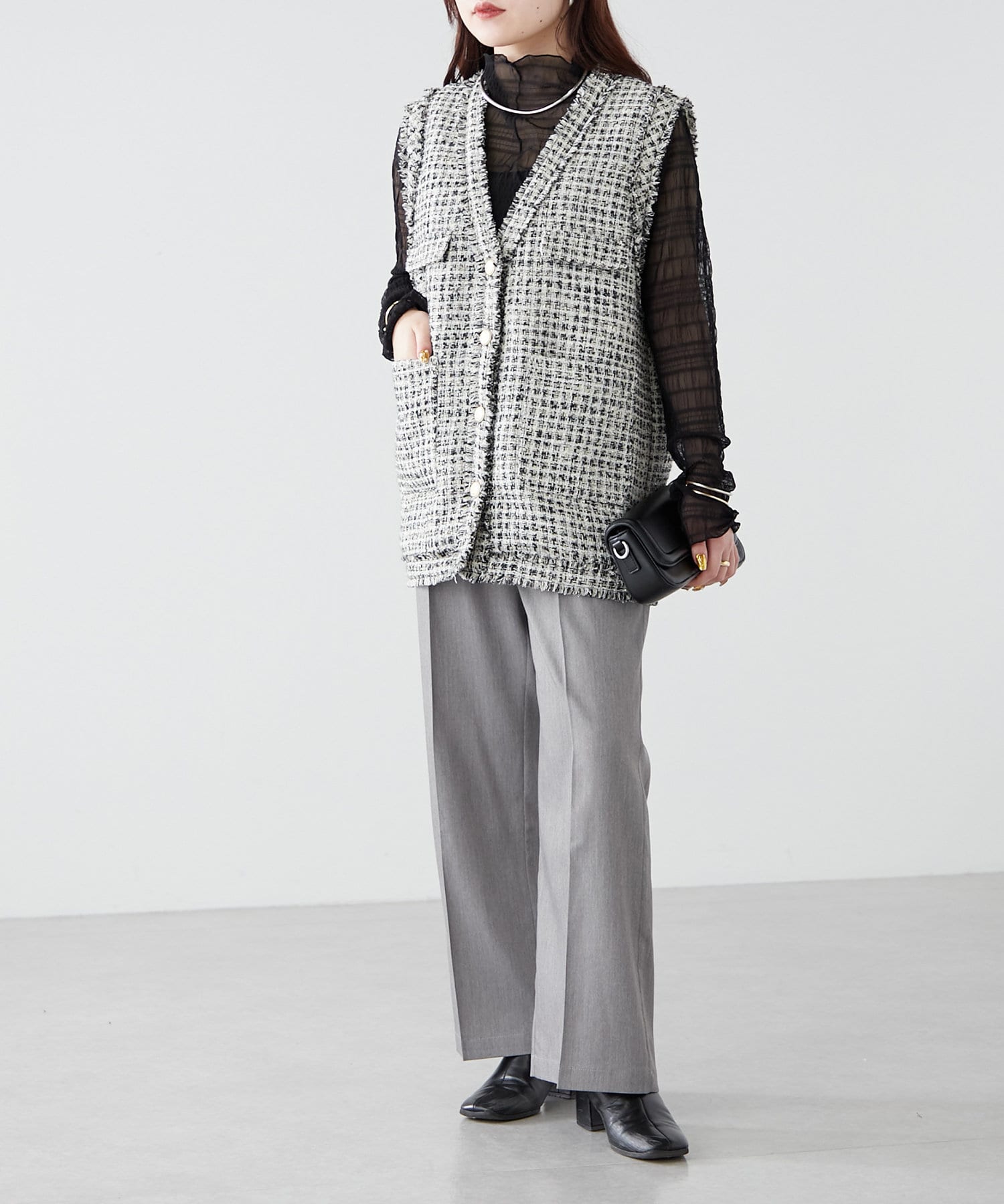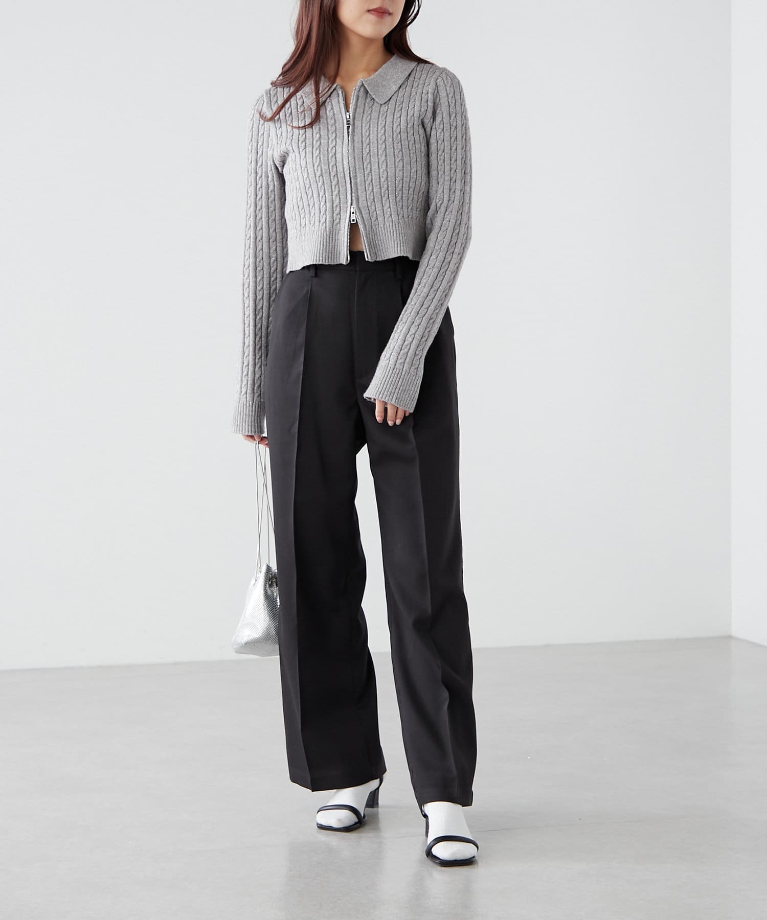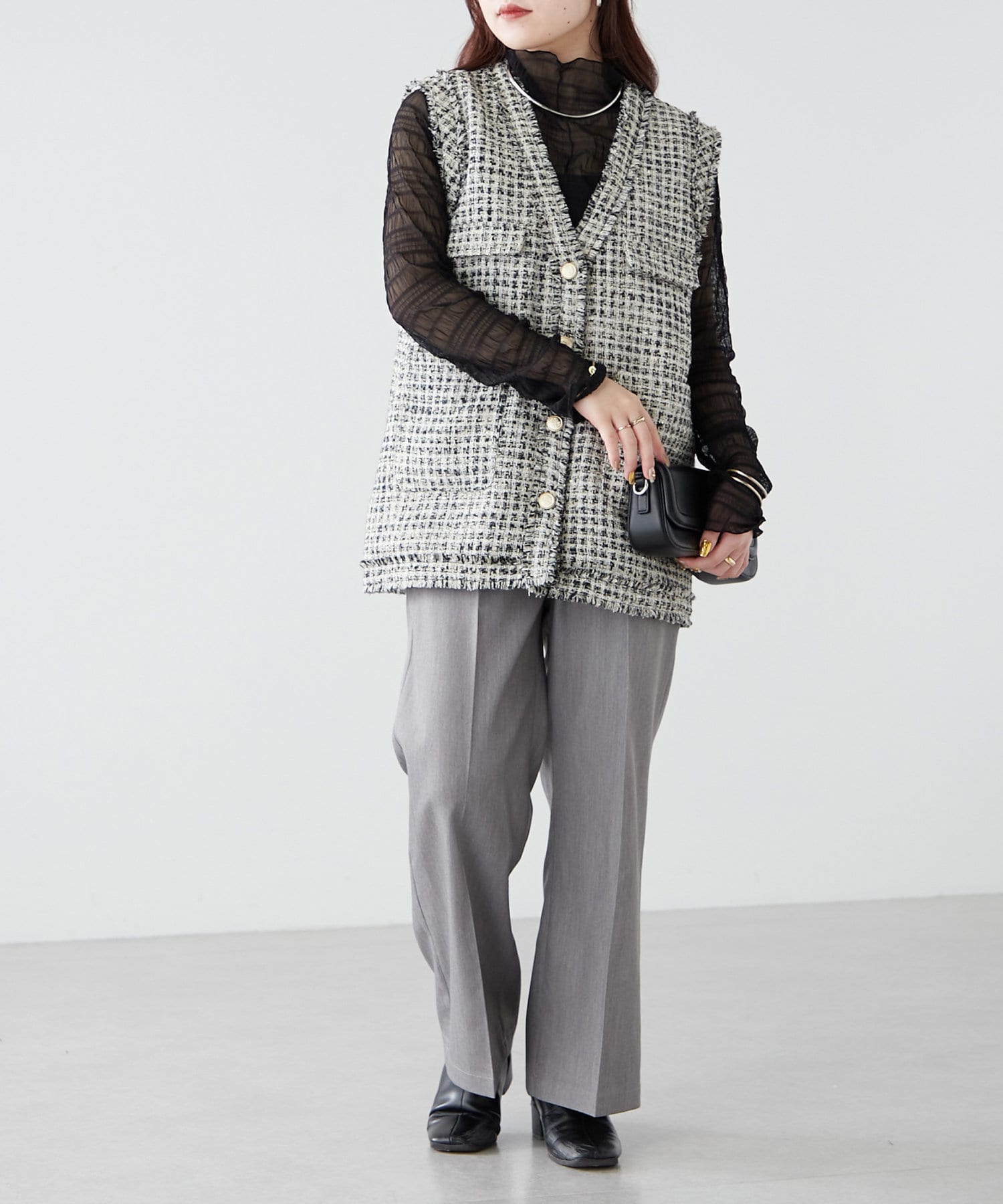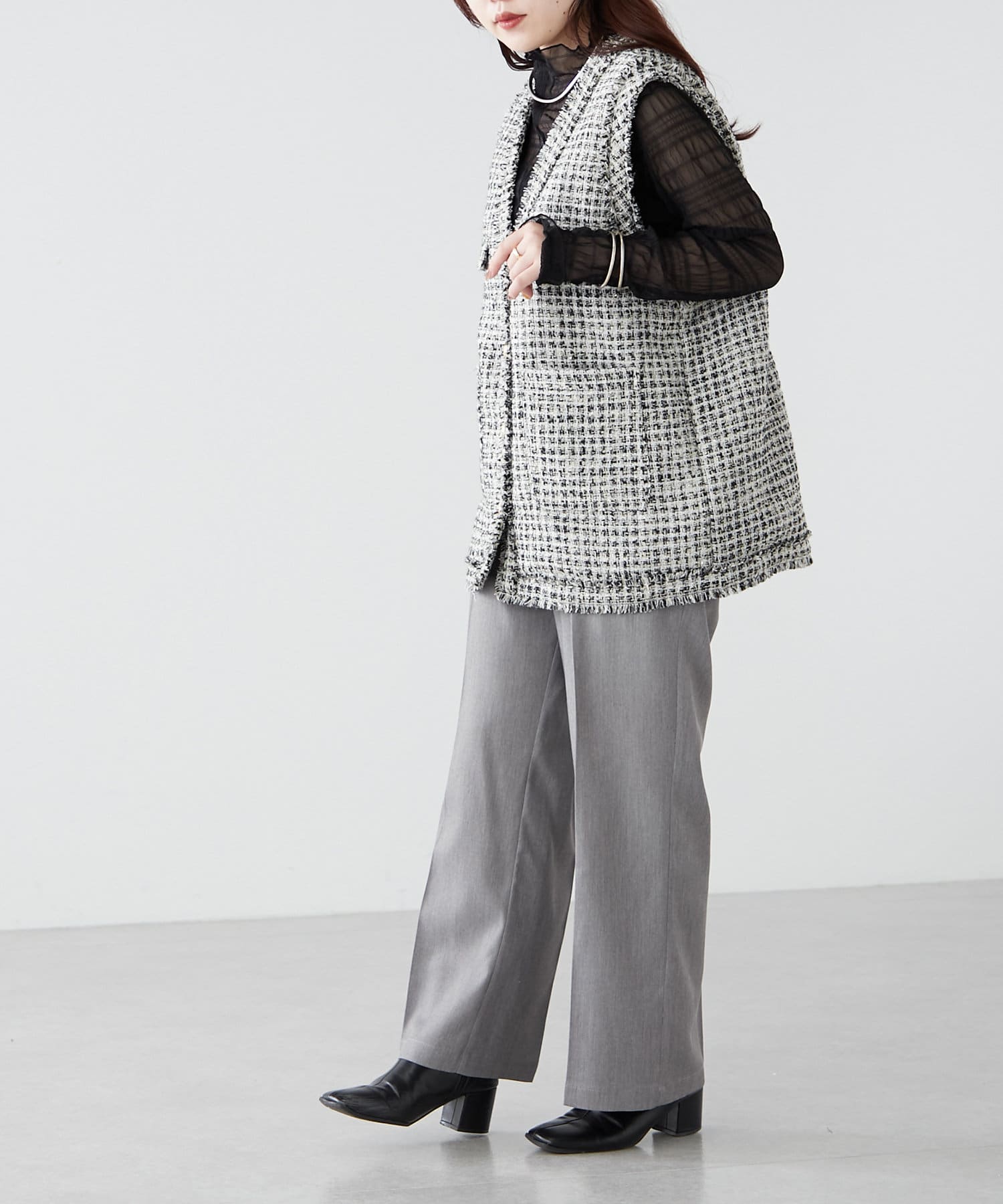 ・シャツやリブニットなどきれいめなアイテムと合わせたオフィス系コーデから、スウェットやオーバーニットのカジュアルコーデまで、幅広いテイストに対応