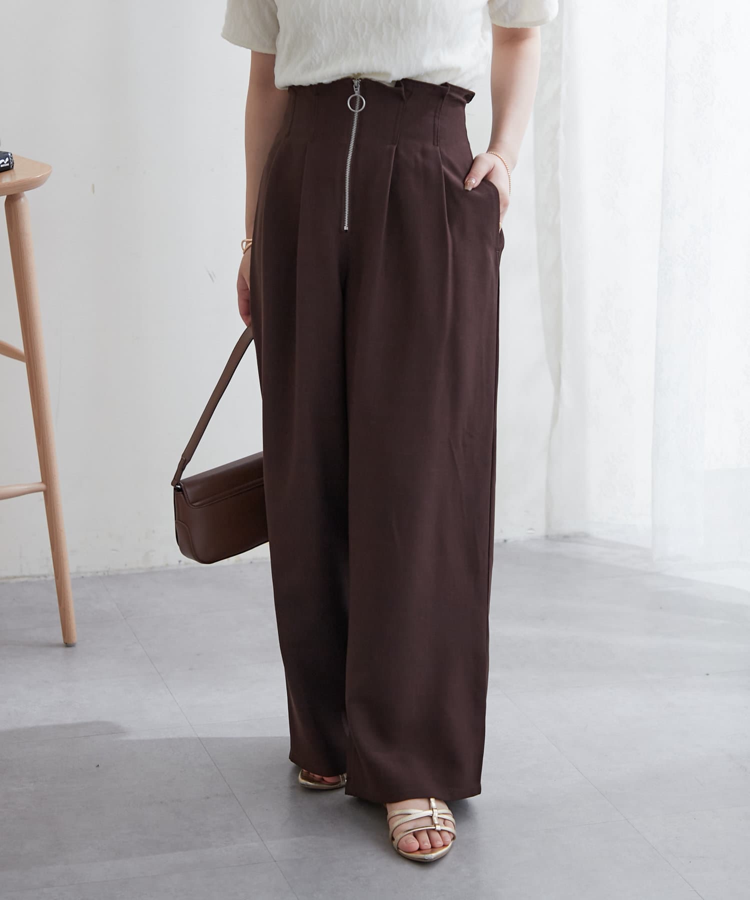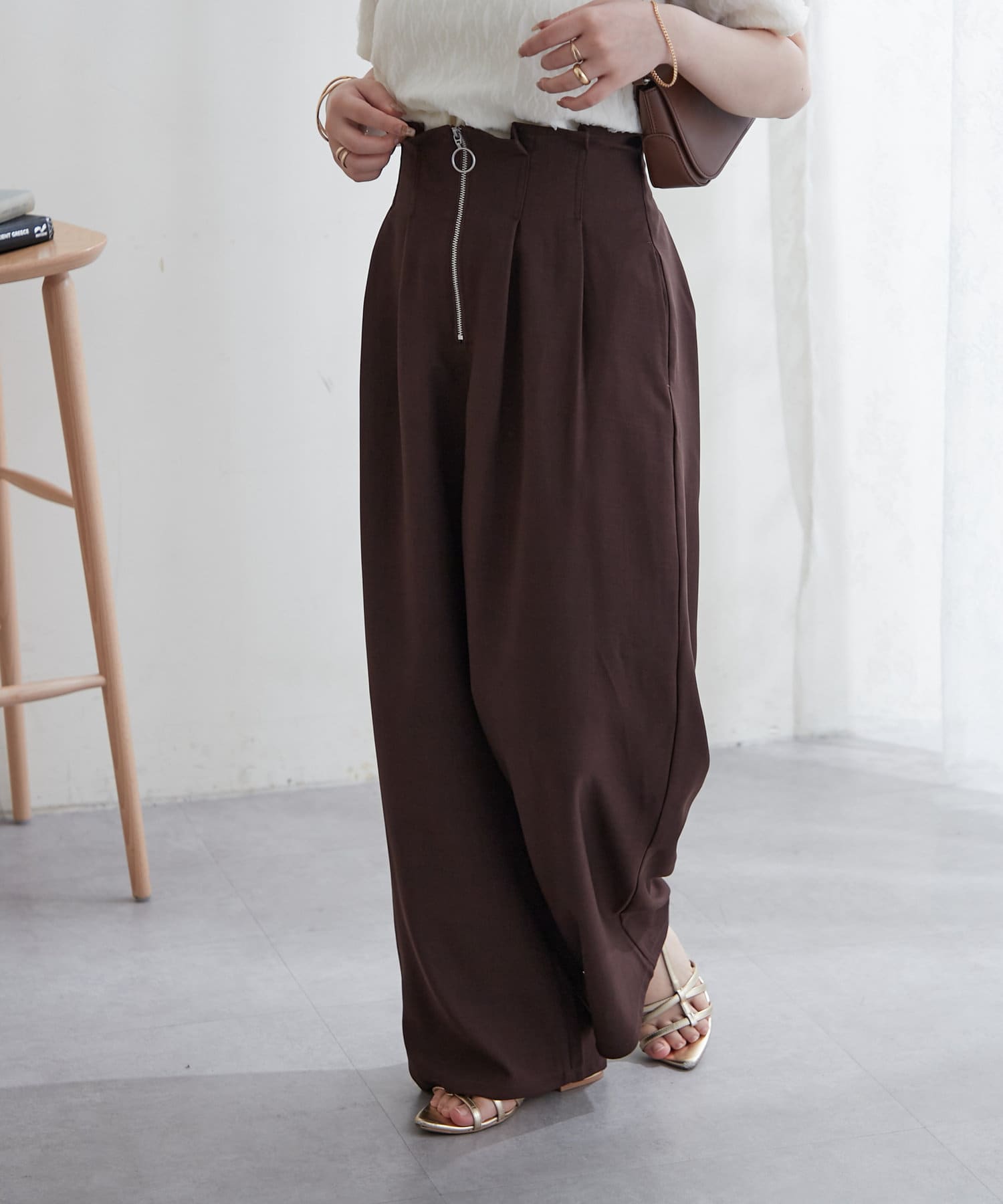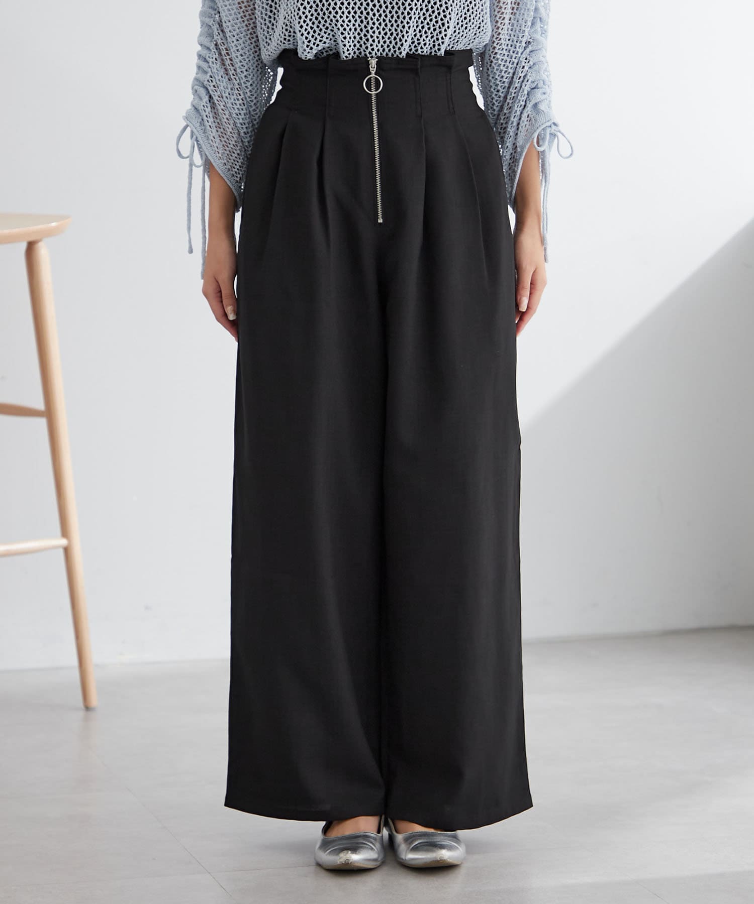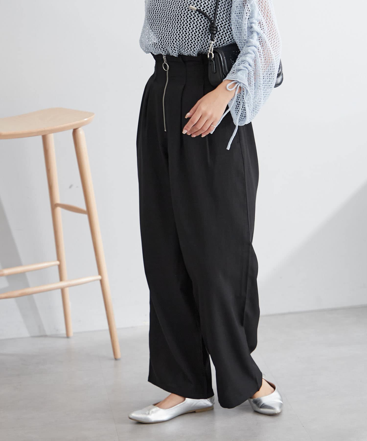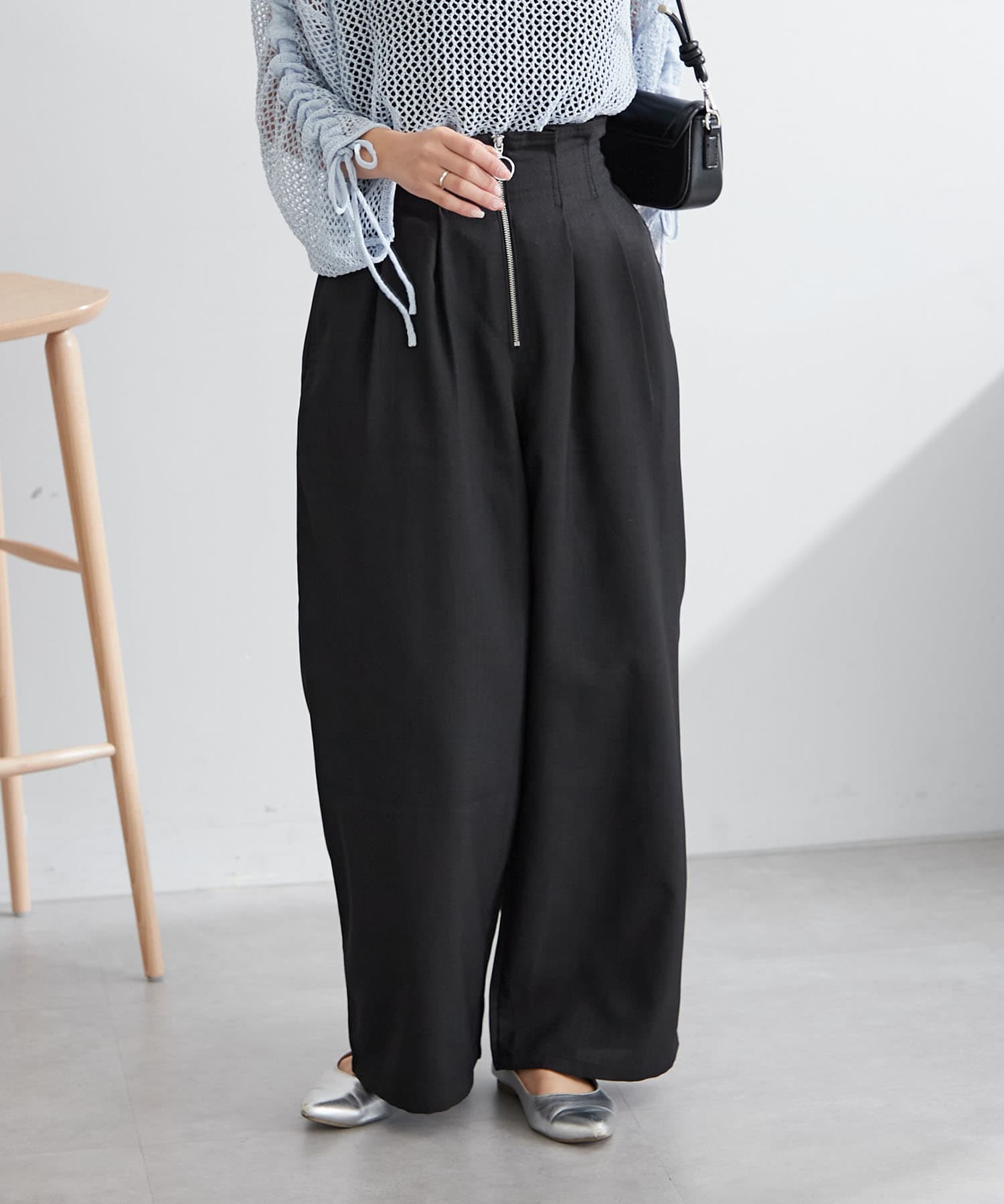 ・フロントジップがすっきりとした印象になるワイドパンツ