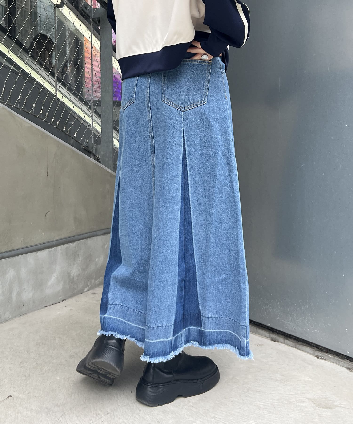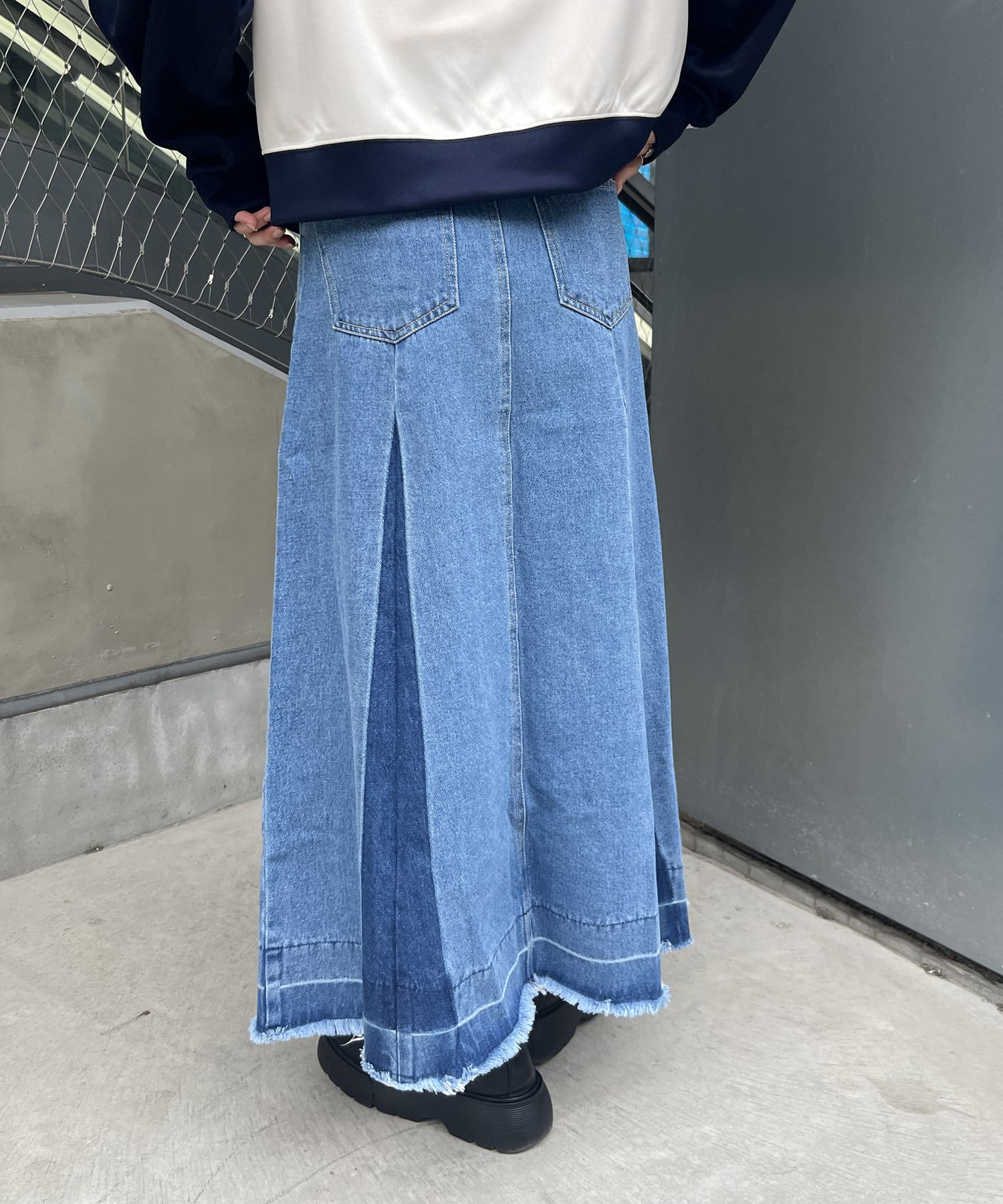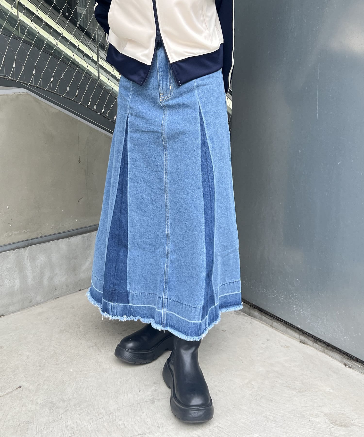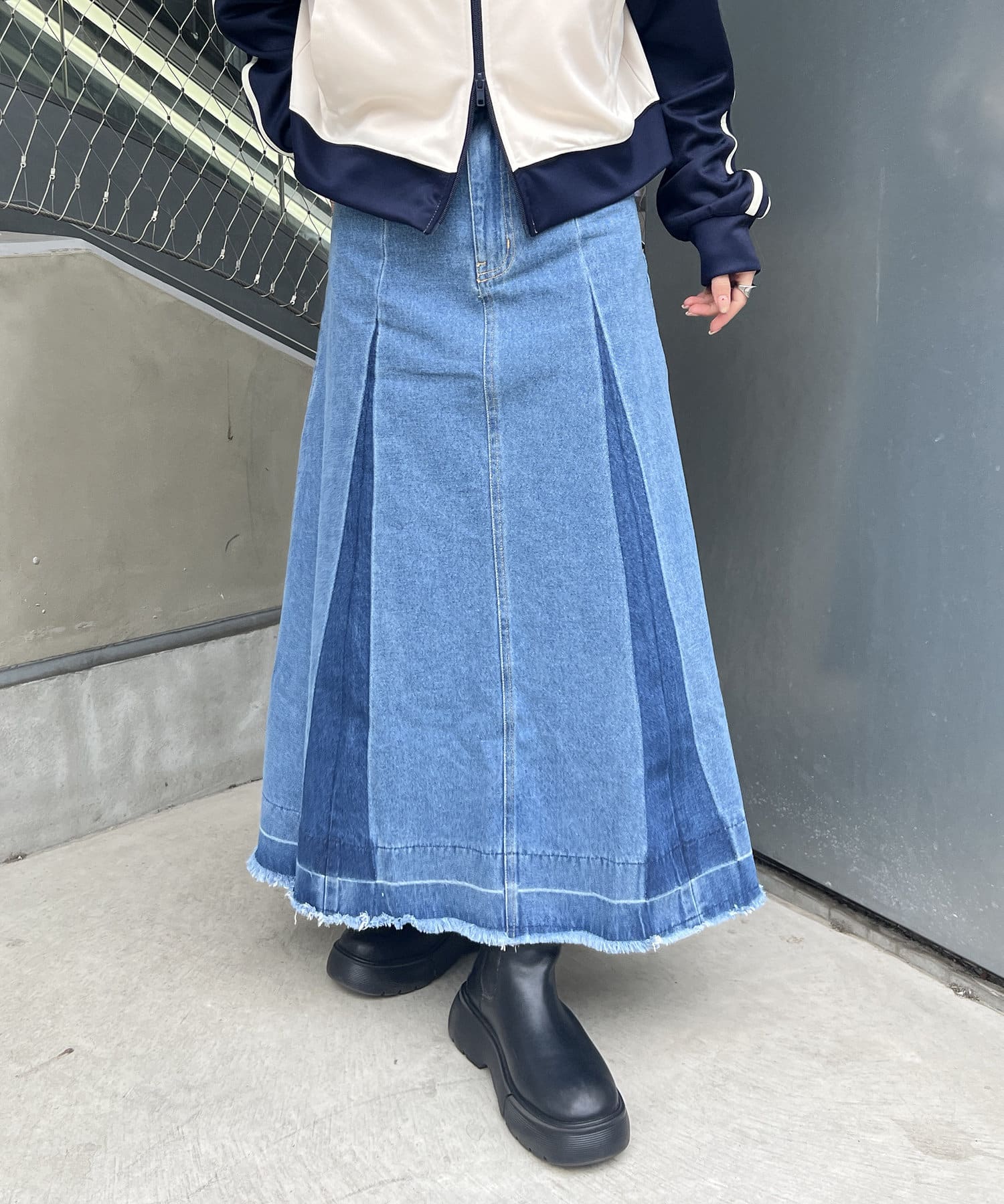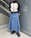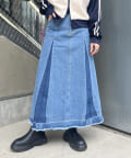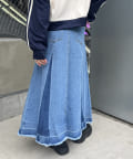 ヴィンテージモードなグラデーションがストリートな印象を与えるロングデニムスカート