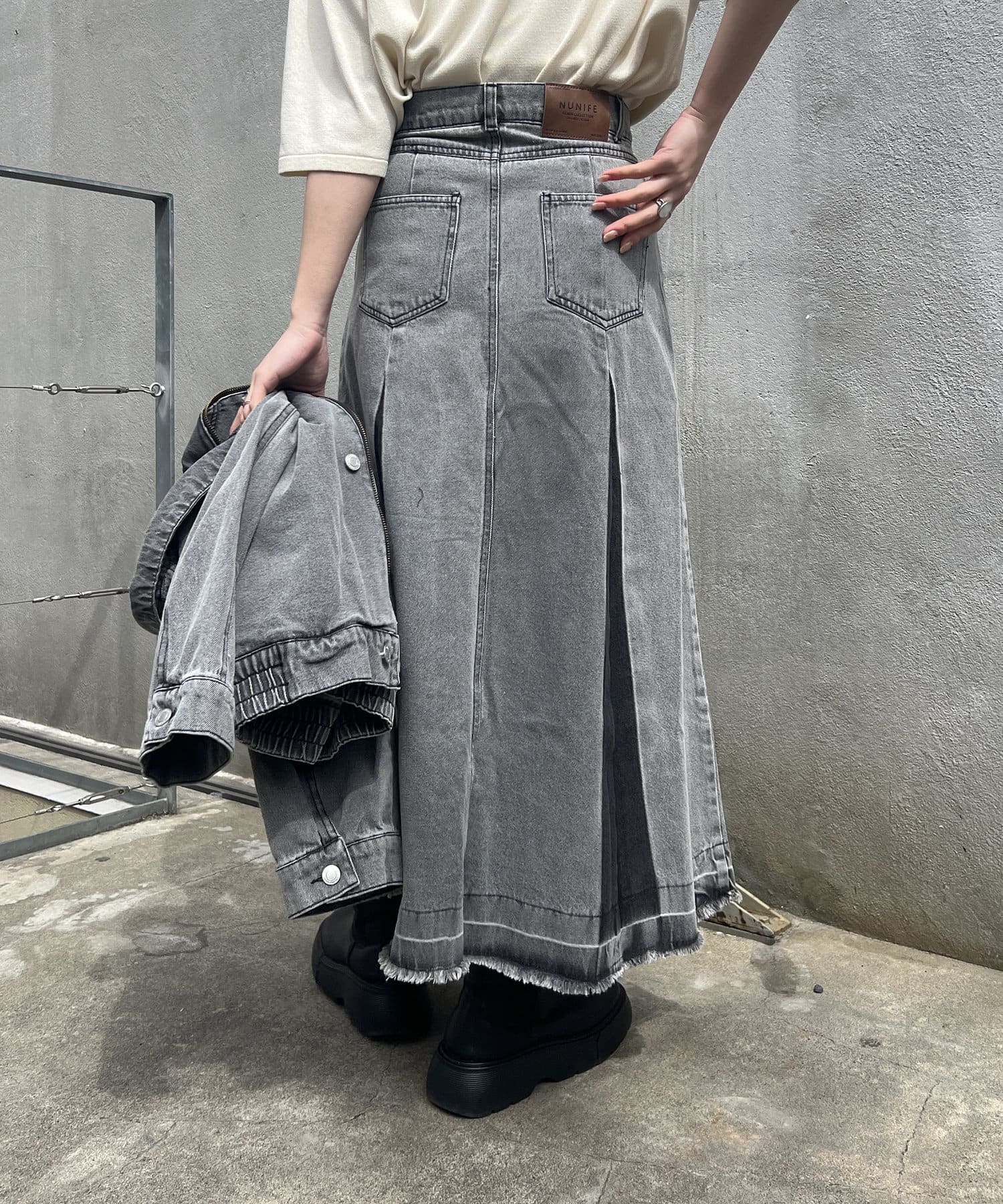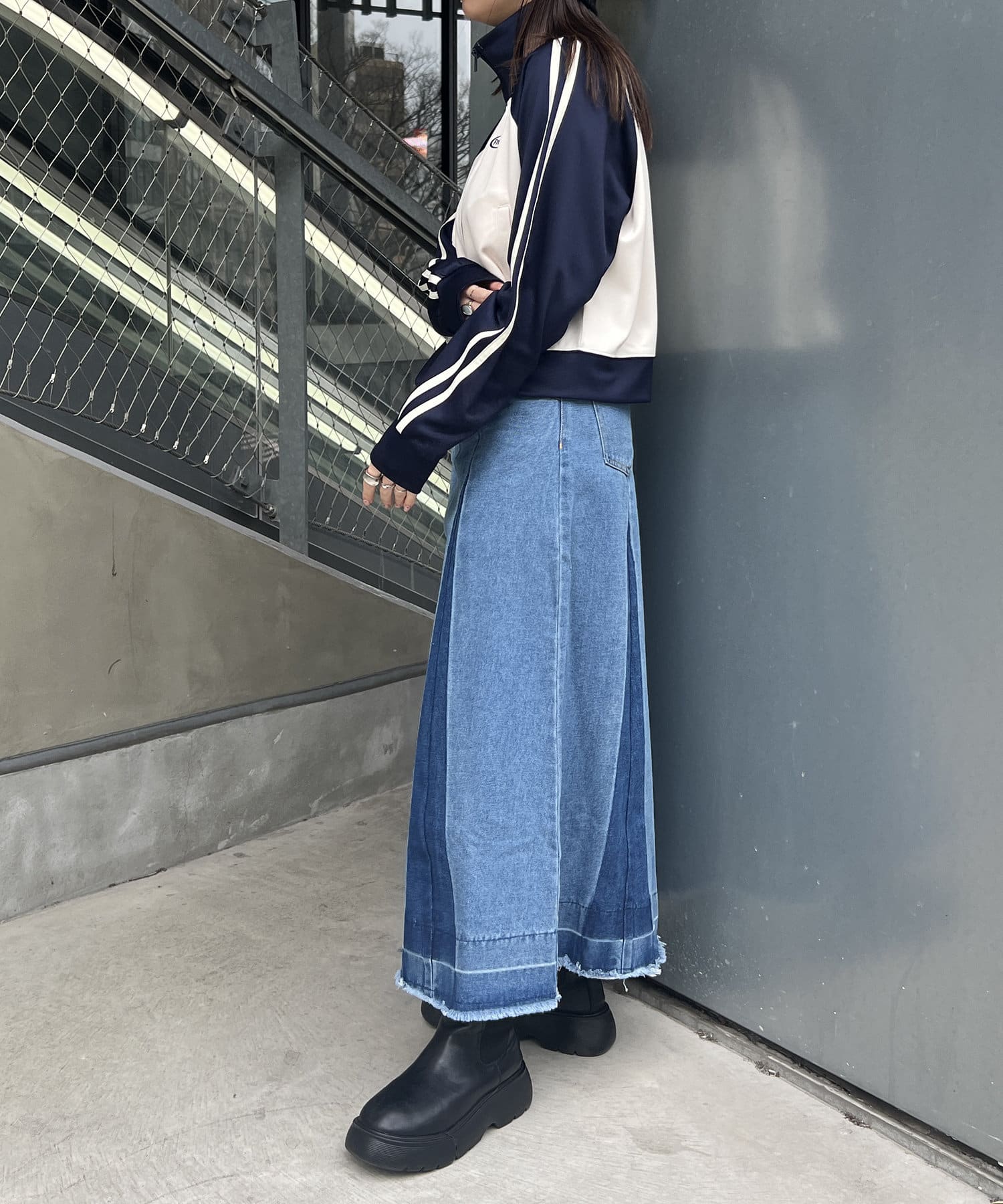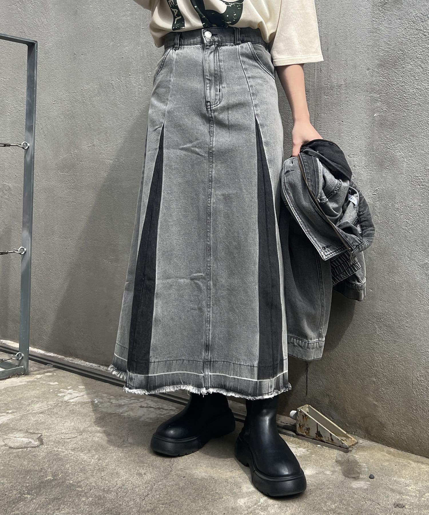 ヴィンテージモードなグラデーションがストリートな印象を与えるロングデニムスカート