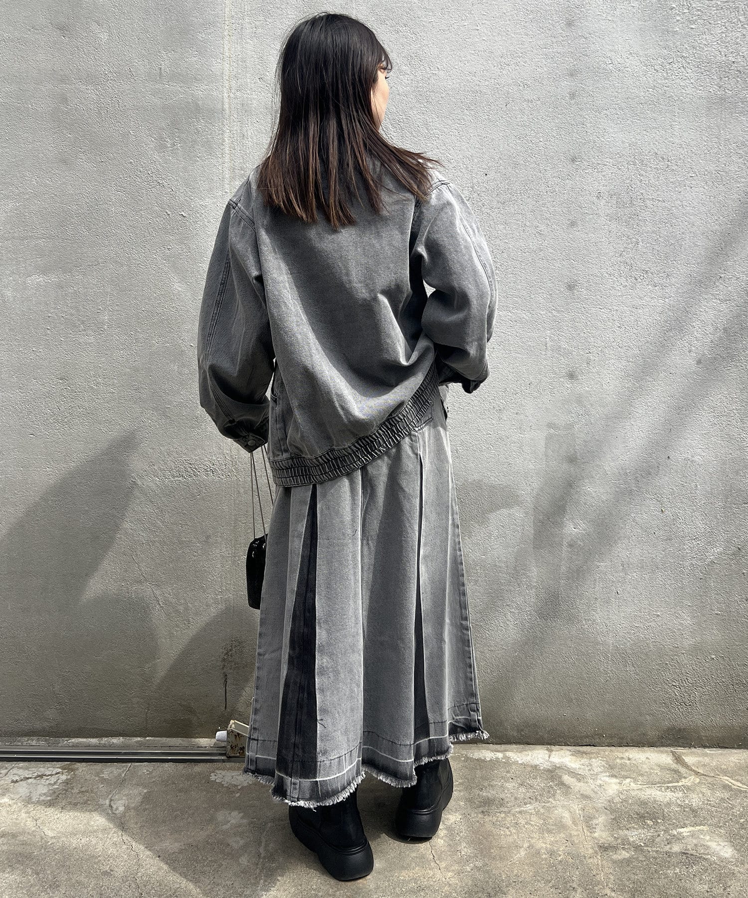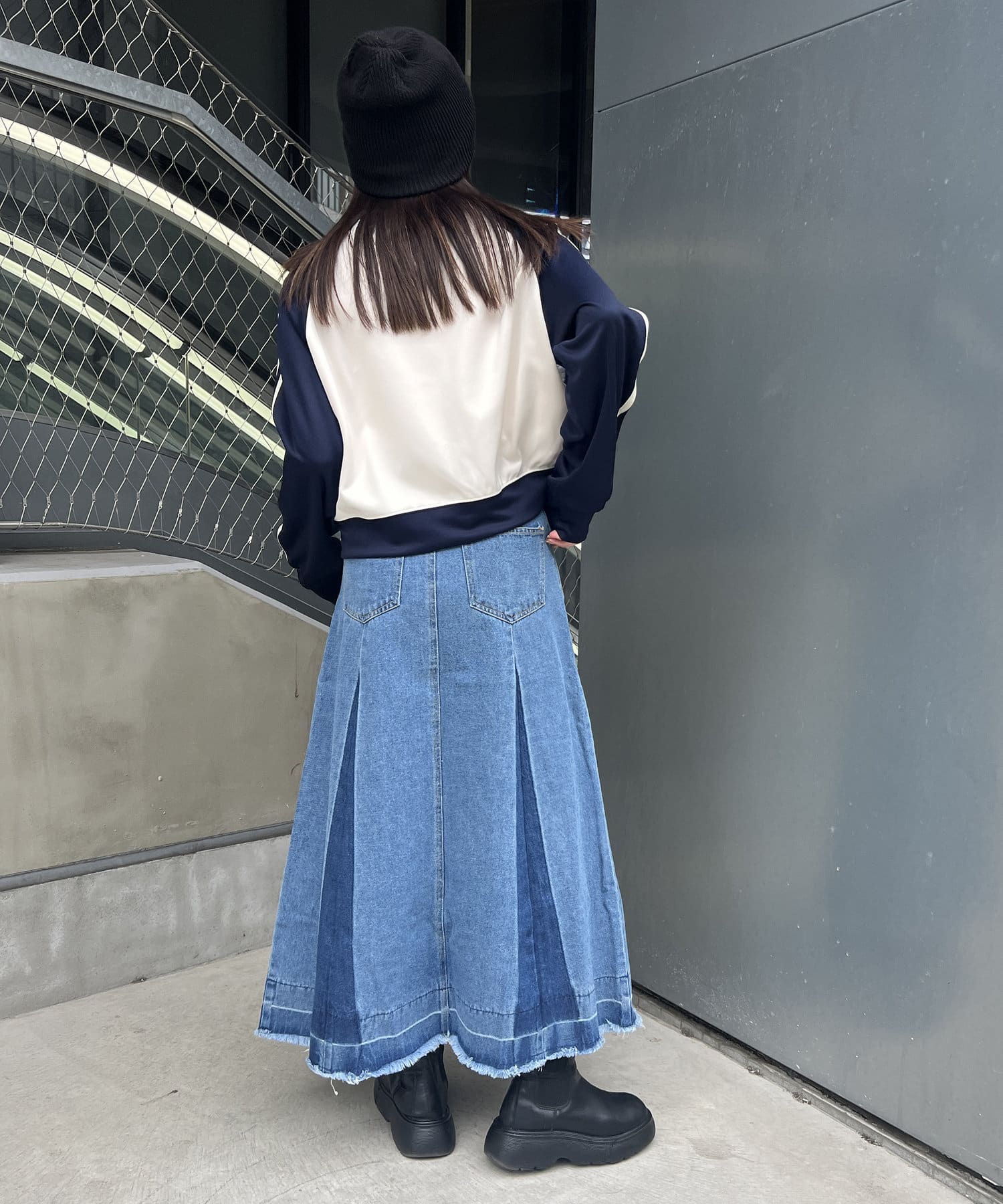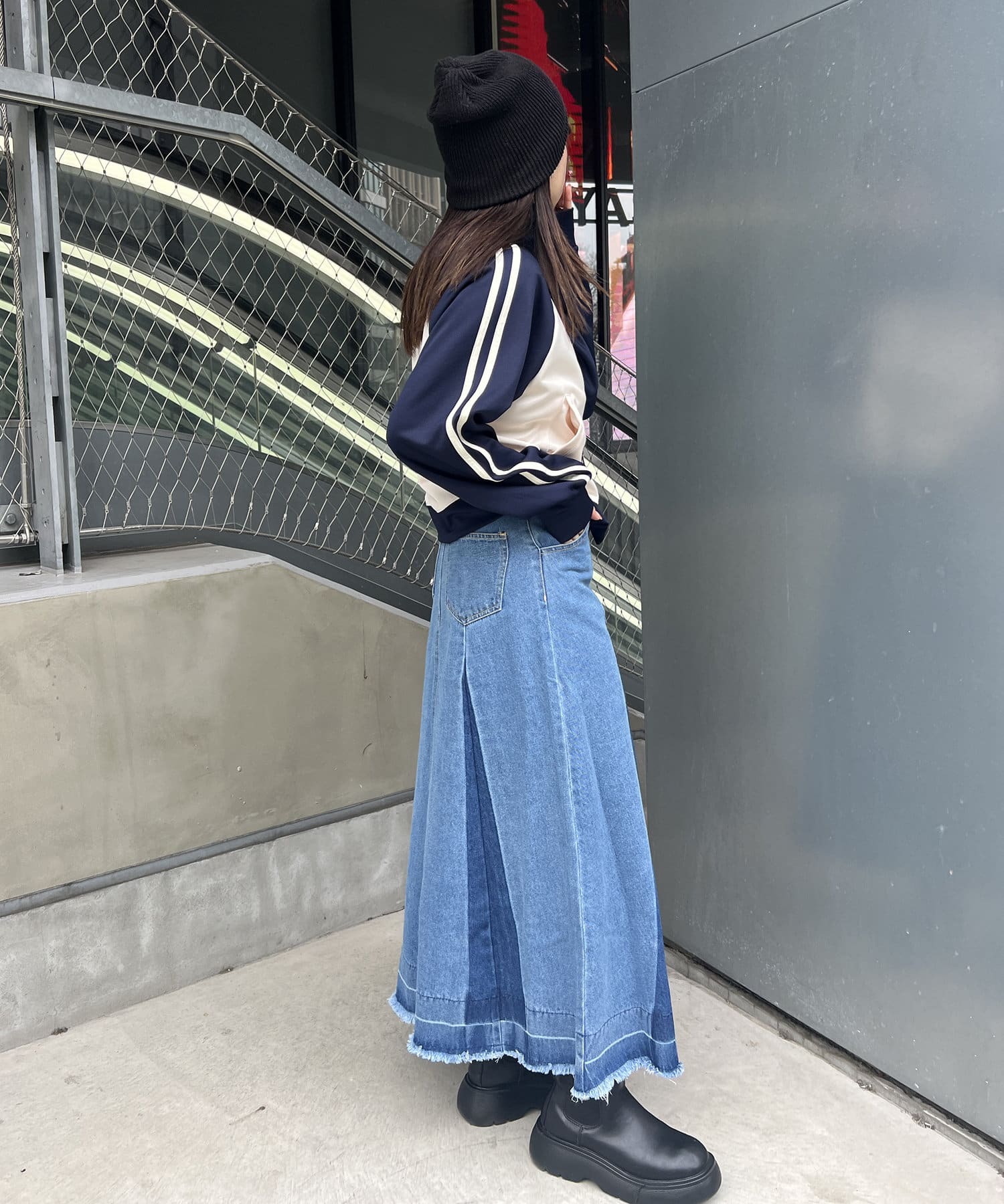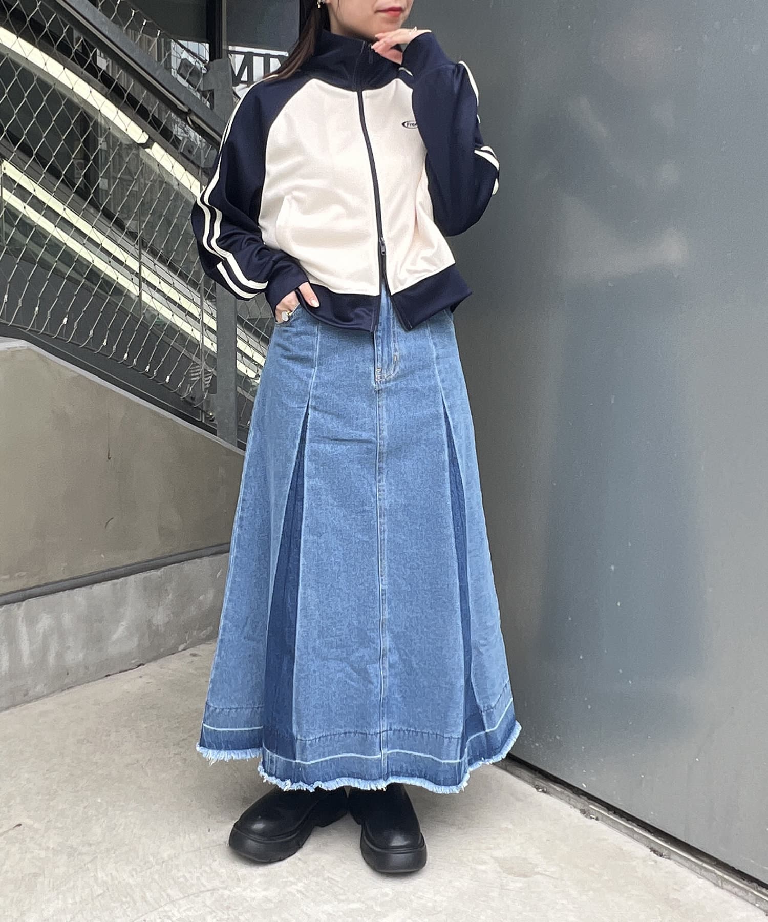 ヴィンテージモードなグラデーションがストリートな印象を与えるロングデニムスカート