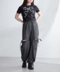 ・キャップとボリューム感のあるボトムスで韓国風スタイルに。