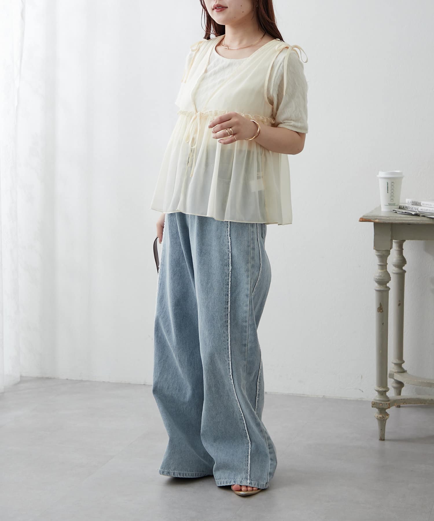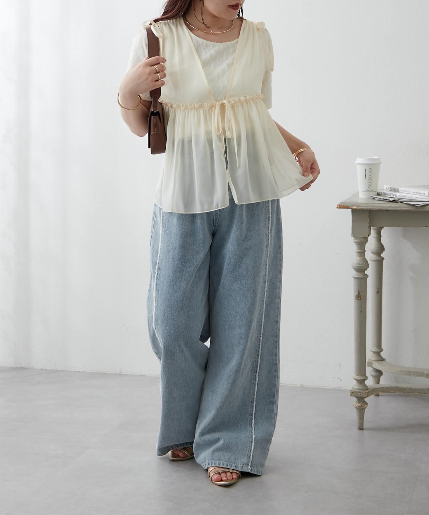 ・暑い季節にはキャミやタンクの上から重ねてさわやかな印象のスタイリングに