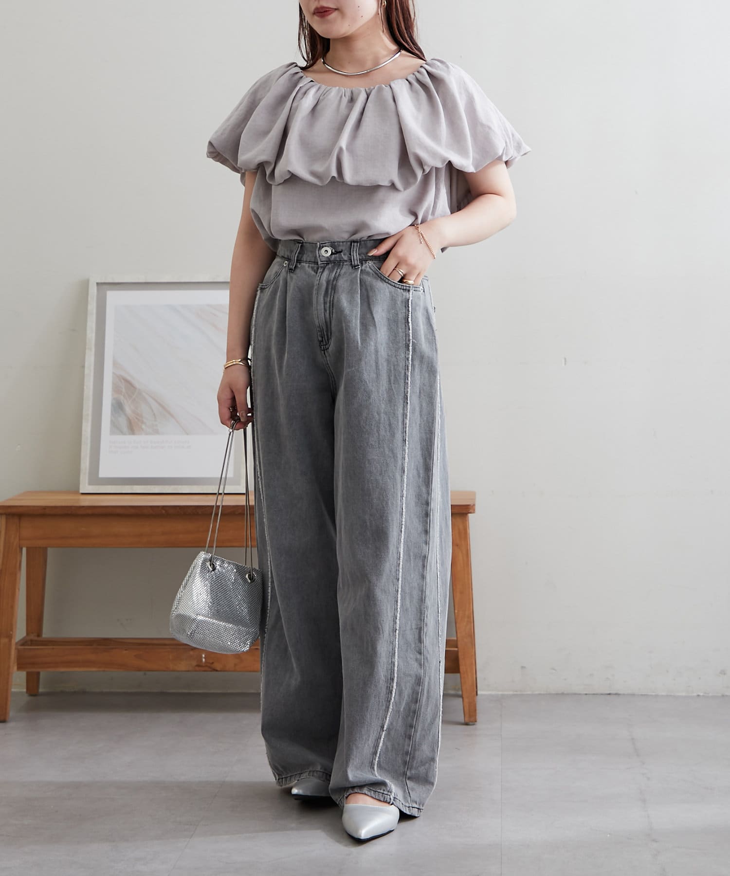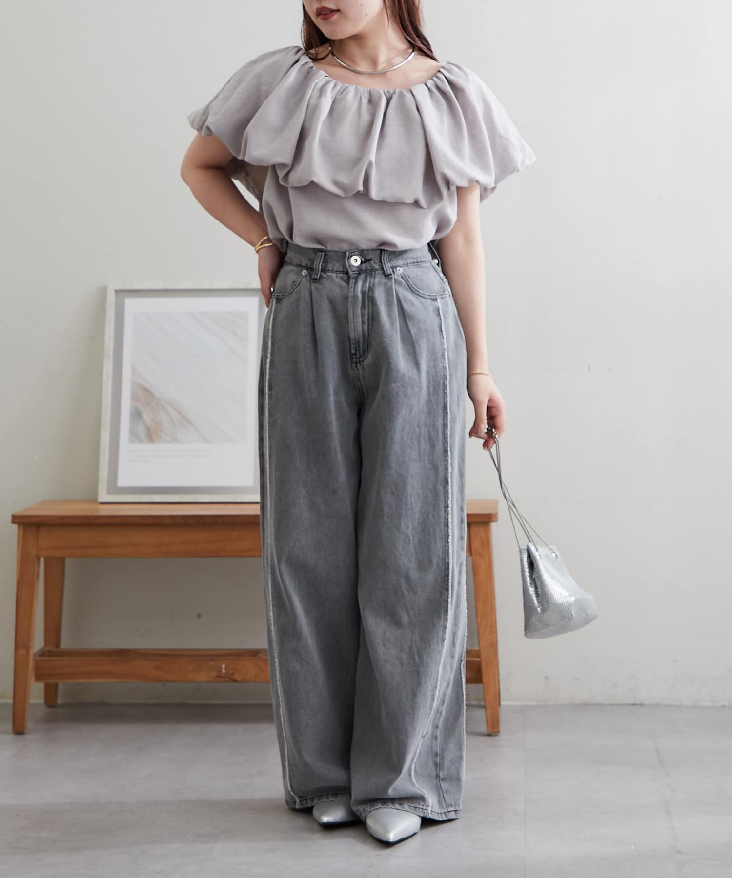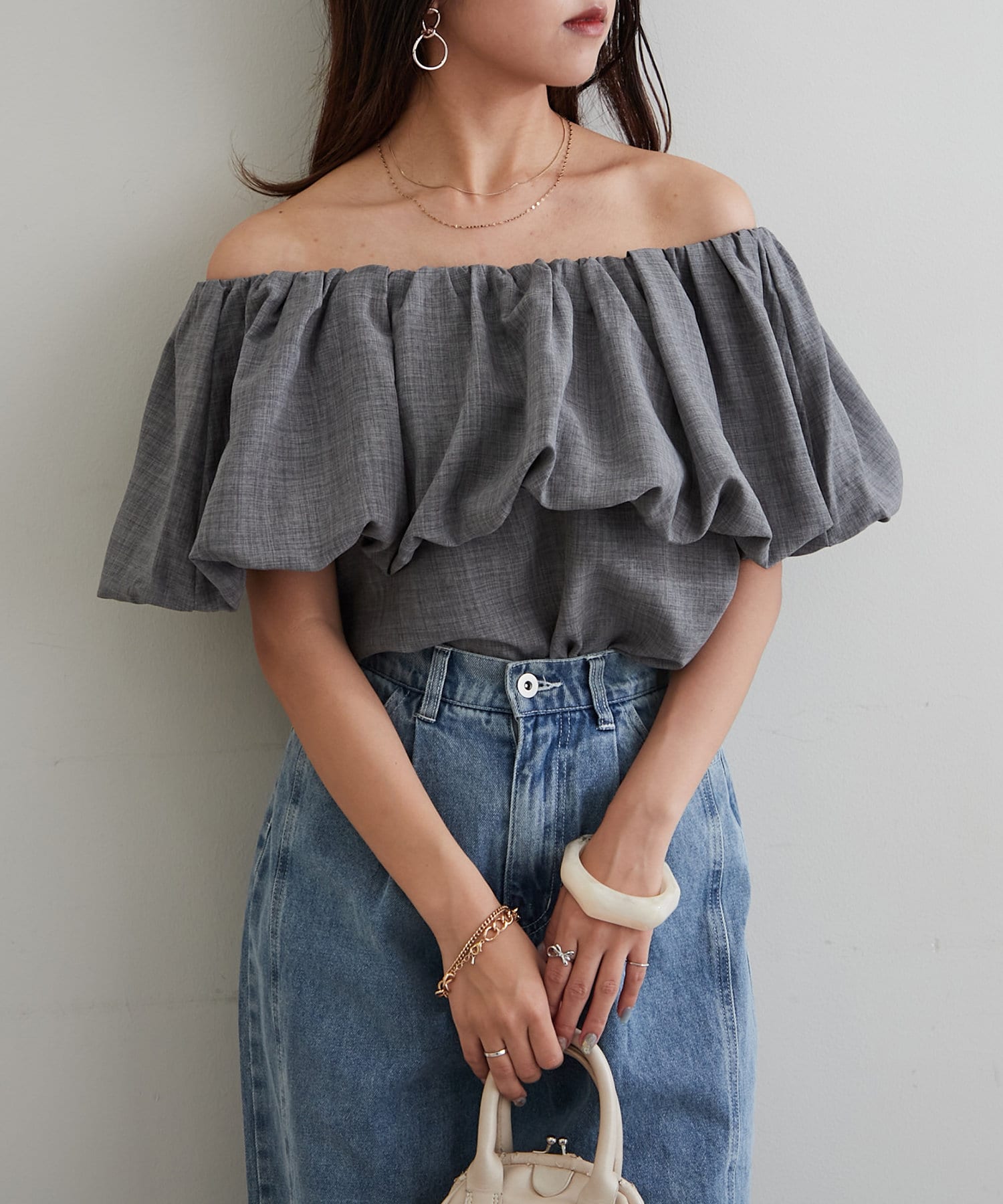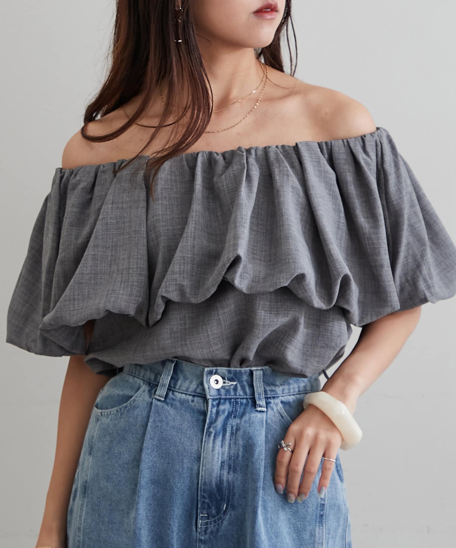 ・胸元にボリュームを持たせたバルーンデザインのブラウス