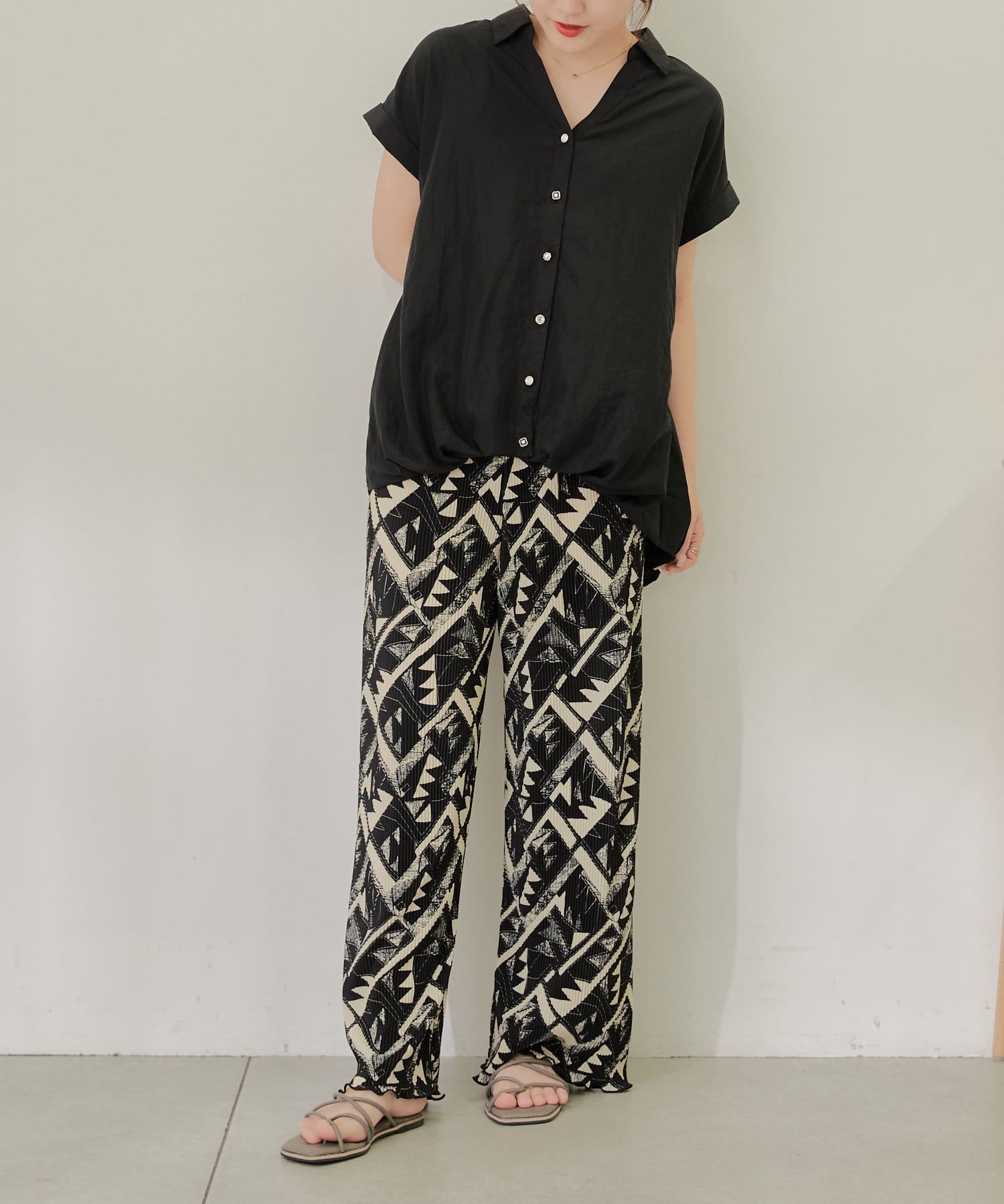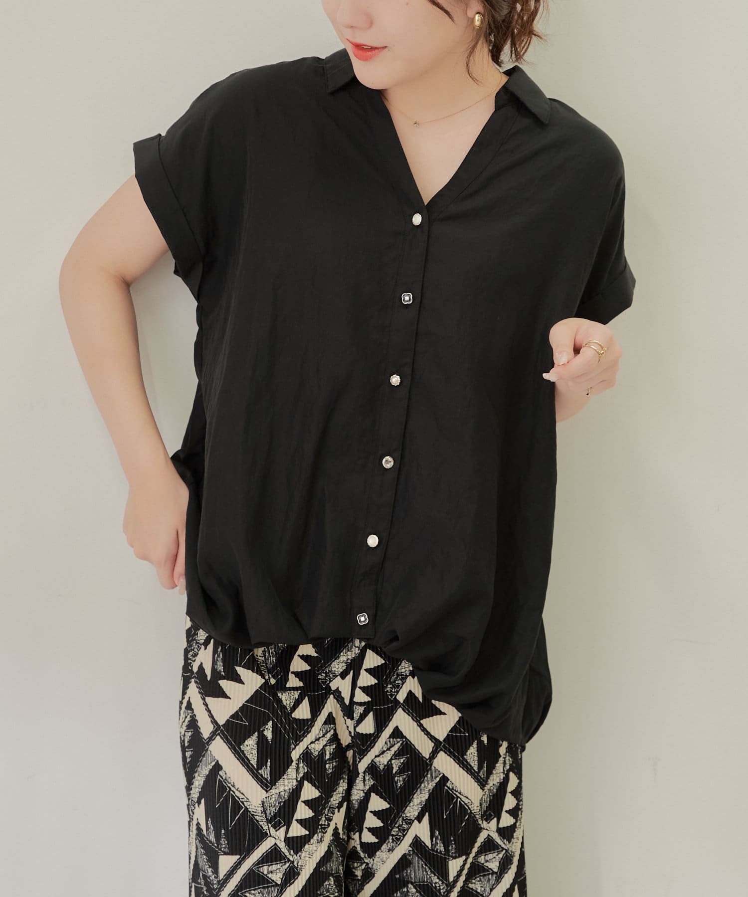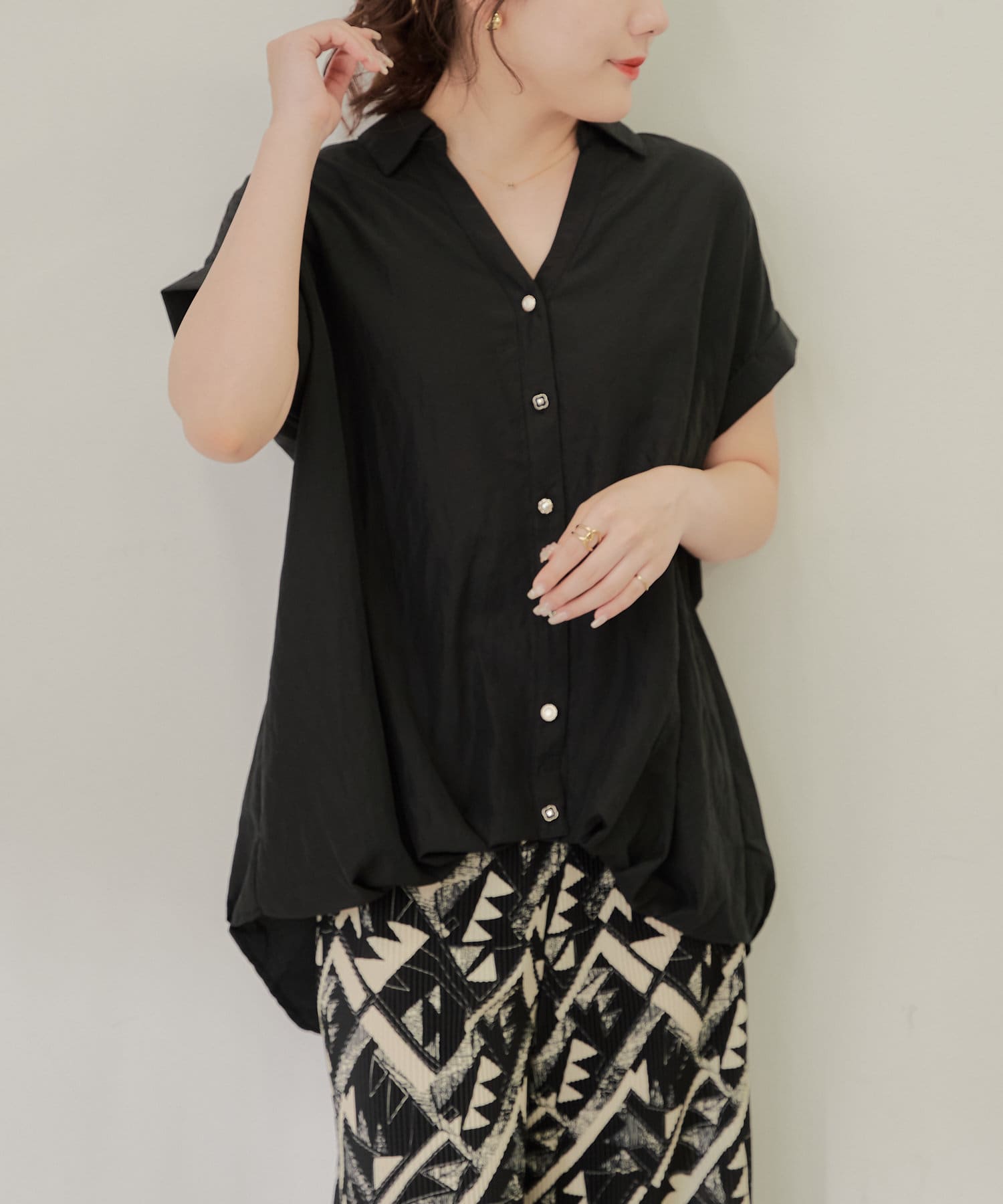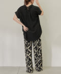 ・シンプルなシルエットなので柄物やボリュームのあるボトムとも相性良く決まります