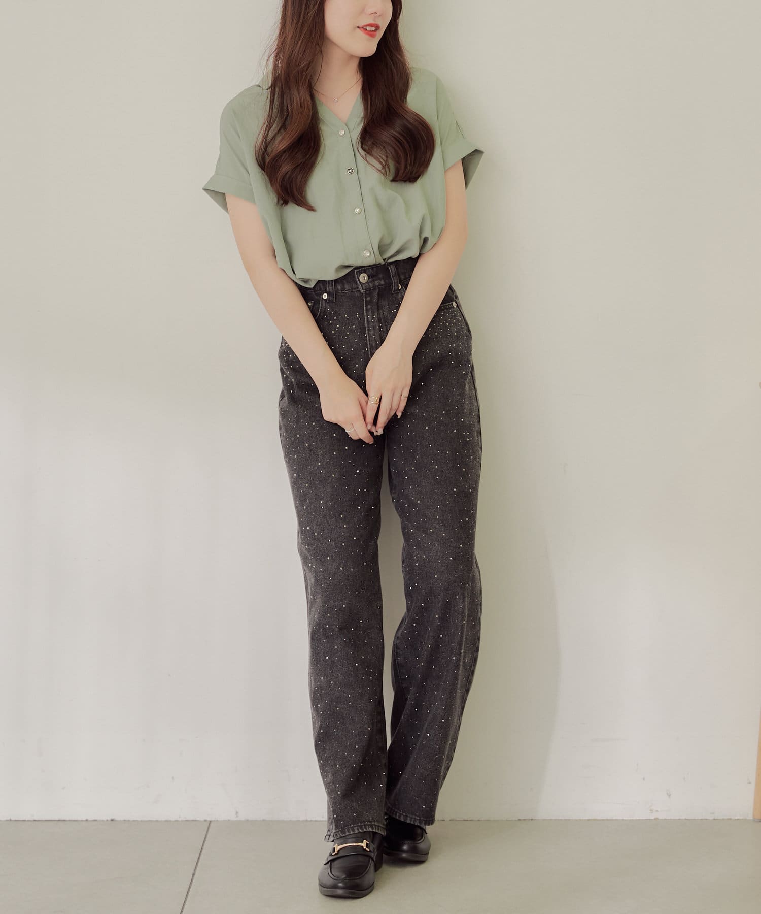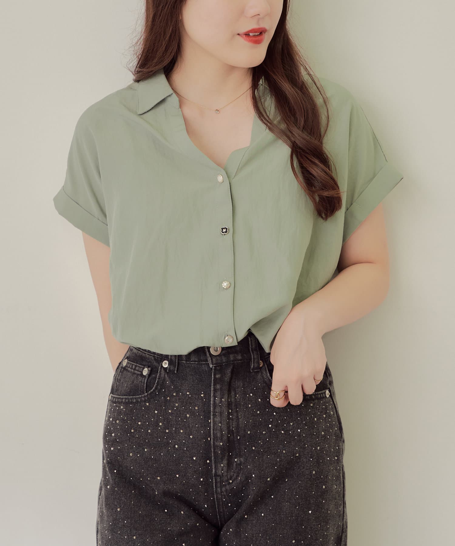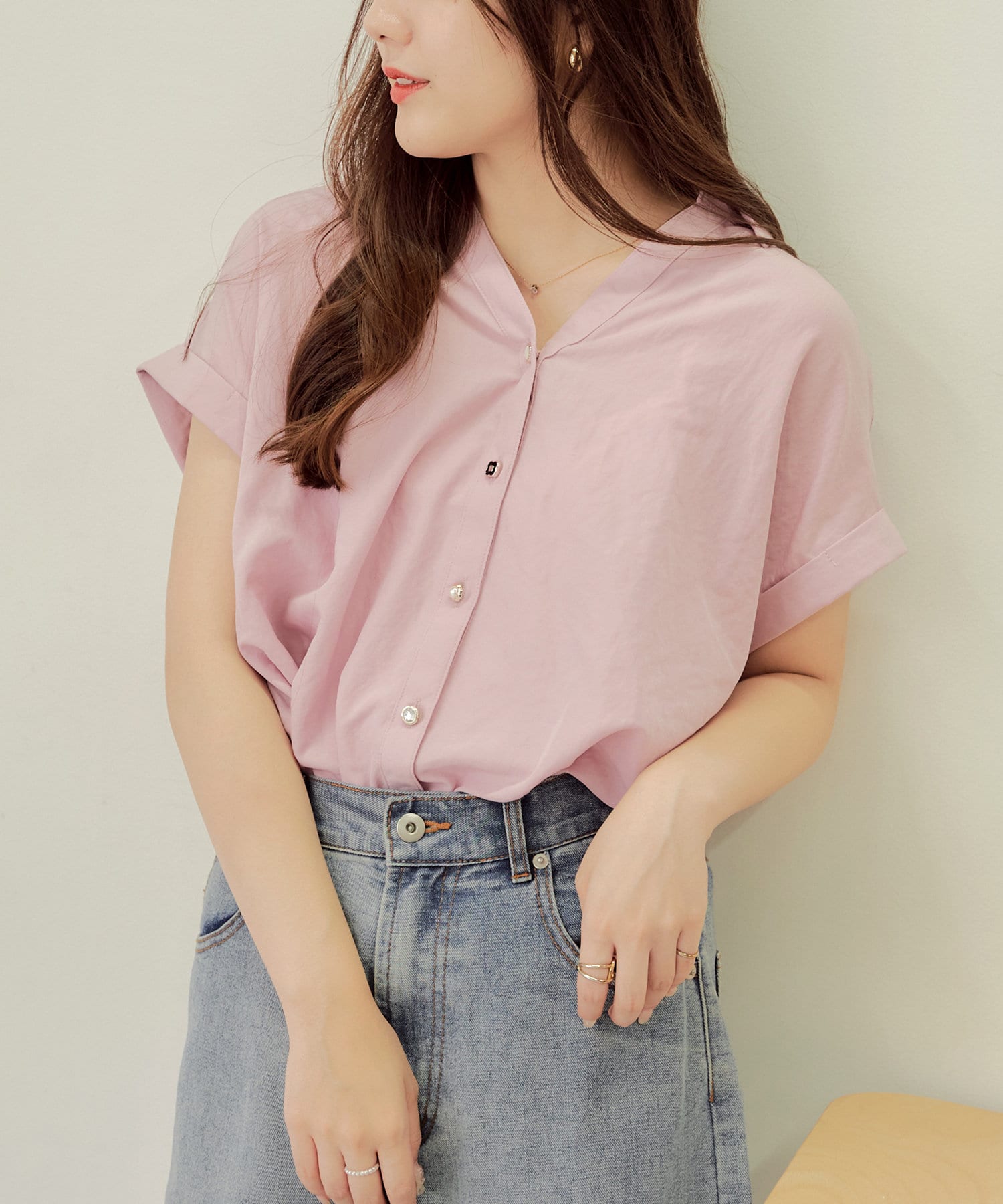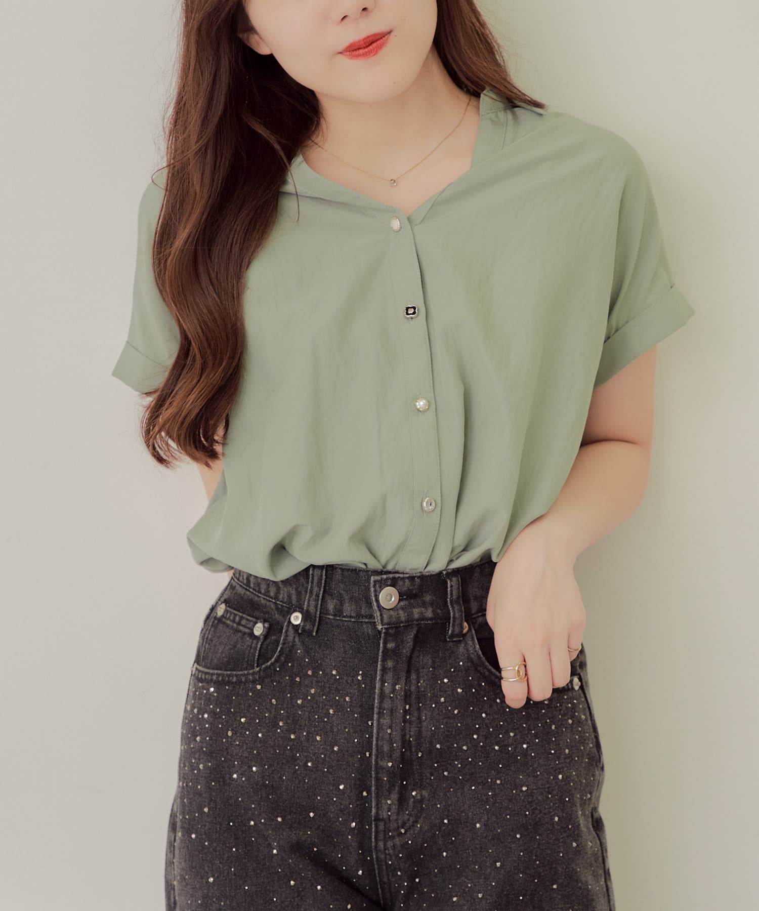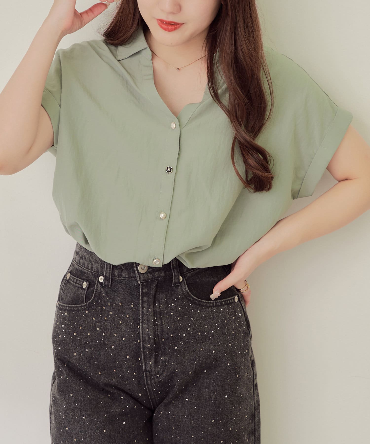 ・首回りがスッキリ見えるV字のネックラインがポイント。