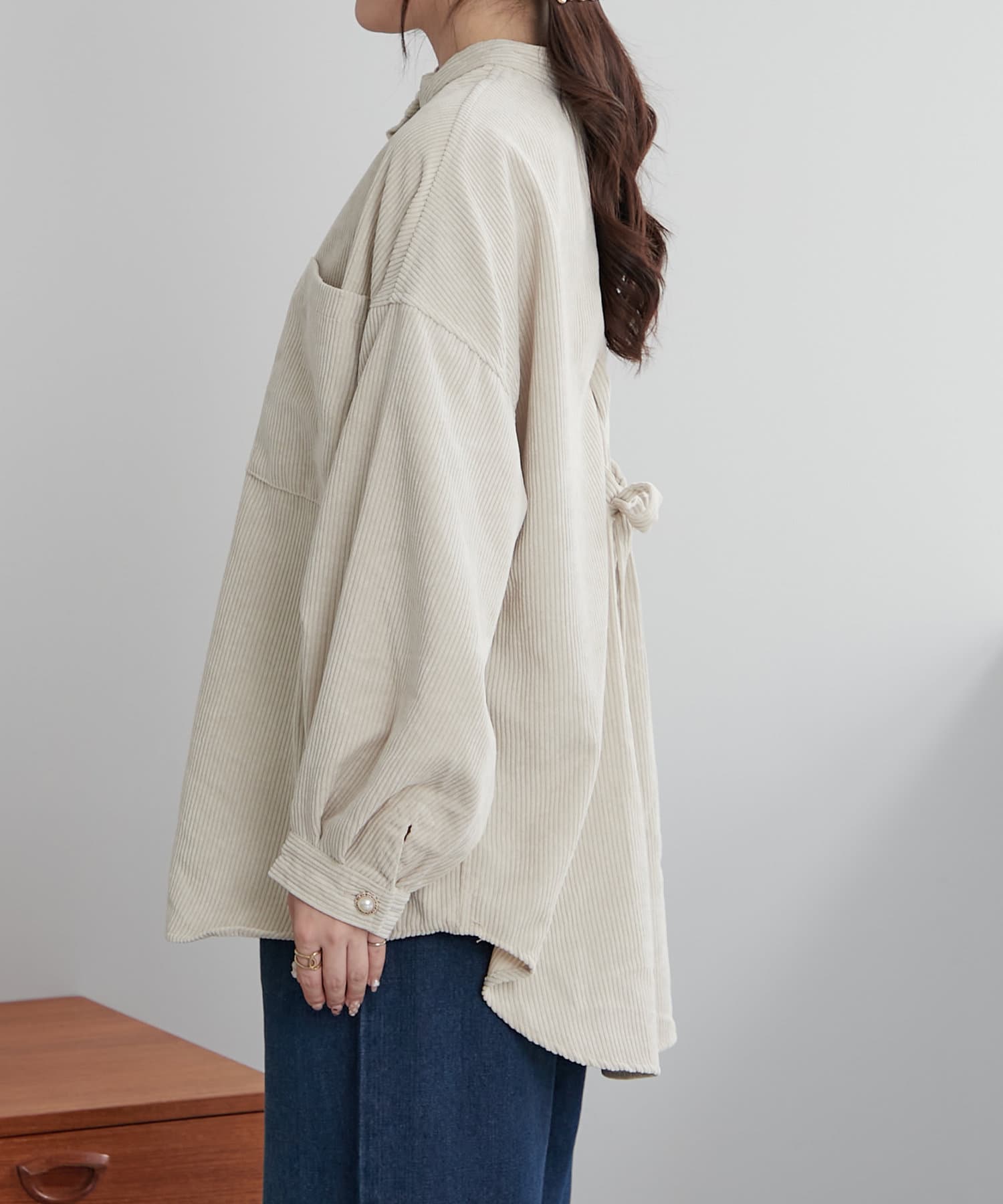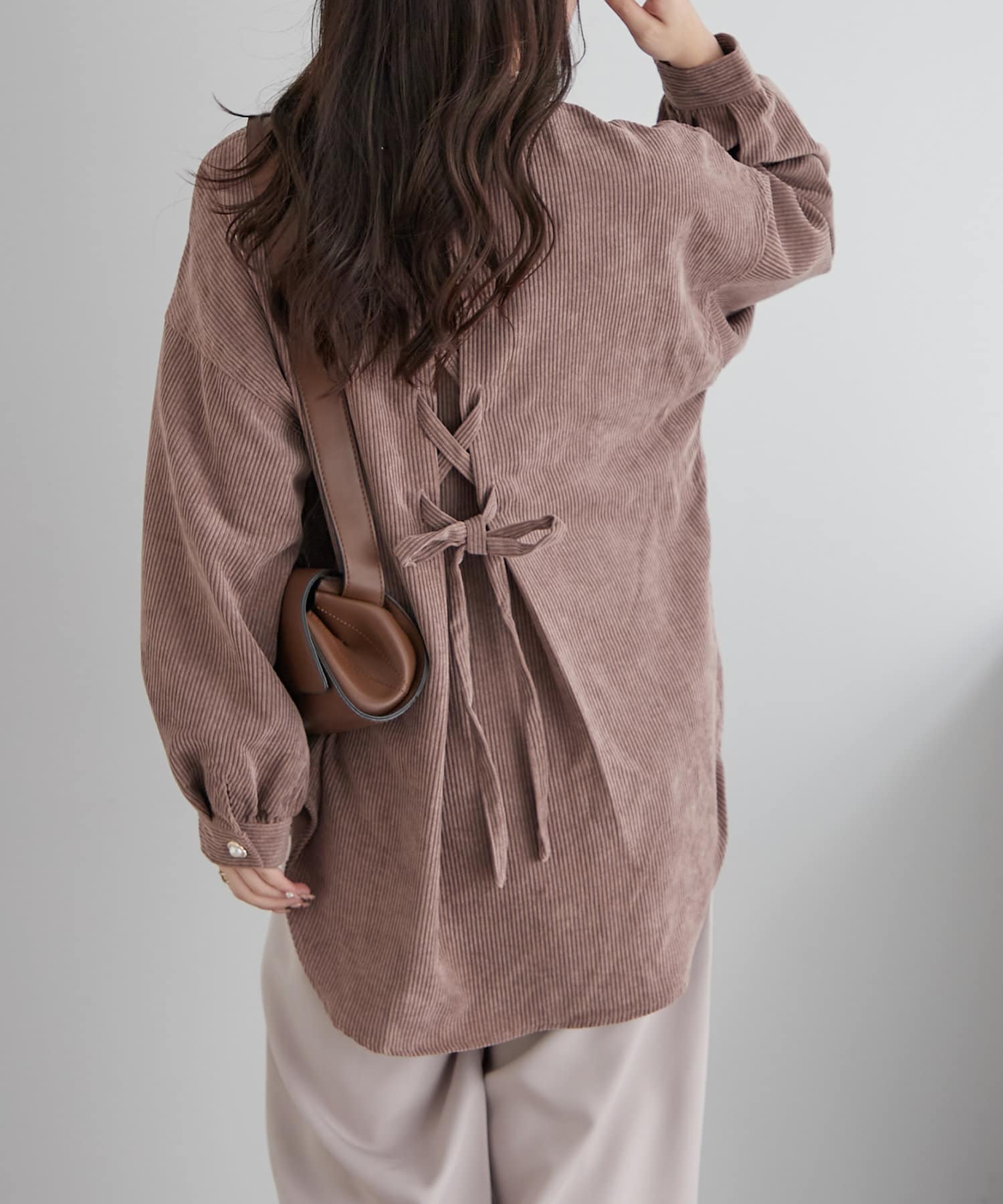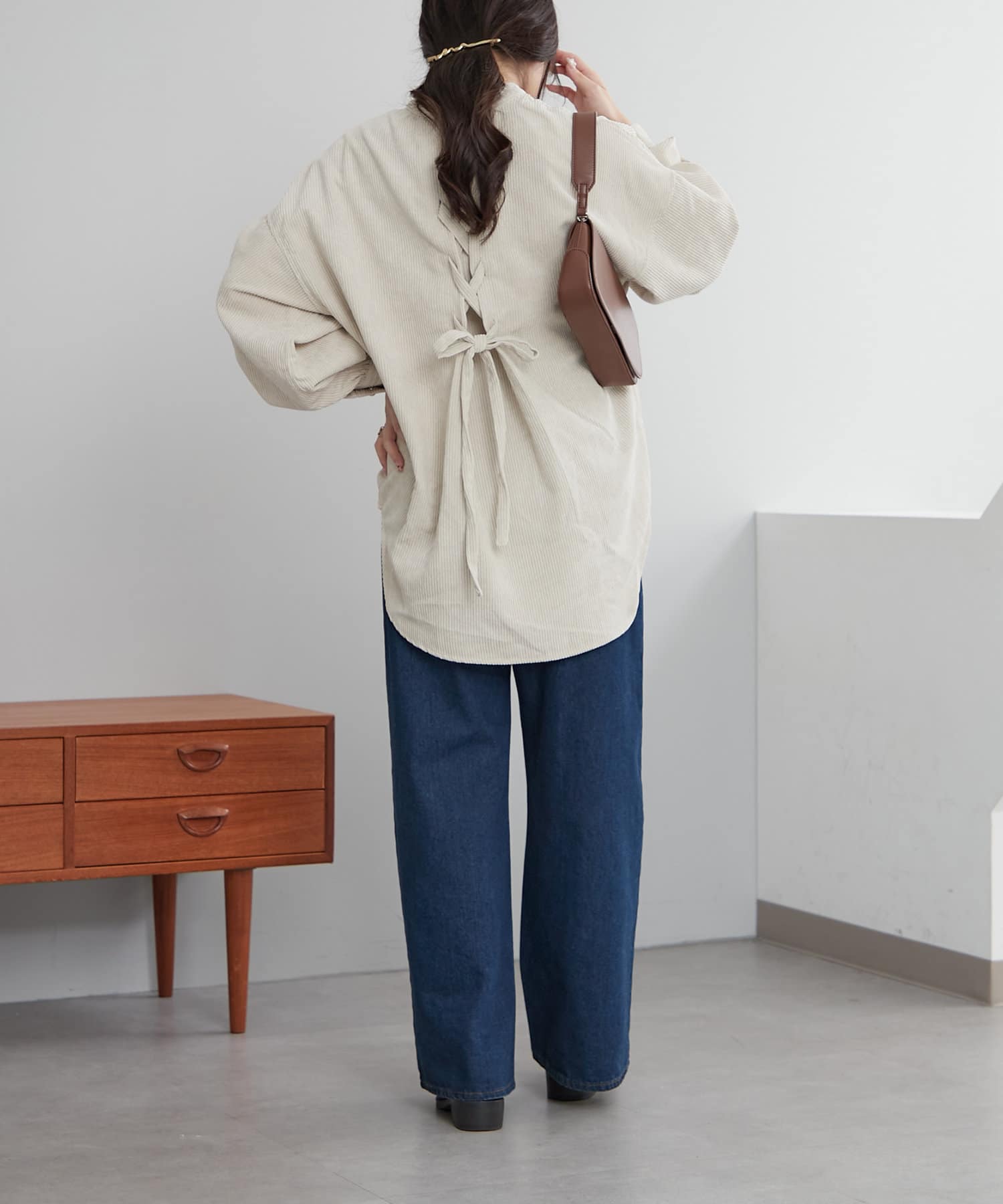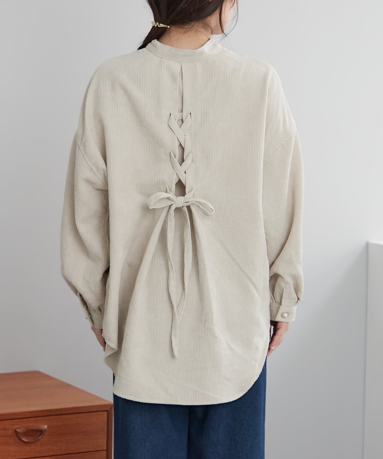 ・レースアップデザインで後ろ姿まで可愛いバンドカラーシャツ