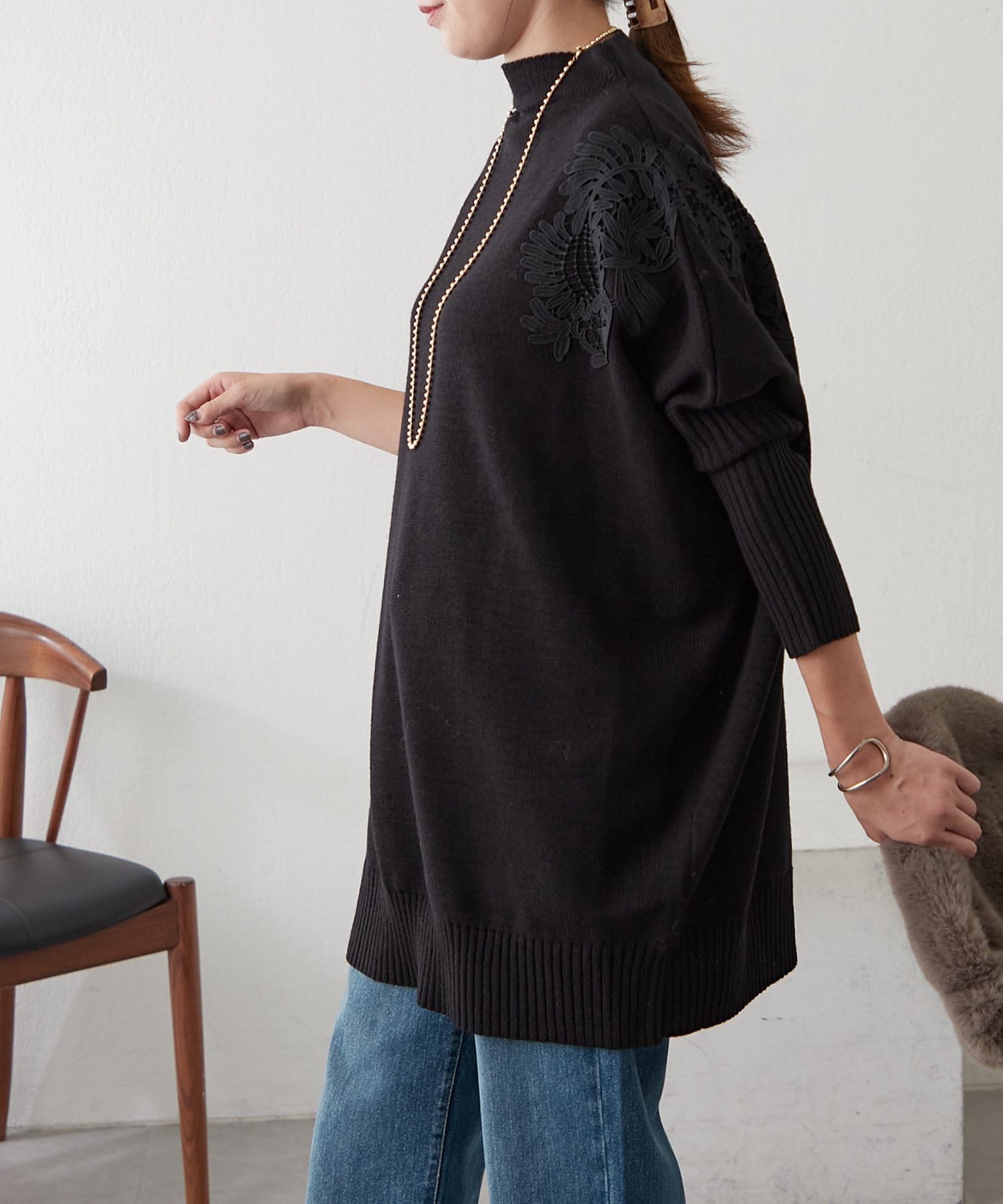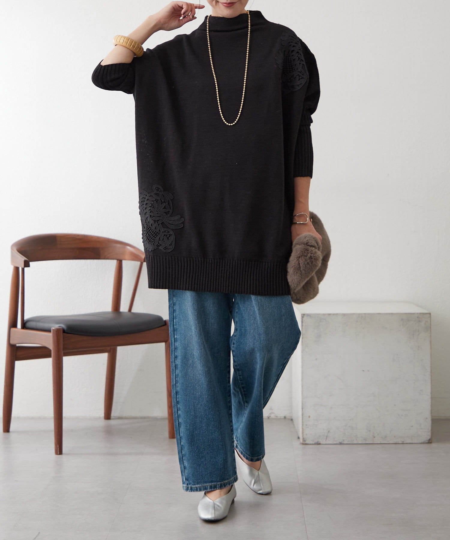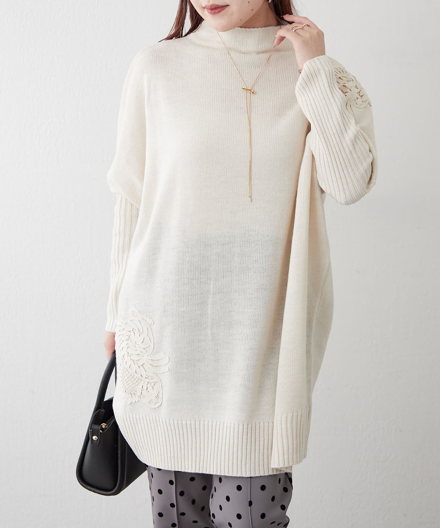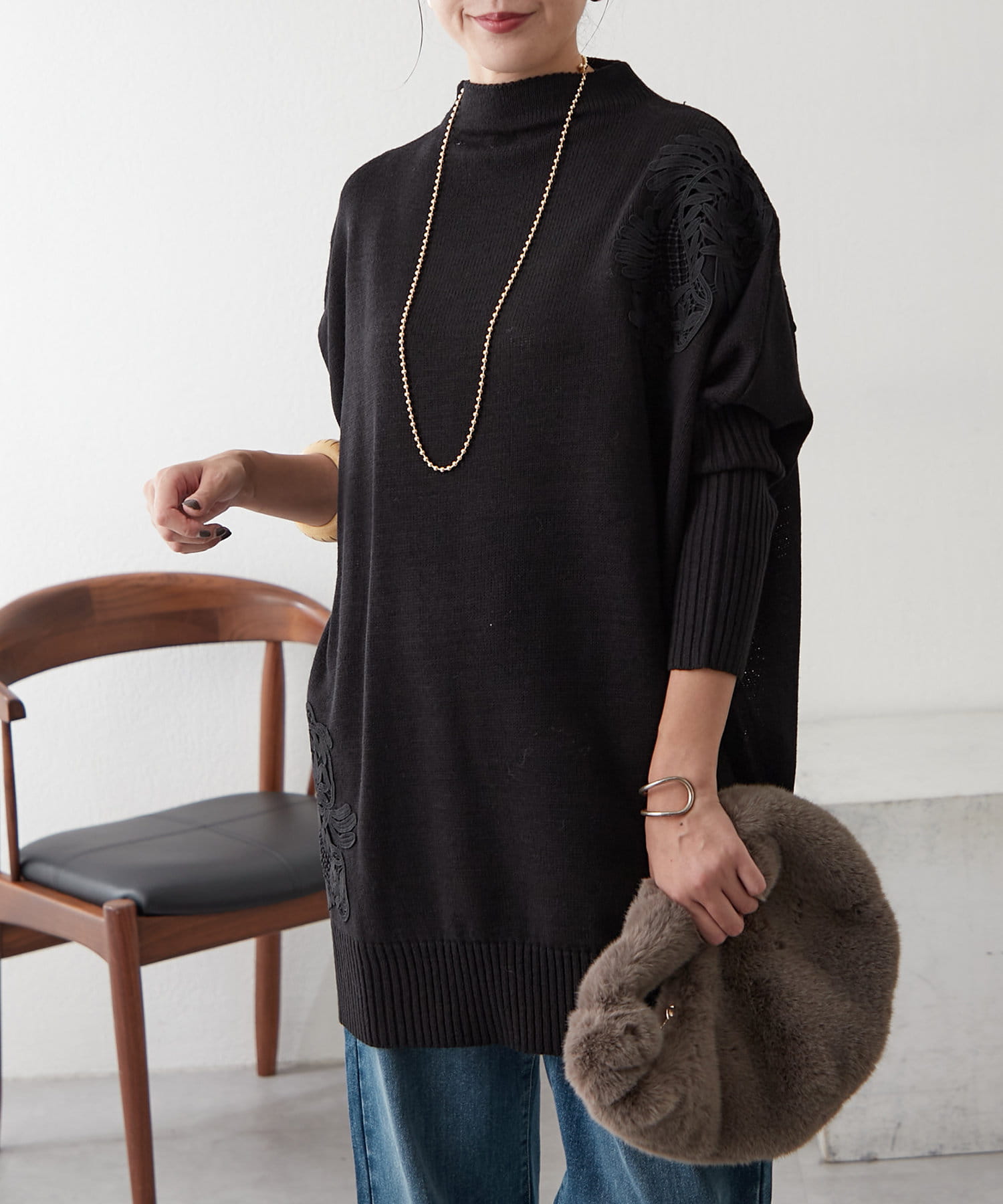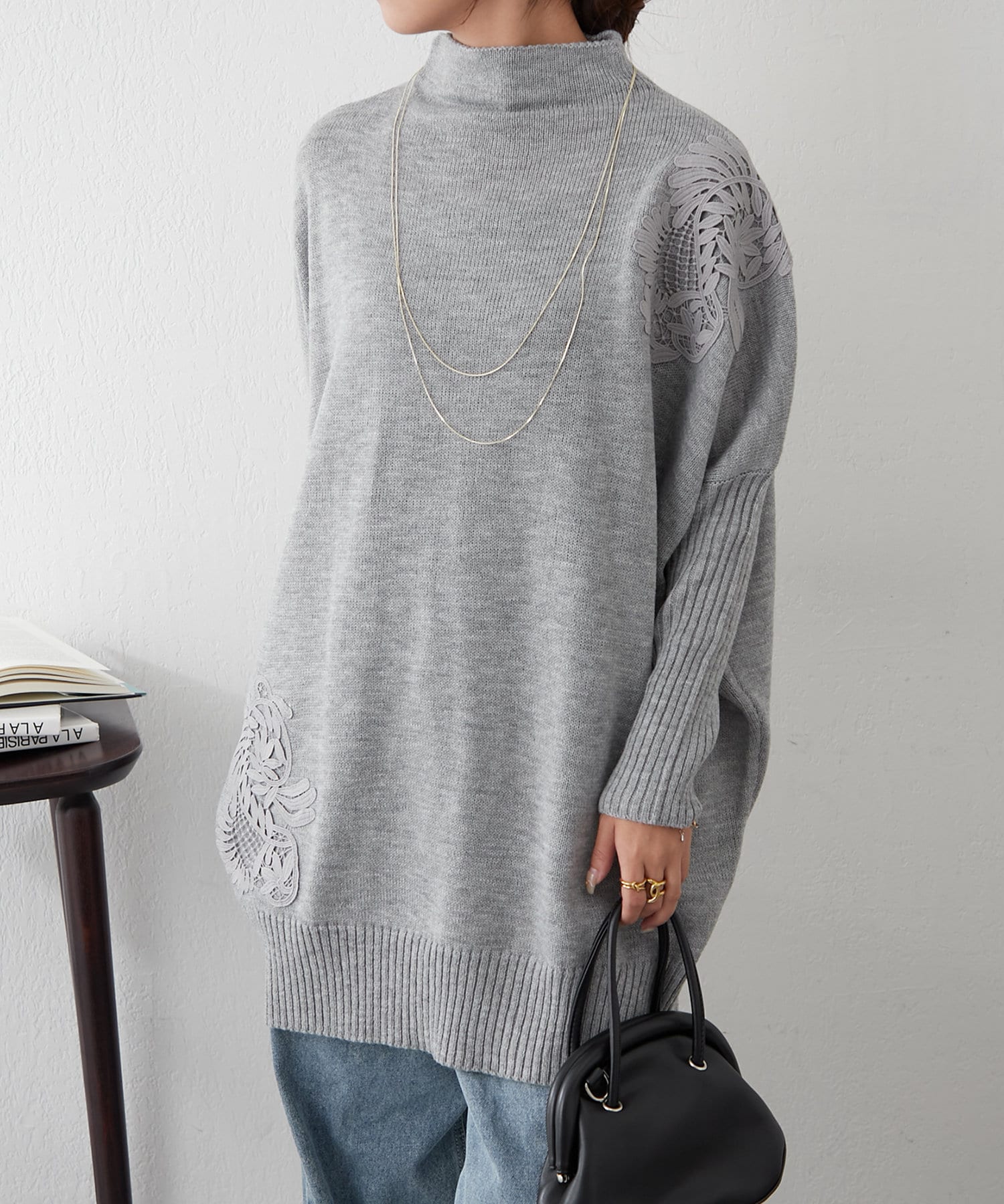 ・ハイネックデザインのチュニックにレースをあしらったきれいめニット。