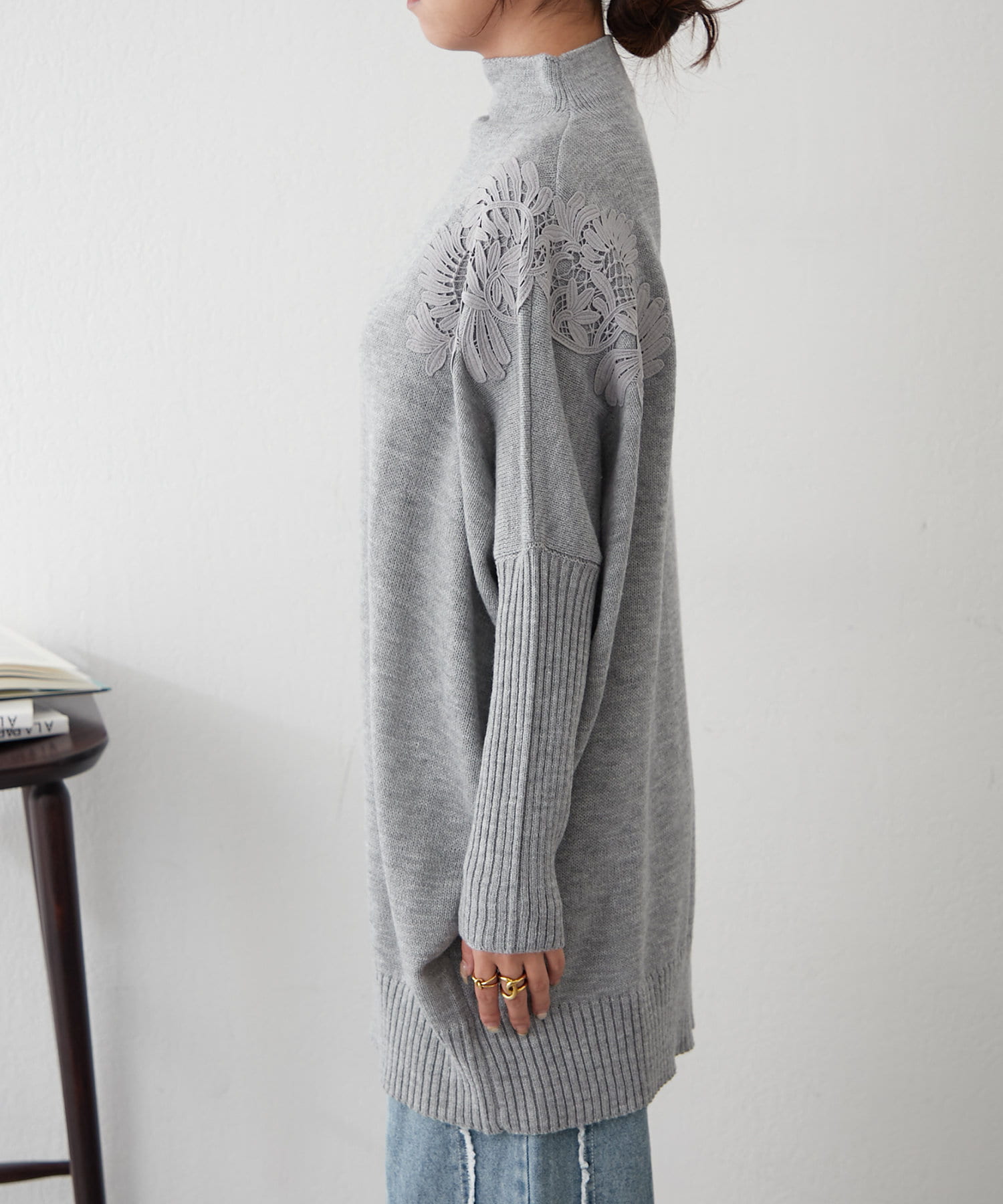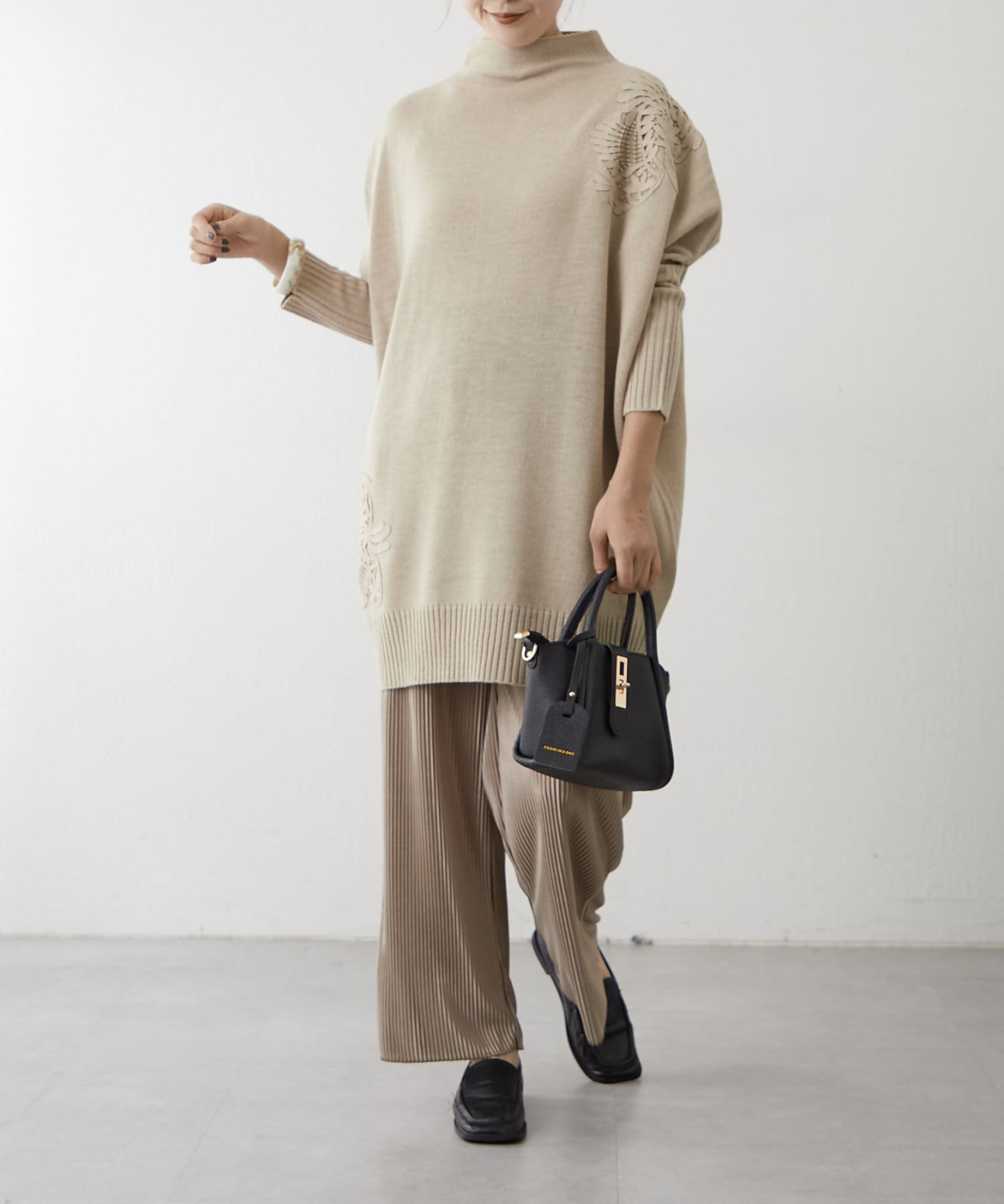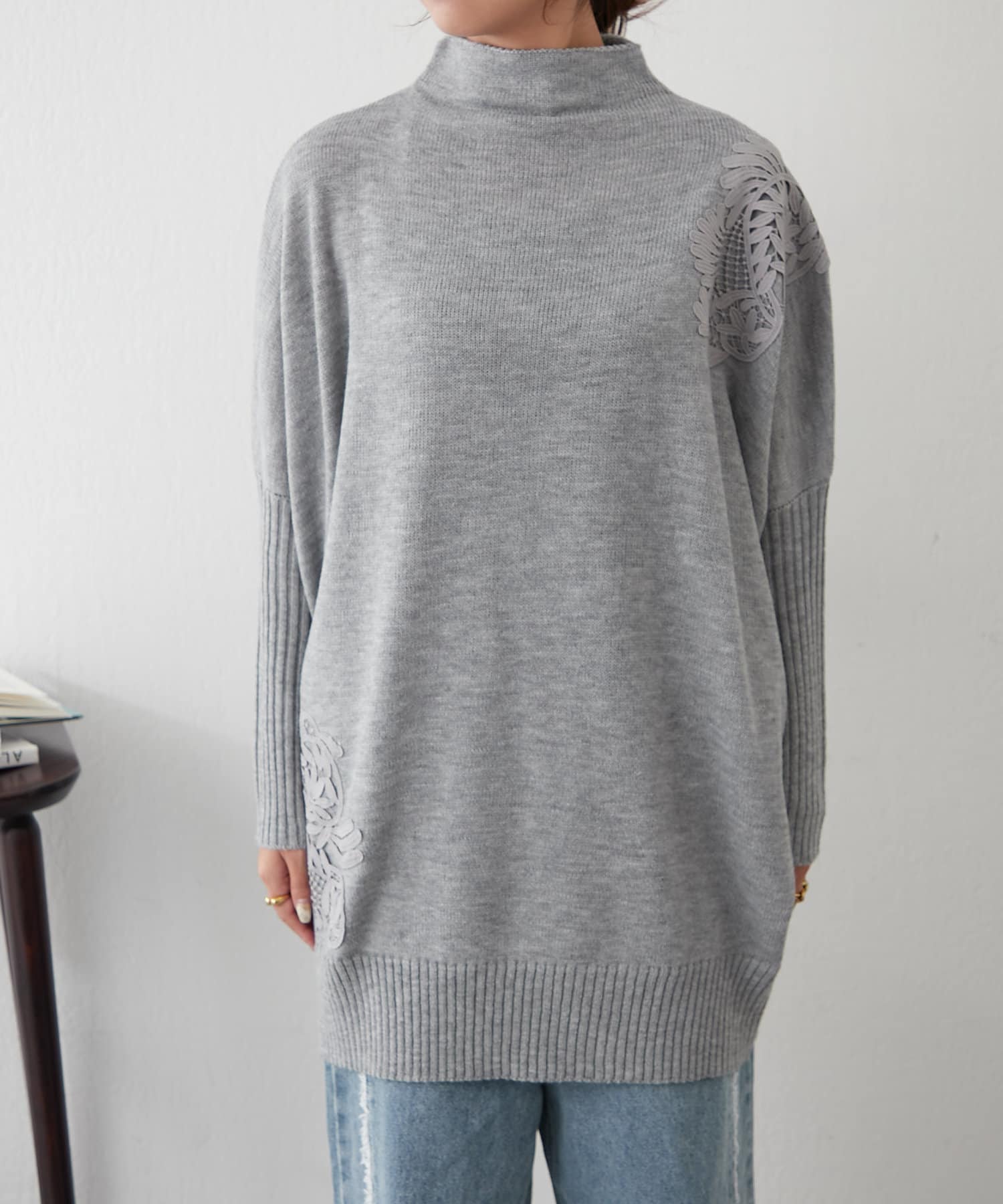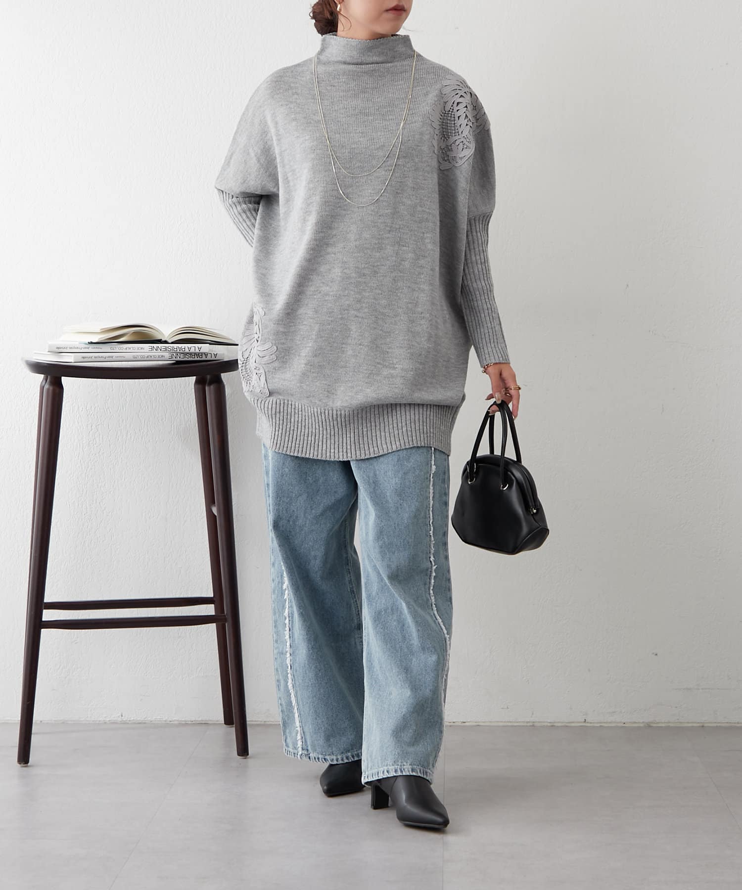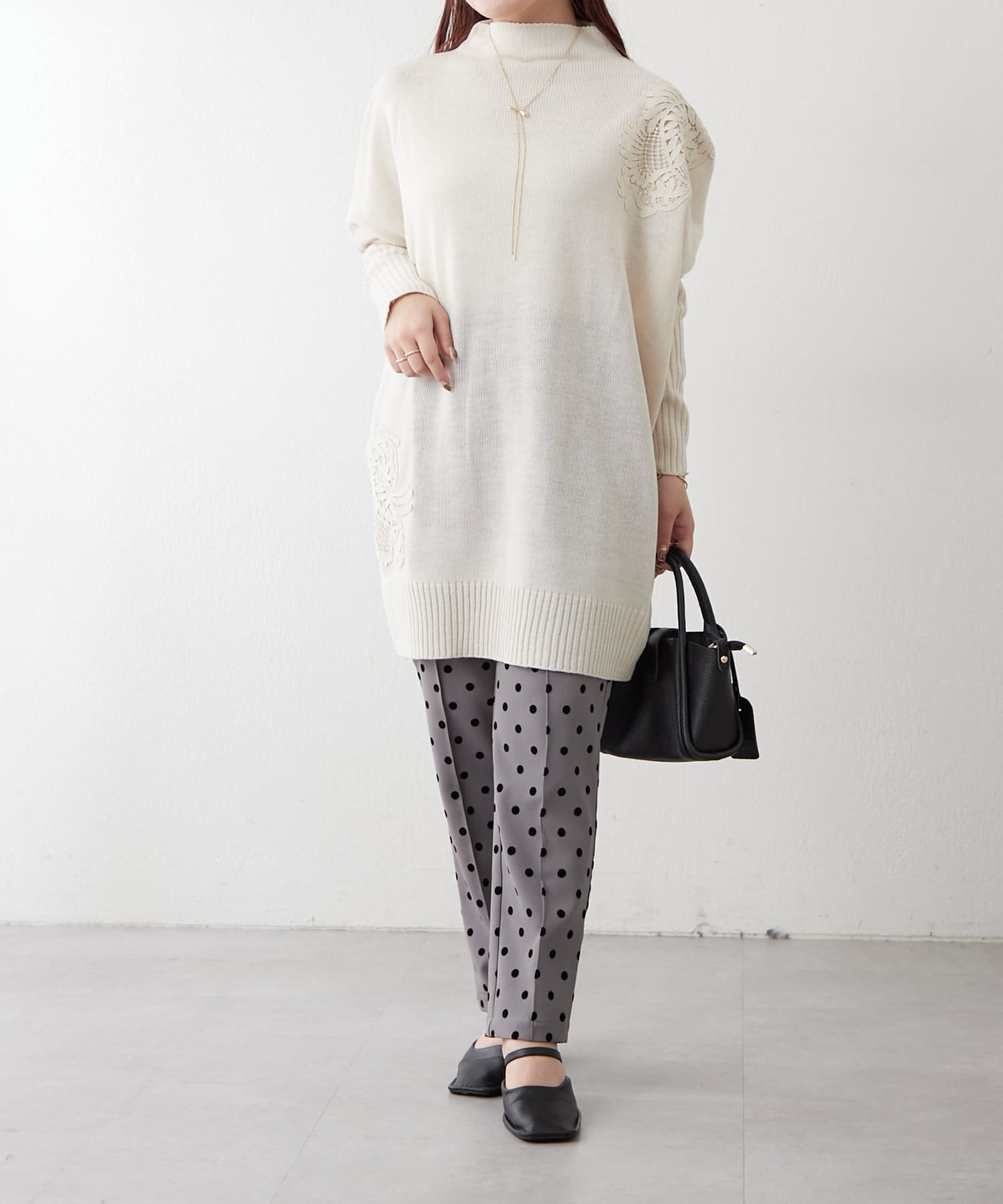 ・ハイネックデザインのチュニックにレースをあしらったきれいめニット。