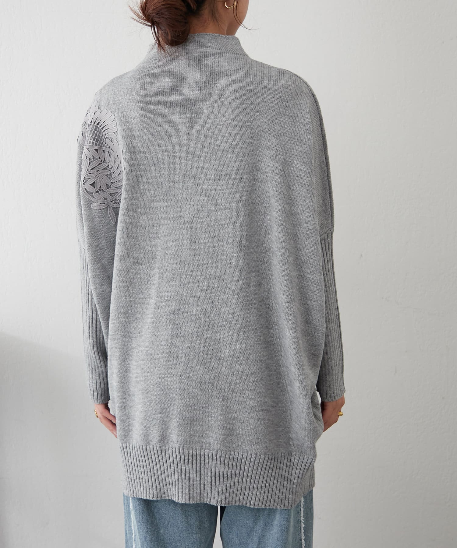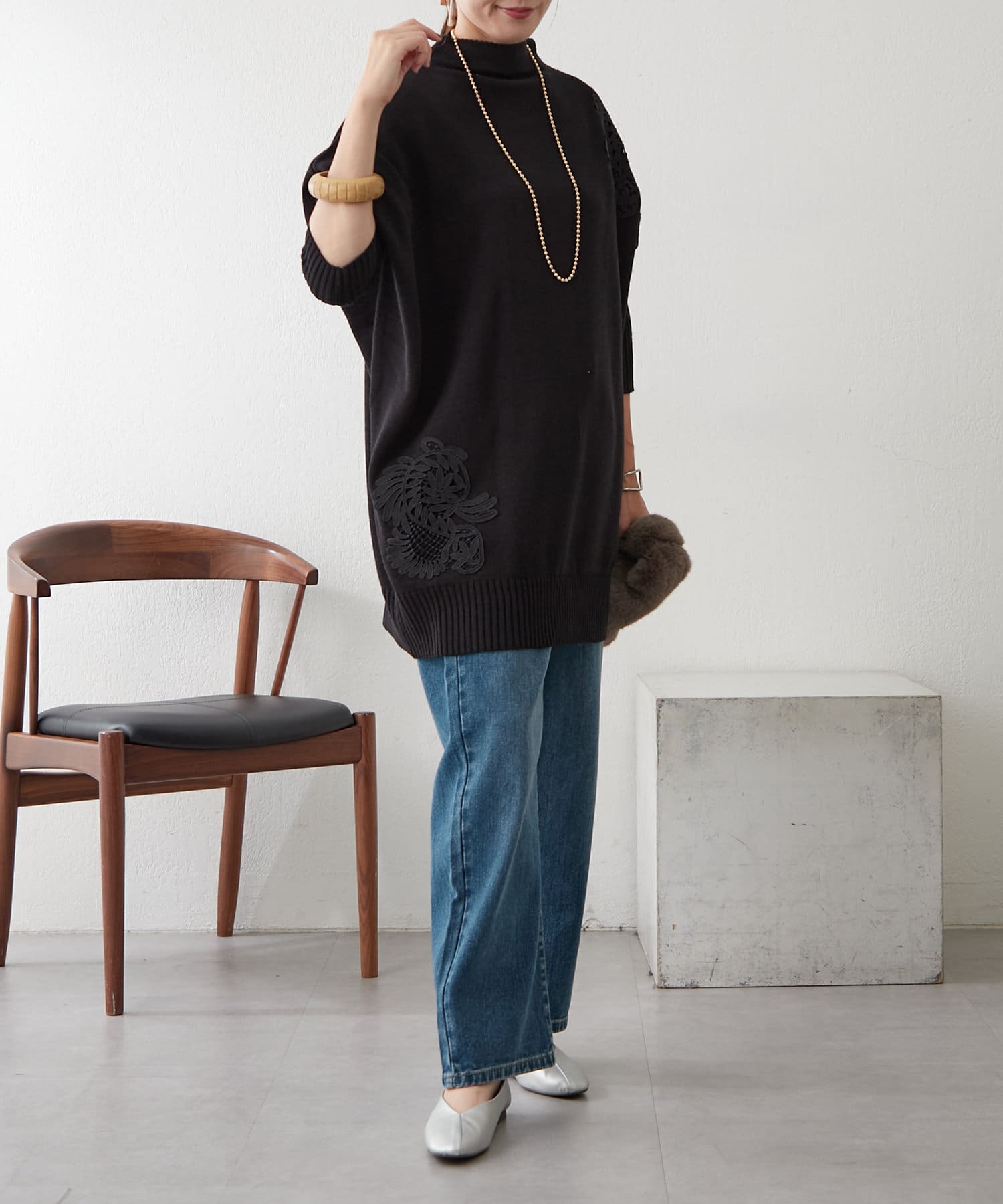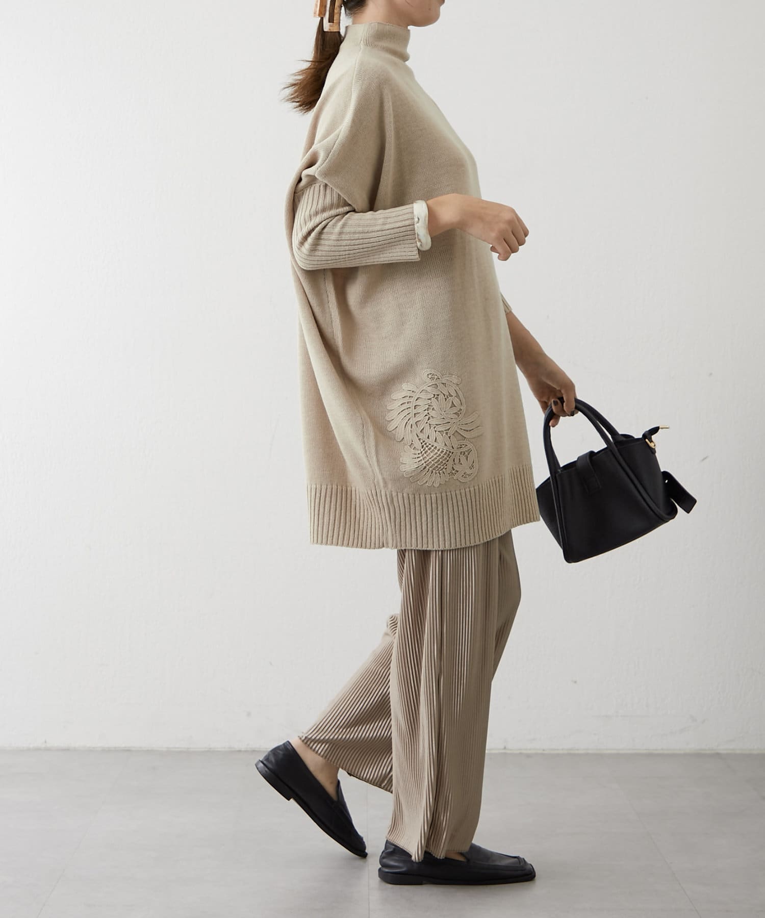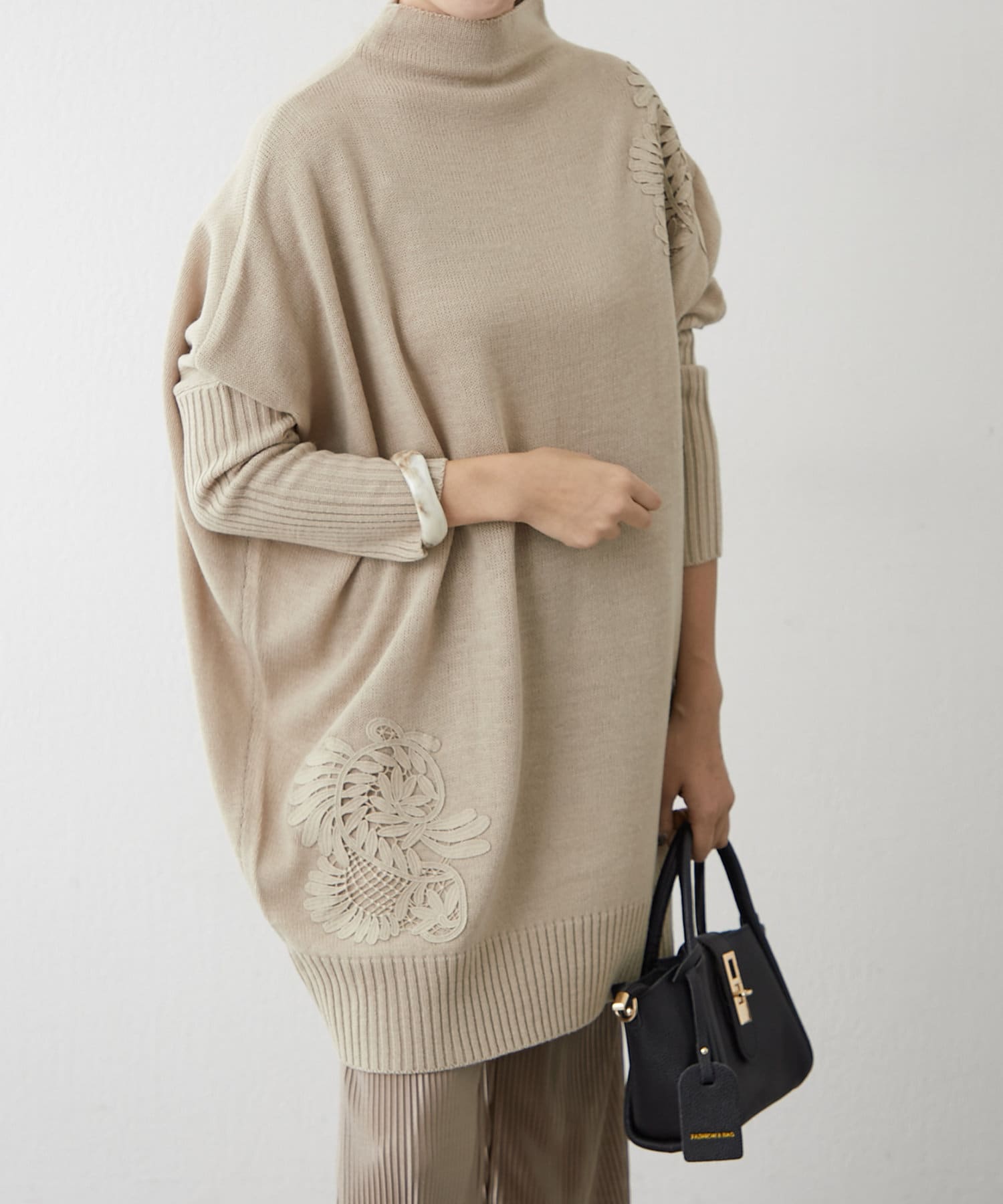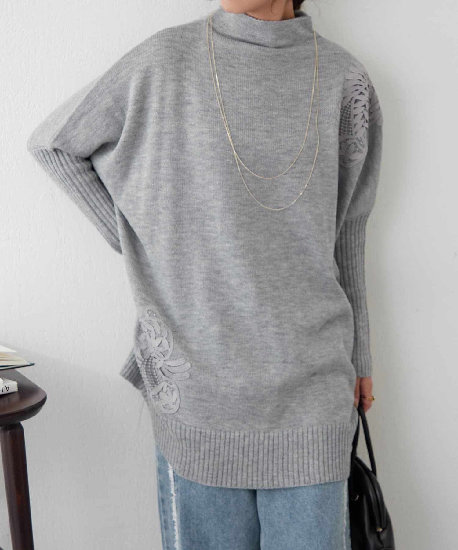 ・ハイネックデザインのチュニックにレースをあしらったきれいめニット。