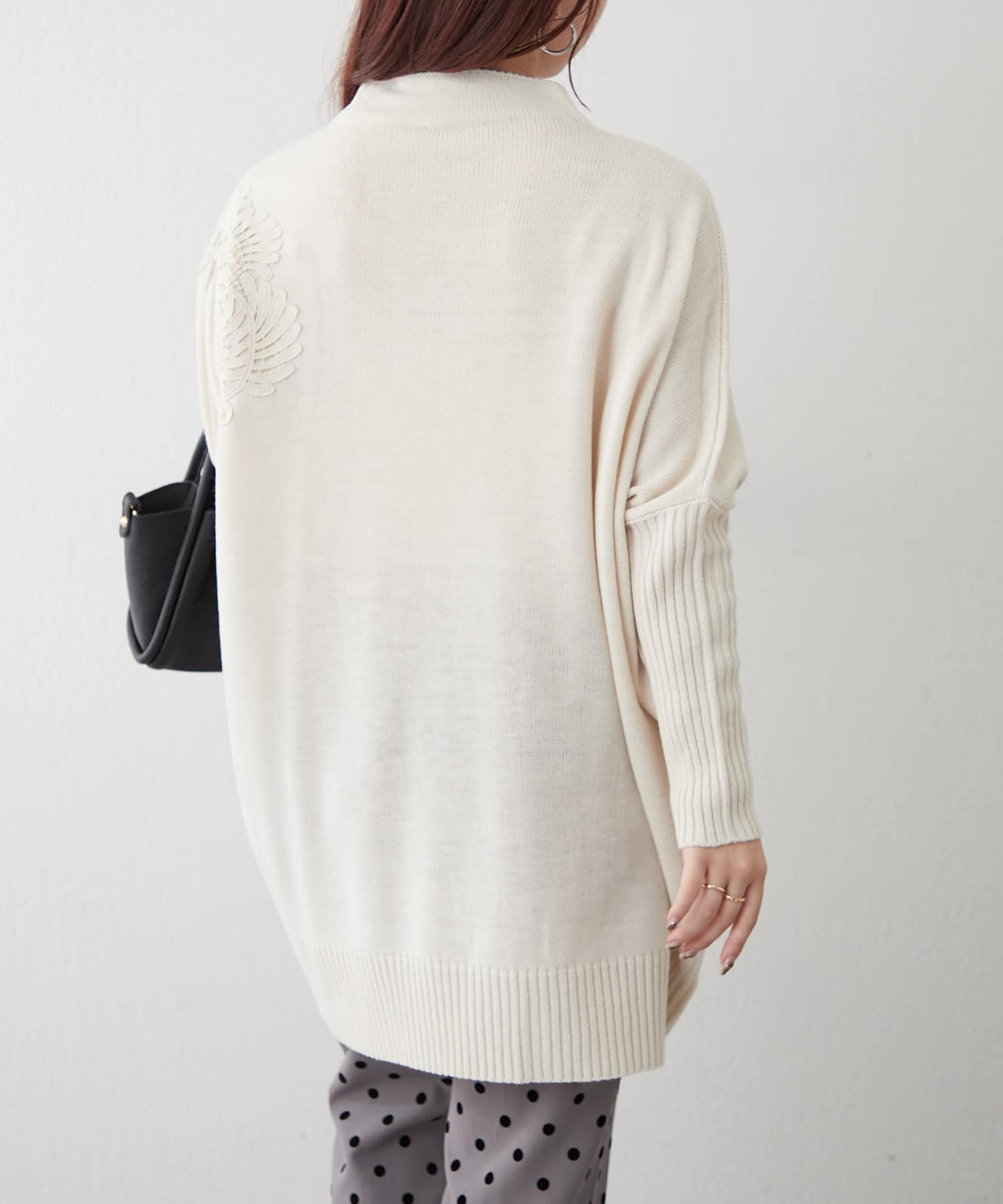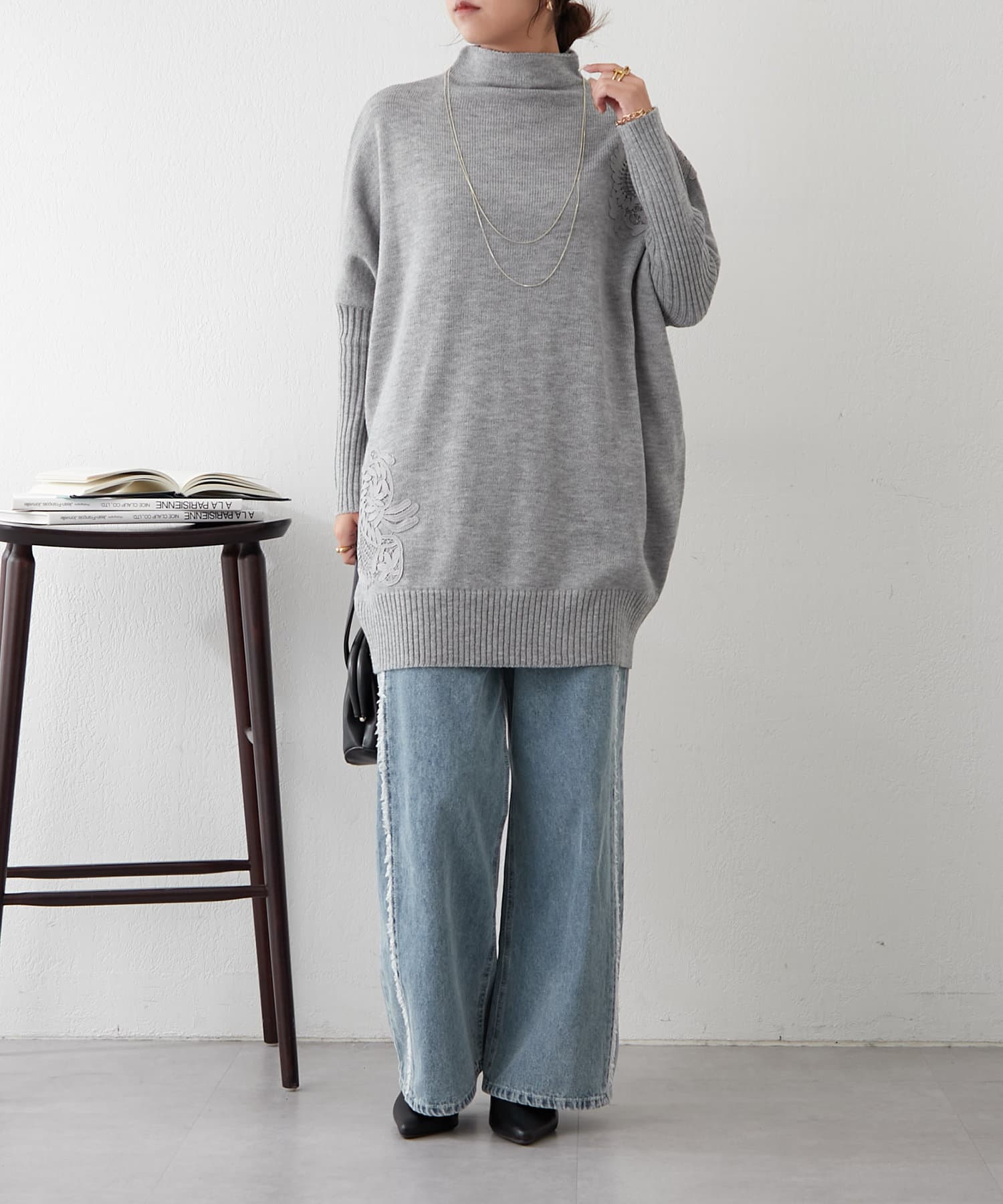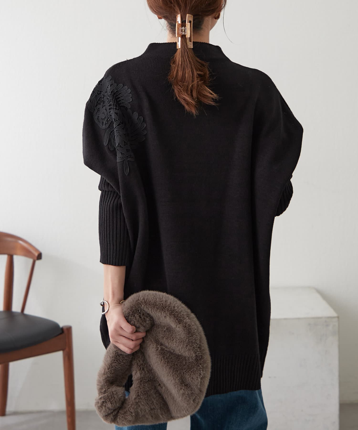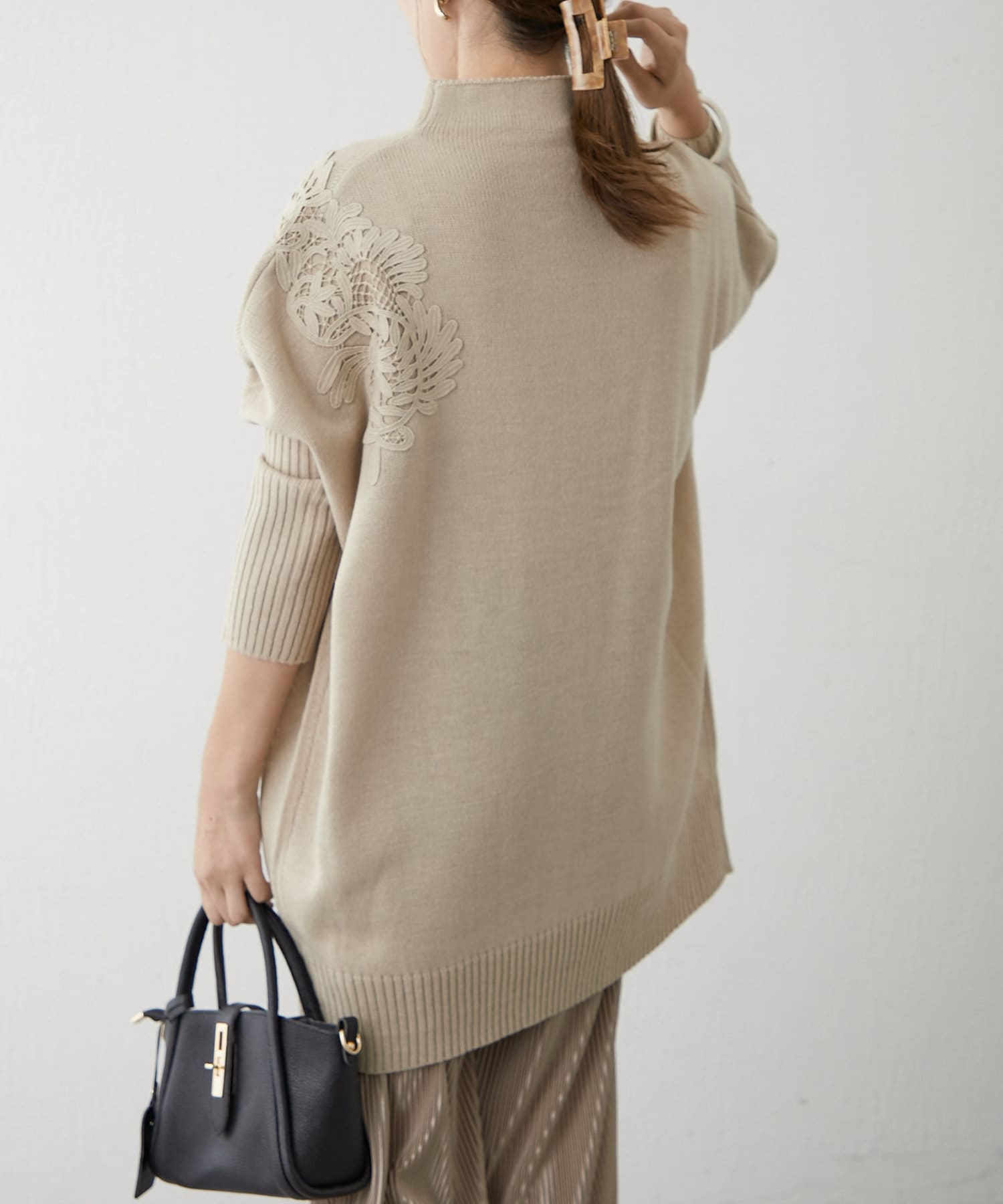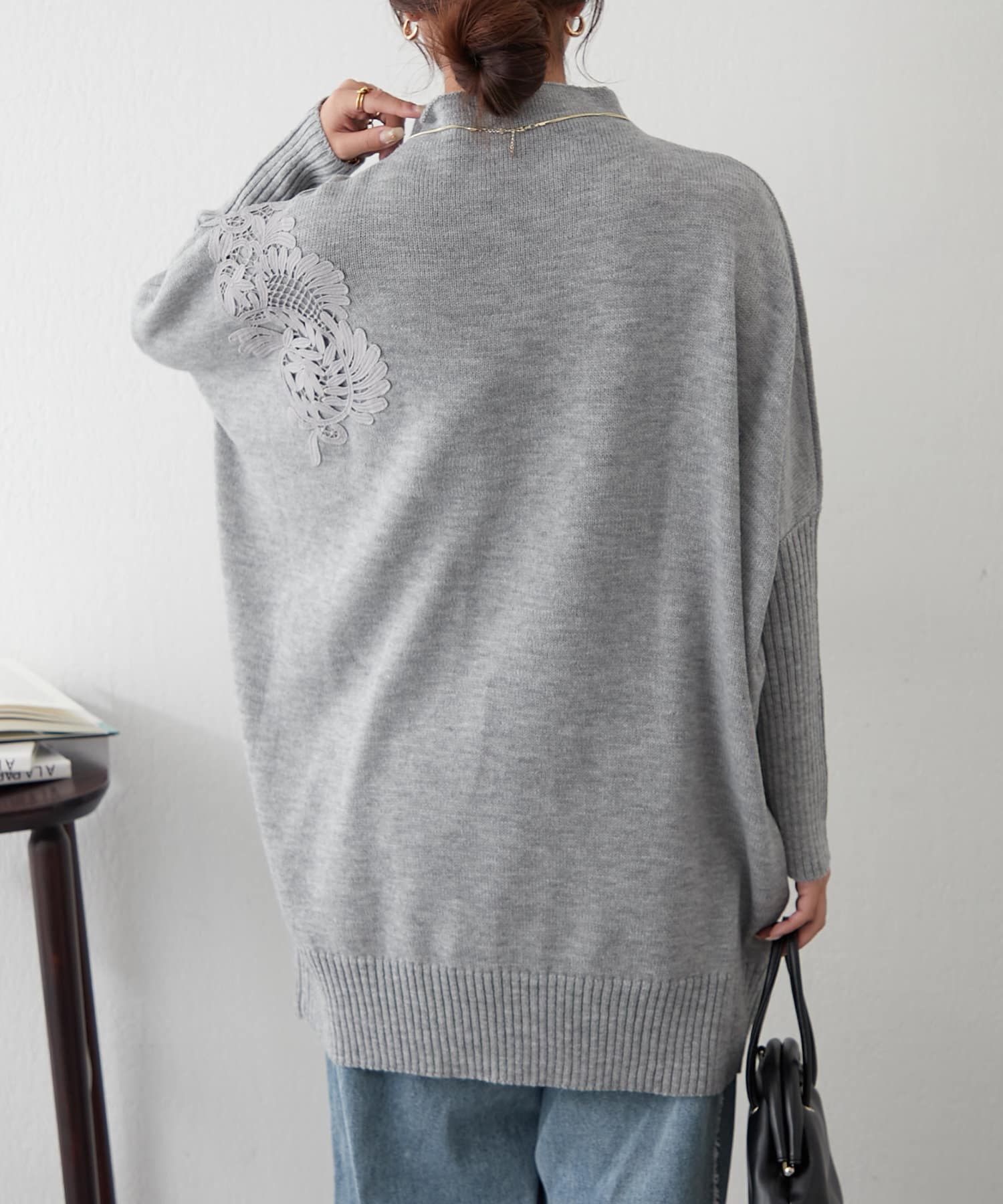 ・ハイネックデザインのチュニックにレースをあしらったきれいめニット。