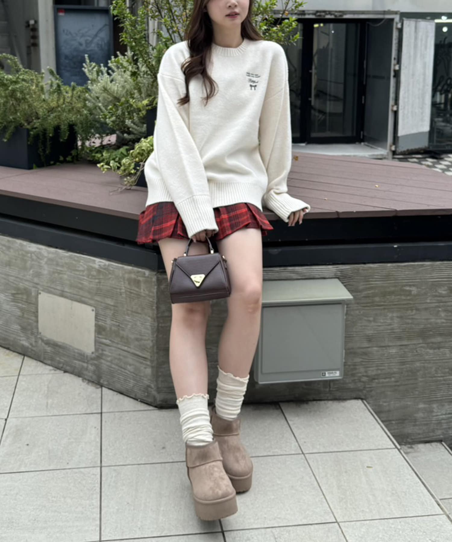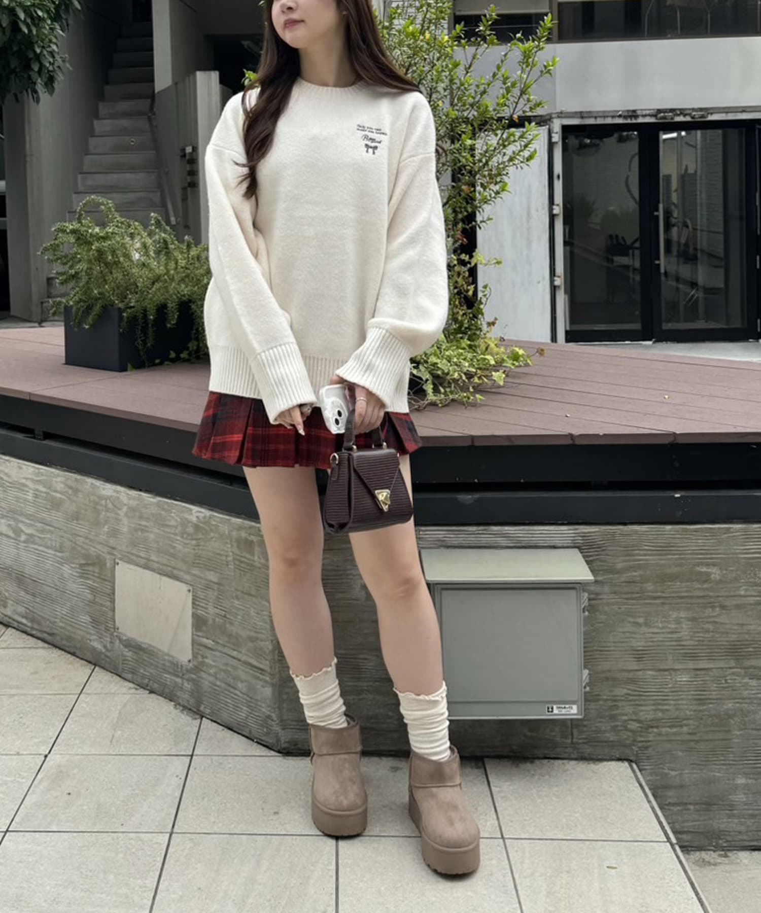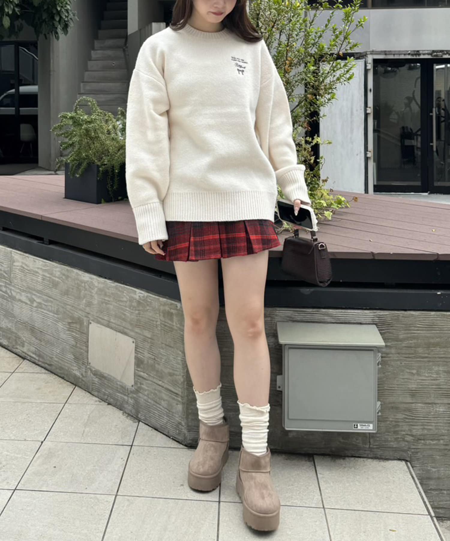 ・チェックのプリーツのミニスカート、ロングブーツで秋冬らしさを演出するのがオススメ