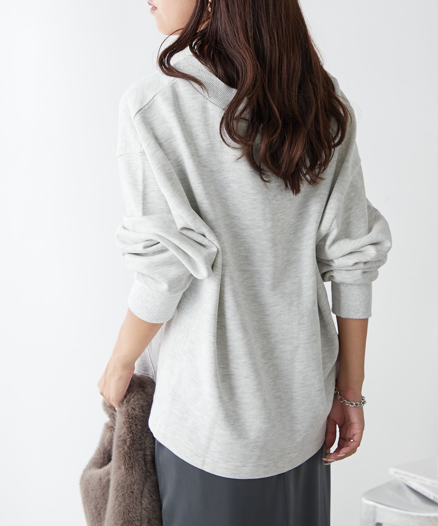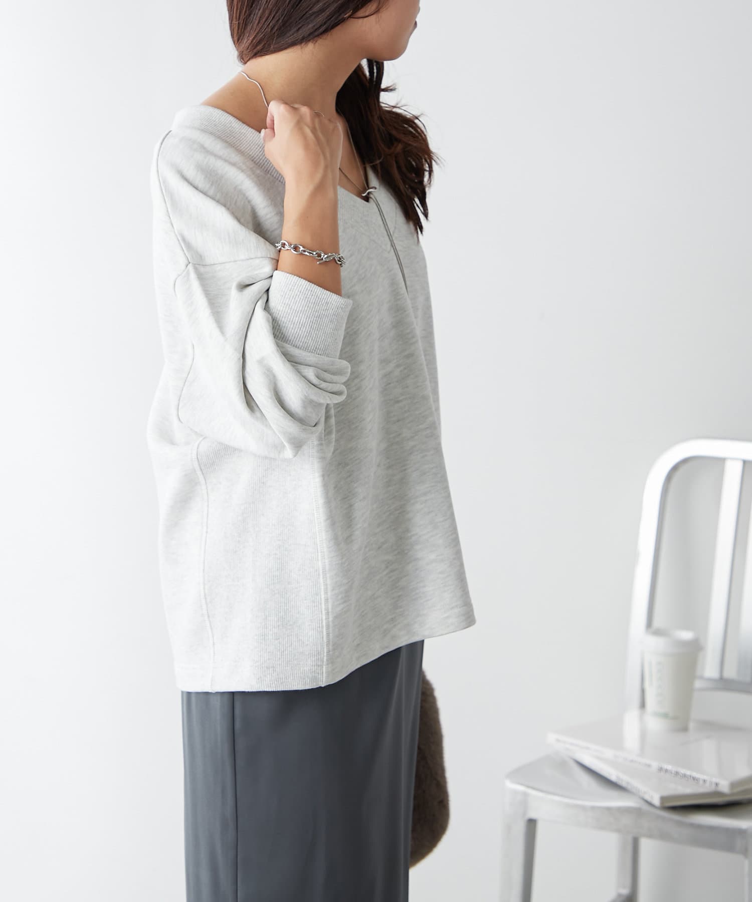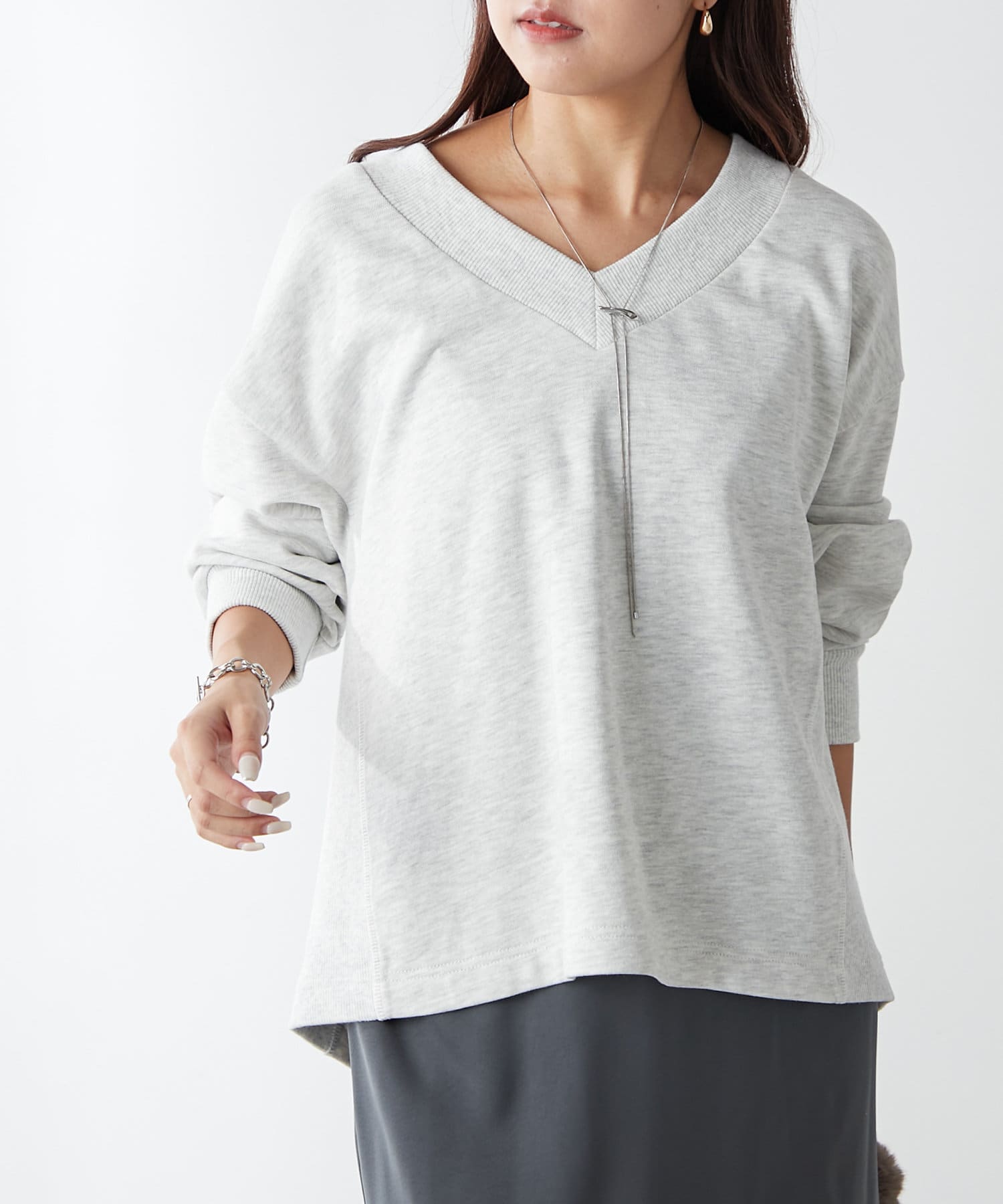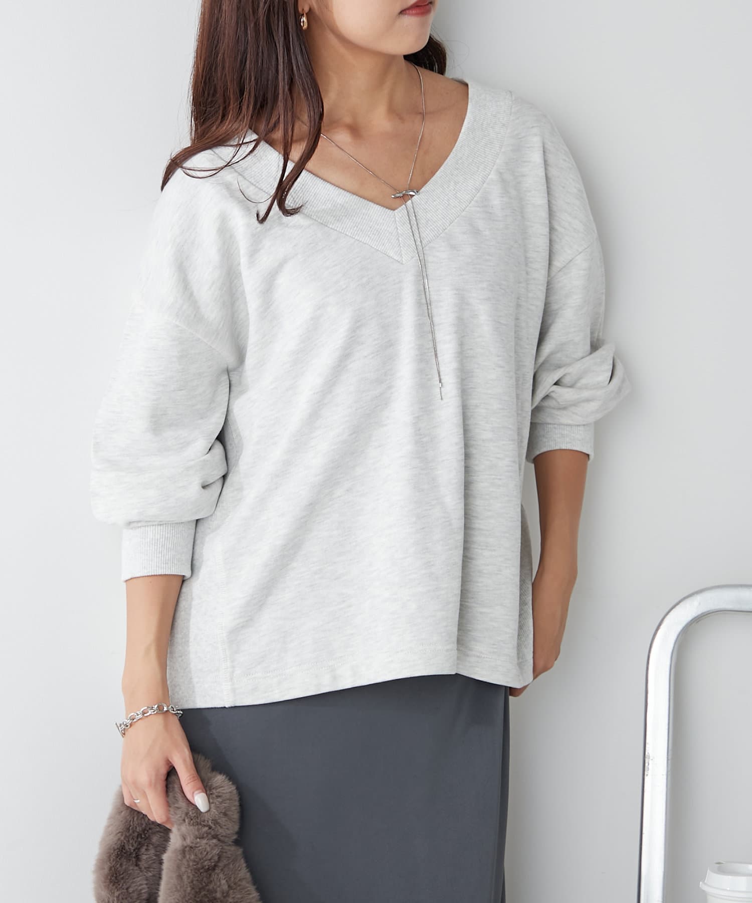 ・Vネックデザインが首周りをすっきりとした印象に見せてくれるプルオーバー